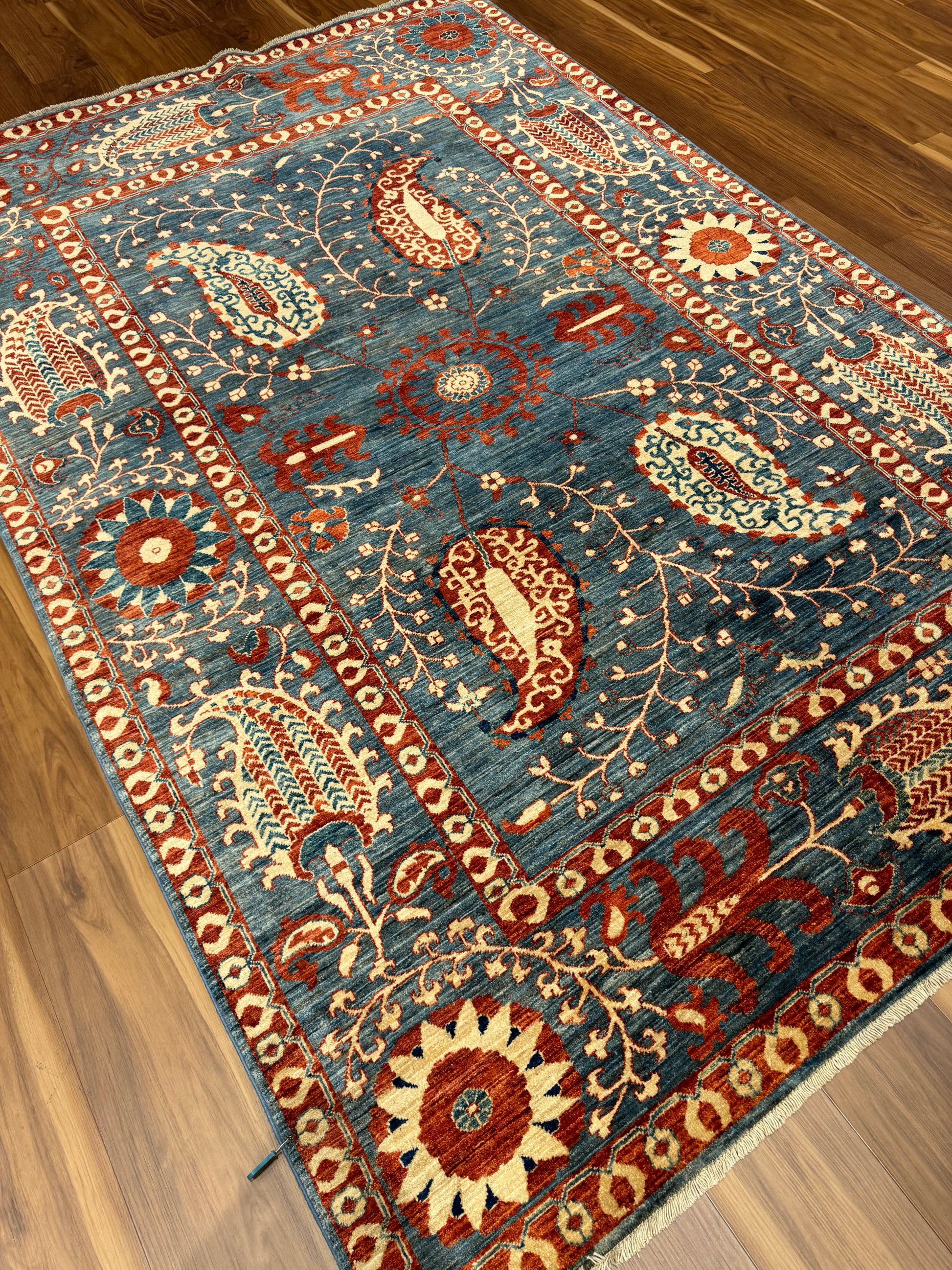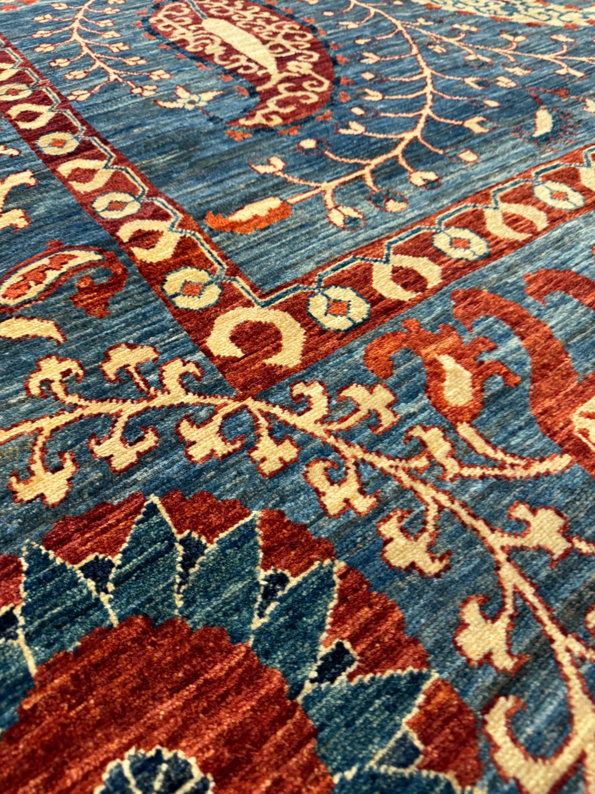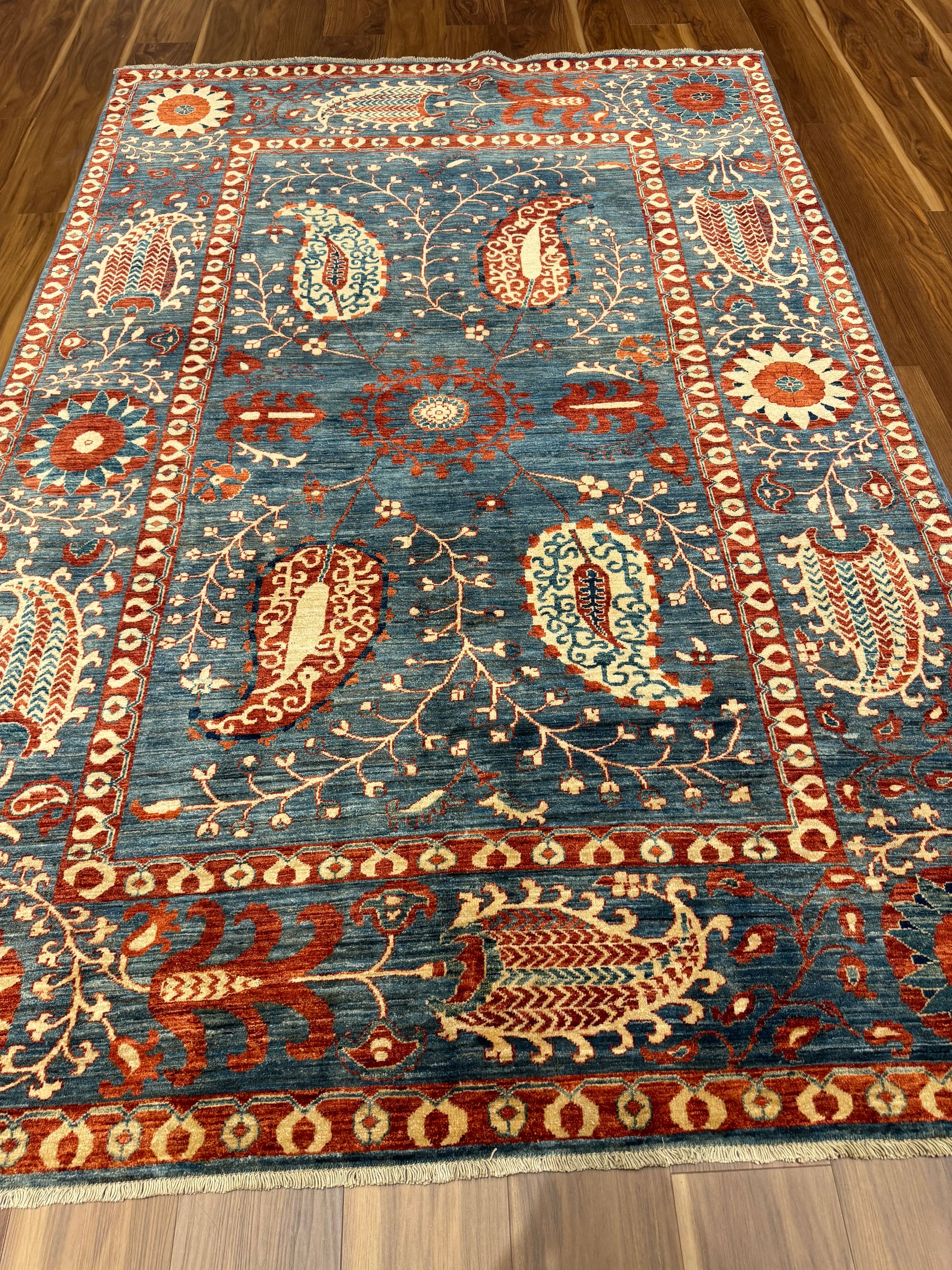 This exquisite Suzanni rug showcases intricate patterns and a captivating design that reflects its Central Asian origins. Crafted from high-quality wool, it features vibrant shades of navy blue and rust, accented with touches of gold. The rug's motifs include stylized florals and botanical elements, presented in a symmetrical layout that exudes elegance and a timeless appeal. With its plush texture and durable construction, this piece is an ideal choice for bringing warmth and artisanal charm to any interior space, harmonizing with both classic and contemporary decors.