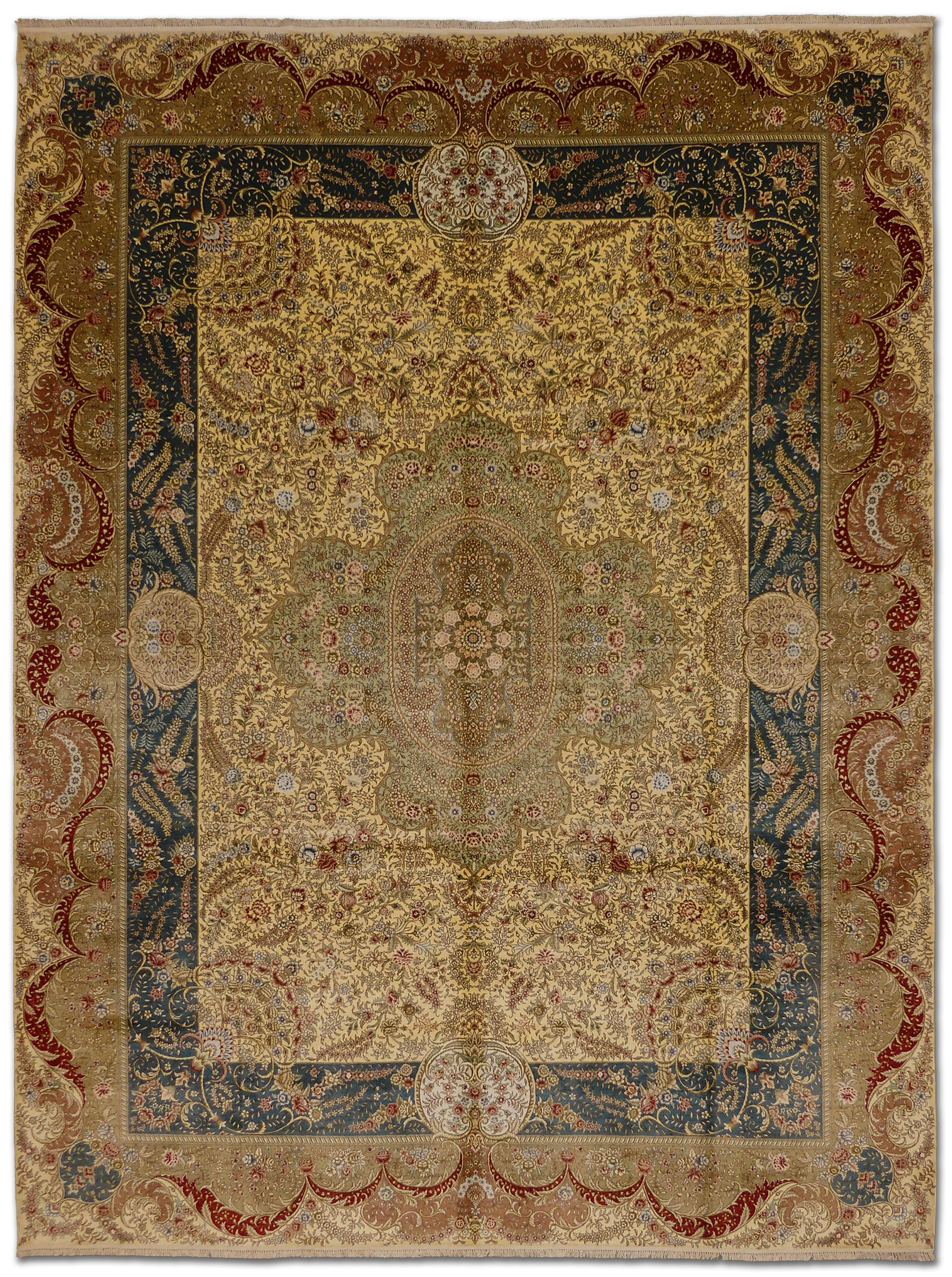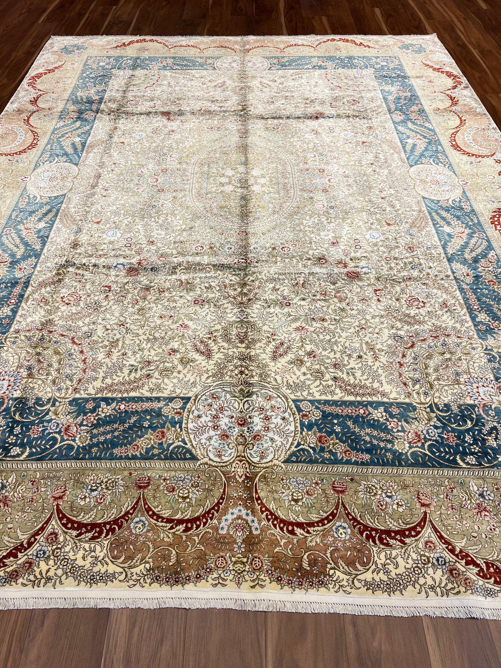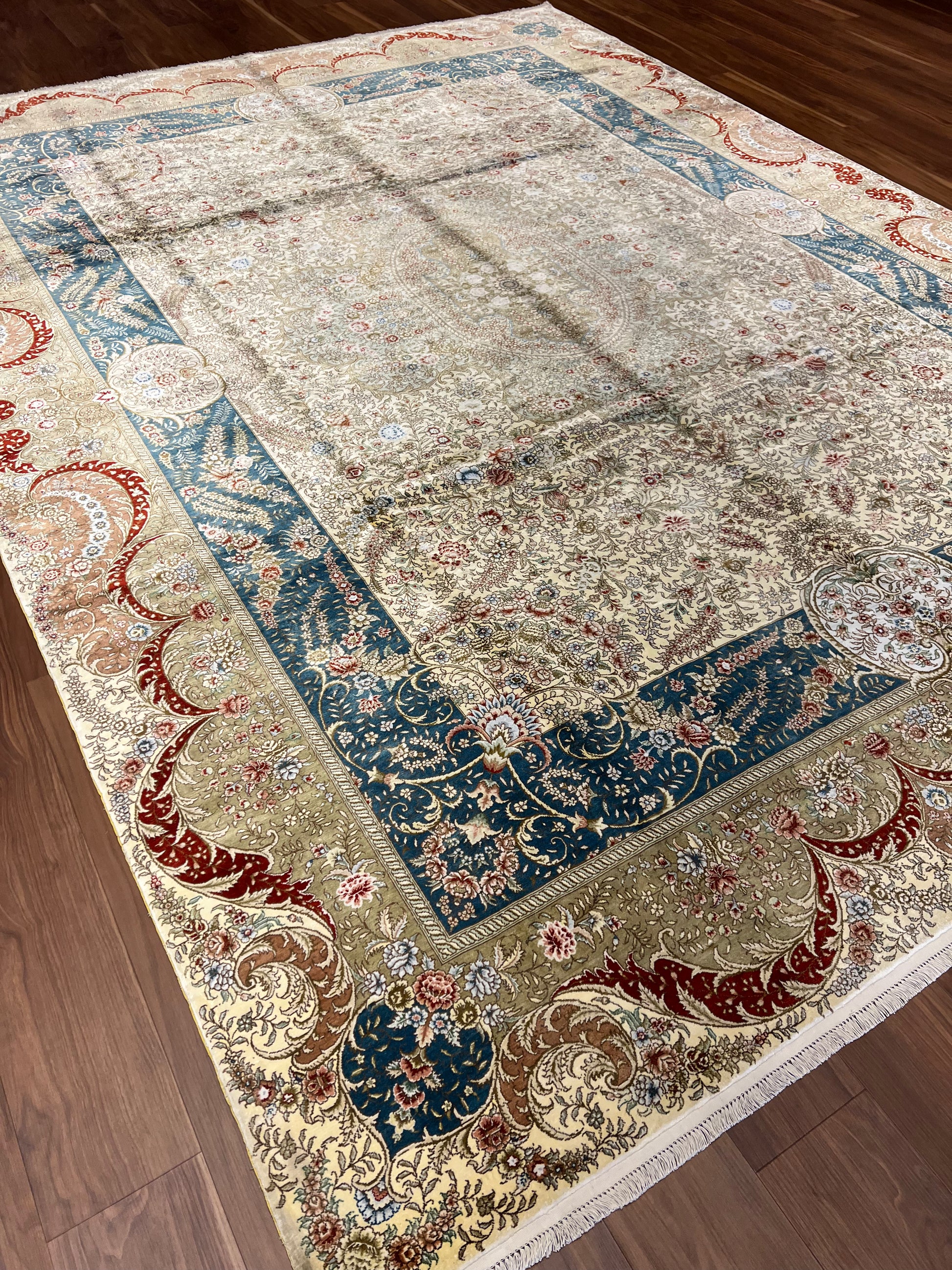 This exquisite Tebriz design rug is a symphony of intricate patterns and rich, royal hues. Woven from the finest silk, it offers both luxury and durability. The detailed borders frame a central medallion, complementing the ornate field flourishing with floral motifs. Ideal for lending a classic elegance to any sophisticated interior, this rug's plush texture and reflective gloss embody timeless artistry and craftsmanship.
