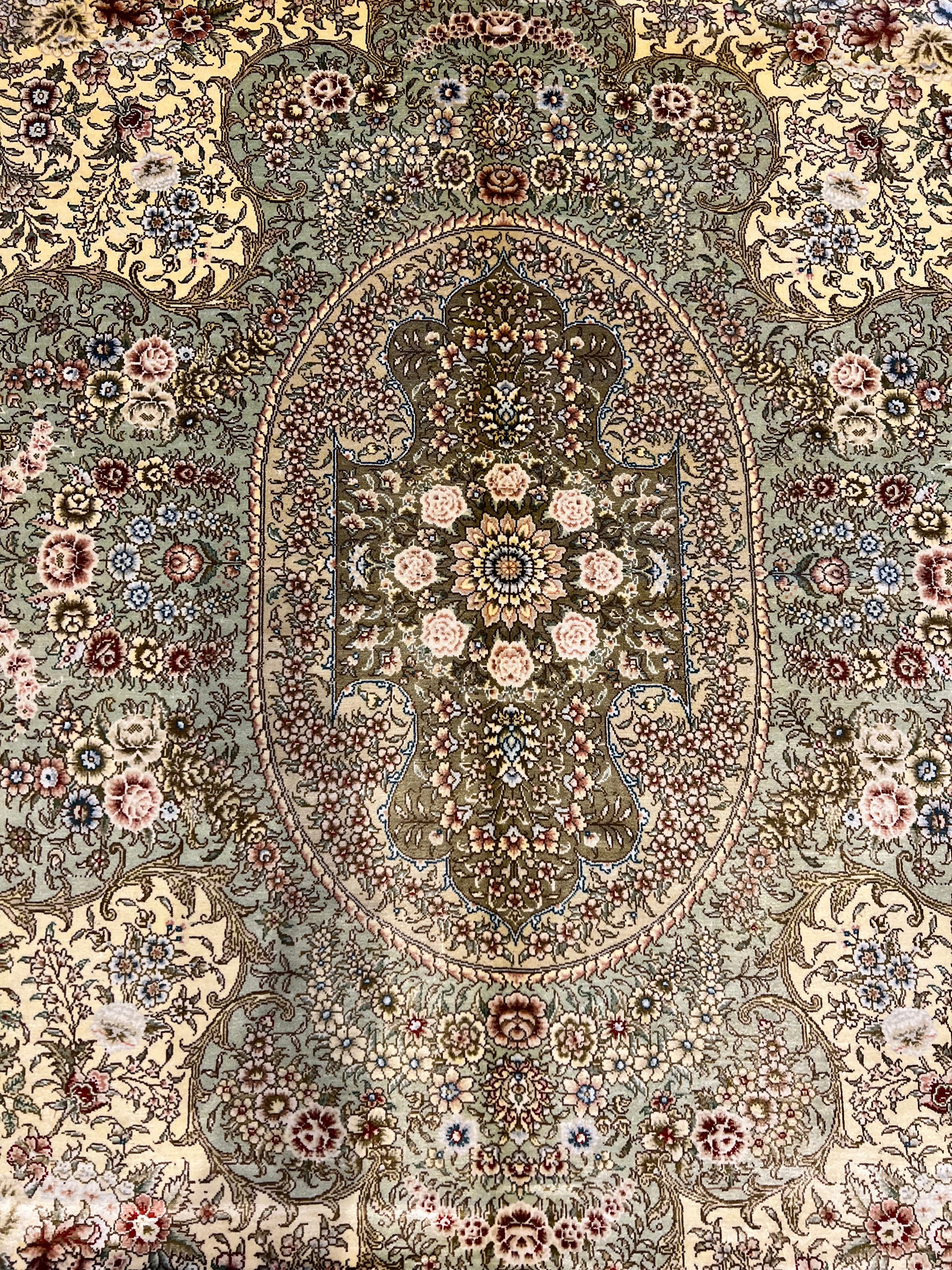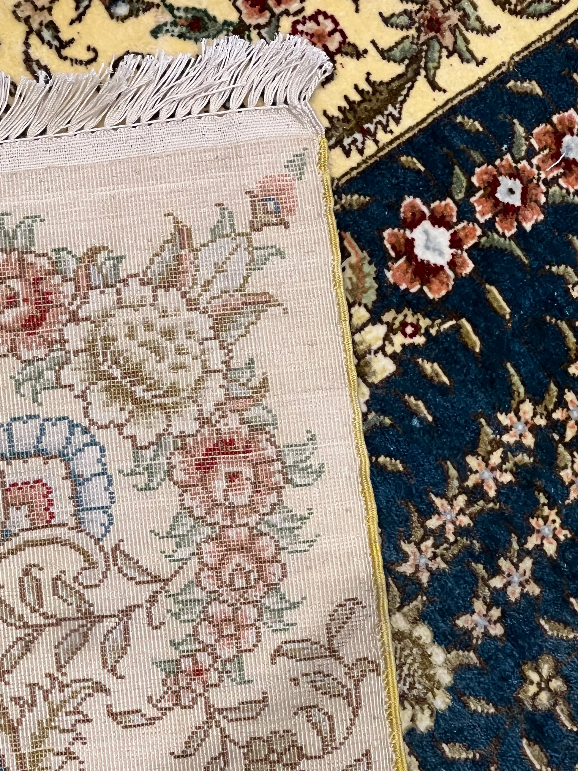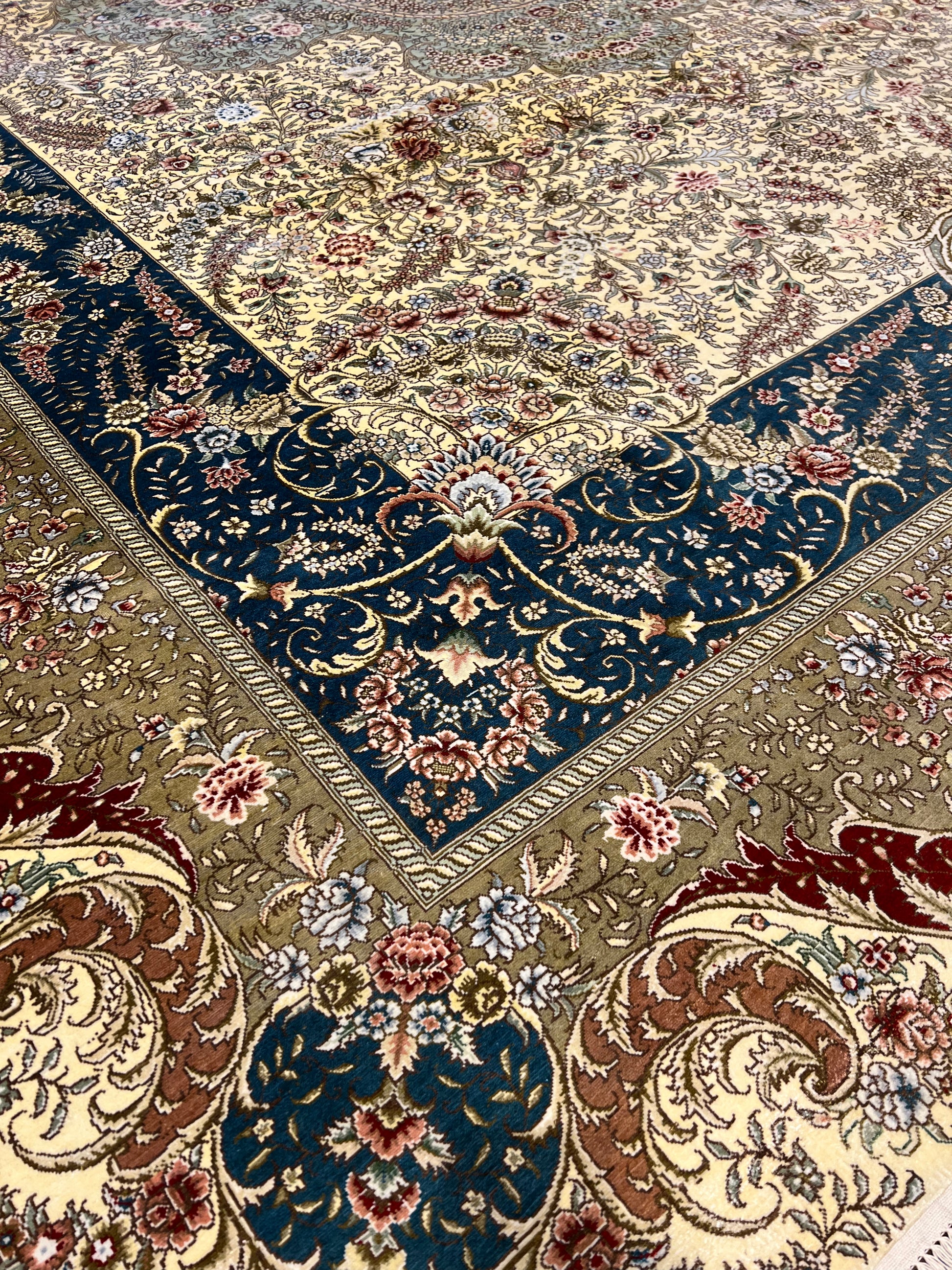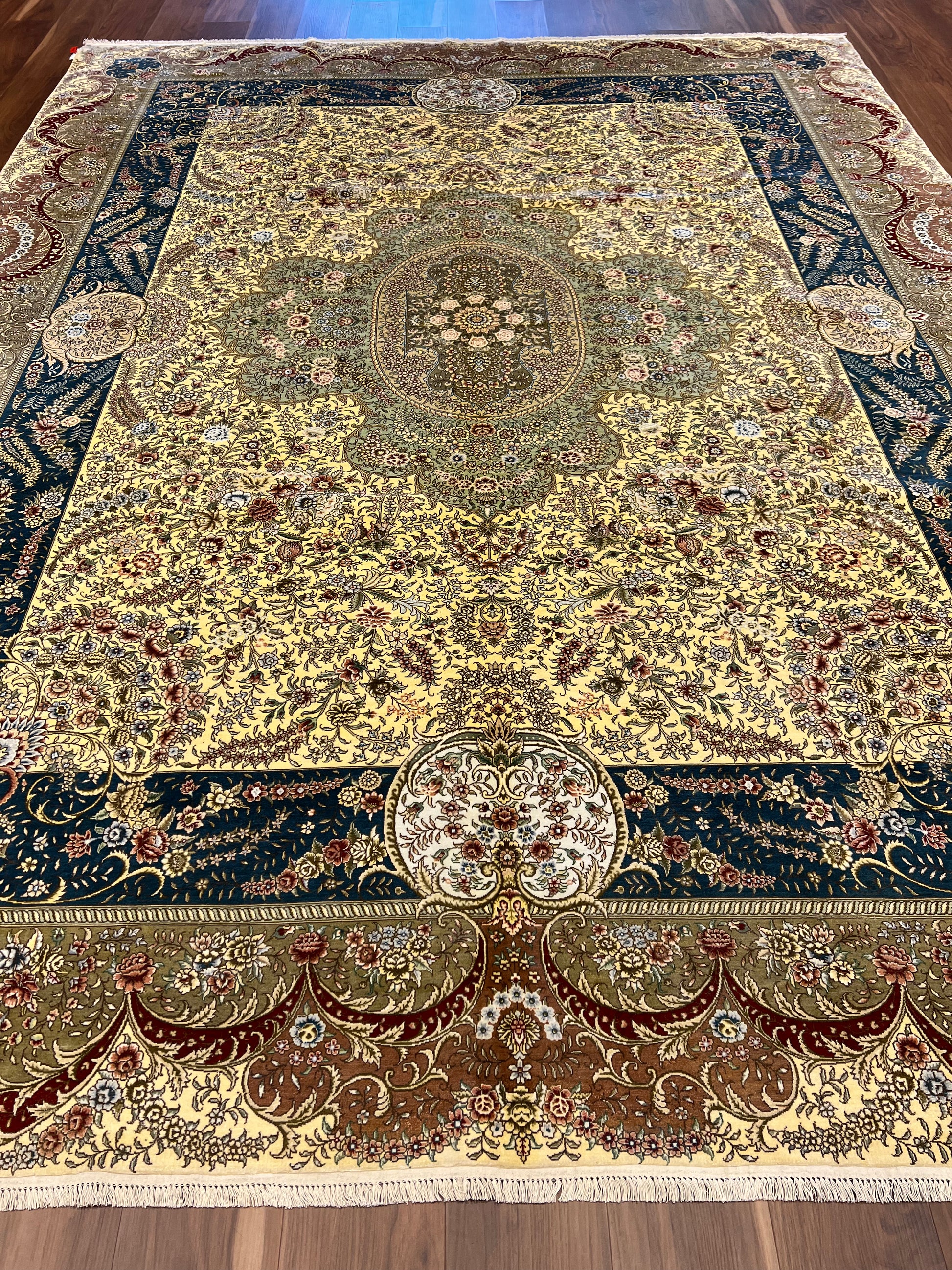This exquisite Tebriz design rug is a symphony of intricate patterns and rich, royal hues. Woven from the finest silk, it offers both luxury and durability. The detailed borders frame a central medallion, complementing the ornate field flourishing with floral motifs. Ideal for lending a classic elegance to any sophisticated interior, this rug's plush texture and reflective gloss embody timeless artistry and craftsmanship.
