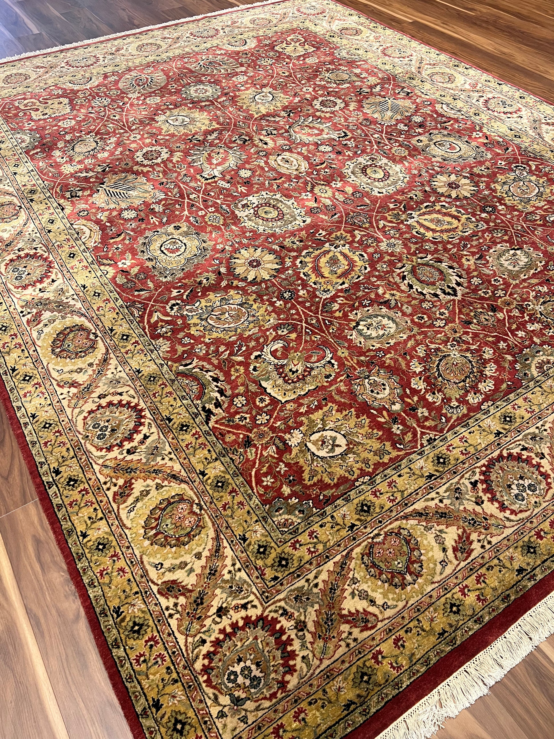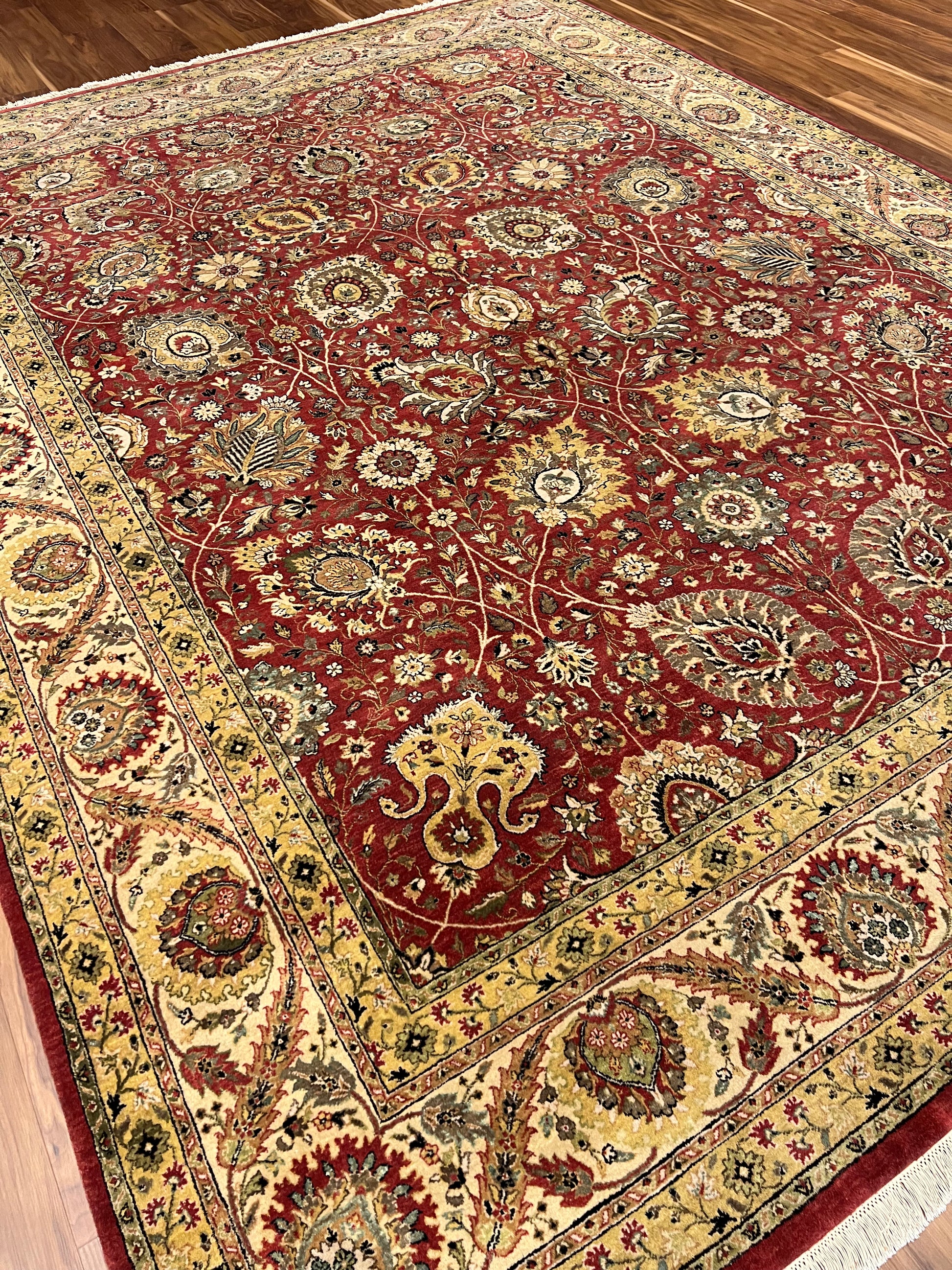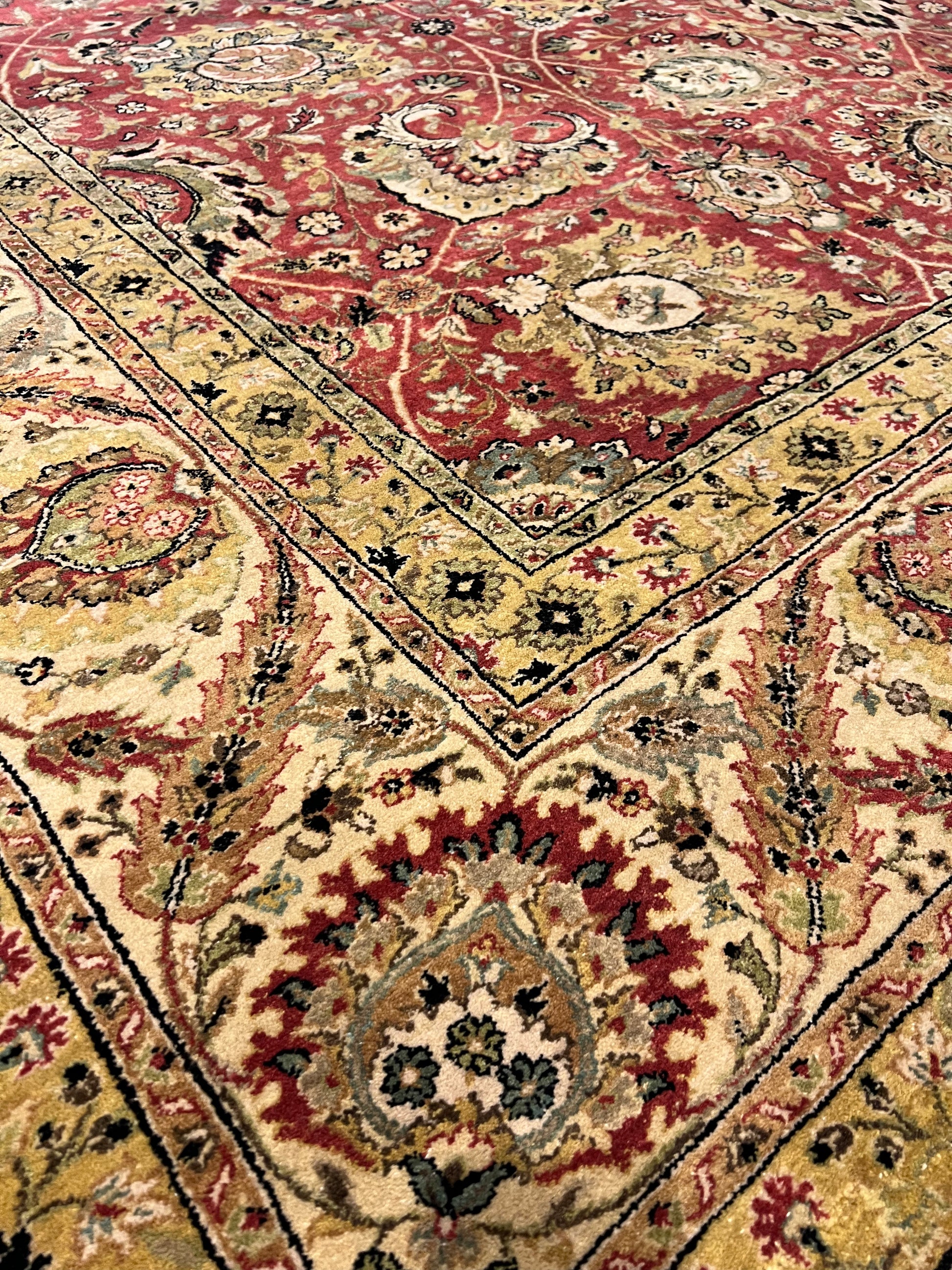 This exquisite Tebriz rug is a magnificent piece of traditional craftsmanship. Designed with a rich red field and detailed with intricate patterns, it exhibits florals and medallions in a symphony of gold and beige tones. The border complements the field with its equally intricate design, making it a timeless addition to any space. Its tight woolen weave ensures durability and a plush texture, reflecting the artisanship of its creators. This rug is ideal for adding warmth and elegance to a classic or formal interior decor.