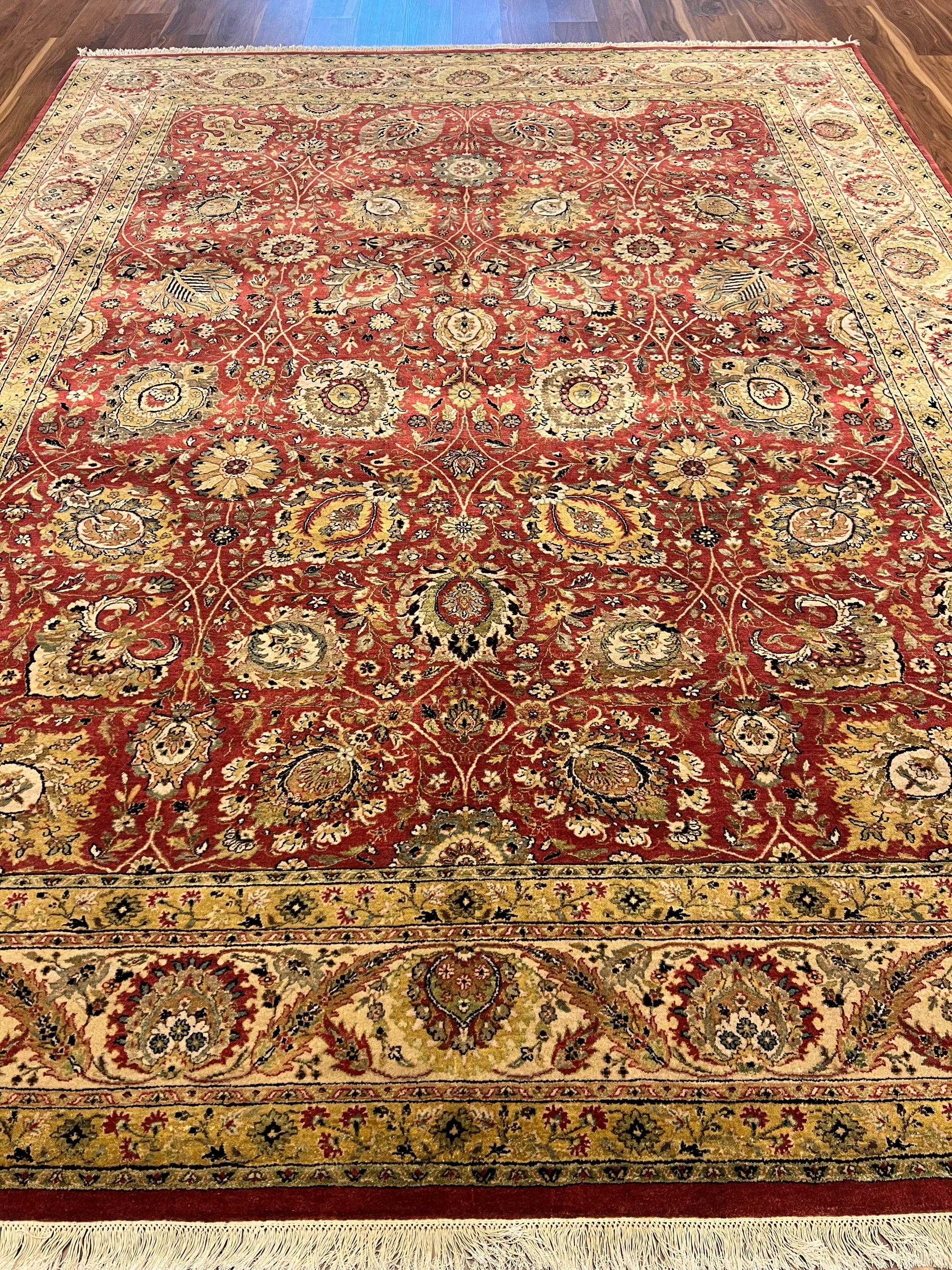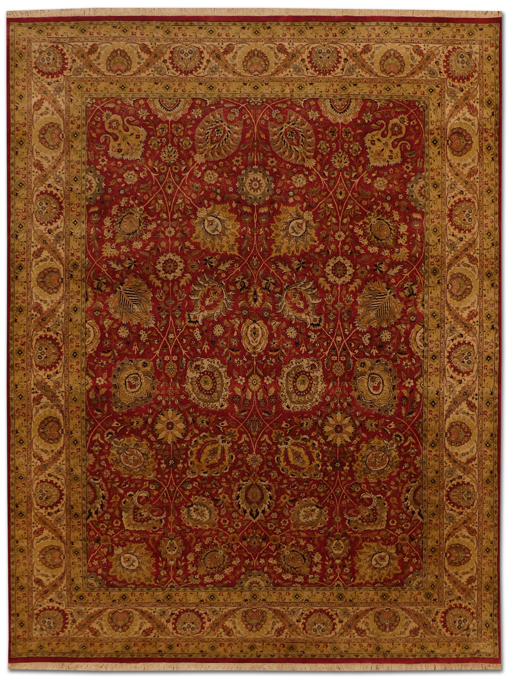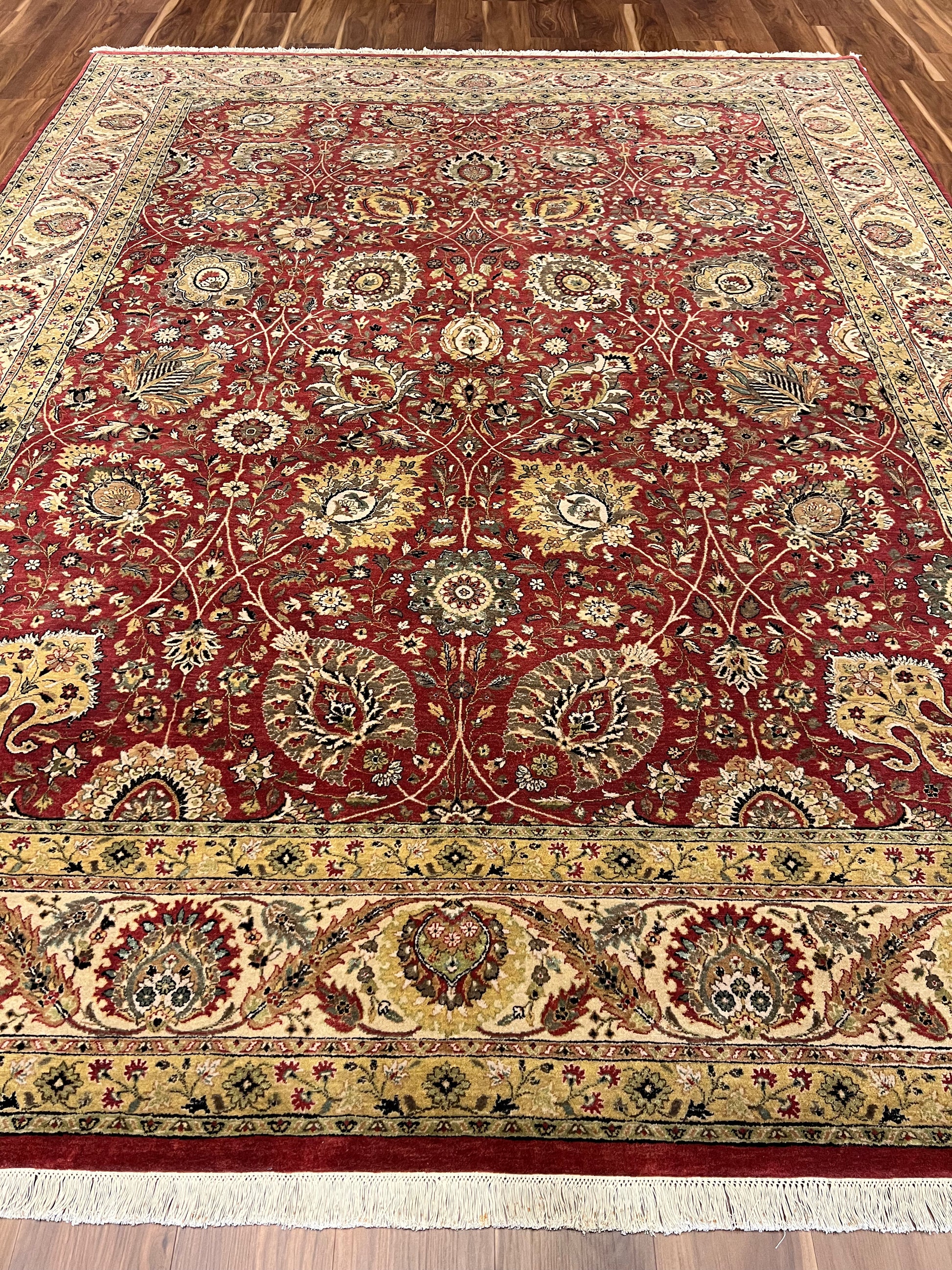 This exquisite Tebriz rug is a magnificent piece of traditional craftsmanship. Designed with a rich red field and detailed with intricate patterns, it exhibits florals and medallions in a symphony of gold and beige tones. The border complements the field with its equally intricate design, making it a timeless addition to any space. Its tight woolen weave ensures durability and a plush texture, reflecting the artisanship of its creators. This rug is ideal for adding warmth and elegance to a classic or formal interior decor.