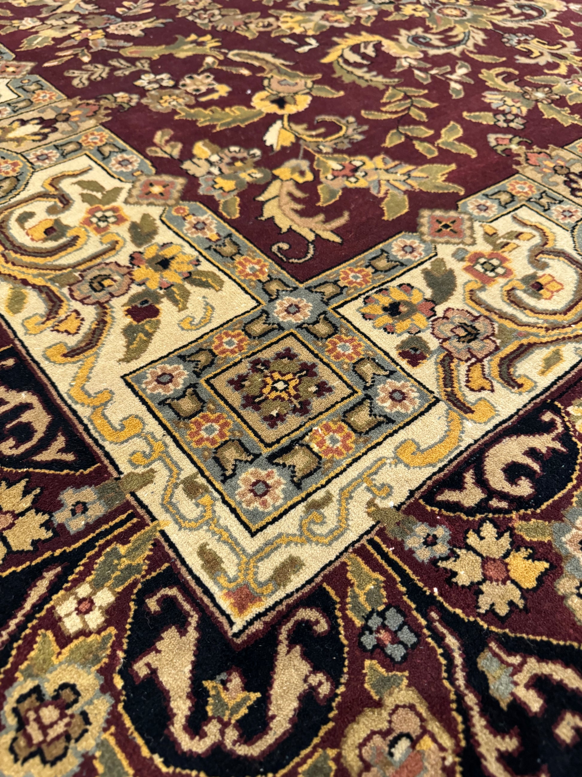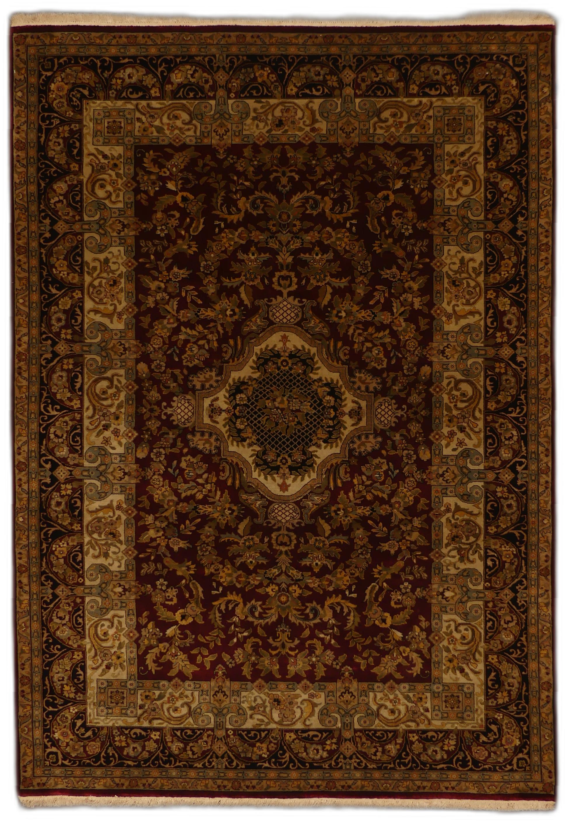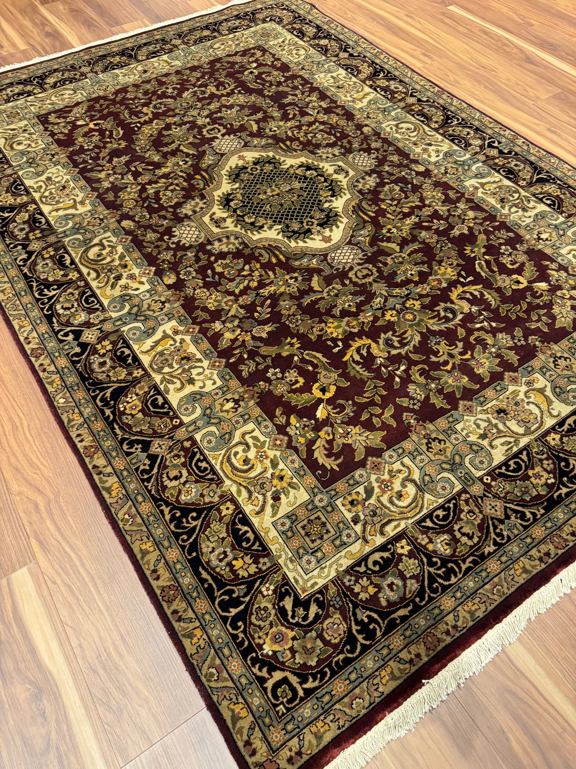 This exquisite Tebriz rug boasts an ornate central medallion surrounded by intricate floral and vine motifs, set against a rich brown field. The beige and gold accents within the pattern create a harmonious contrast, while the densely woven wool pile ensures both comfort and durability. With its classical design, the rug captures the essence of Persian artistry and is ideal for enhancing the elegance of any living space or formal room.