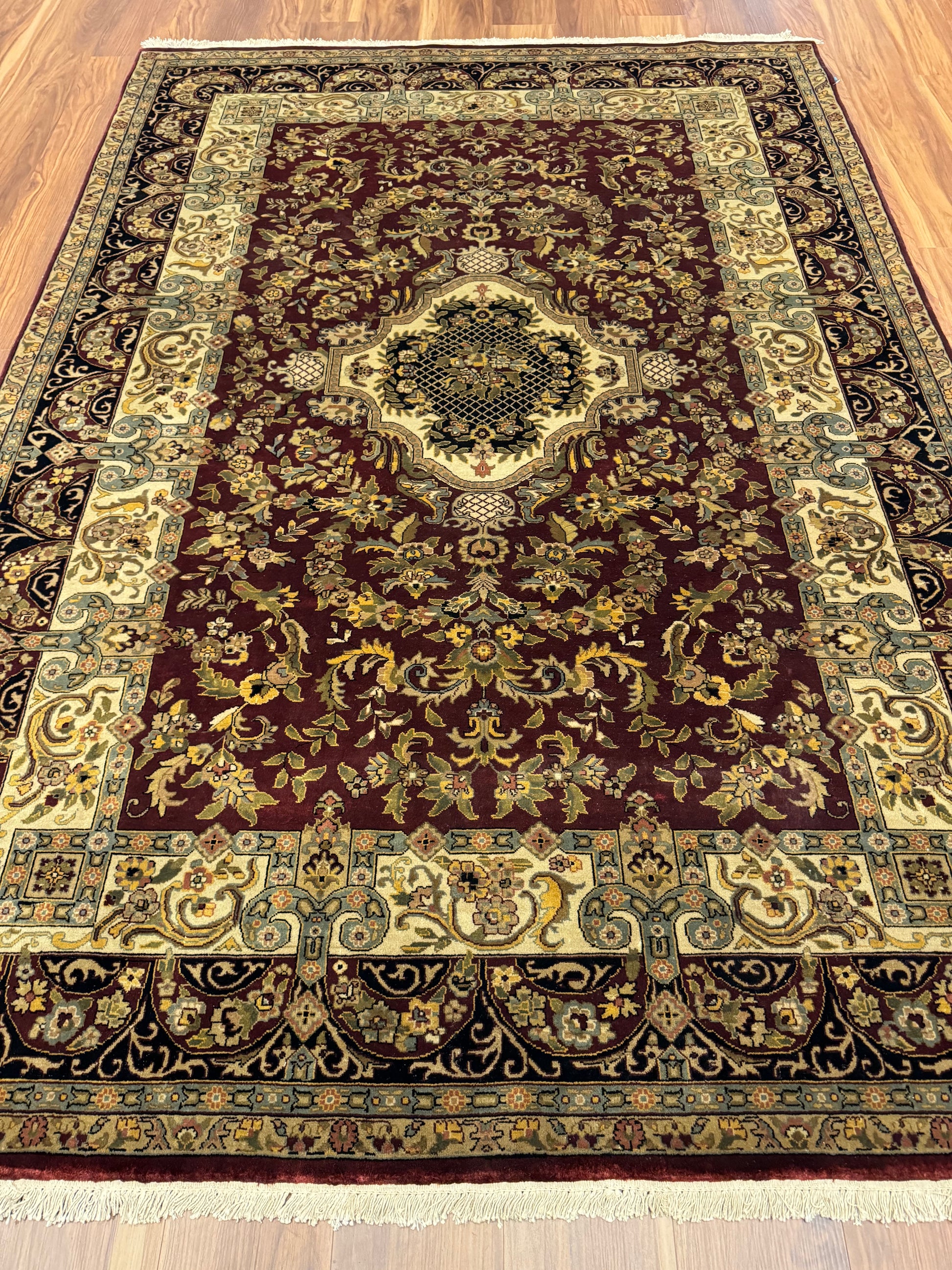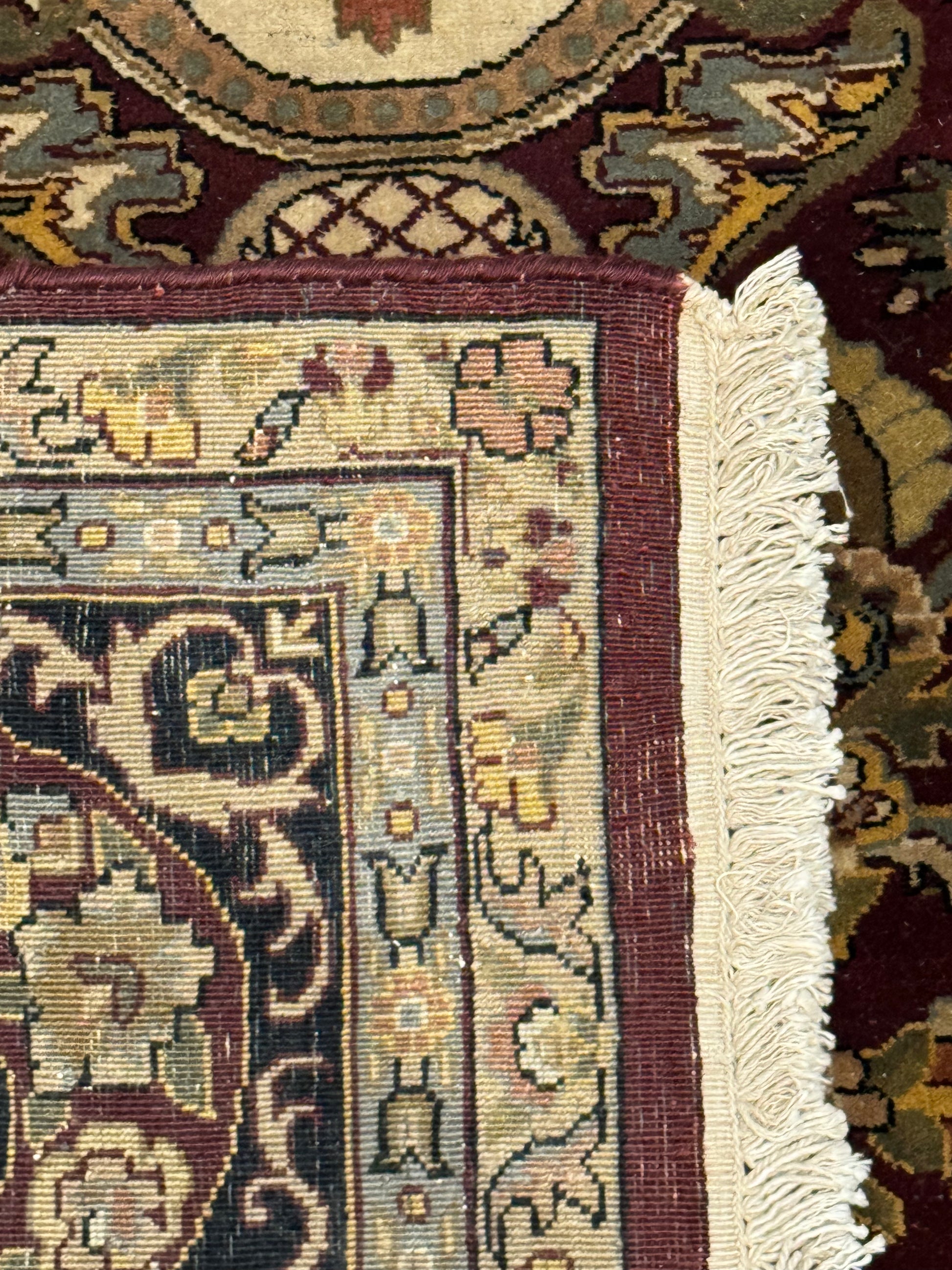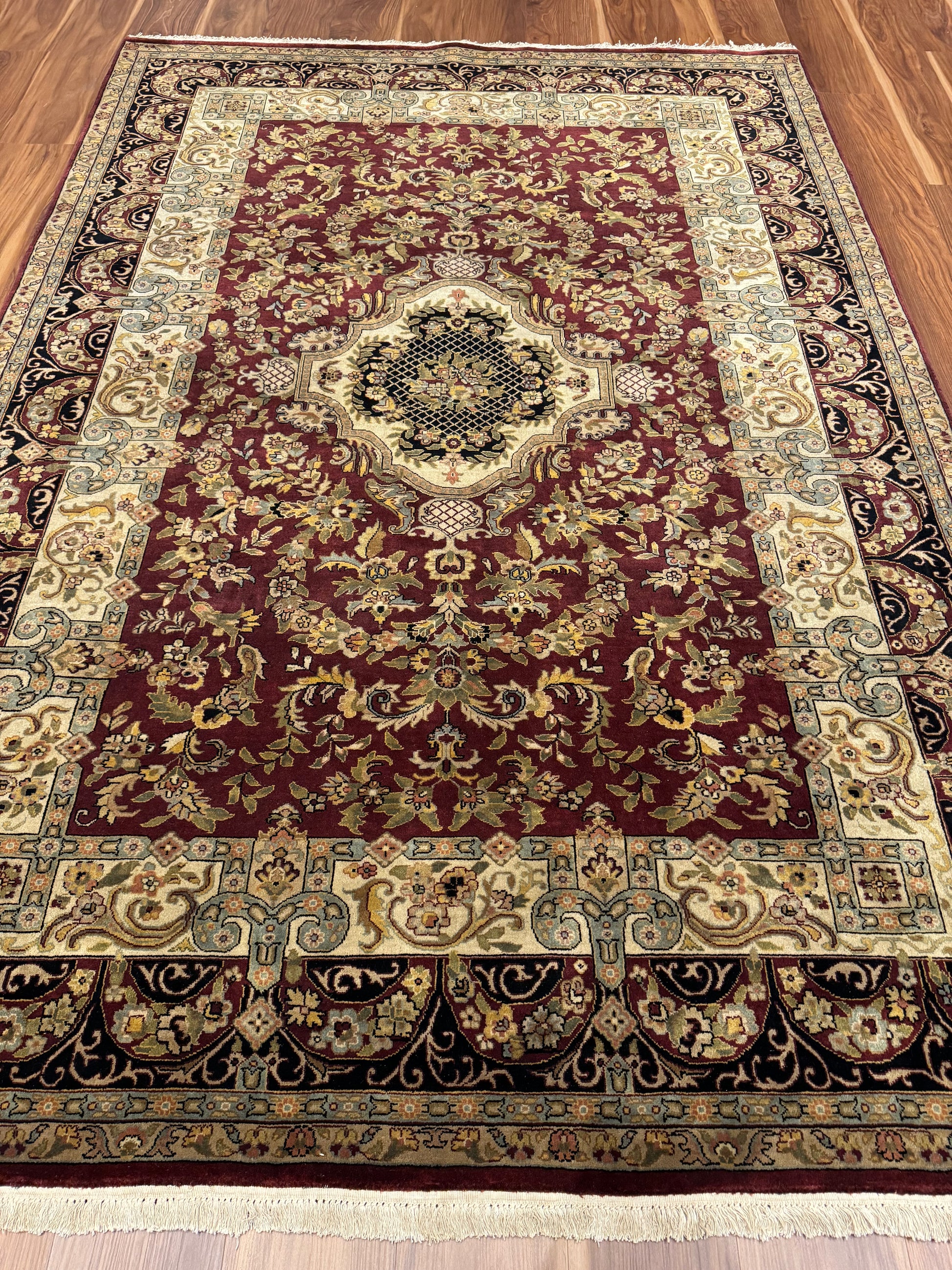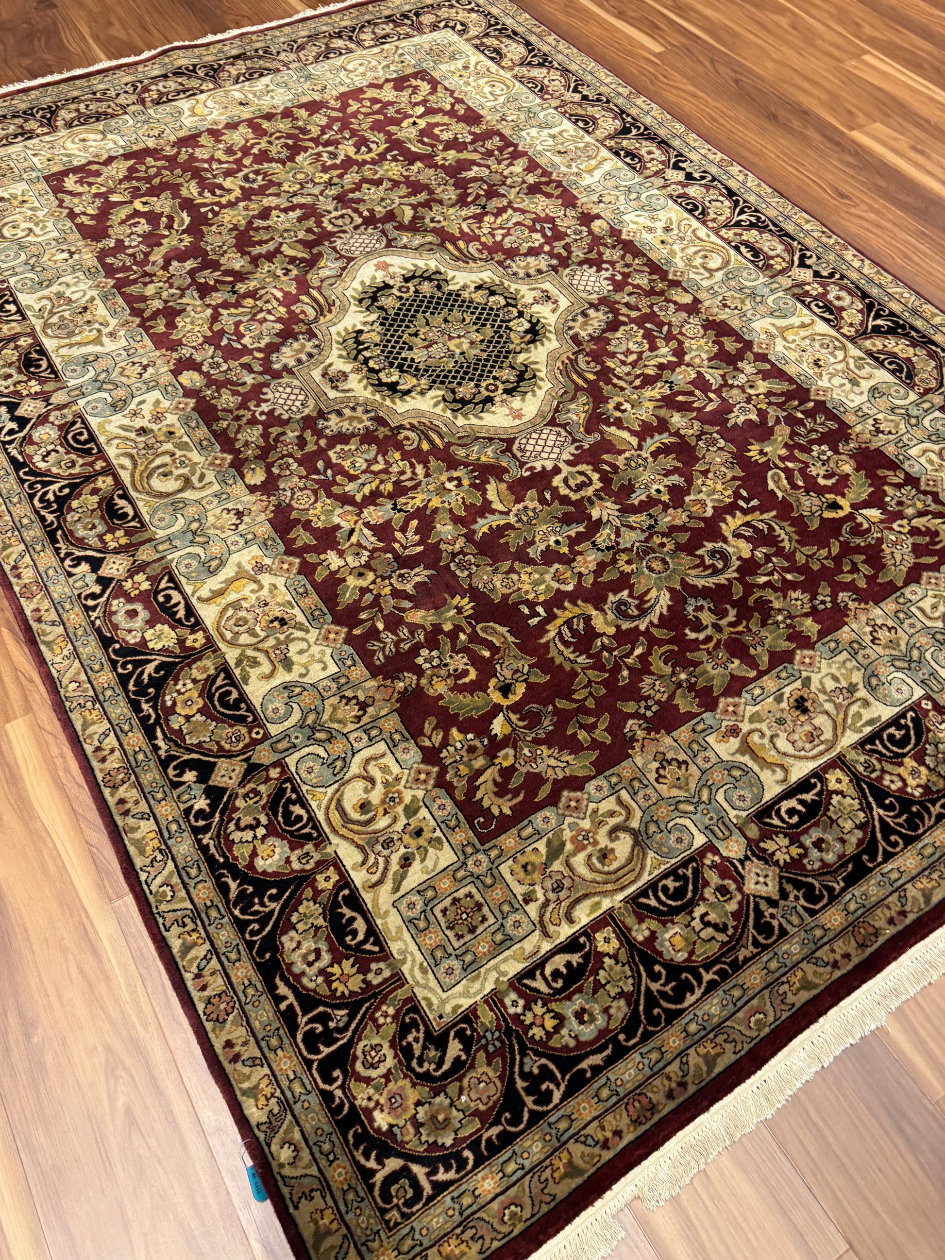 This exquisite Tebriz rug boasts an ornate central medallion surrounded by intricate floral and vine motifs, set against a rich brown field. The beige and gold accents within the pattern create a harmonious contrast, while the densely woven wool pile ensures both comfort and durability. With its classical design, the rug captures the essence of Persian artistry and is ideal for enhancing the elegance of any living space or formal room.