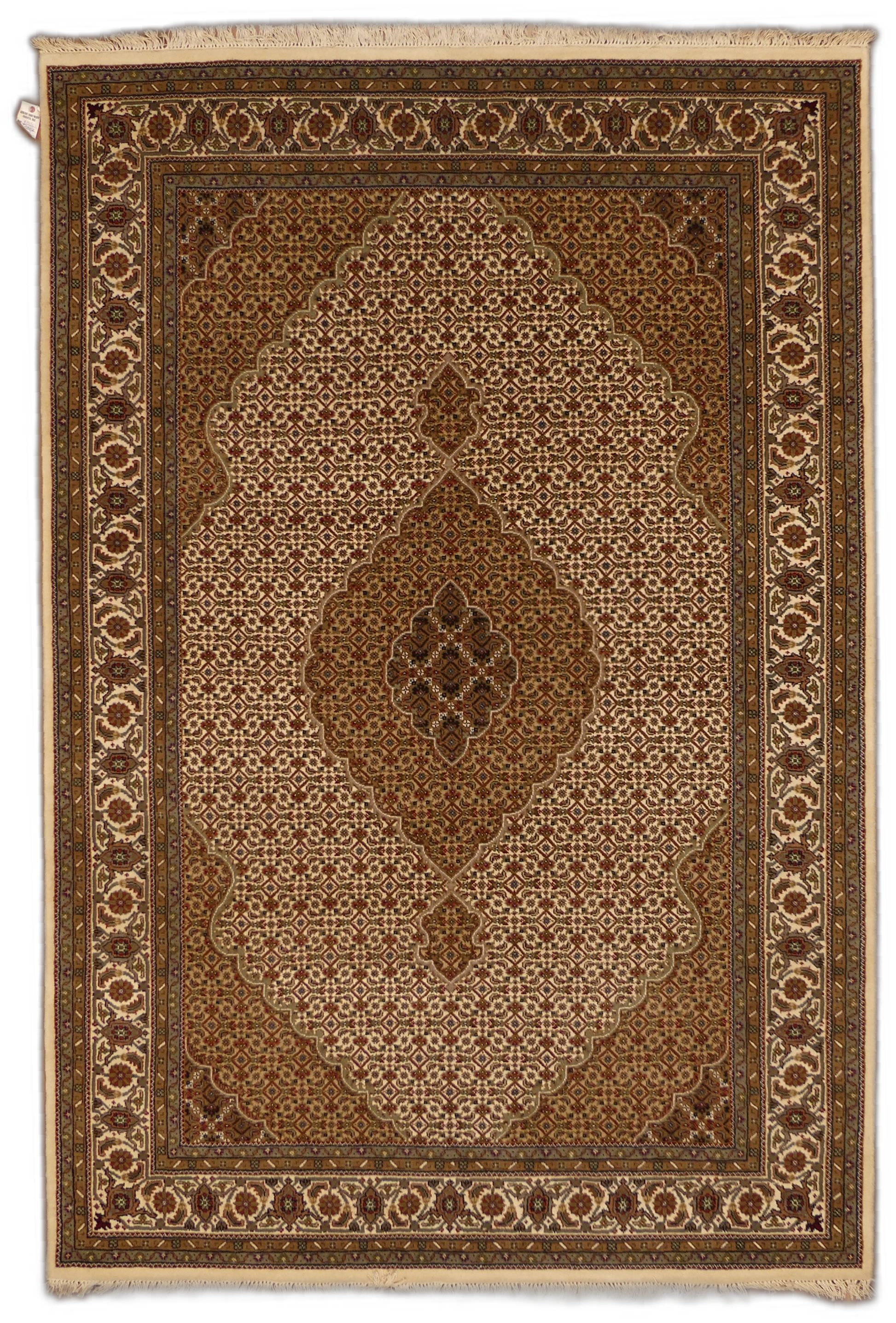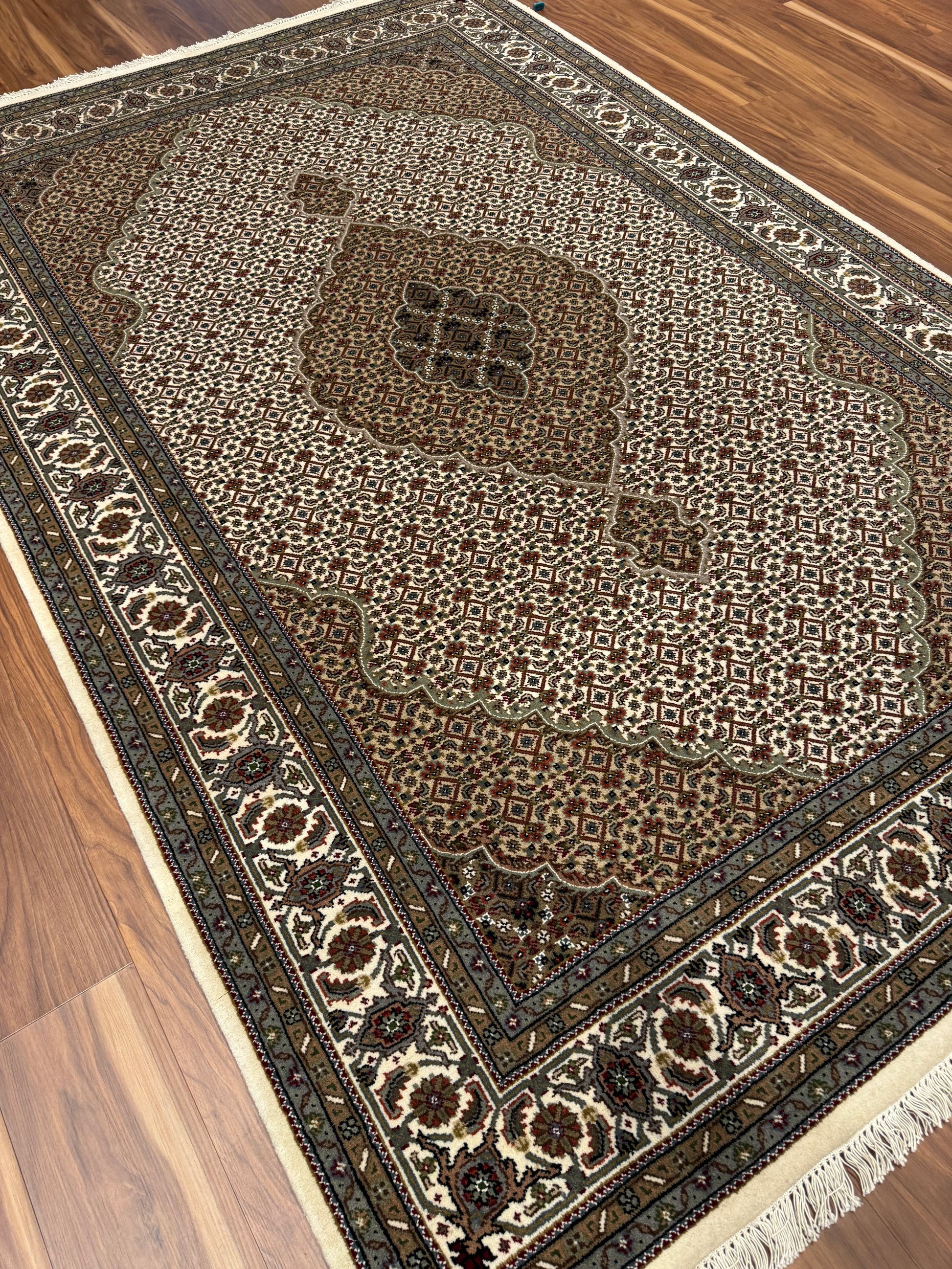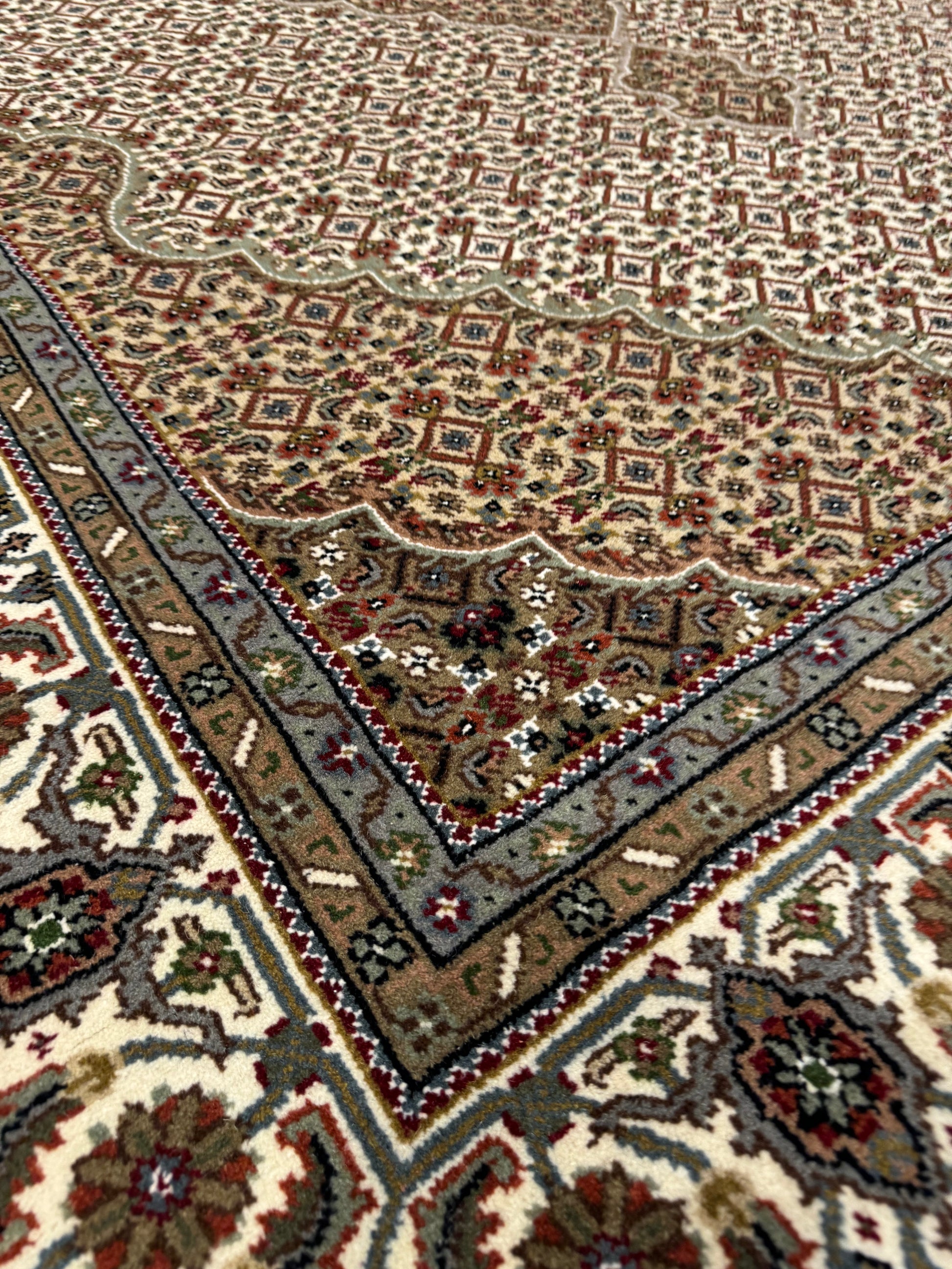 This exquisite Tebriz rug boasts expert craftsmanship, woven with a combination of wool and silk to create a luxurious feel underfoot. The intricate designs feature floral and curvilinear motifs, reminiscent of classical Persian artistry. The rich brown and beige hues are balanced by ivory accents that highlight the detailed patterns, ensuring this rug will bring warmth and elegance to any room. Suitable for both contemporary and traditional interiors, this Tebriz rug is a testament to timeless design and quality craftsmanship.