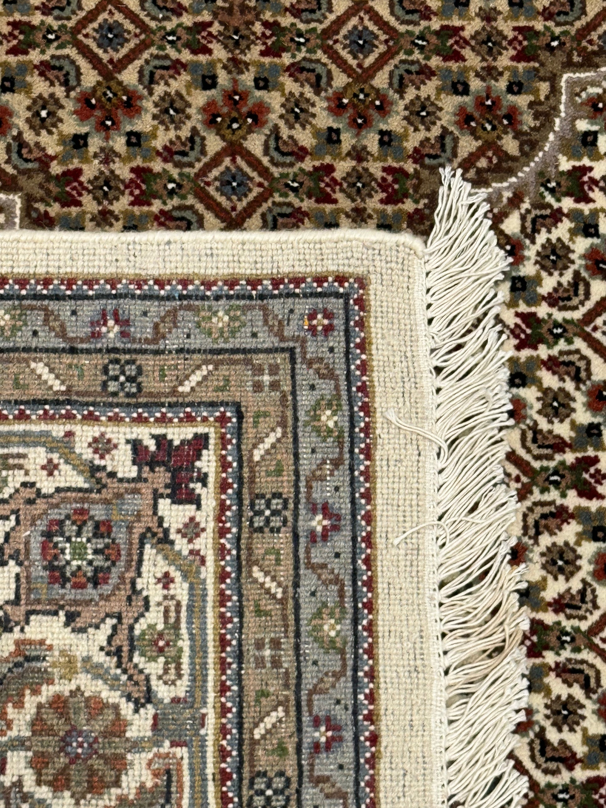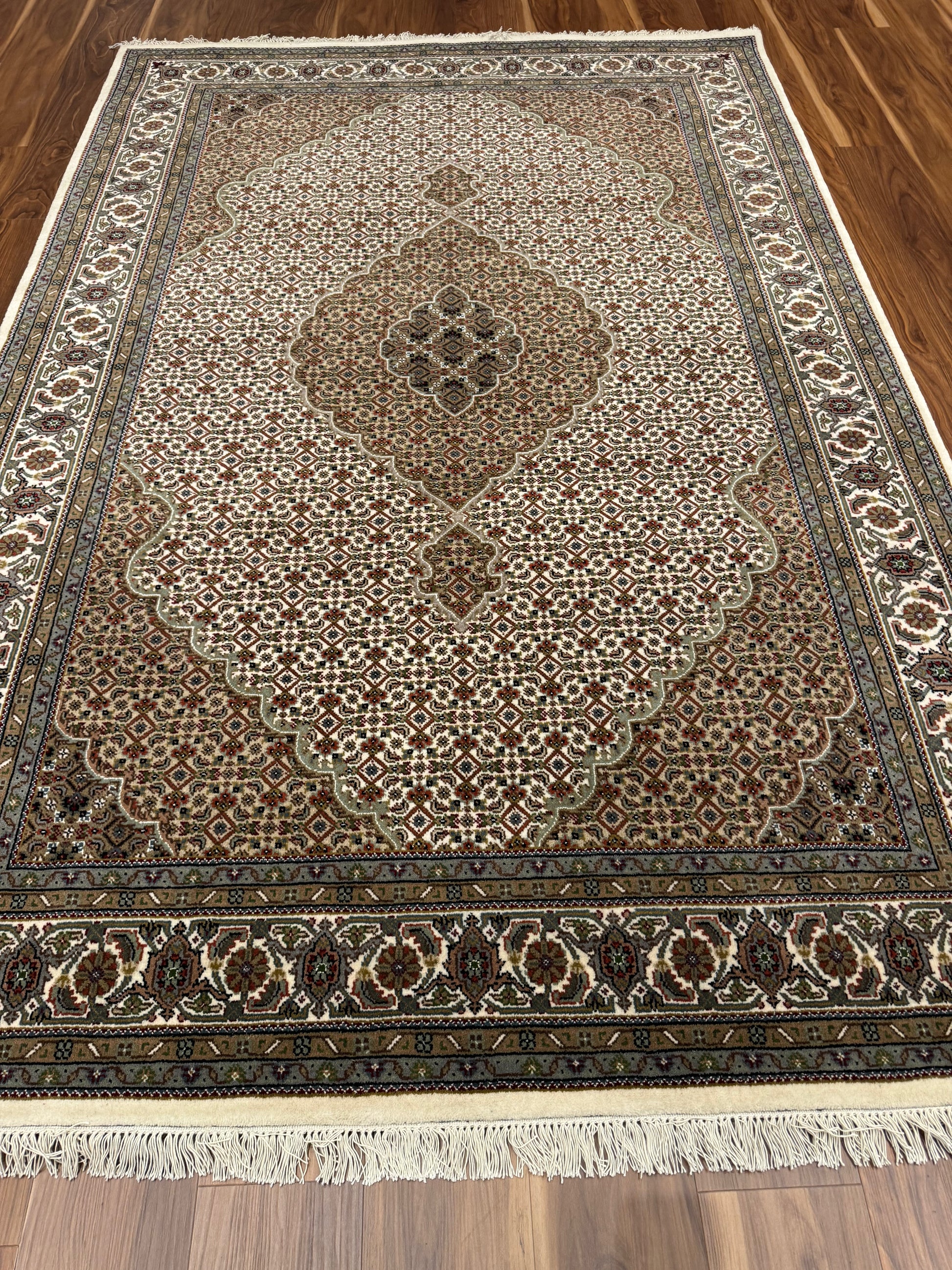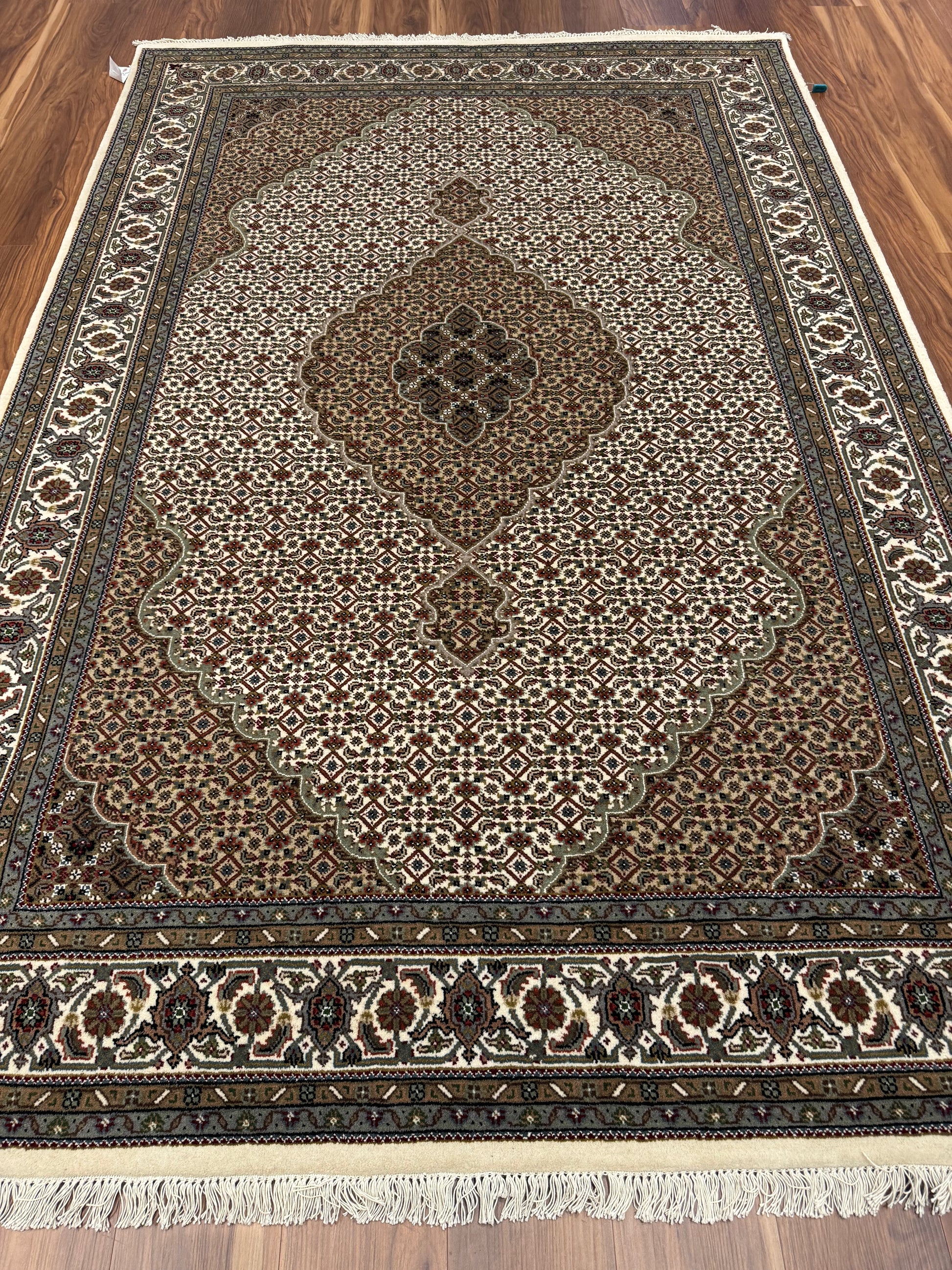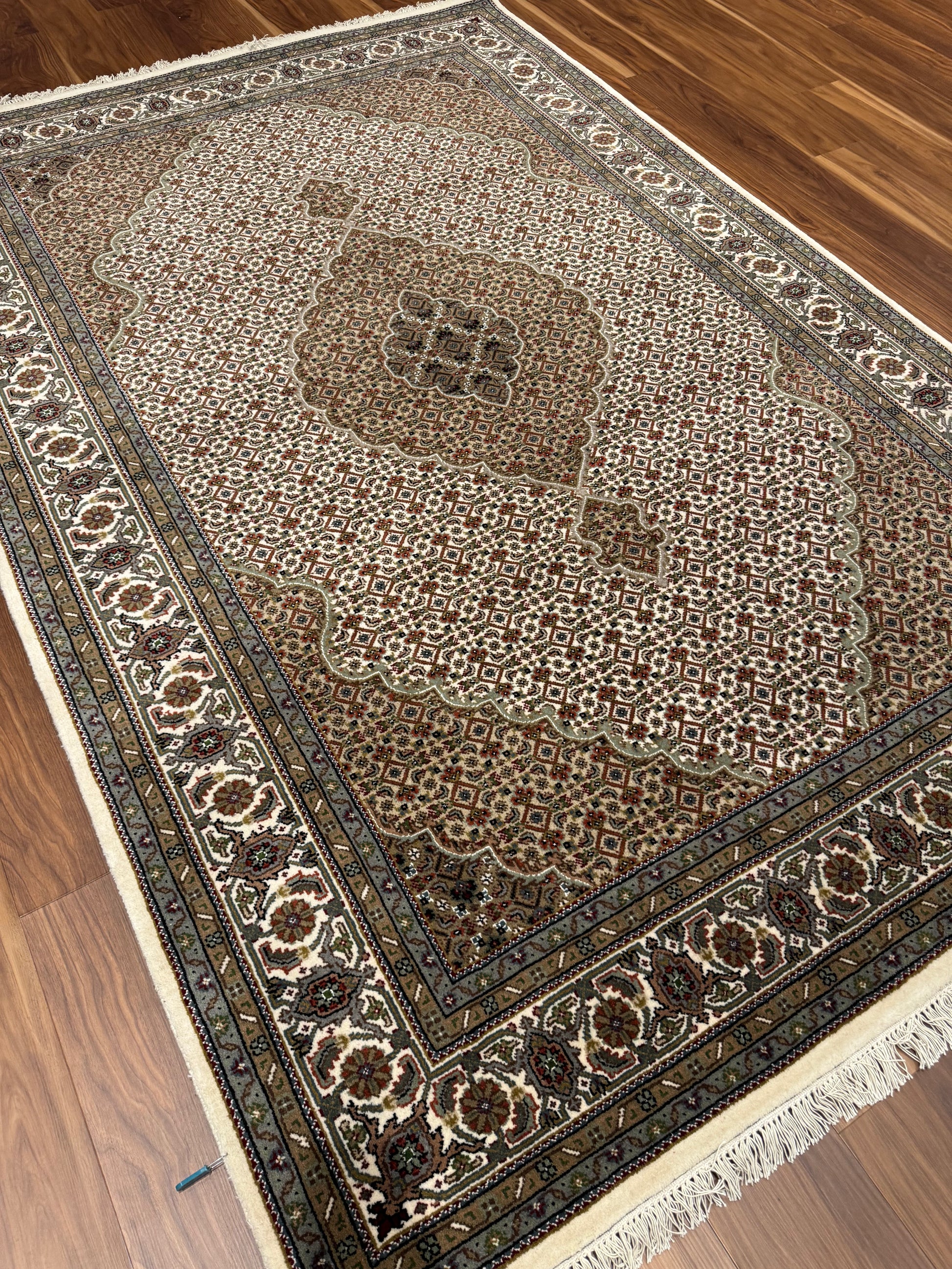 This exquisite Tebriz rug boasts expert craftsmanship, woven with a combination of wool and silk to create a luxurious feel underfoot. The intricate designs feature floral and curvilinear motifs, reminiscent of classical Persian artistry. The rich brown and beige hues are balanced by ivory accents that highlight the detailed patterns, ensuring this rug will bring warmth and elegance to any room. Suitable for both contemporary and traditional interiors, this Tebriz rug is a testament to timeless design and quality craftsmanship.