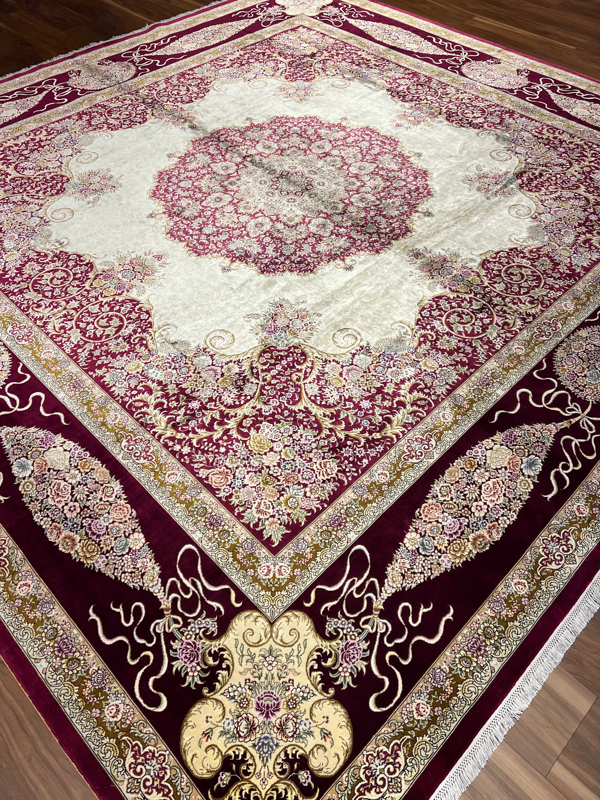 This exquisite Tebriz Silk rug is a masterpiece of traditional design, woven from the finest silk, which bestows a luxurious sheen and ultra-soft feel. The intricate central medallion and detailed border showcase a rich burgundy hue, accented by a harmonious beige background and gold embellishments. Ideal for adding a touch of elegance and old-world charm to any refined space, this rug's exceptional craftsmanship is evident in every knot.