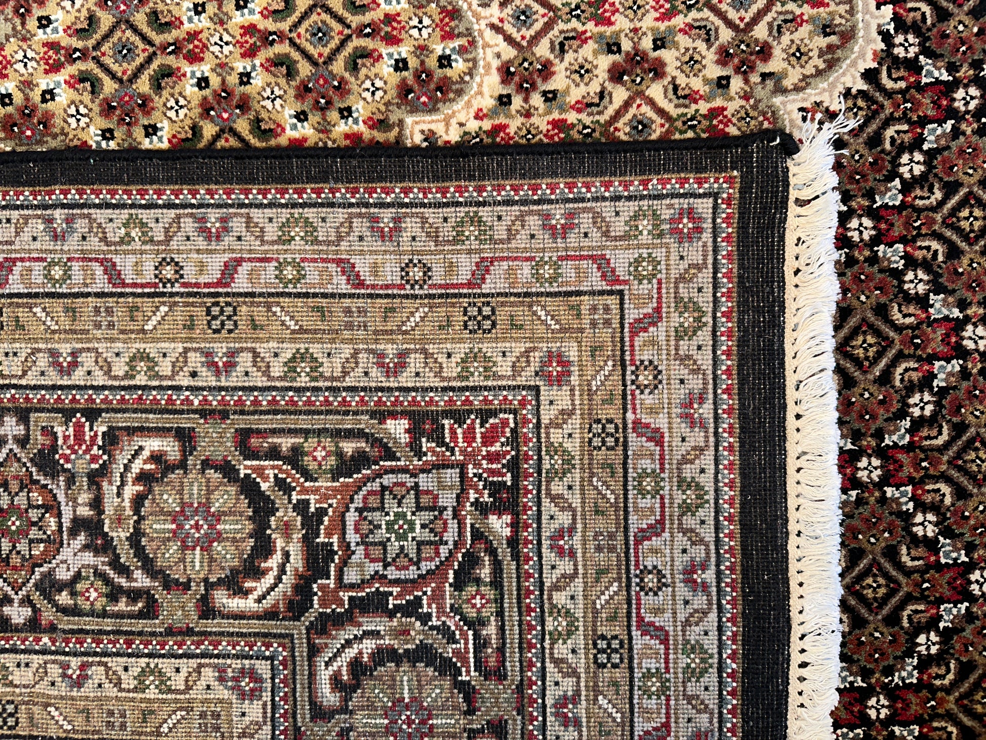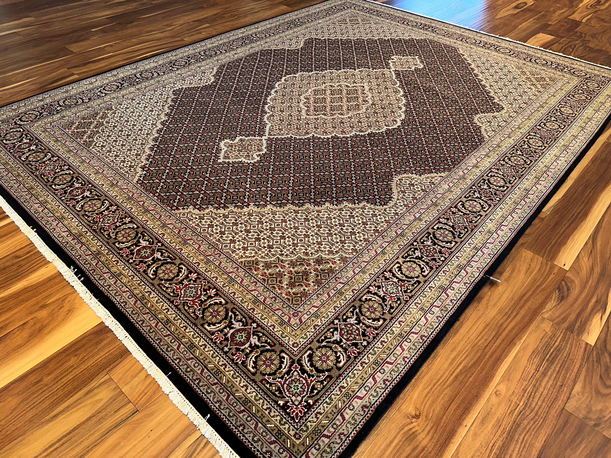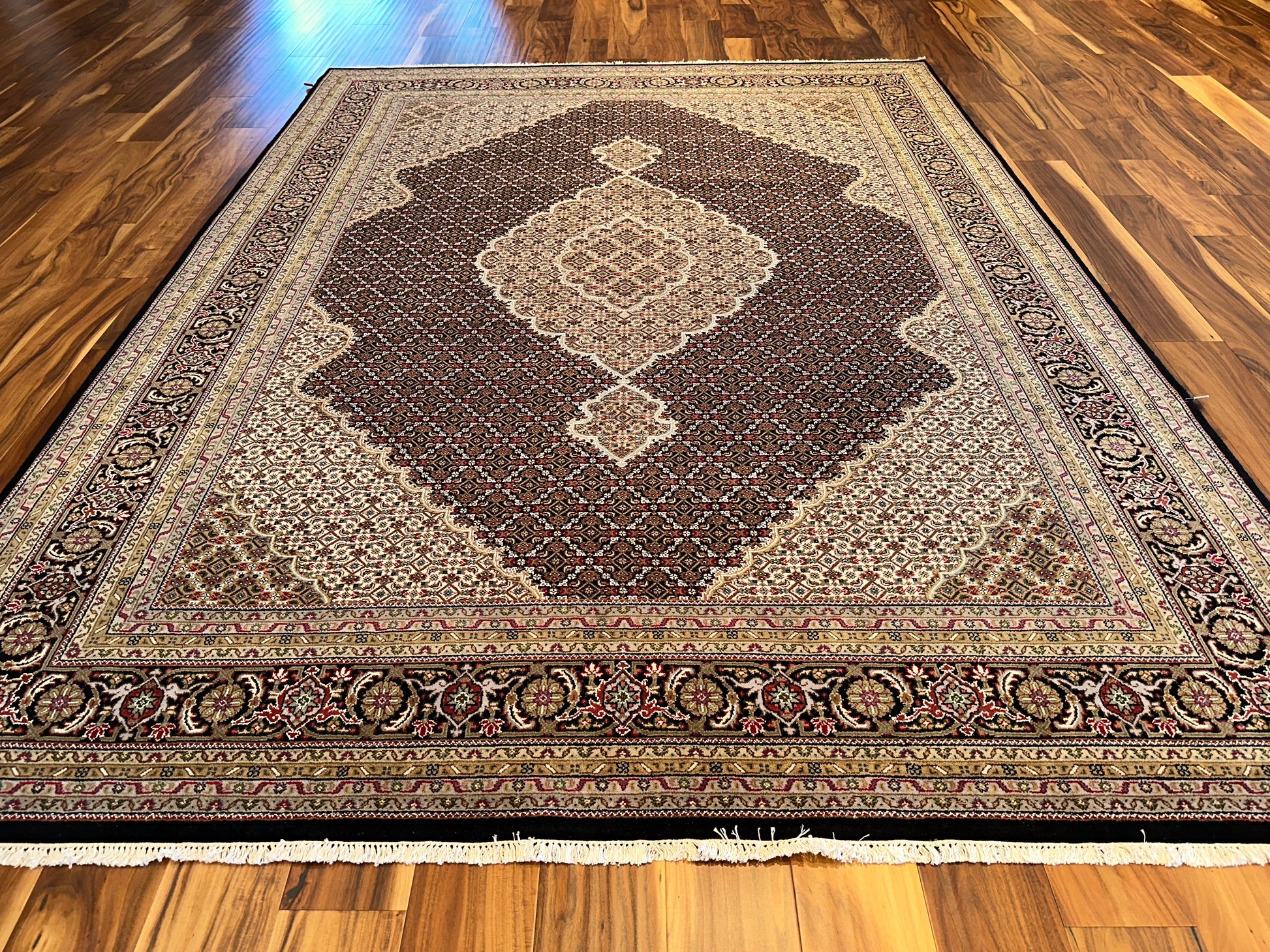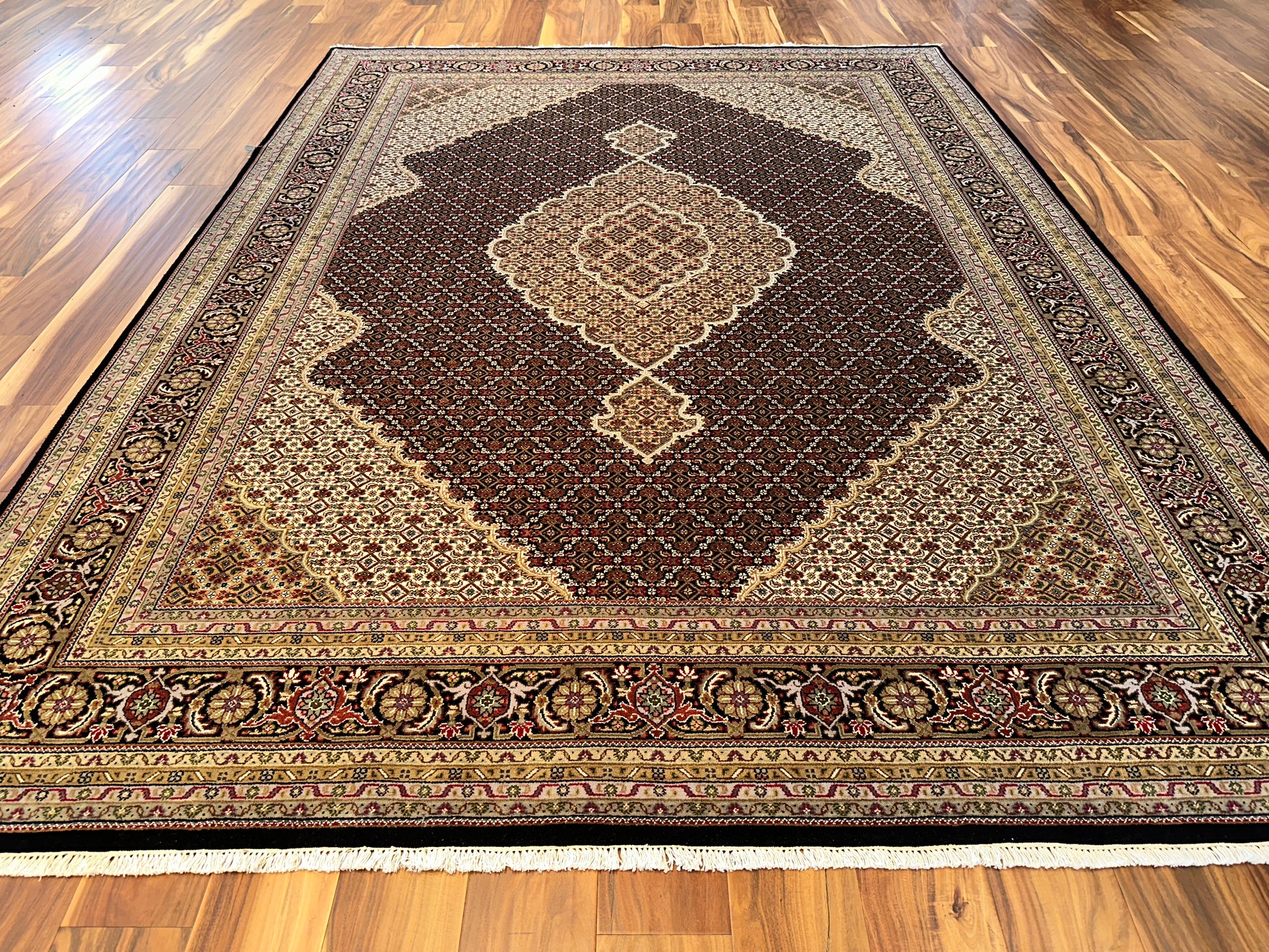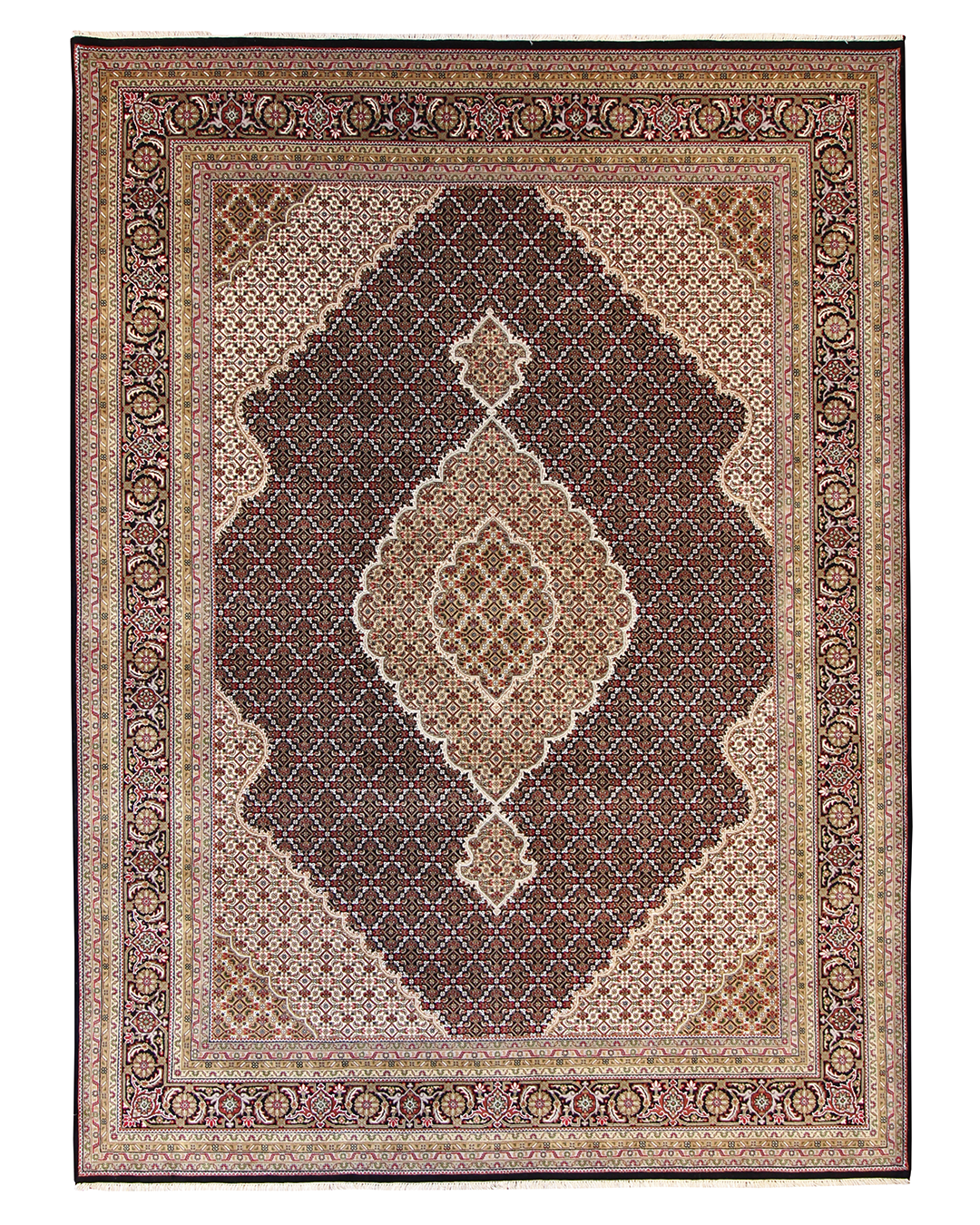 This richly detailed hand-knotted rug features a classic Persian medallion design, with a striking layered diamond motif centered on a field of deep chocolate brown and surrounded by delicate floral latticework. The ivory corners create a graceful contrast, drawing the eye inward toward the intricately woven centerpiece. Framed by ornate borders in warm shades of rose, cream, and olive, this rug offers timeless sophistication, ideal for traditional living and dining rooms.