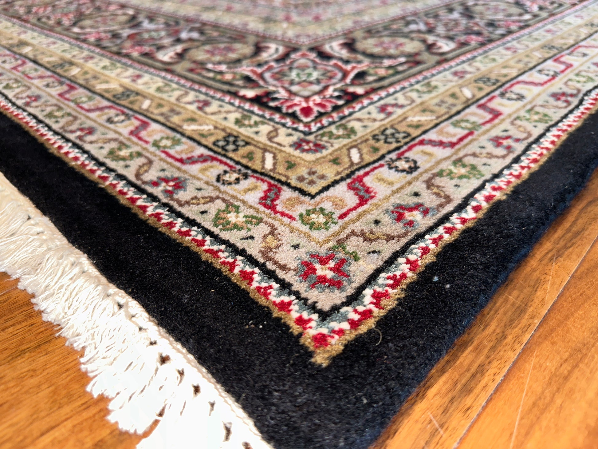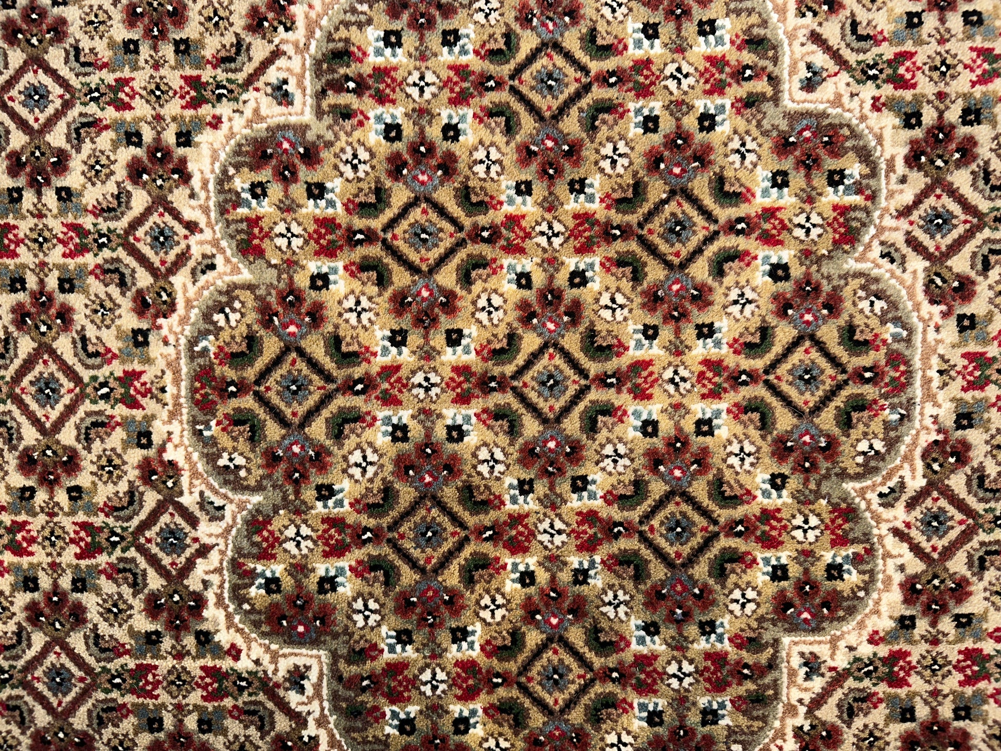 - Design: Central diamond medallion with floral lattice field and tiered borders