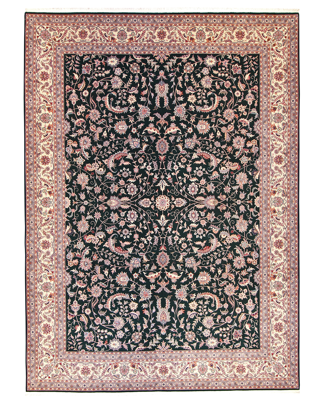 This striking rug blends the finesse of fine floral weaving with the grandeur of classic Persian motifs. A deep, midnight navy field hosts a symphony of delicate blossoms, scrolling vines, and palmettes in warm rose, ivory, and pale sage—an elegant harmony of contrasts. The intricate border frames the center like fine lace, adding a regal, enduring finish ideal for formal spaces or traditional interiors.
