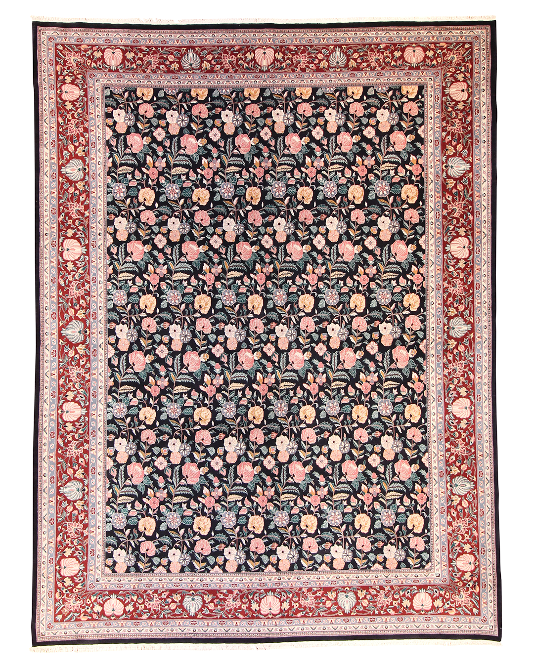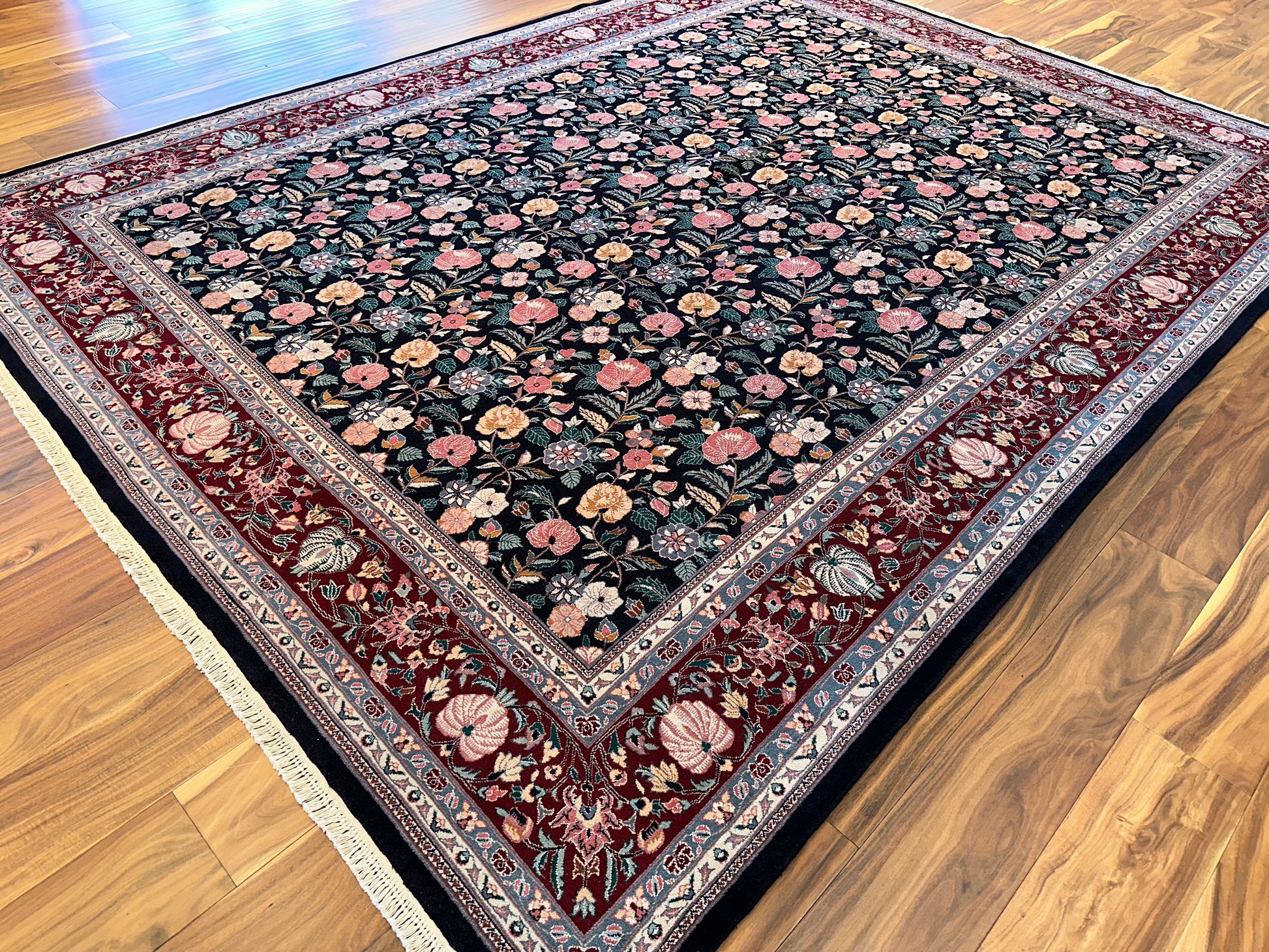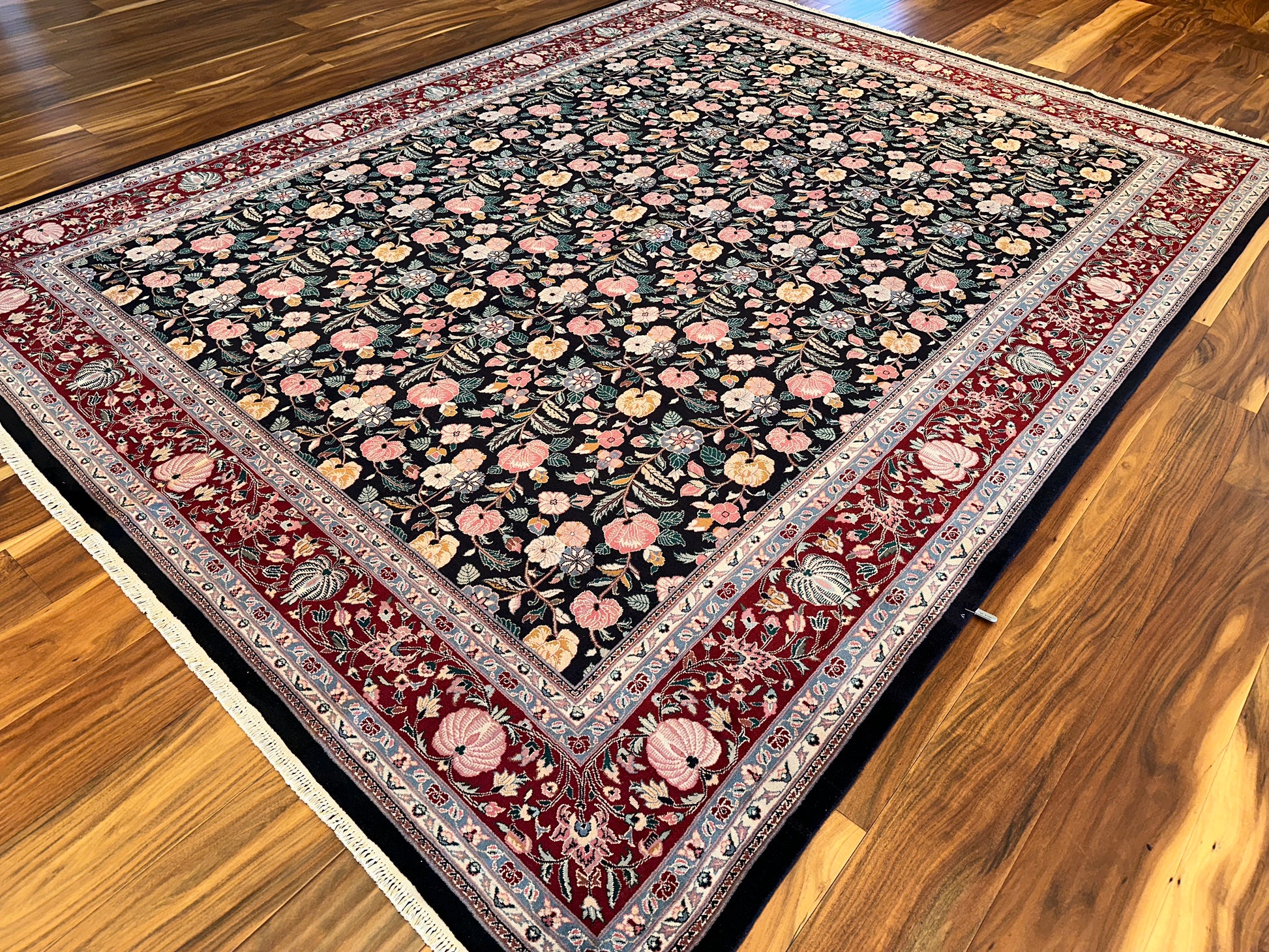 Charming and lively, this handwoven rug features a blooming field of pastel flowers nestled against a deep navy background. With its cheerful florals in rose, coral, mint, and soft gold, this piece offers a garden-like atmosphere, beautifully framed by a ruby red border that adds warmth and elegance. It’s a delightful infusion of color and whimsy, ideal for brightening up classic or eclectic interiors.