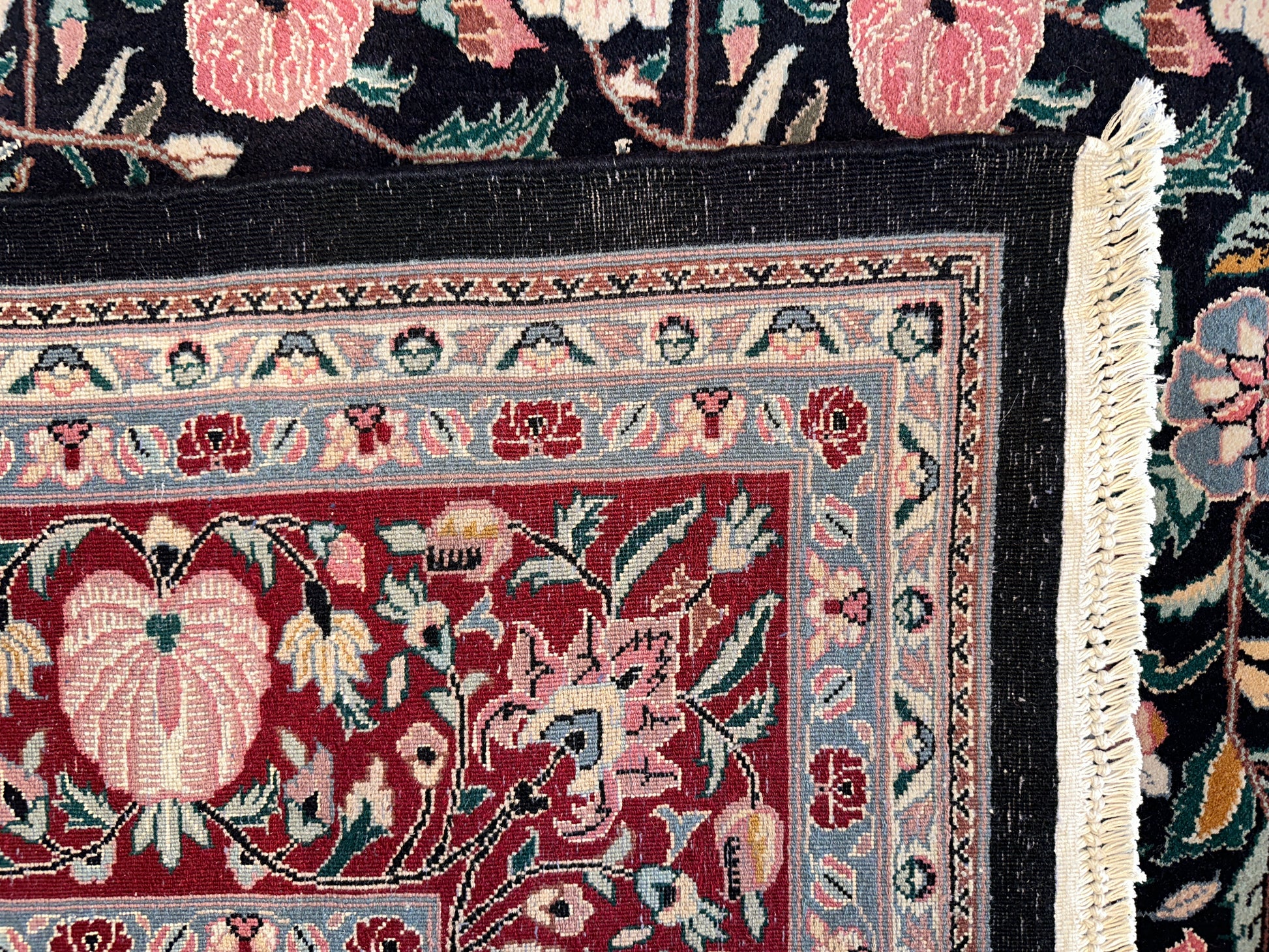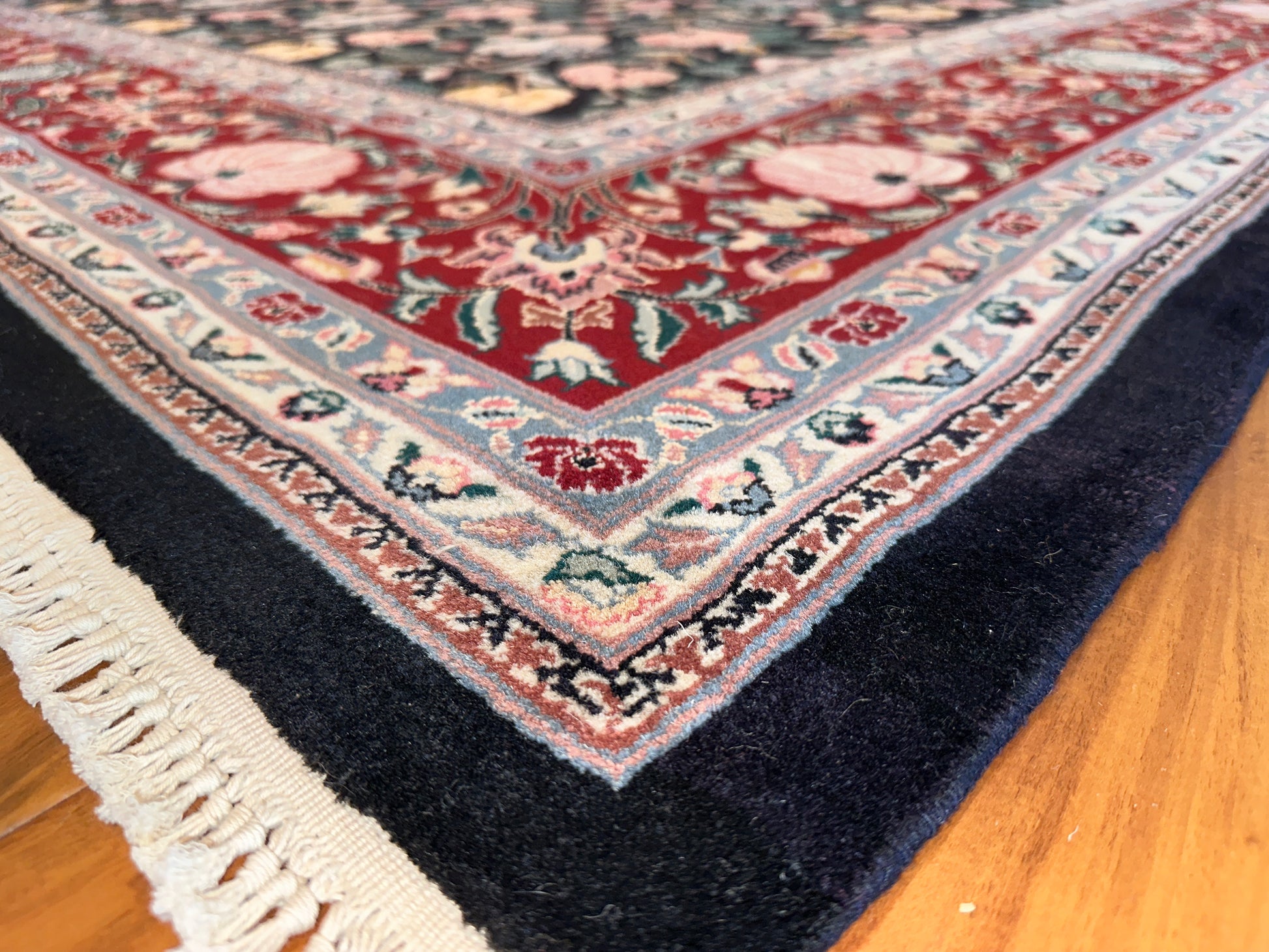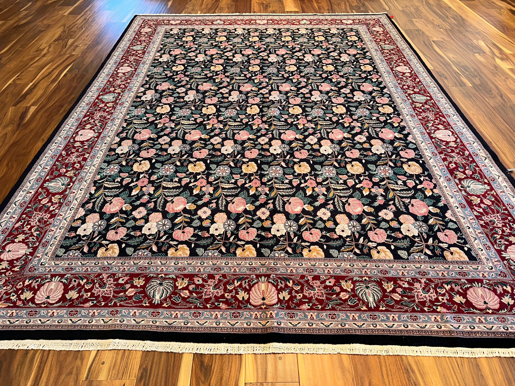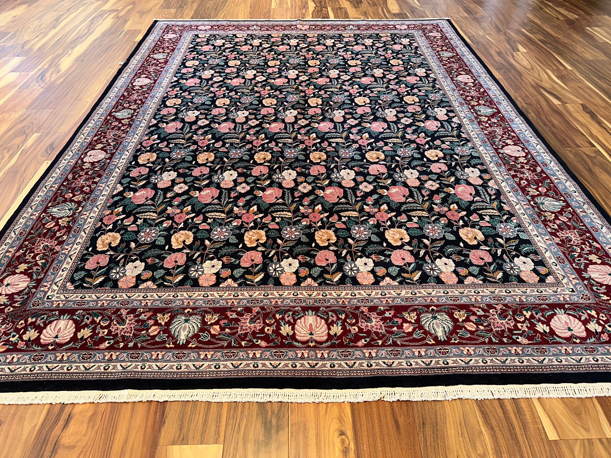 Charming and lively, this handwoven rug features a blooming field of pastel flowers nestled against a deep navy background. With its cheerful florals in rose, coral, mint, and soft gold, this piece offers a garden-like atmosphere, beautifully framed by a ruby red border that adds warmth and elegance. It’s a delightful infusion of color and whimsy, ideal for brightening up classic or eclectic interiors.