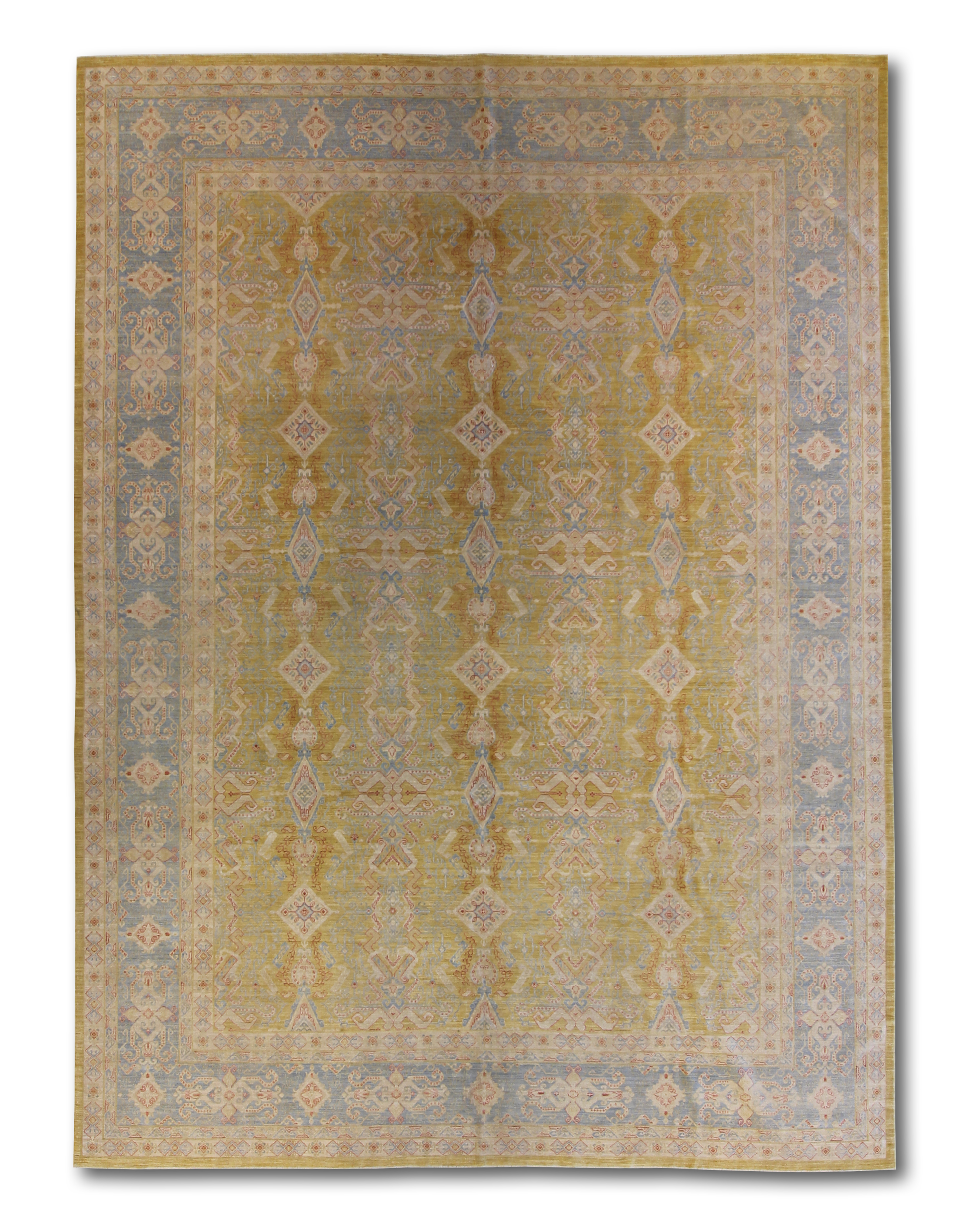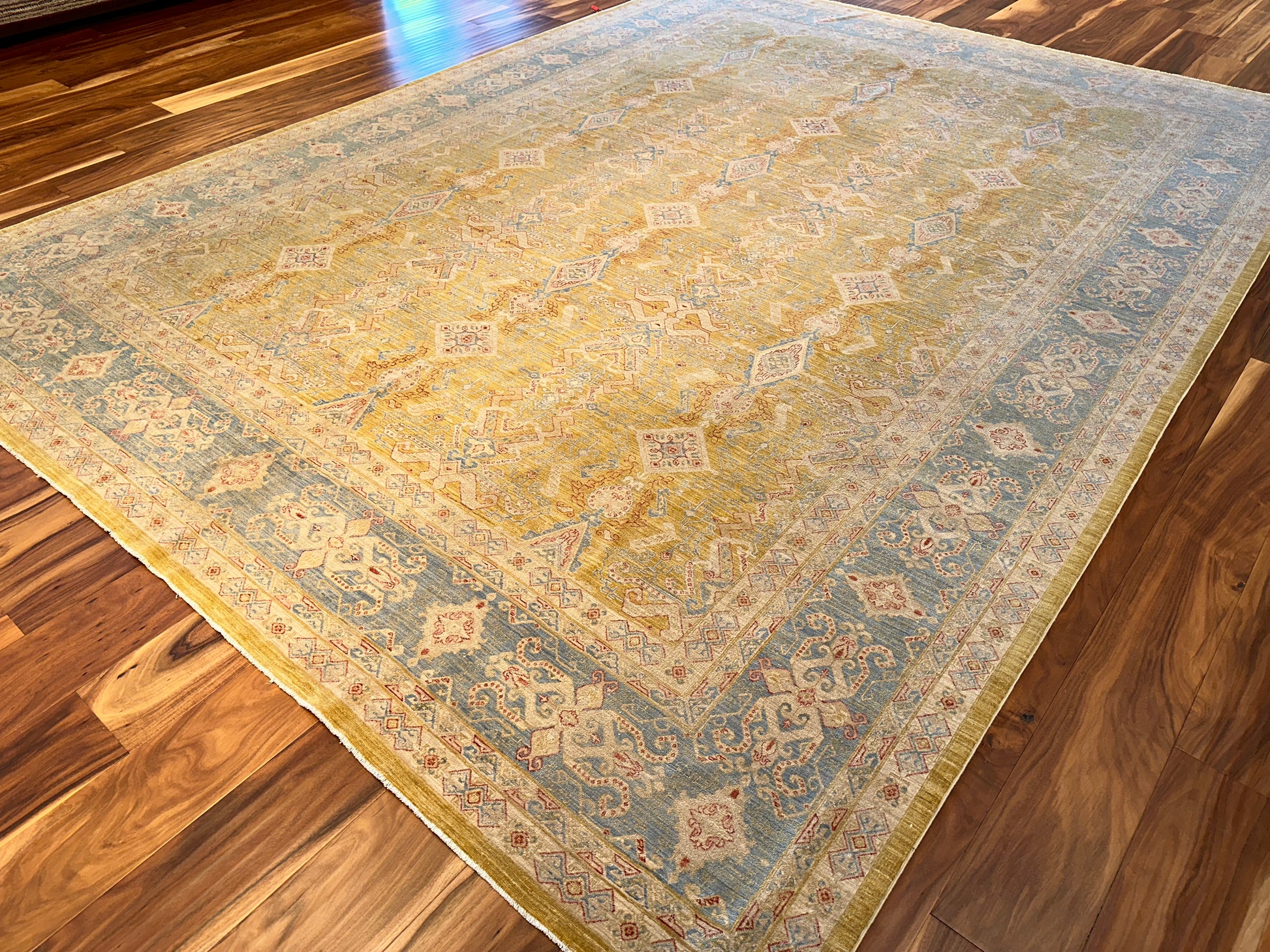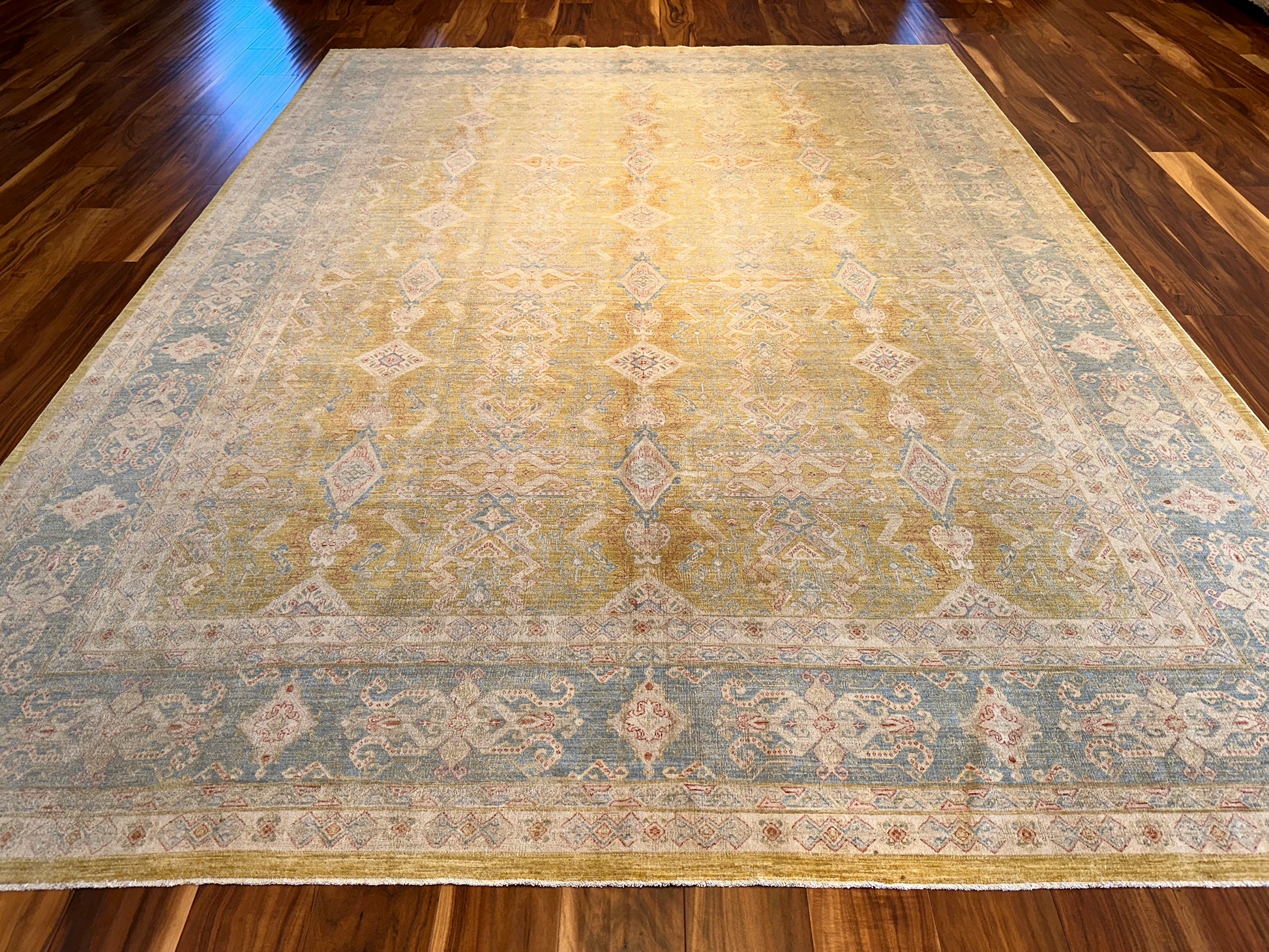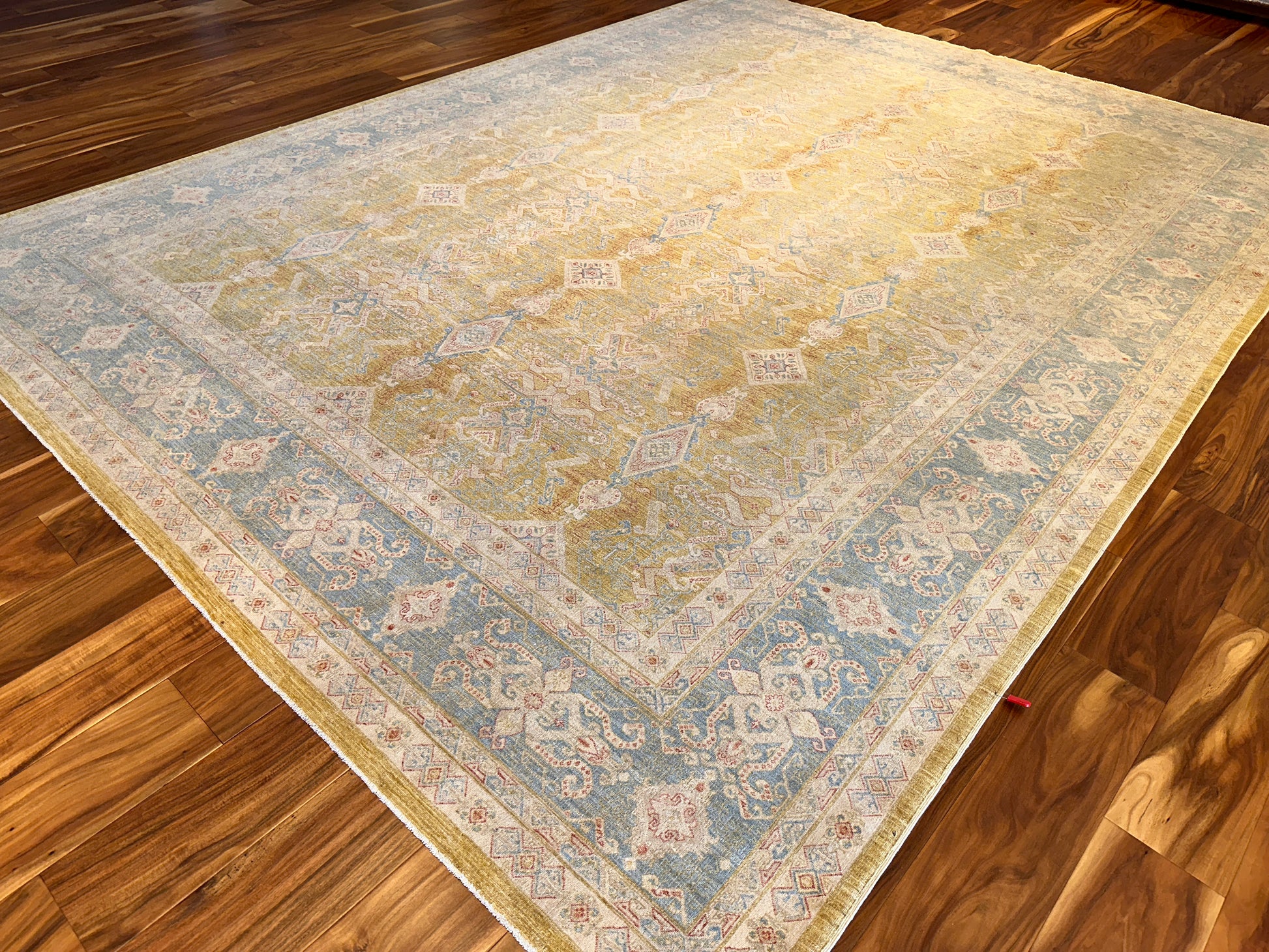 Bathed in a warm golden hue, this handwoven rug radiates a sunlit softness that brings elegance and warmth to any space. Its central field, filled with stylized floral and geometric motifs, gently fades into a soft blue border adorned with intricate vinework. The aged finish enhances its timeless appeal, evoking the gentle patina of an antique treasure.