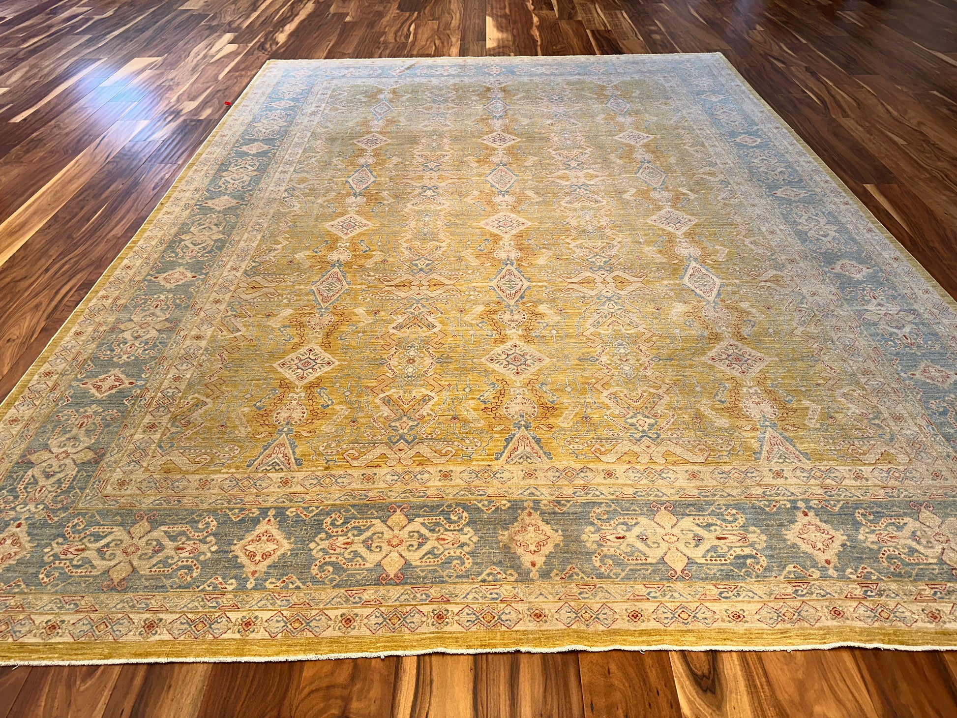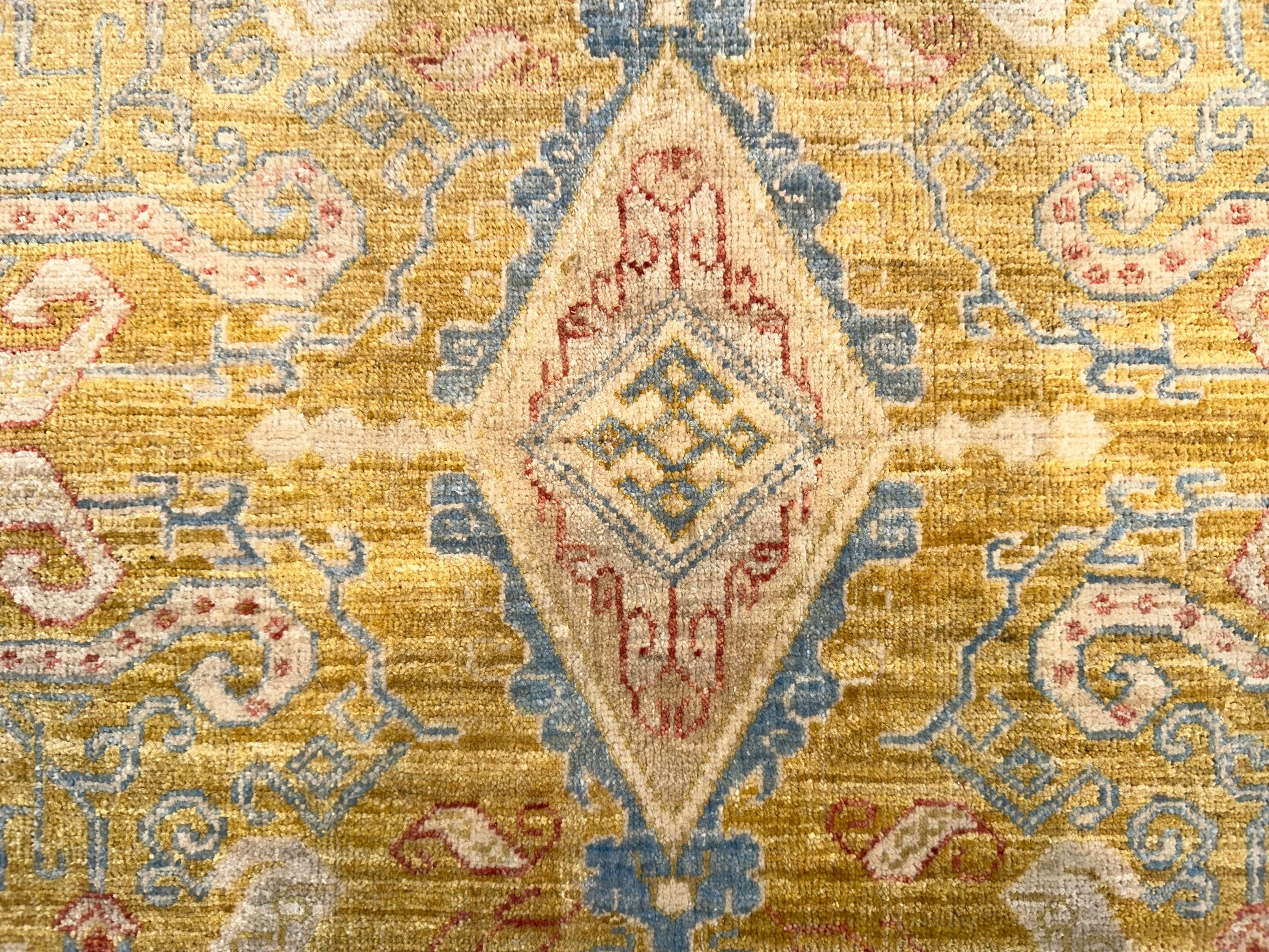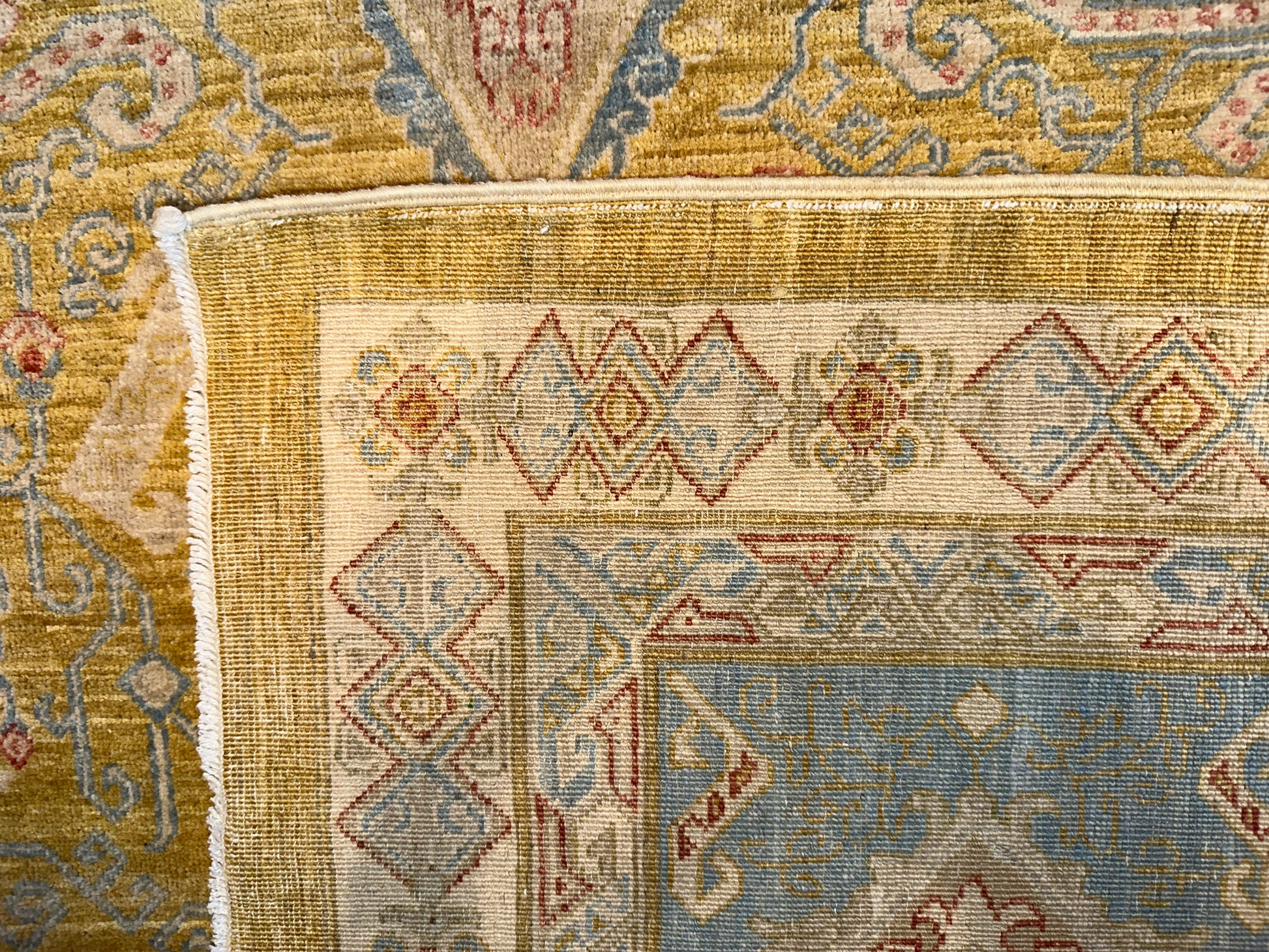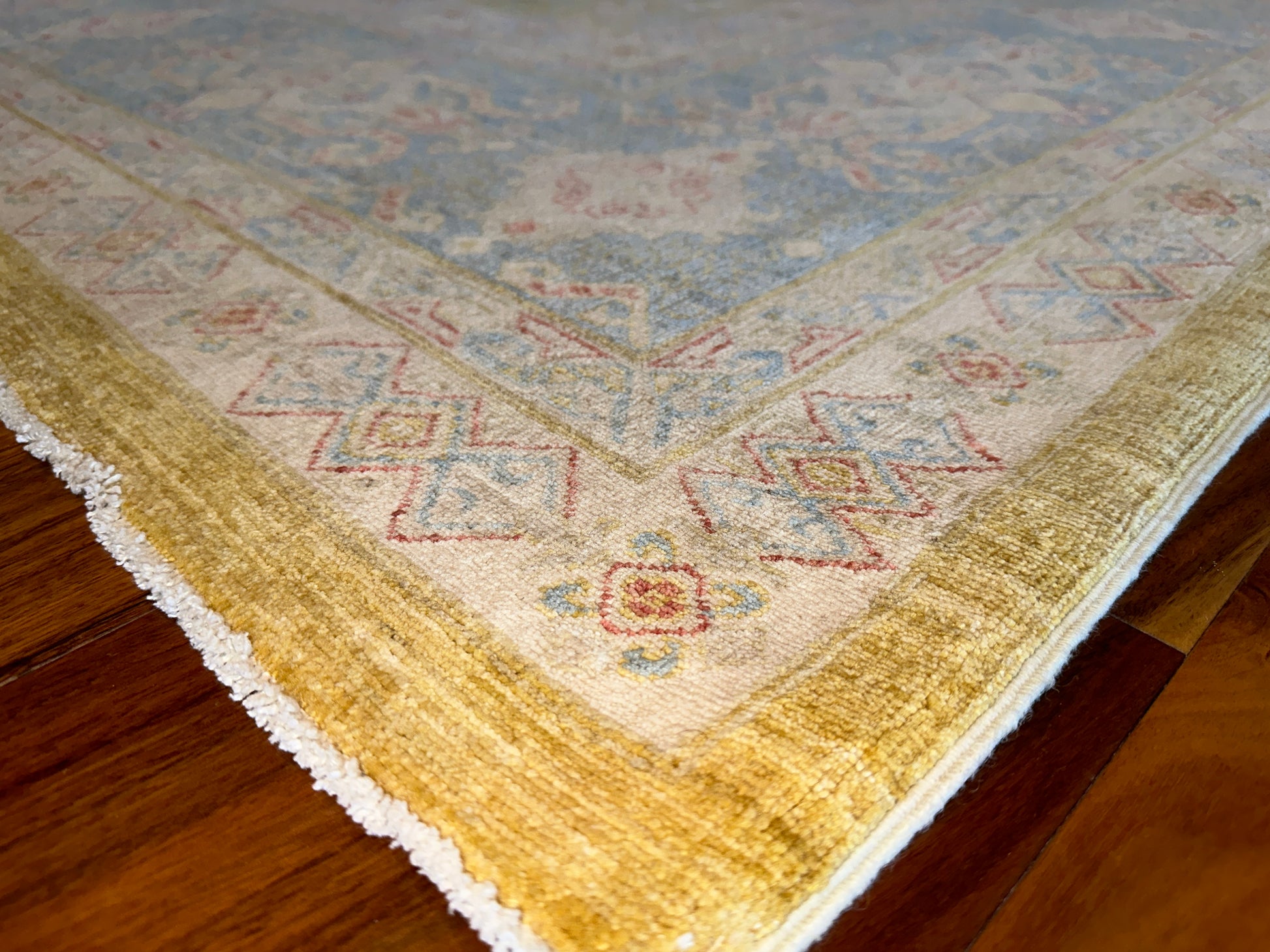 Bathed in a warm golden hue, this handwoven rug radiates a sunlit softness that brings elegance and warmth to any space. Its central field, filled with stylized floral and geometric motifs, gently fades into a soft blue border adorned with intricate vinework. The aged finish enhances its timeless appeal, evoking the gentle patina of an antique treasure.