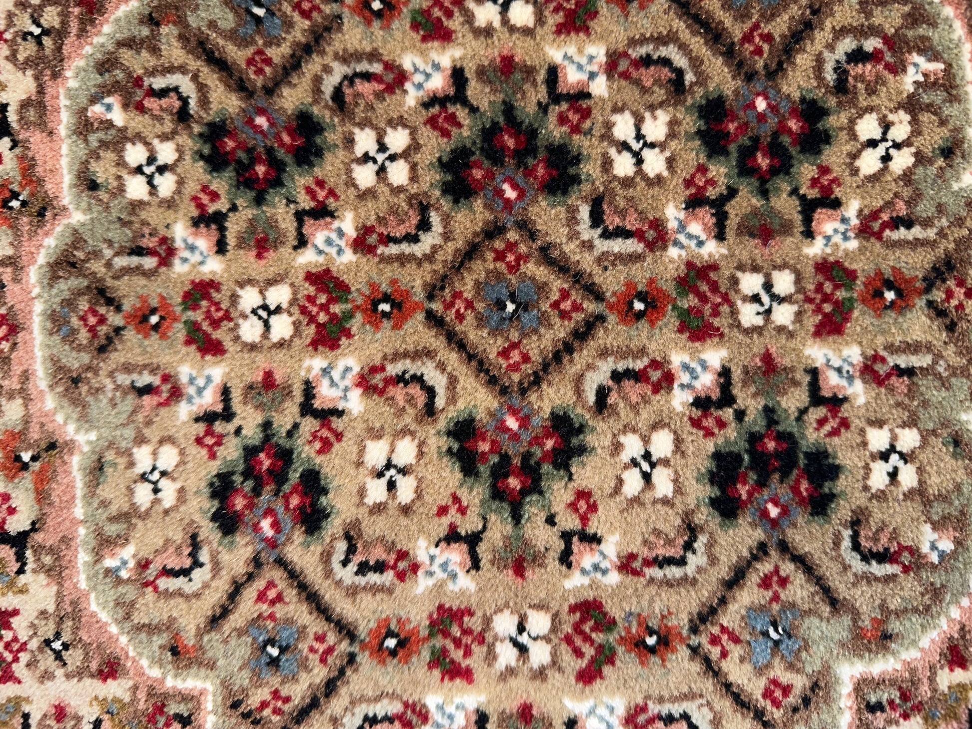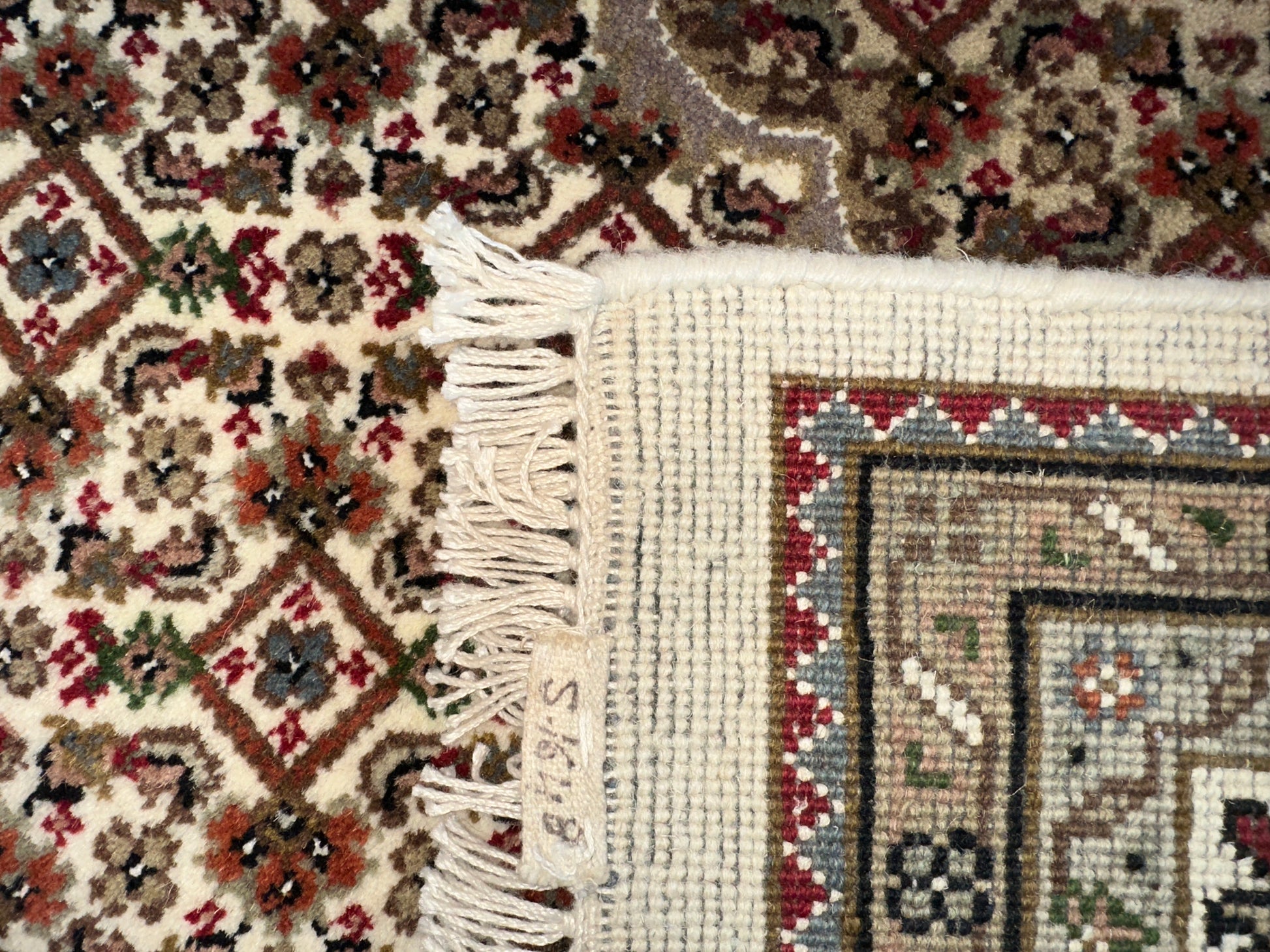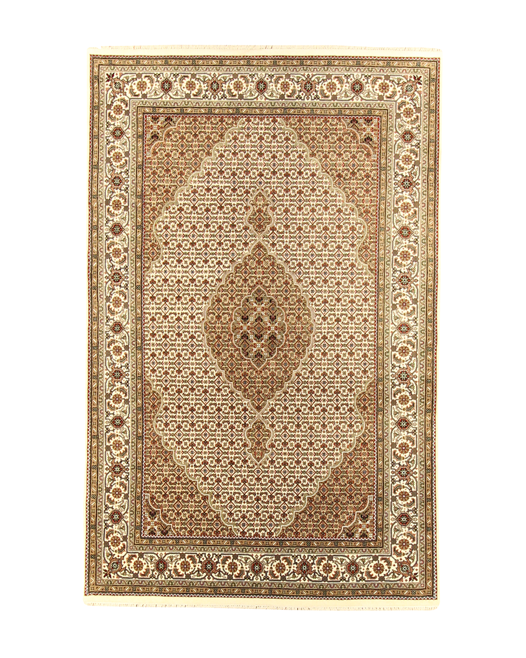 Gracefully detailed, this handmade rug features an allover Shah Abbas-style lattice design arranged within a grand scalloped medallion layout. The delicate floral elements and subtle symmetry create a sense of balance and poise, while the refined palette of beige, brown, and soft burgundy brings understated richness to the composition.