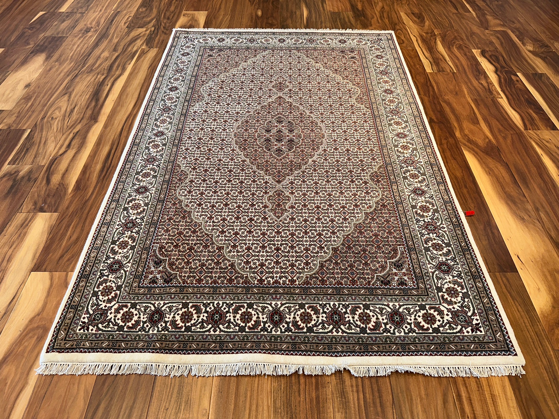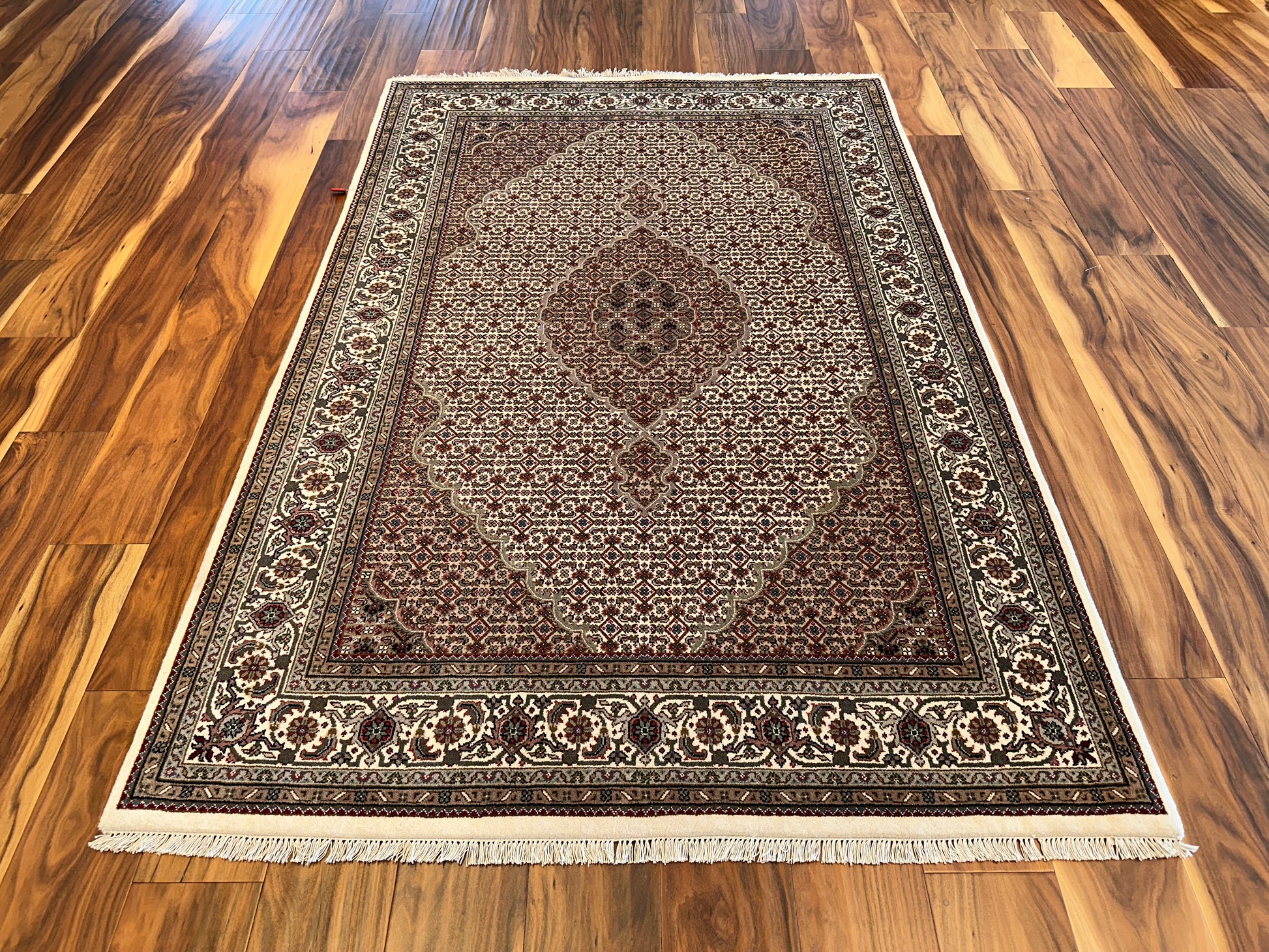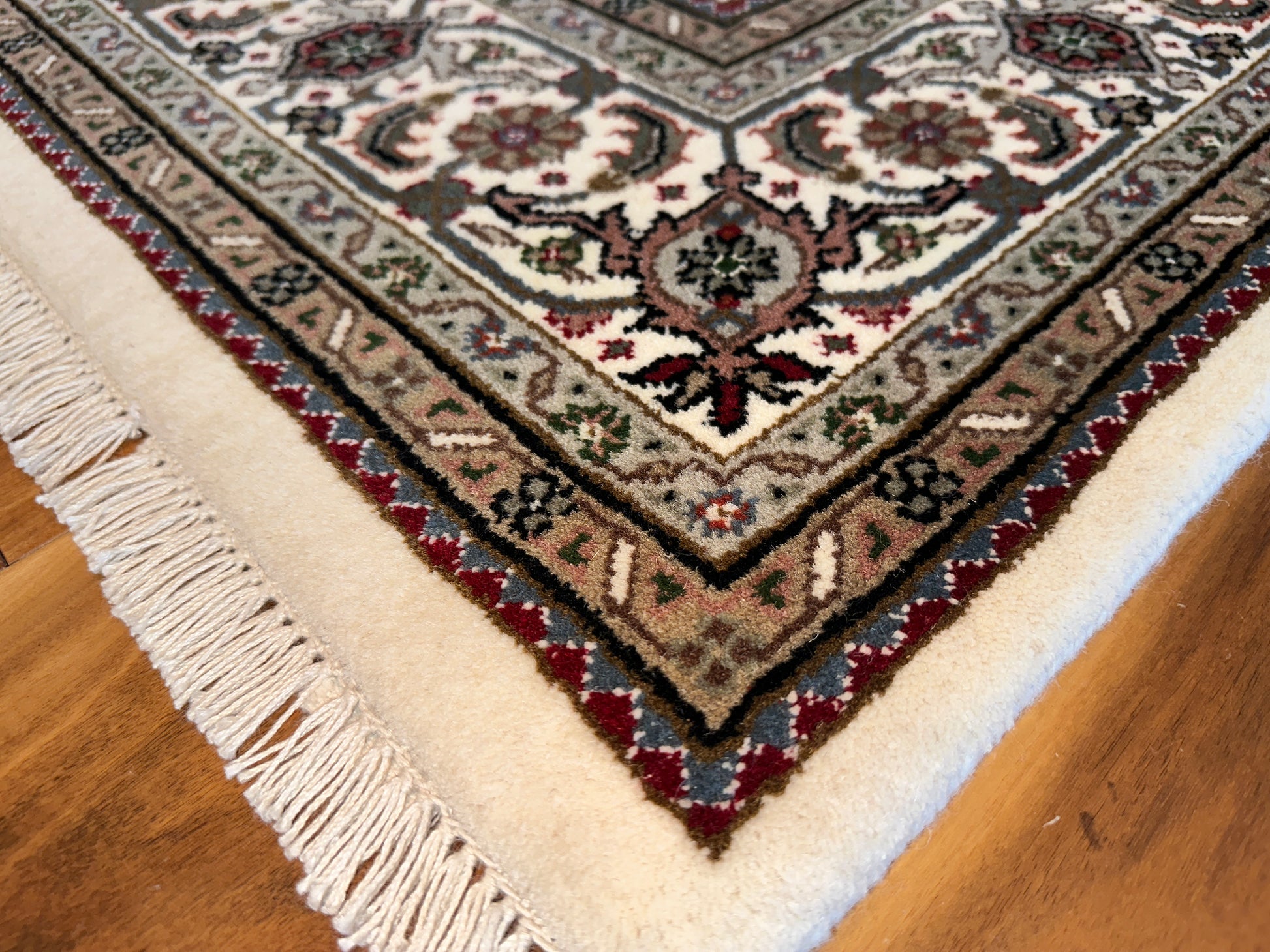 Gracefully detailed, this handmade rug features an allover Shah Abbas-style lattice design arranged within a grand scalloped medallion layout. The delicate floral elements and subtle symmetry create a sense of balance and poise, while the refined palette of beige, brown, and soft burgundy brings understated richness to the composition.