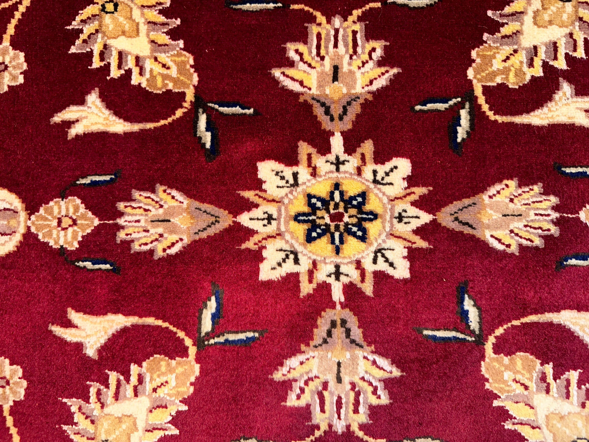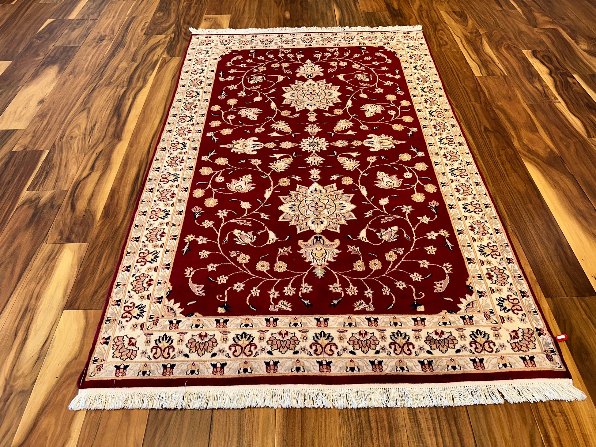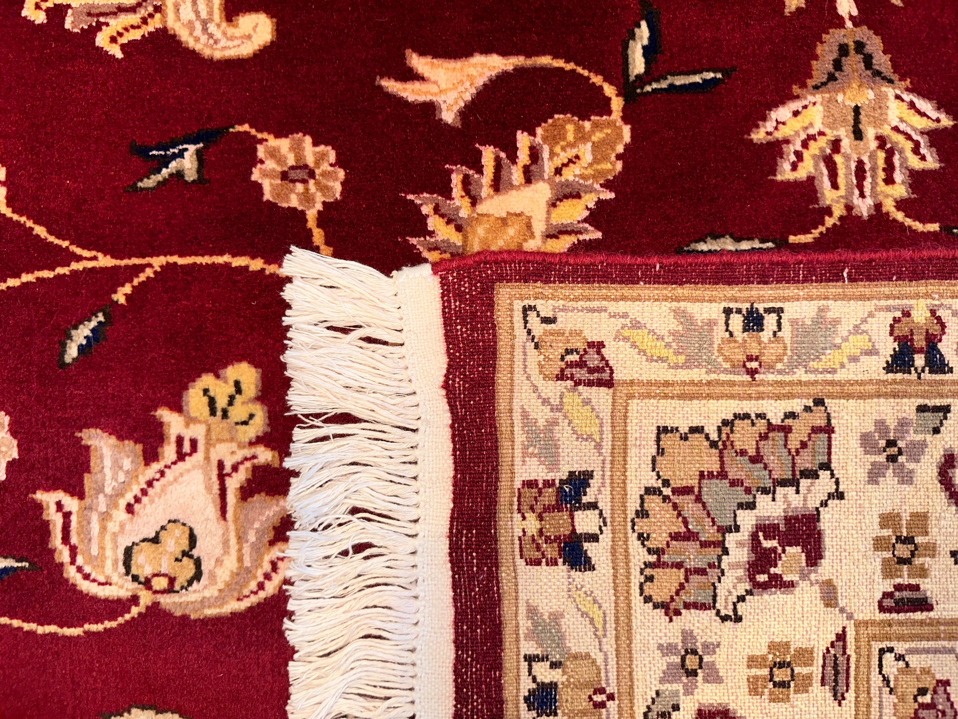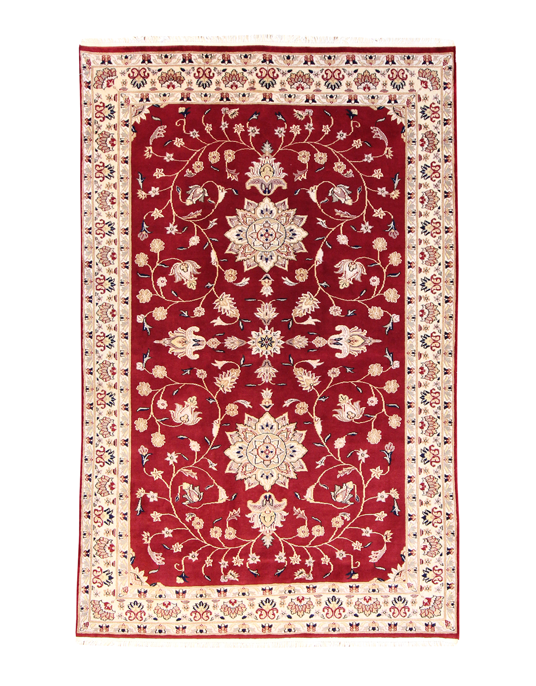A classic red ground anchors this traditionally styled rug, adorned with a finely balanced floral medallion and scrolling vinework in soft cream and pale blue. The symmetrical design radiates from the center outward, framed by a wide border of stylized blossoms that echo the tones of the field with elegant clarity.