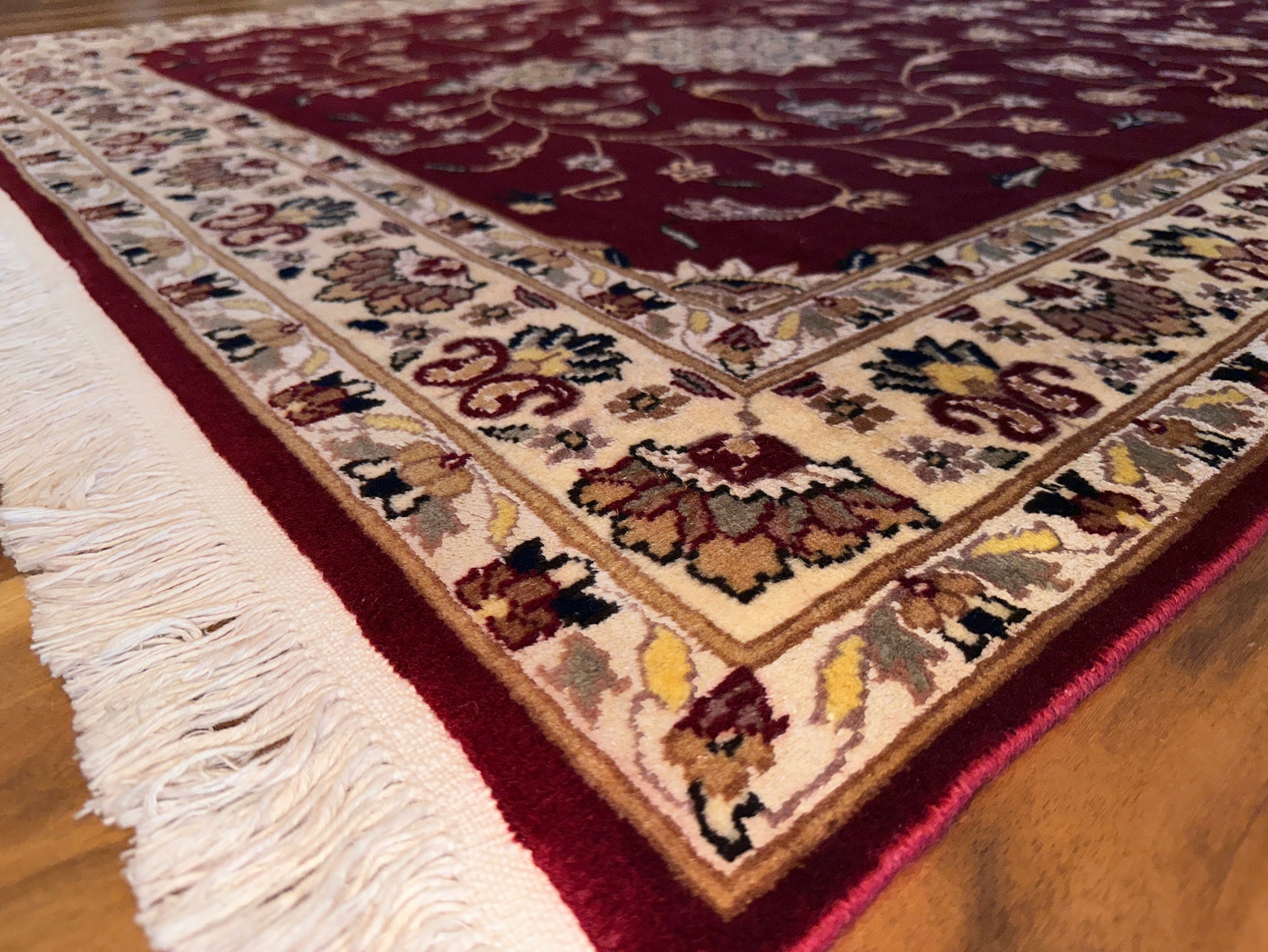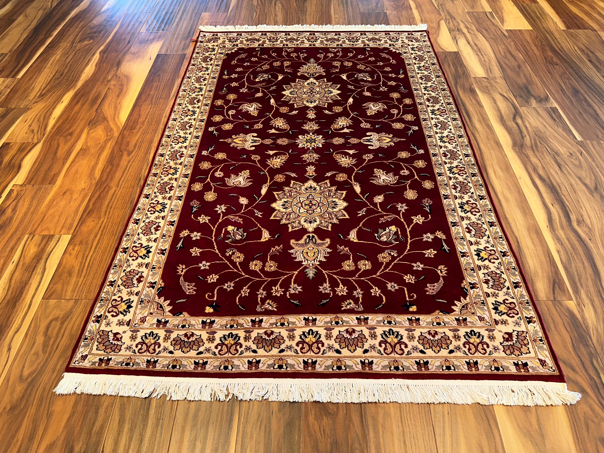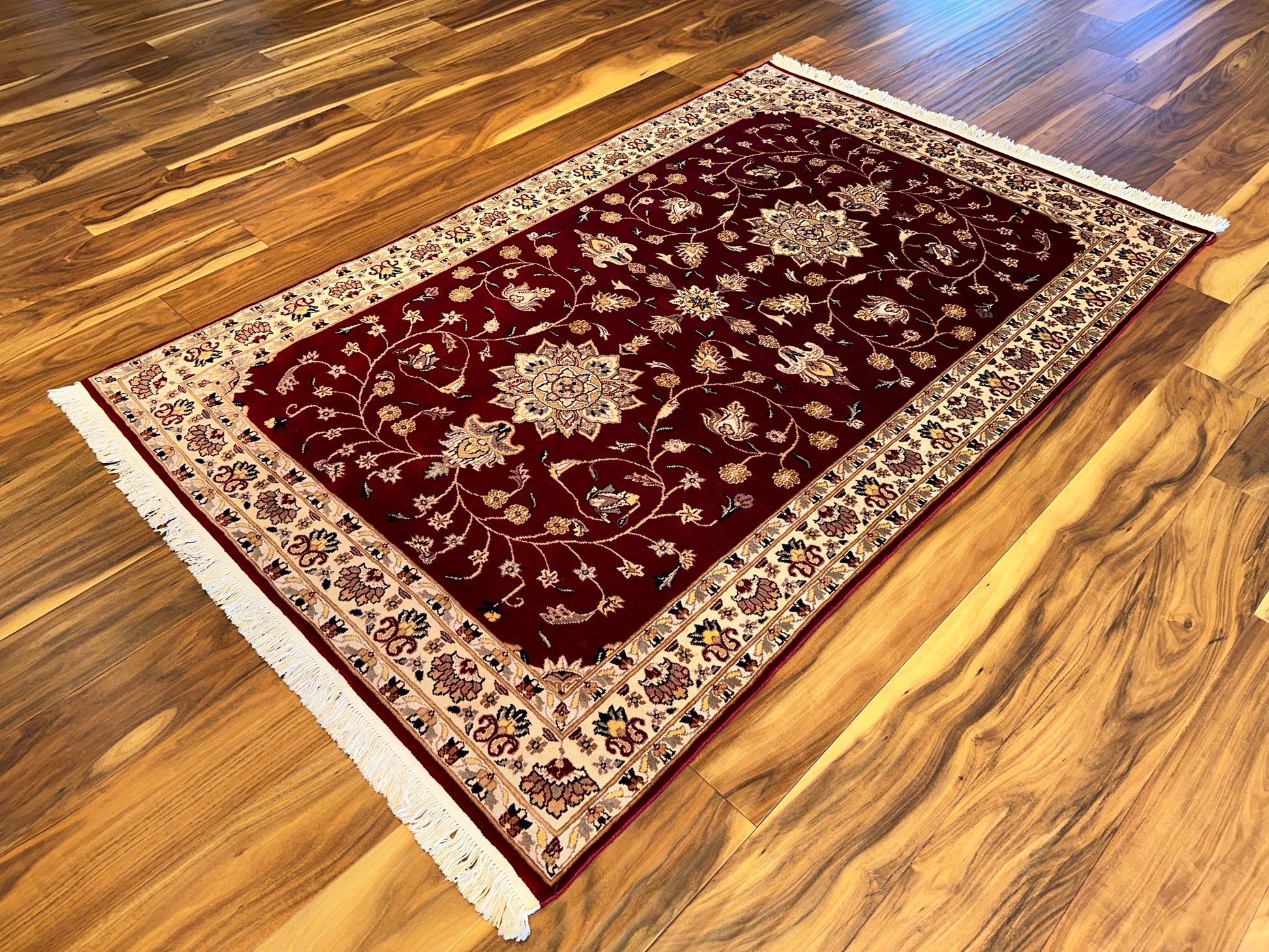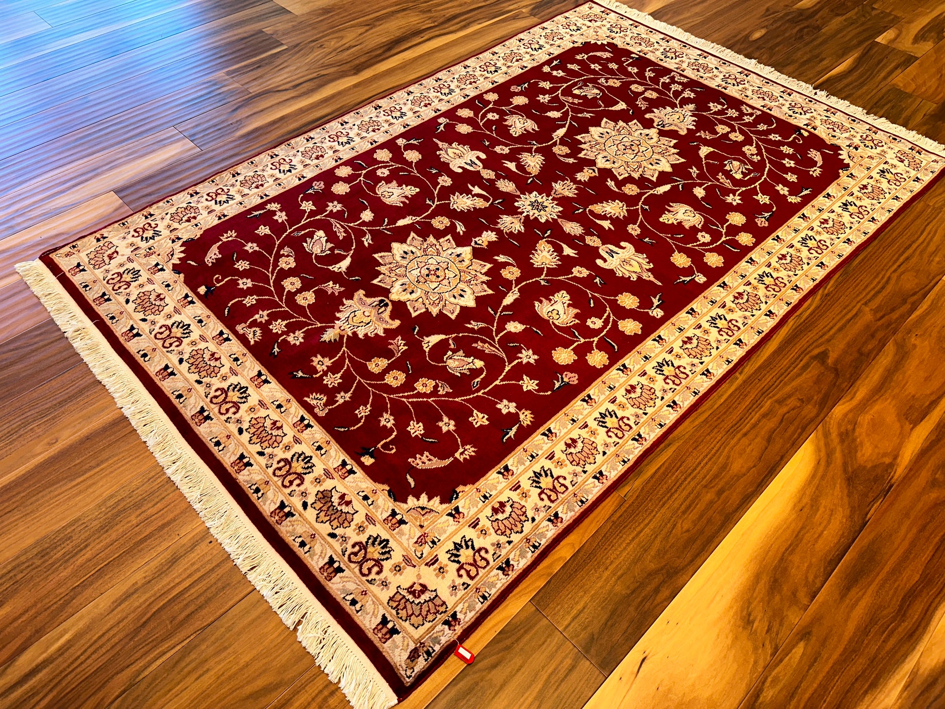 A classic red ground anchors this traditionally styled rug, adorned with a finely balanced floral medallion and scrolling vinework in soft cream and pale blue. The symmetrical design radiates from the center outward, framed by a wide border of stylized blossoms that echo the tones of the field with elegant clarity.