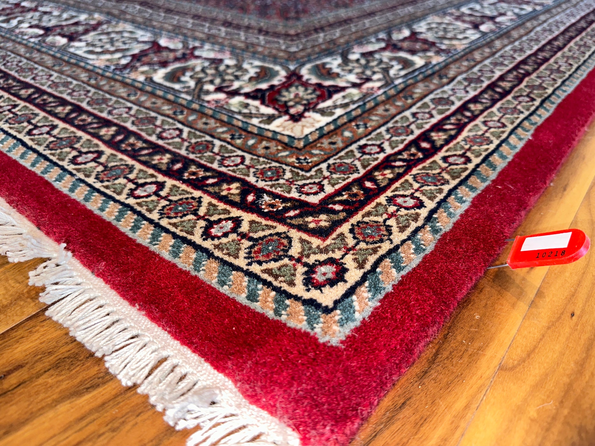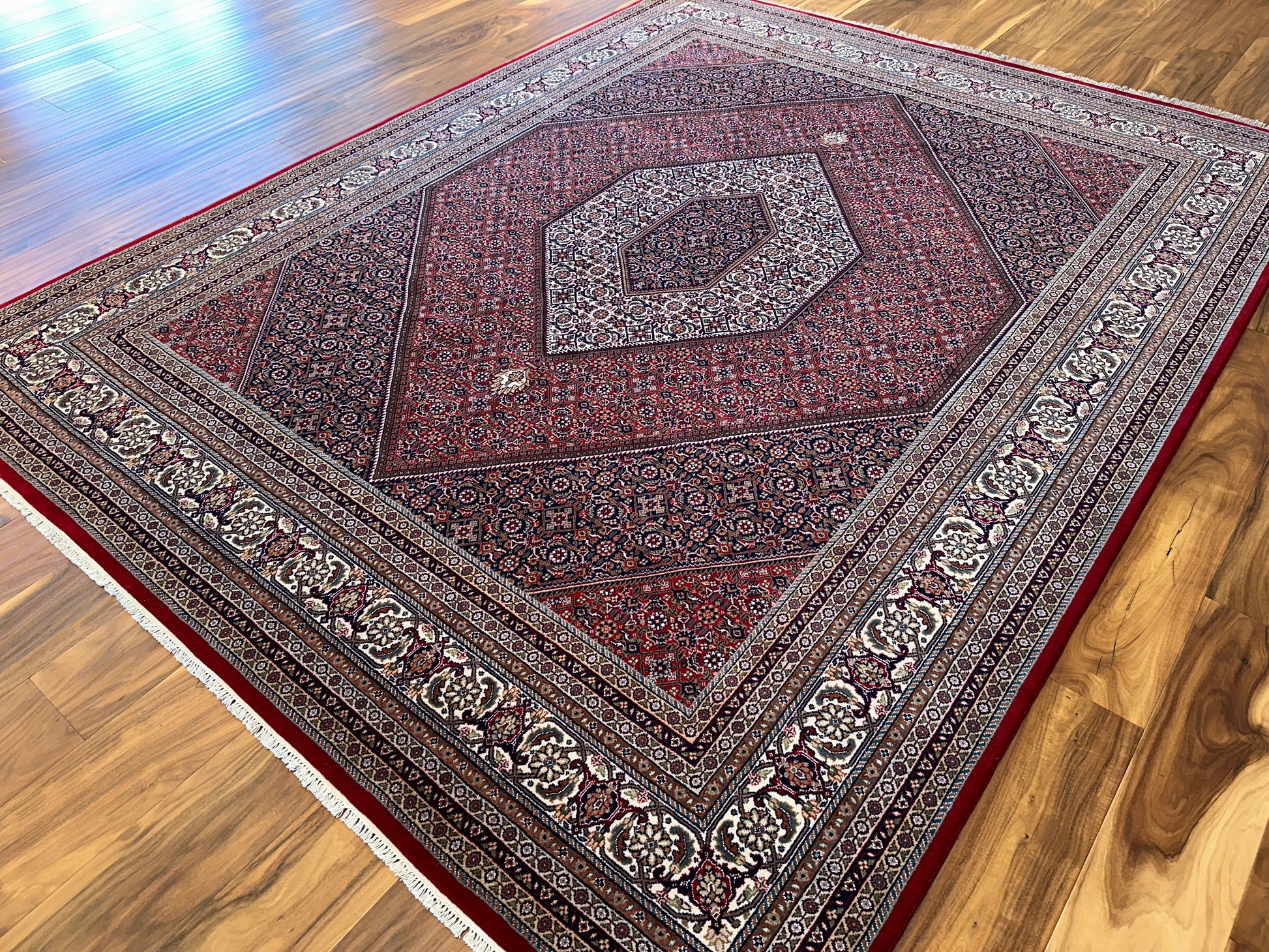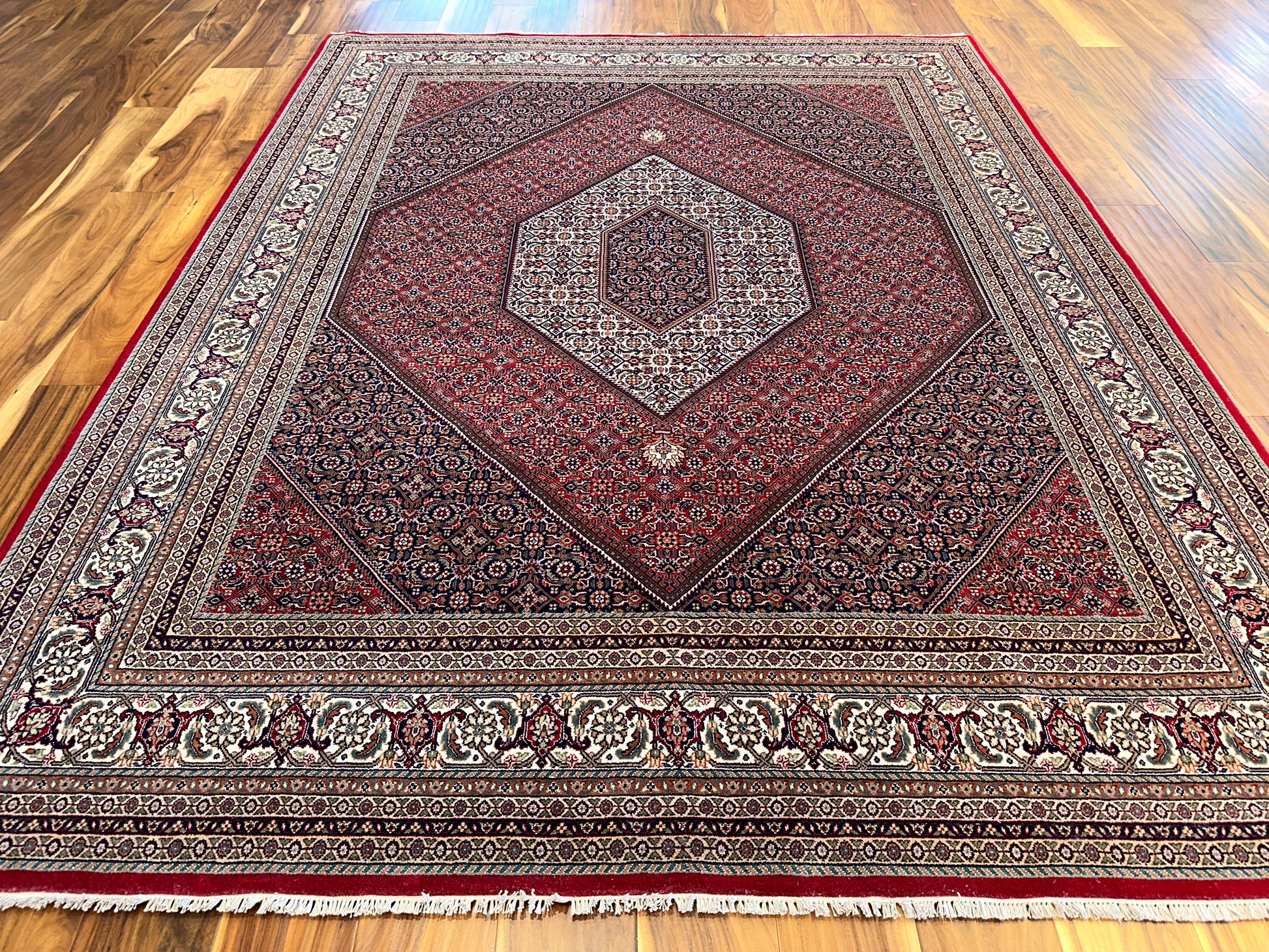 Intricately detailed and classically composed, this hand-knotted rug features a large-scale hexagonal medallion nested within a field of densely packed floral motifs. Deep burgundy, navy, and ivory tones create a striking contrast, while the layered borders—rich with rosettes and fine geometric patterns—reinforce the rug’s refined structure and formal elegance.