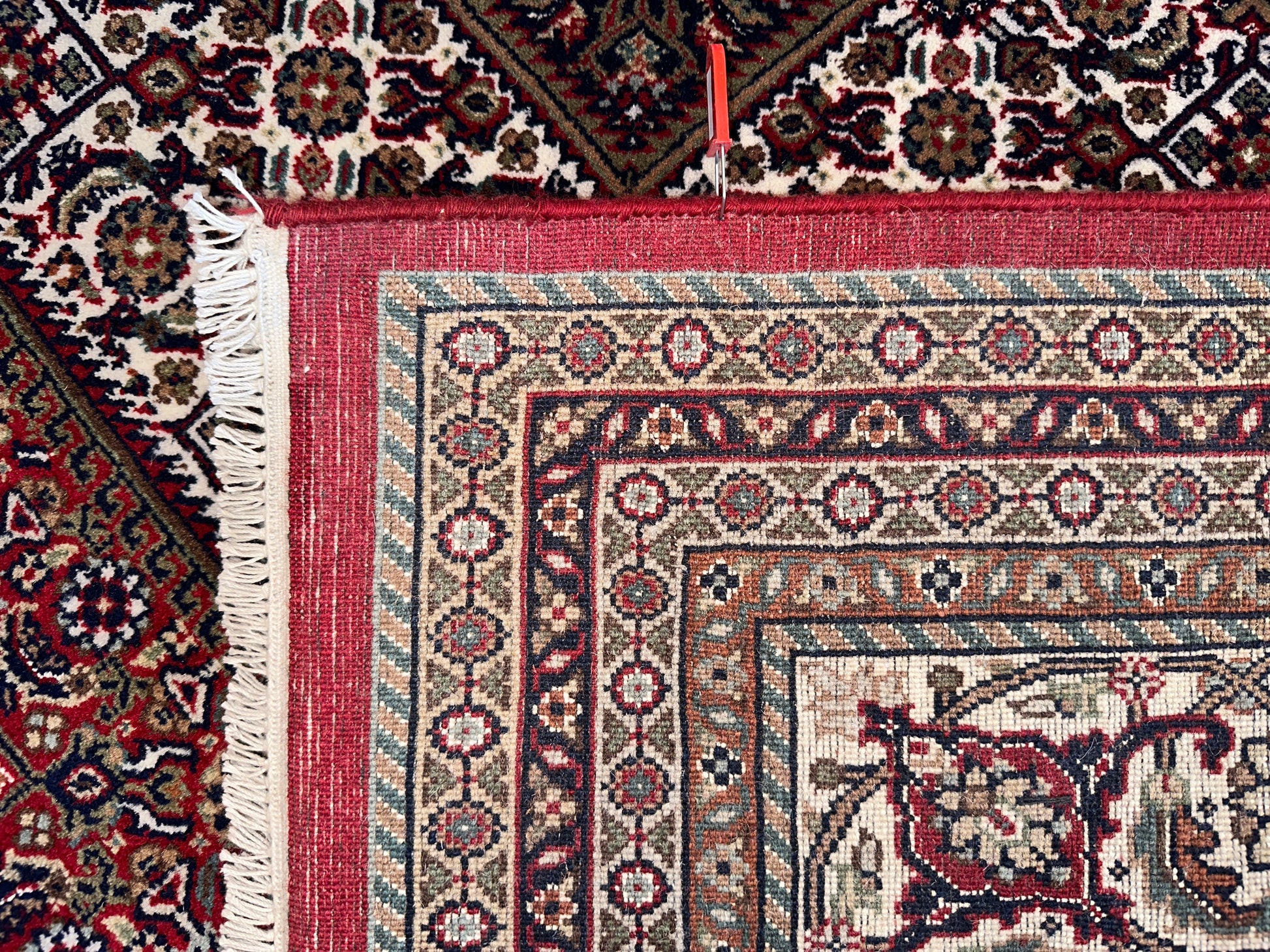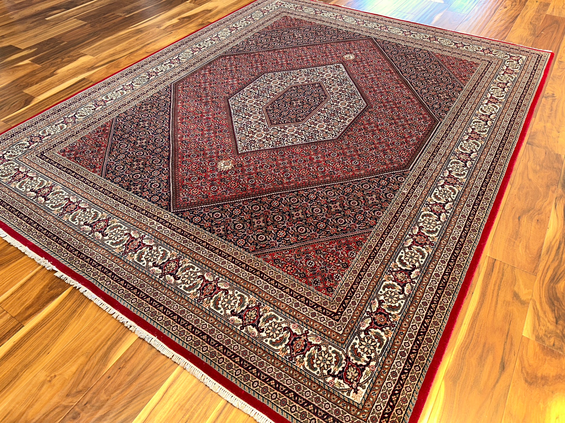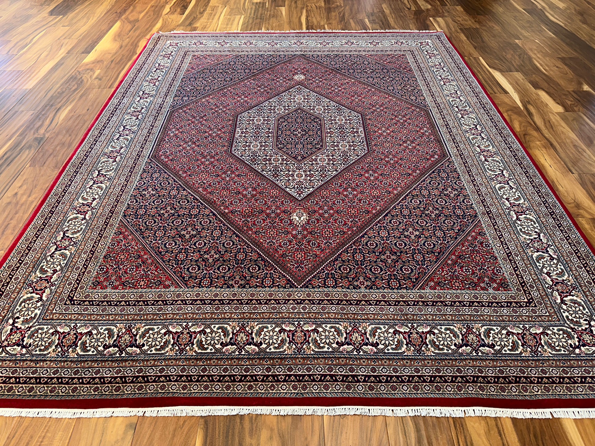 Intricately detailed and classically composed, this hand-knotted rug features a large-scale hexagonal medallion nested within a field of densely packed floral motifs. Deep burgundy, navy, and ivory tones create a striking contrast, while the layered borders—rich with rosettes and fine geometric patterns—reinforce the rug’s refined structure and formal elegance.