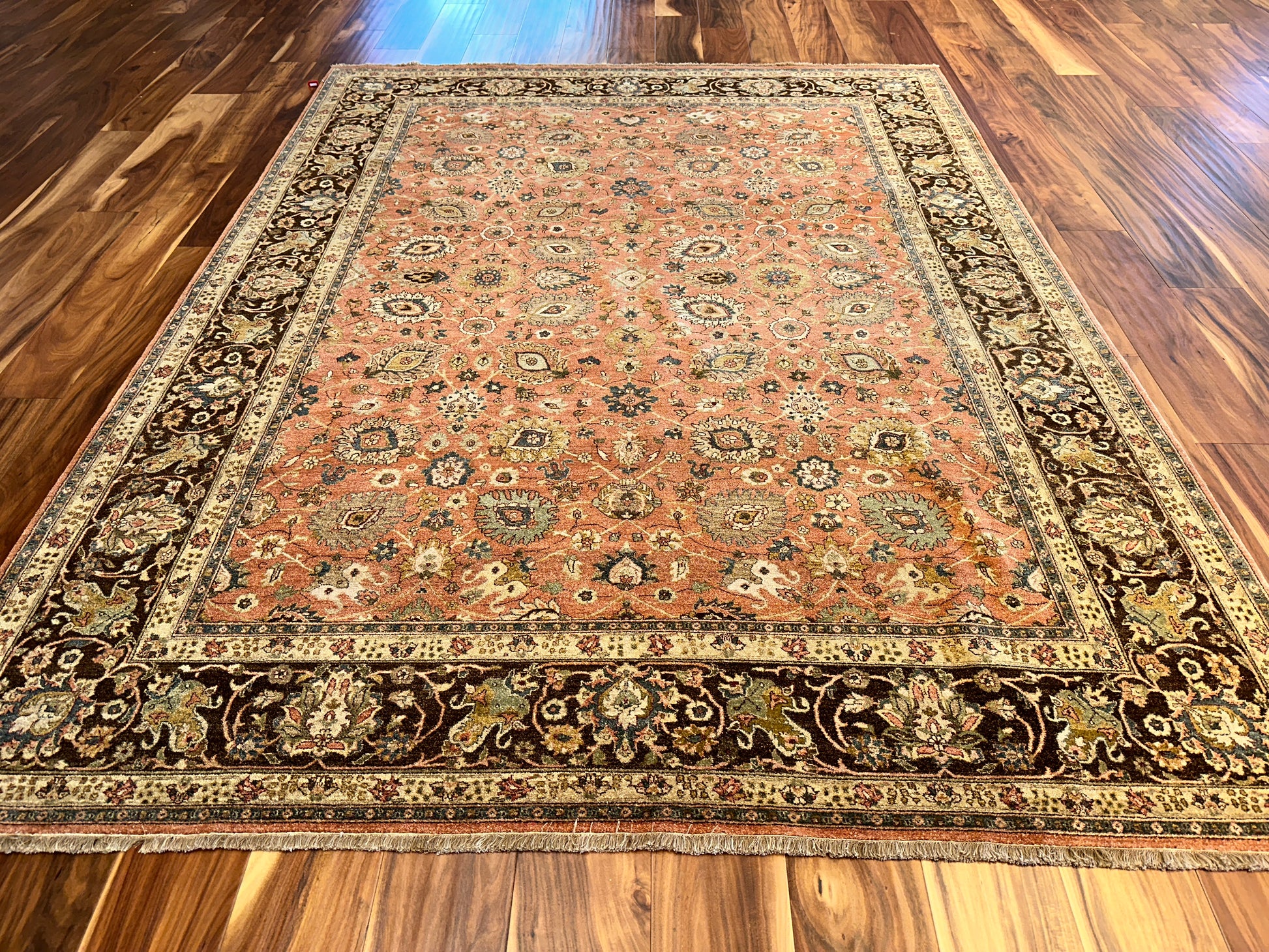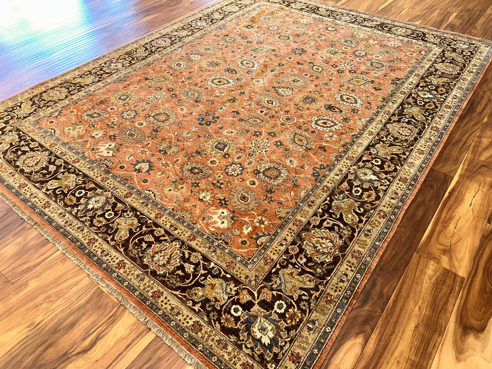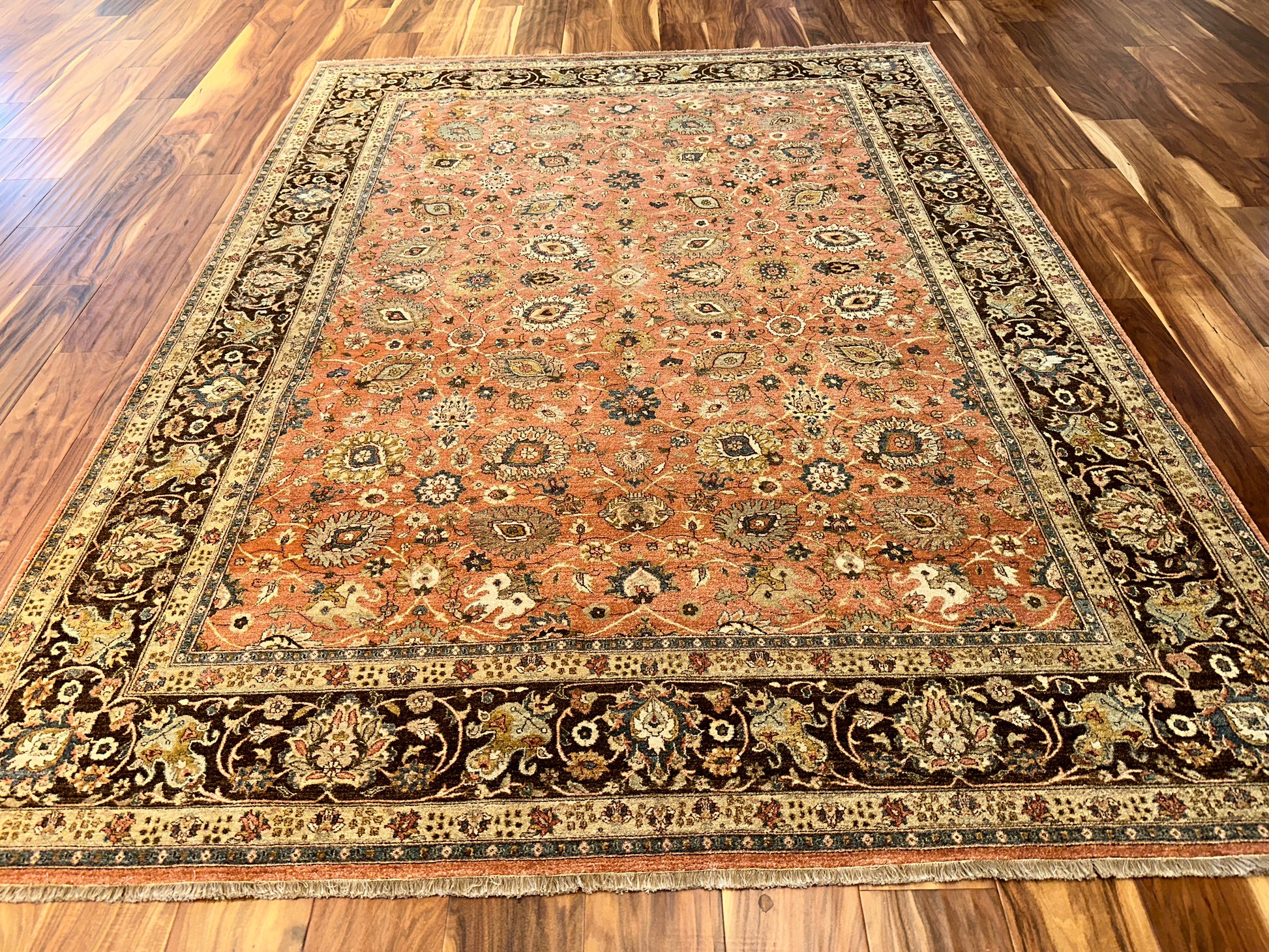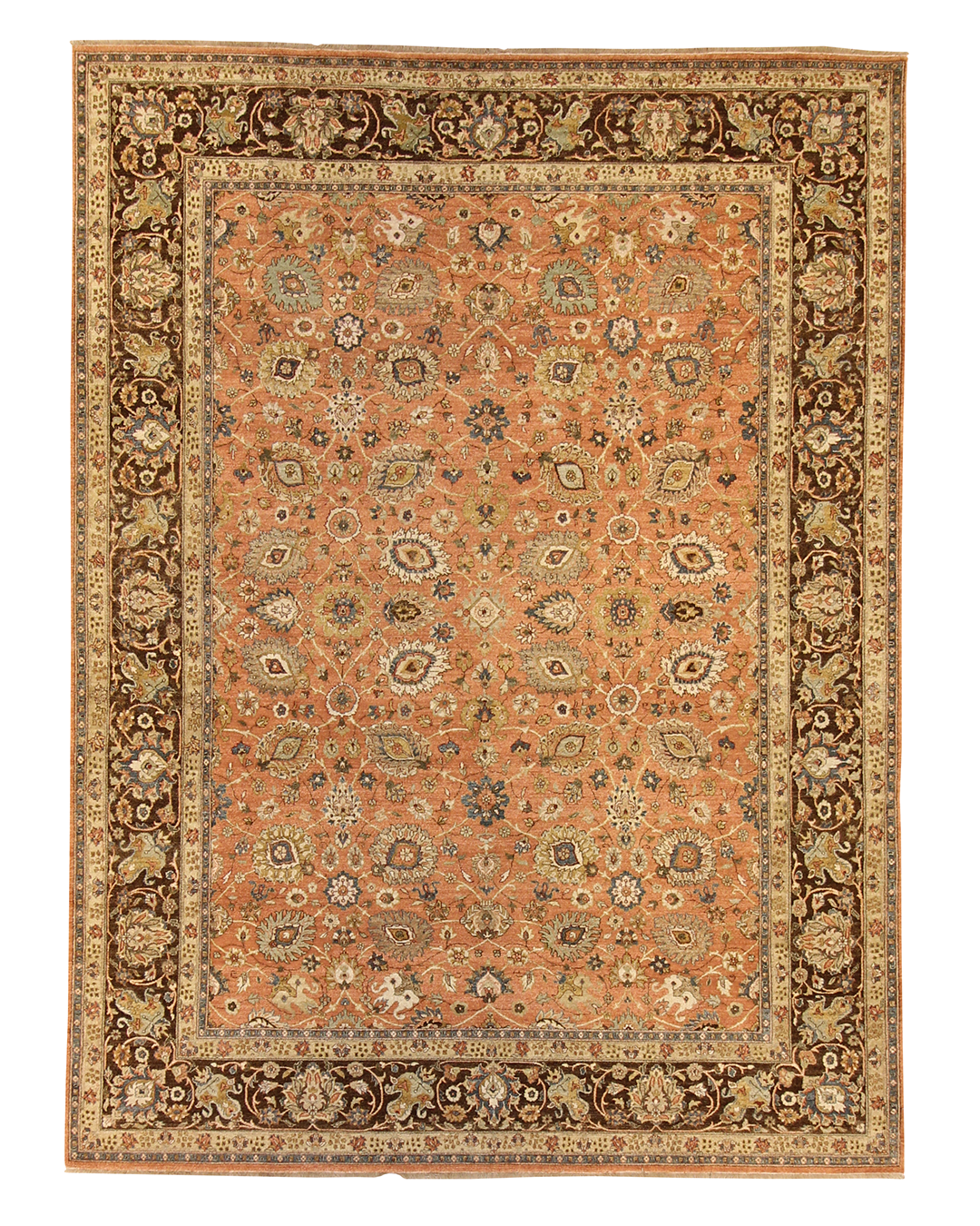 A warm terracotta field forms the heart of this exquisite hand-knotted rug, adorned with an elegant array of florals, boteh motifs, and palmettes in soft cream, olive, and steel blue. The rich chocolate brown border anchors the composition, adding depth and contrast to the rug’s glowing central tones. Classic yet inviting, this piece brings a cultivated warmth to any room it inhabits.