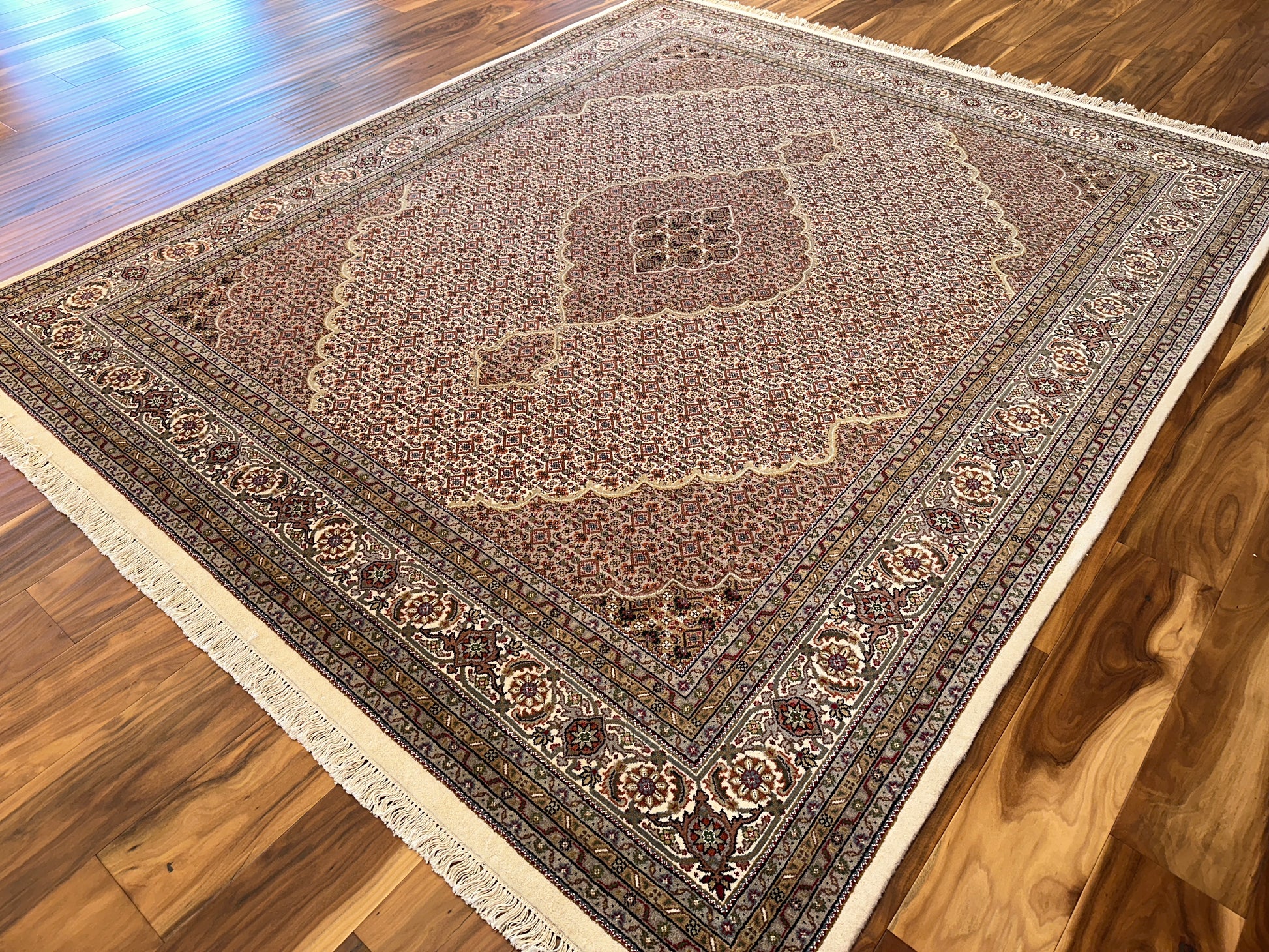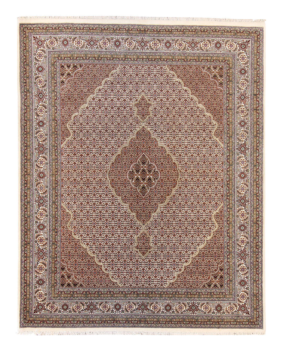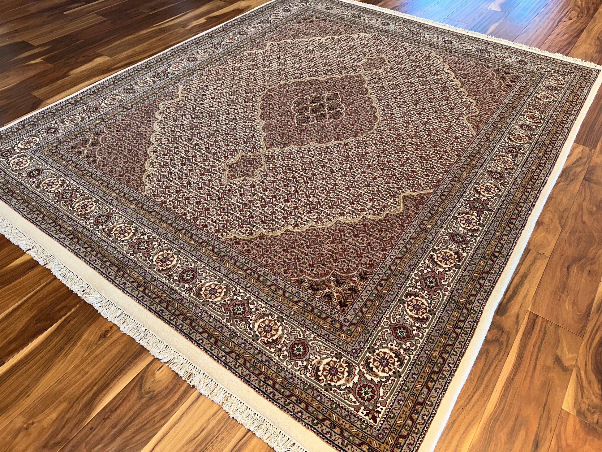 This masterfully detailed rug brings a sense of refinement and precision with its meticulously rendered medallion-and-field composition. The densely patterned design features a central scalloped diamond medallion surrounded by an intricate lattice of floral motifs, set against a warm red field and framed by a rich border of blossoms and vinework. A soft interplay of burgundy, beige, olive, and chocolate tones gives this rug a formal yet welcoming presence that would complement classic interiors.
