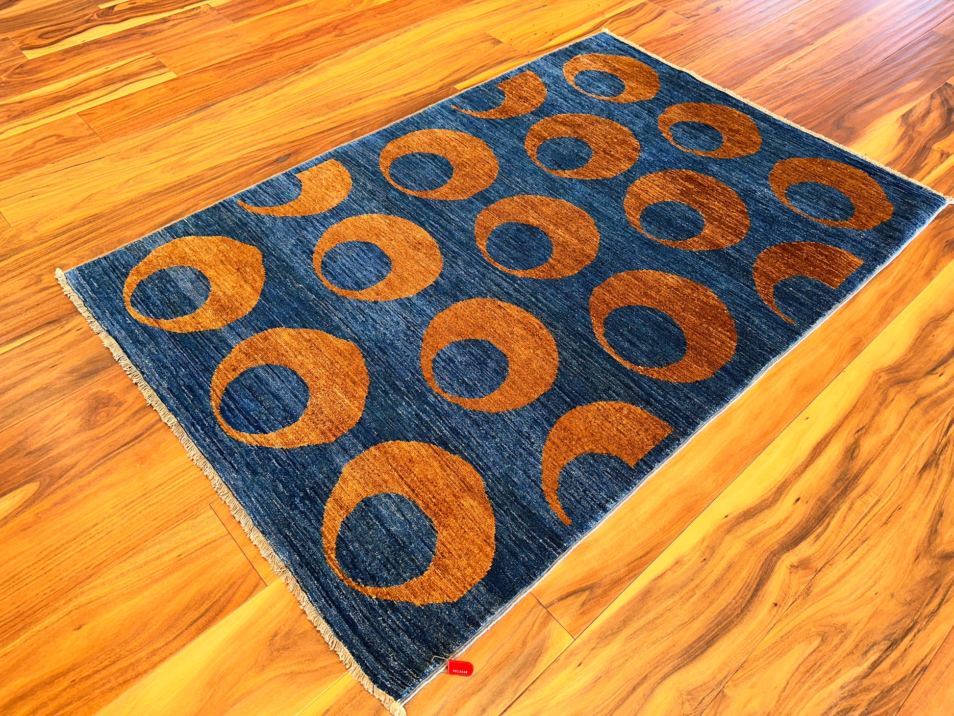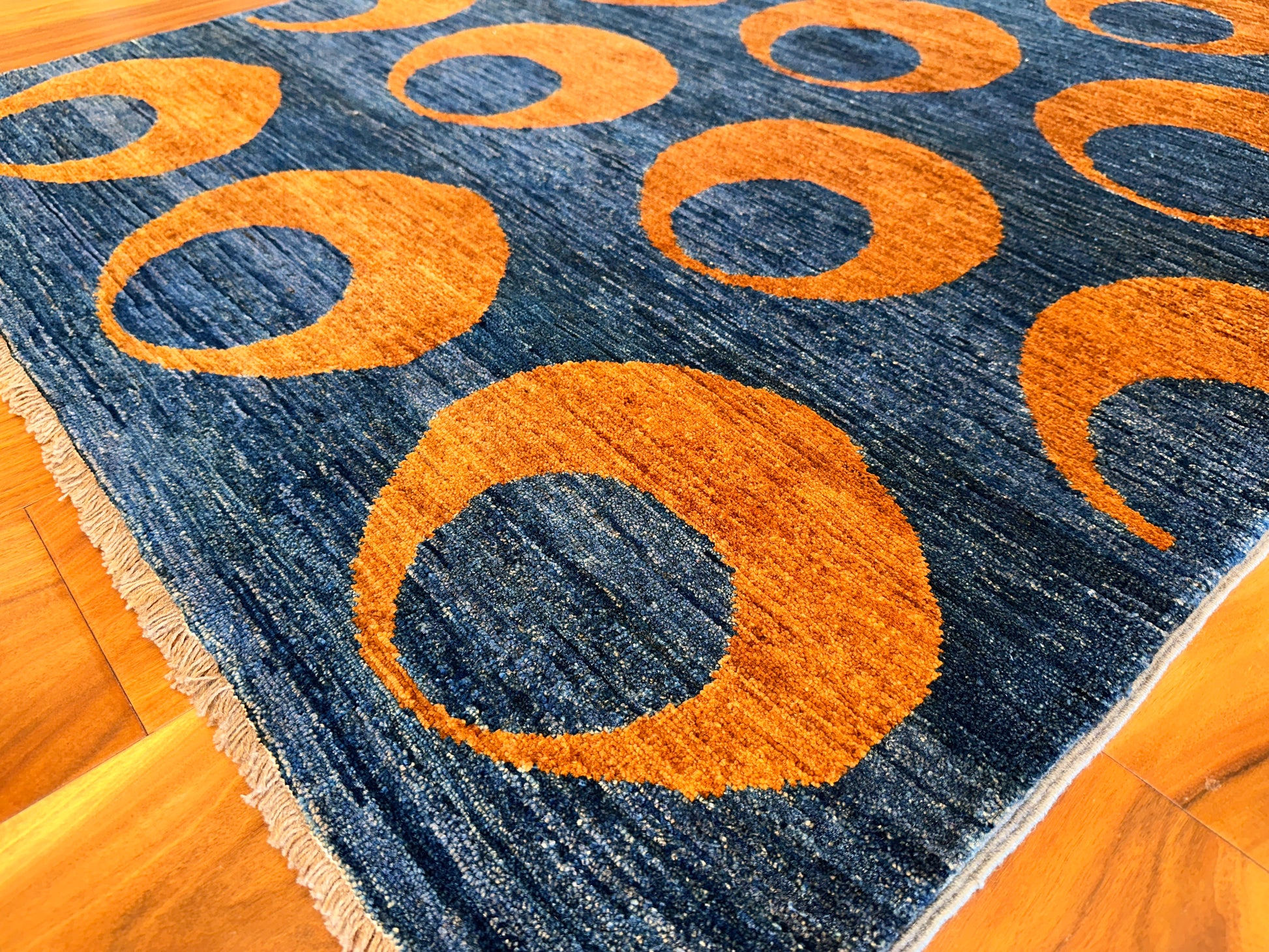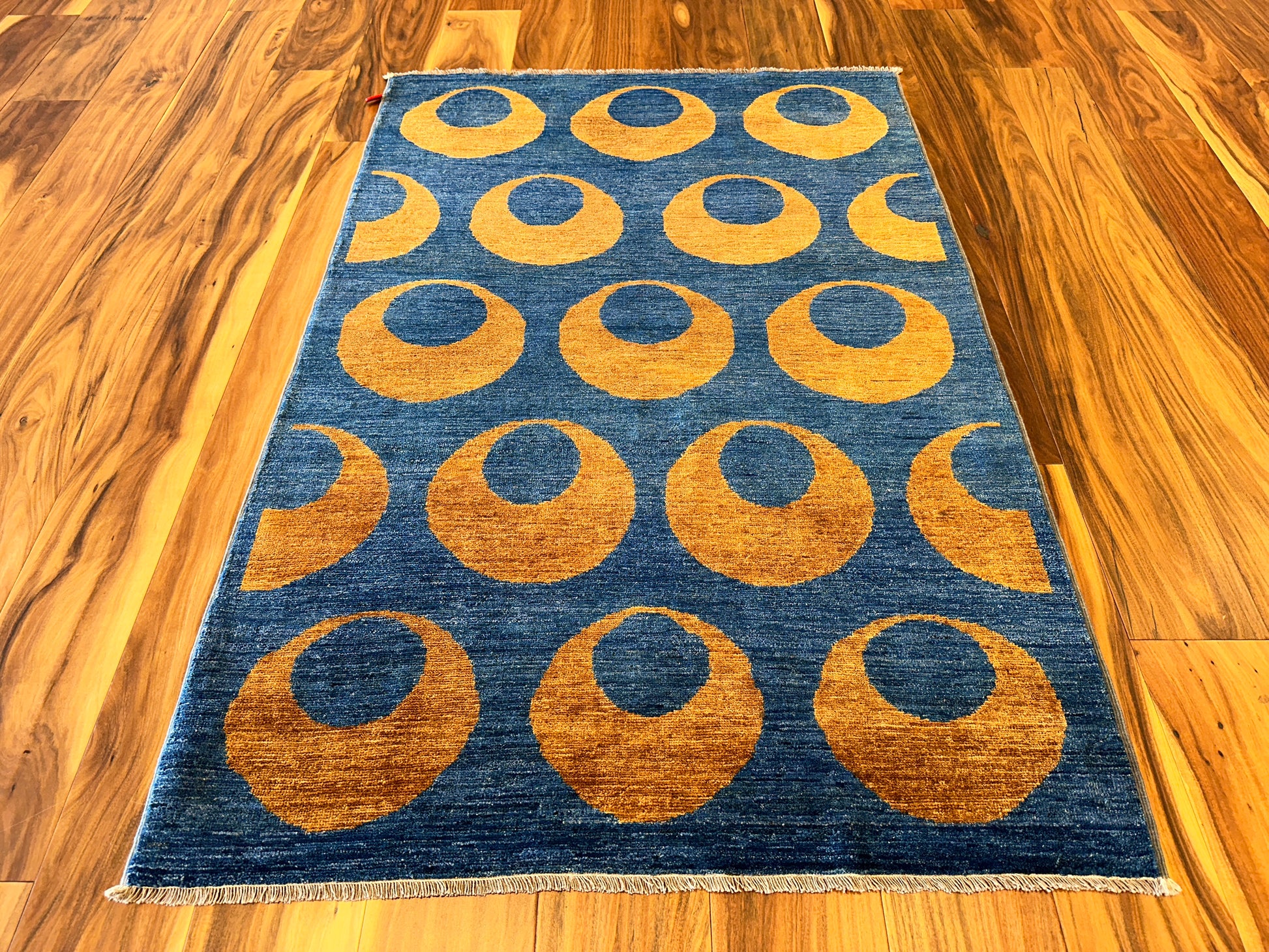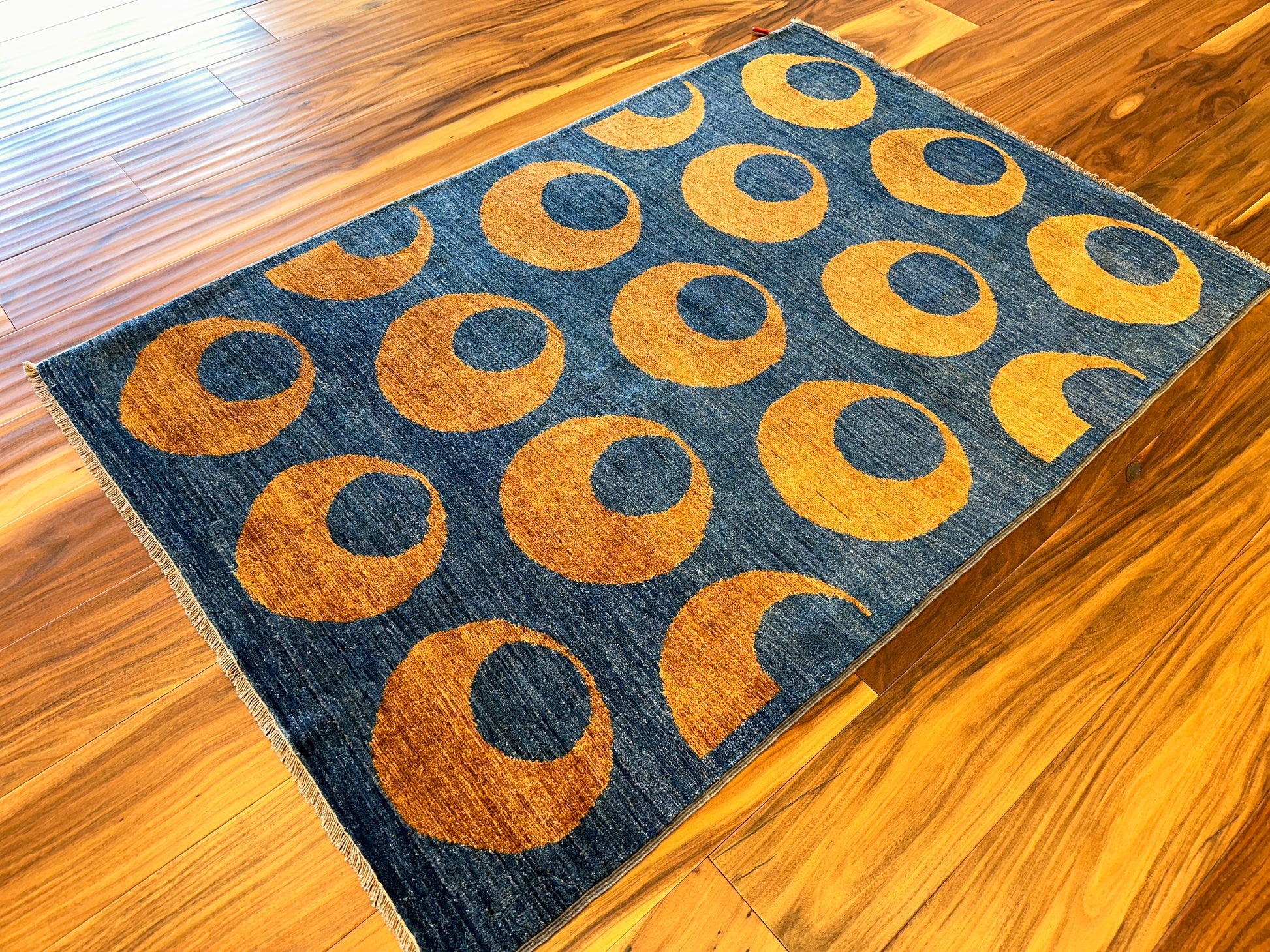 Bold and contemporary, this rug features a rhythmic array of golden ochre circles on a vivid denim blue field, blending abstract geometry with a playful, modern sensibility. The soft tonal contrast creates a lively yet grounded effect, making it a standout piece for spaces seeking both energy and balance.