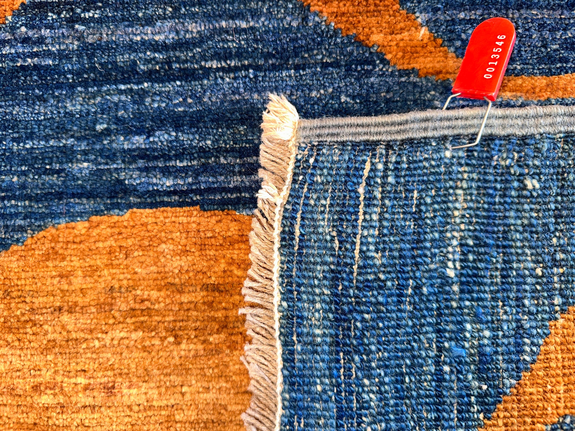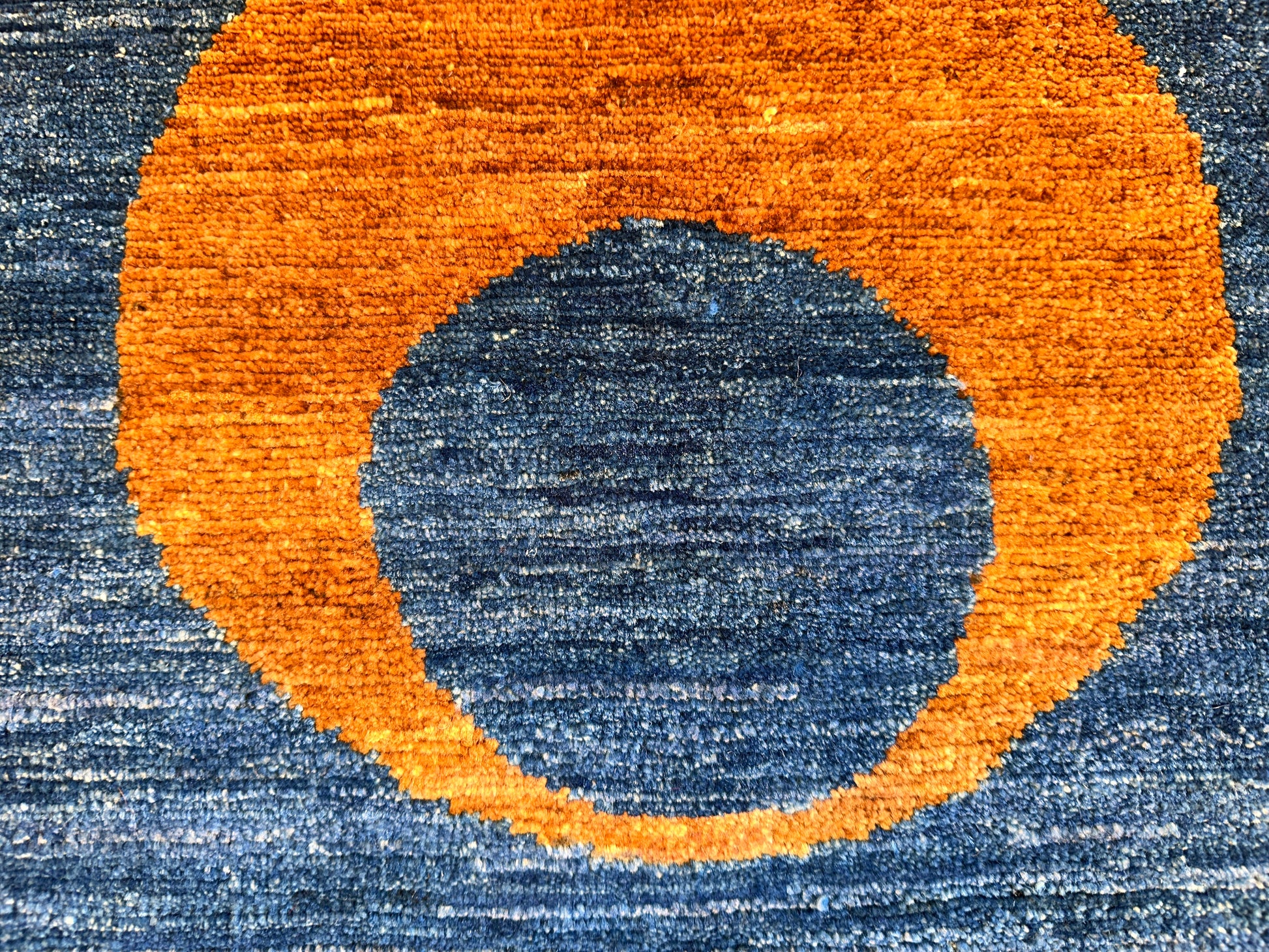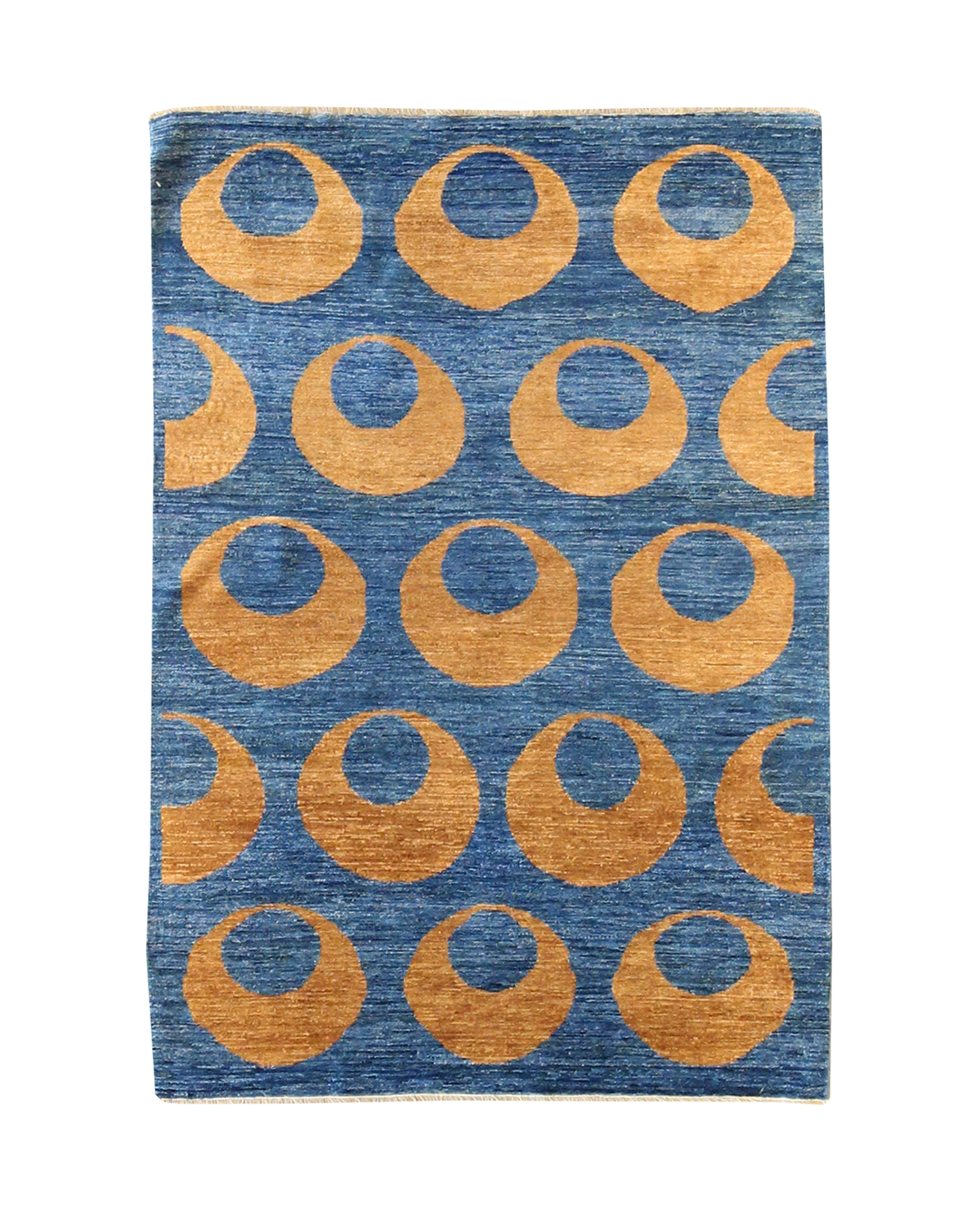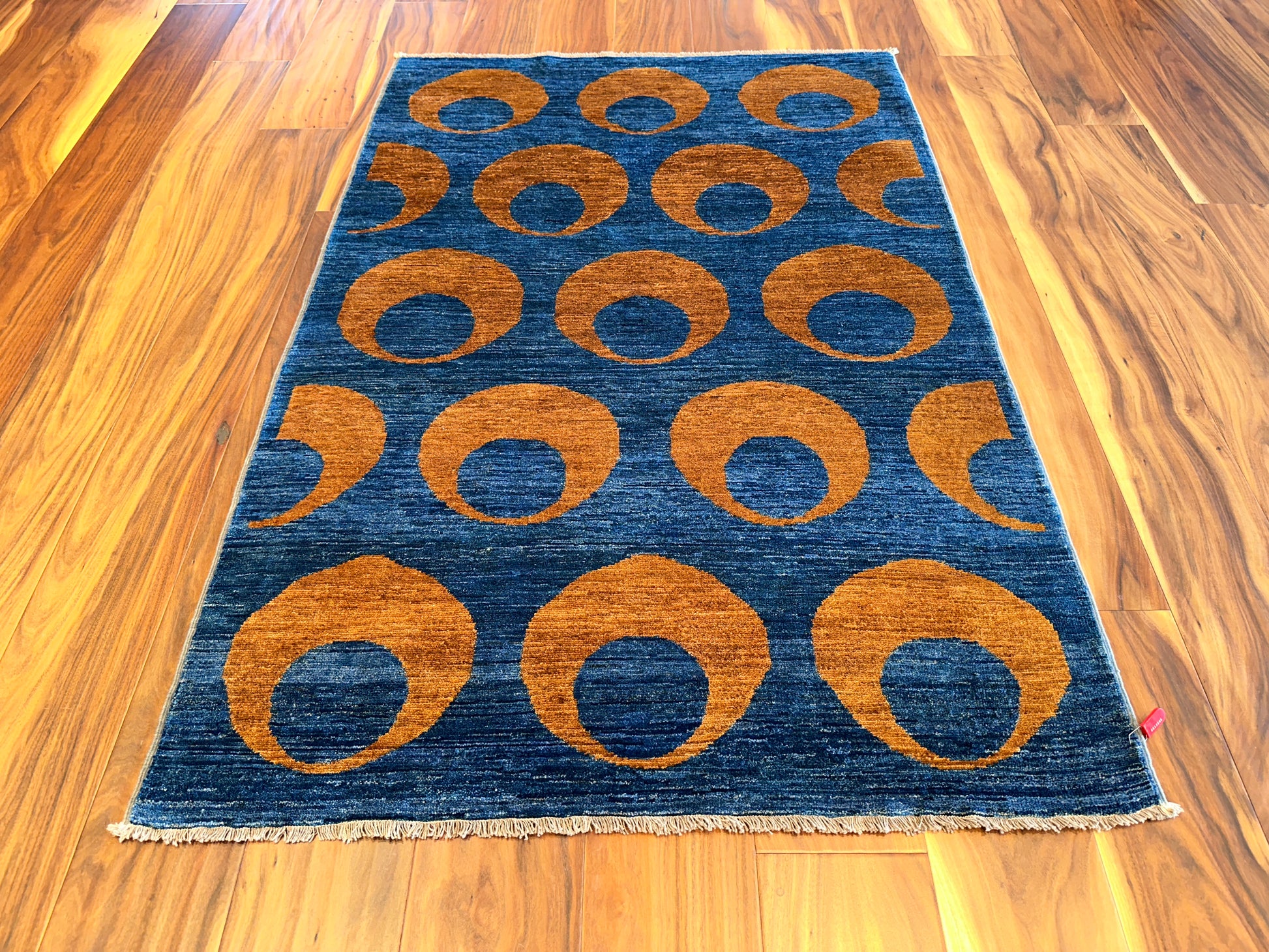 Bold and contemporary, this rug features a rhythmic array of golden ochre circles on a vivid denim blue field, blending abstract geometry with a playful, modern sensibility. The soft tonal contrast creates a lively yet grounded effect, making it a standout piece for spaces seeking both energy and balance.