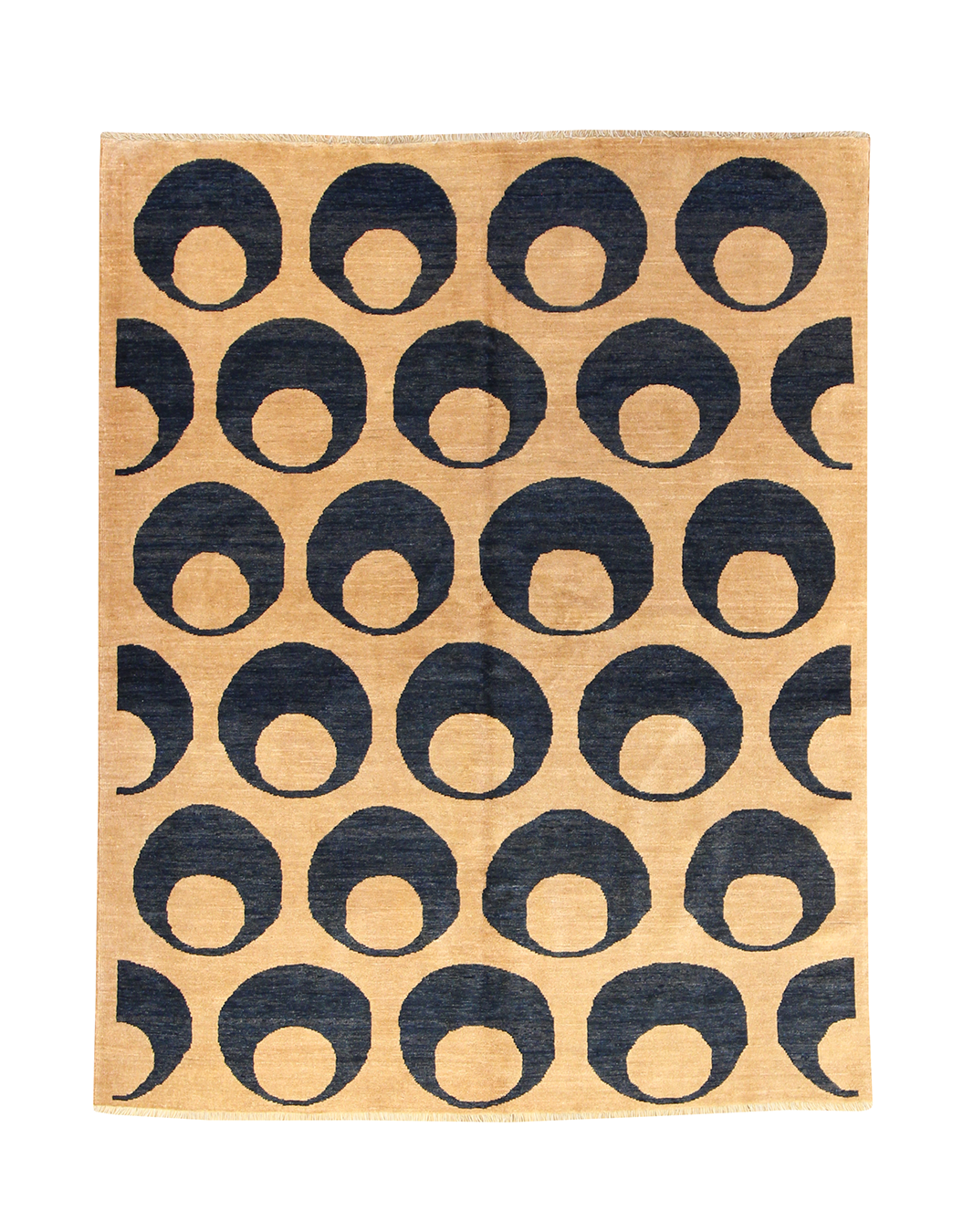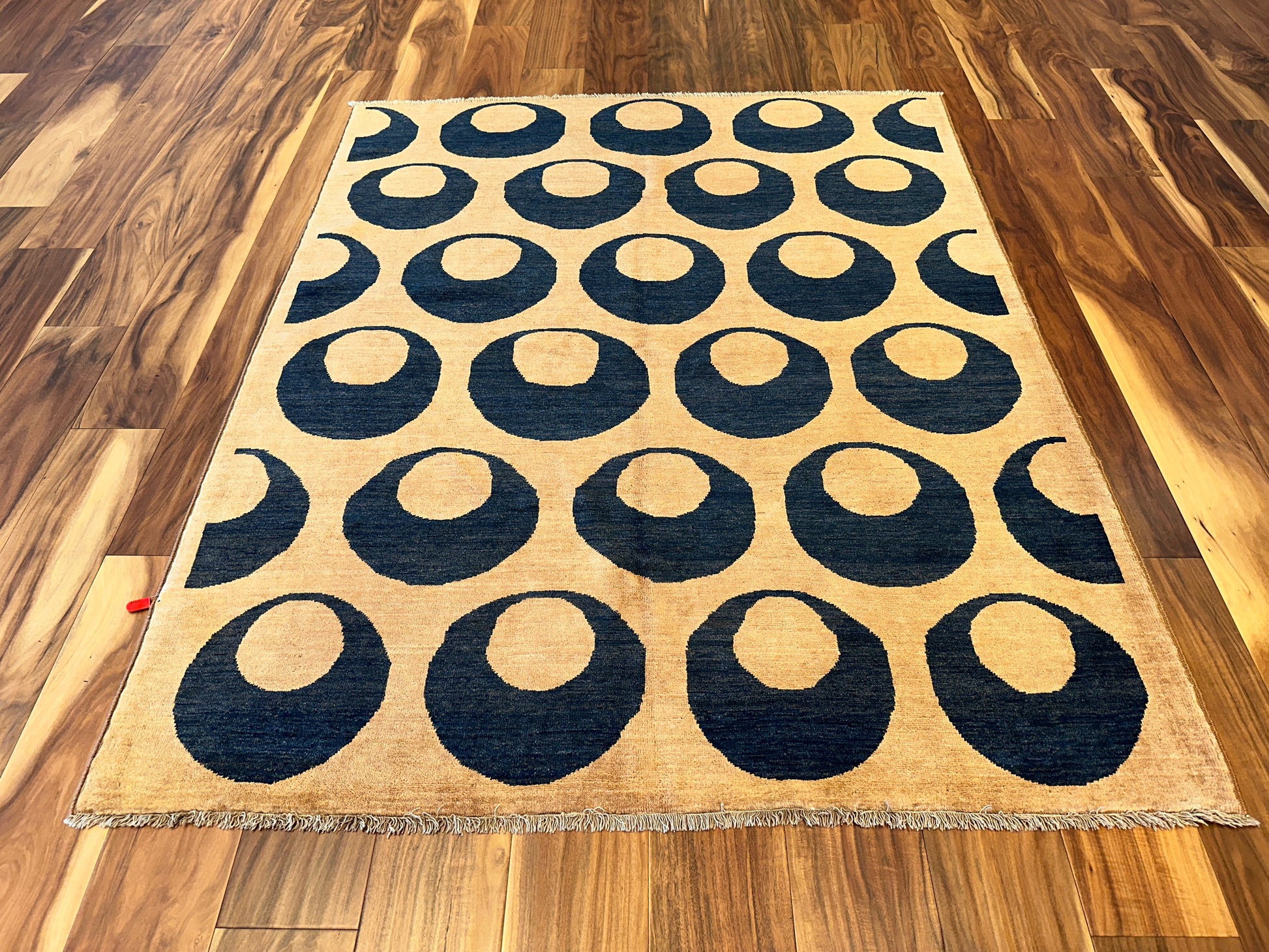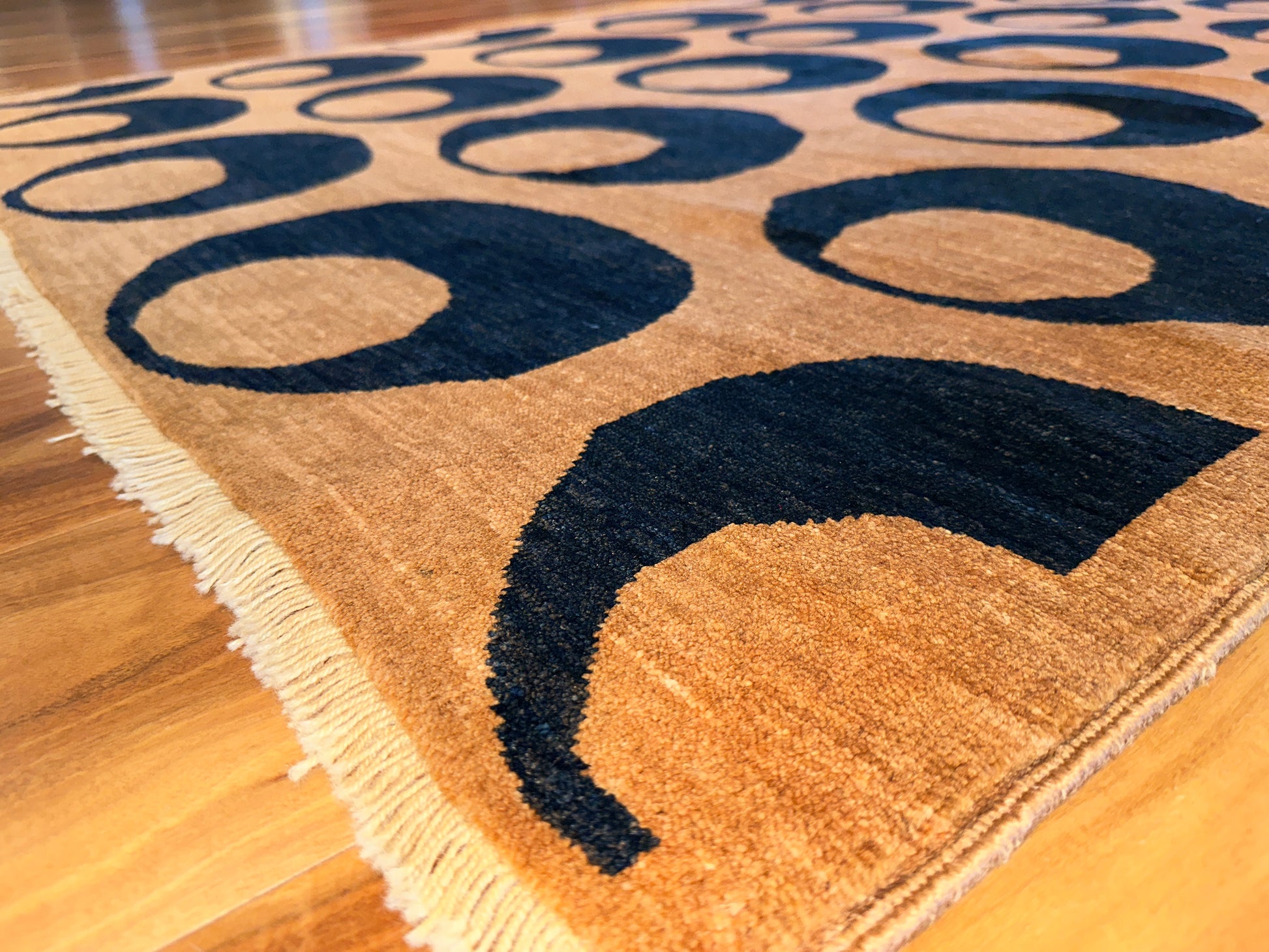 Bold and graphic, this handmade rug features a repeating pattern of large, painterly circles in dark navy against a warm beige field. The hand-knotted wool construction adds softness and subtle variation to the geometric design, creating an eye-catching foundation for contemporary or mid-century interiors.