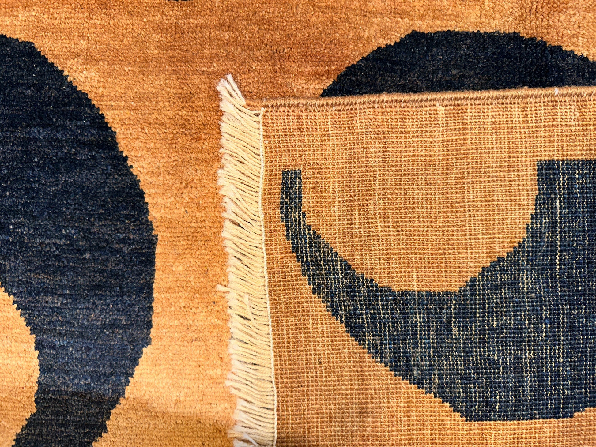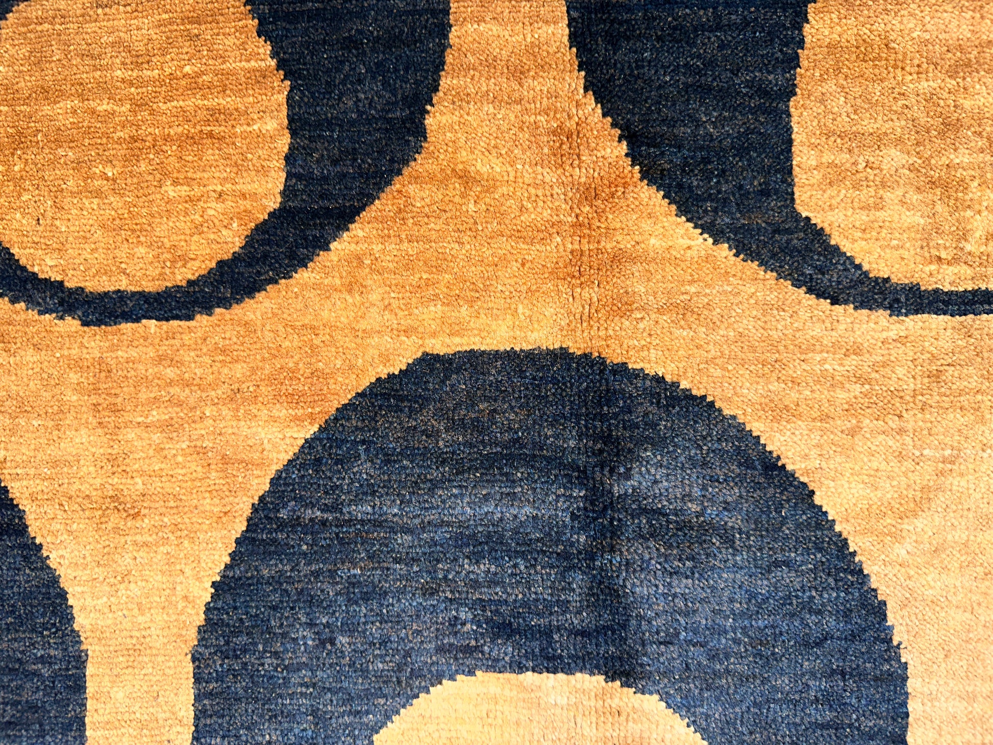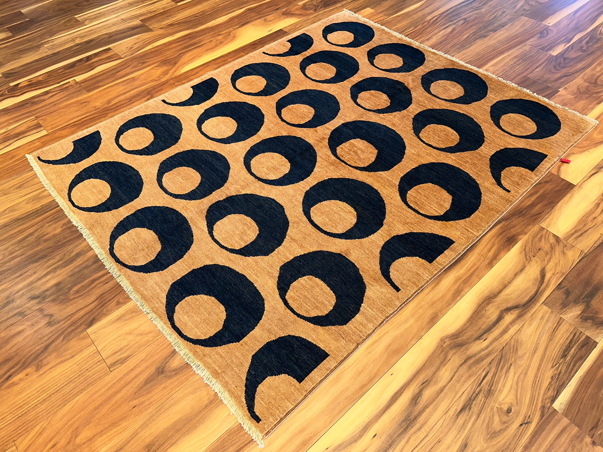 Bold and graphic, this handmade rug features a repeating pattern of large, painterly circles in dark navy against a warm beige field. The hand-knotted wool construction adds softness and subtle variation to the geometric design, creating an eye-catching foundation for contemporary or mid-century interiors.