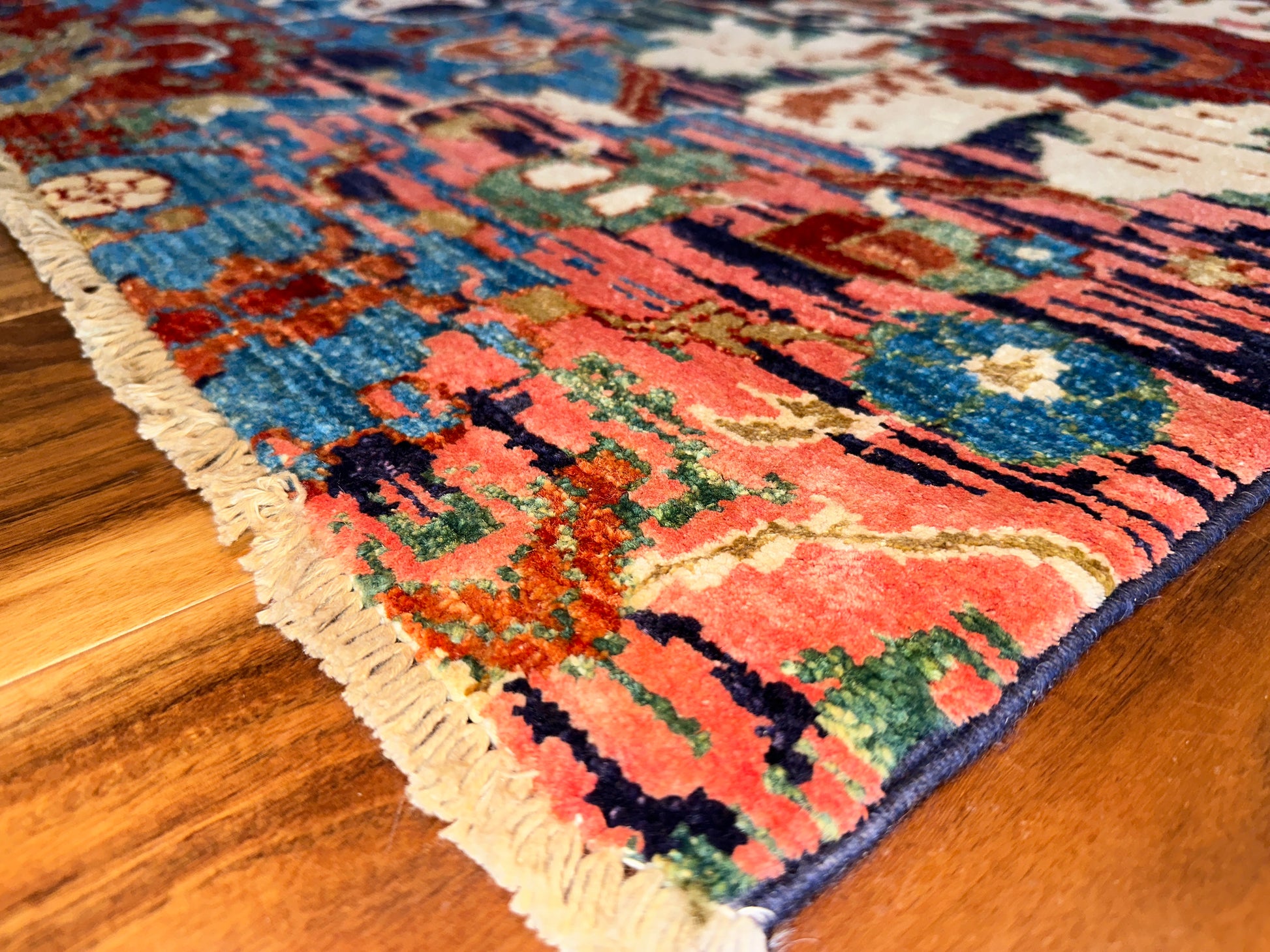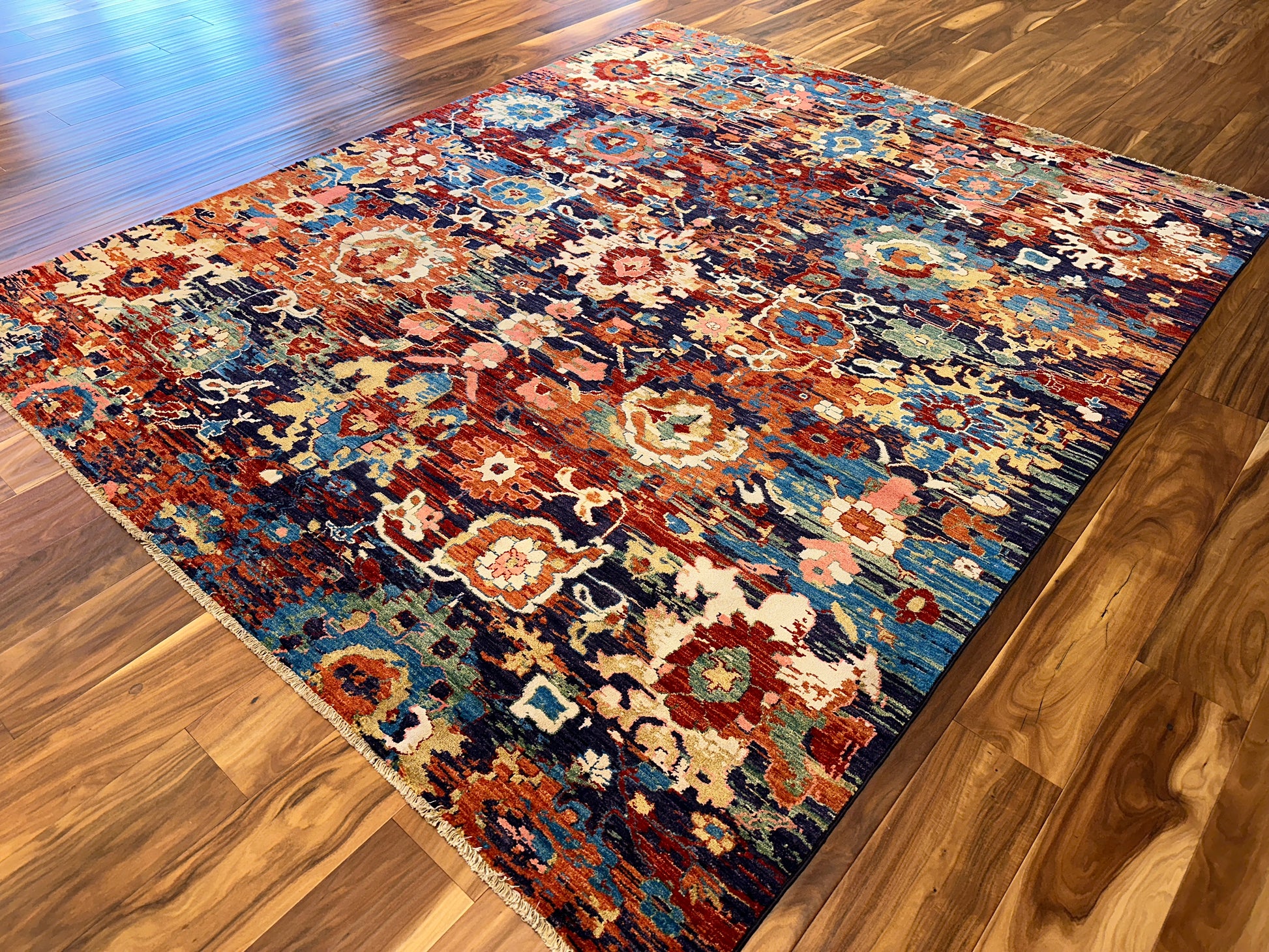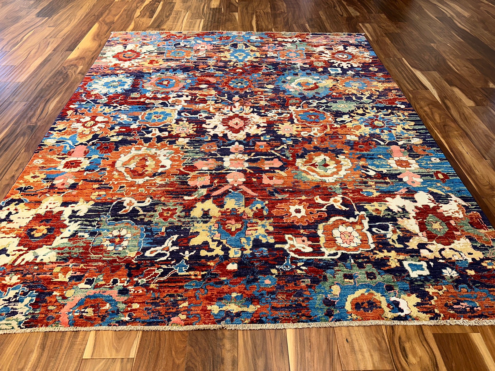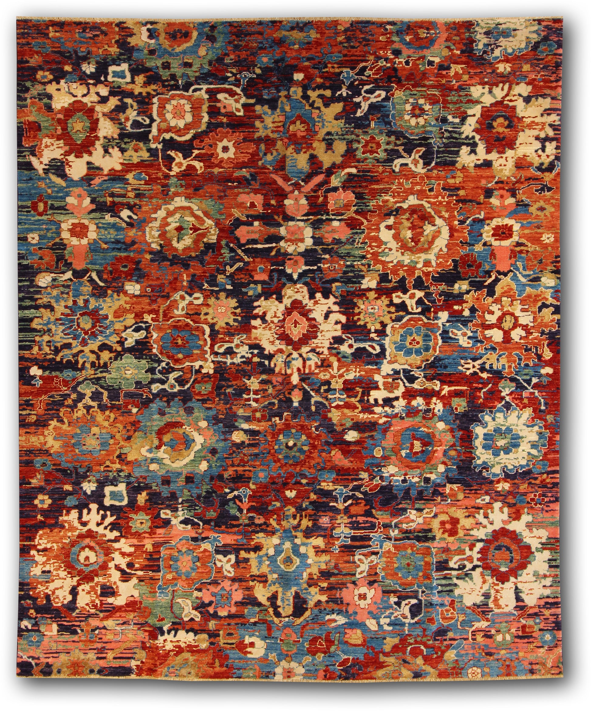 This striking rug is a vibrant interpretation of traditional motifs, reimagined through a richly layered palette of saturated tones. Abstracted florals and stylized medallions seem to emerge from a painterly wash of deep navy, ember red, and cerulean blue, creating a sense of movement and visual energy. A bold statement piece that bridges time-honored design with modern color sensibilities.