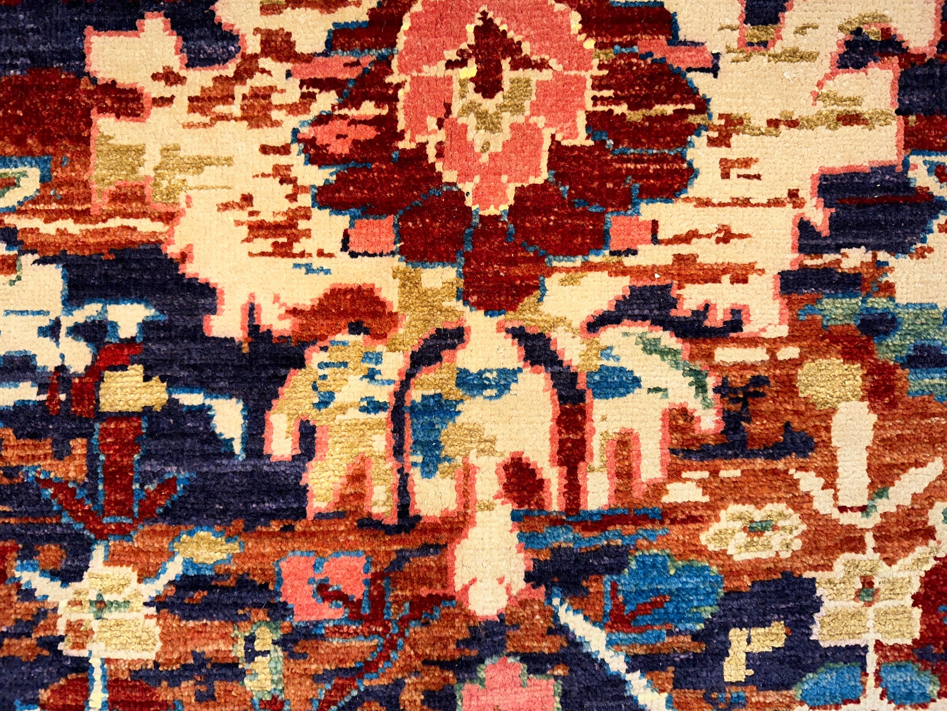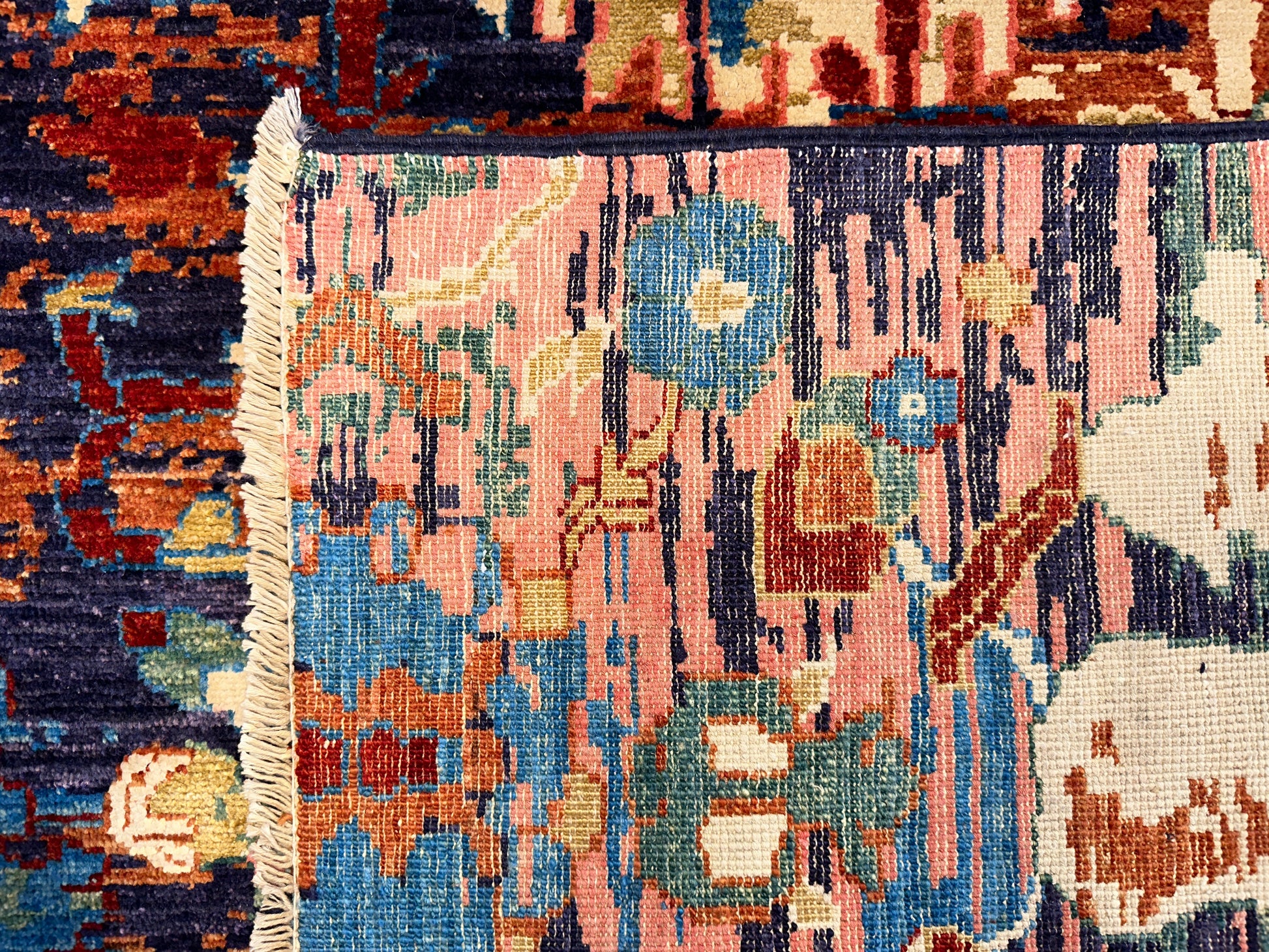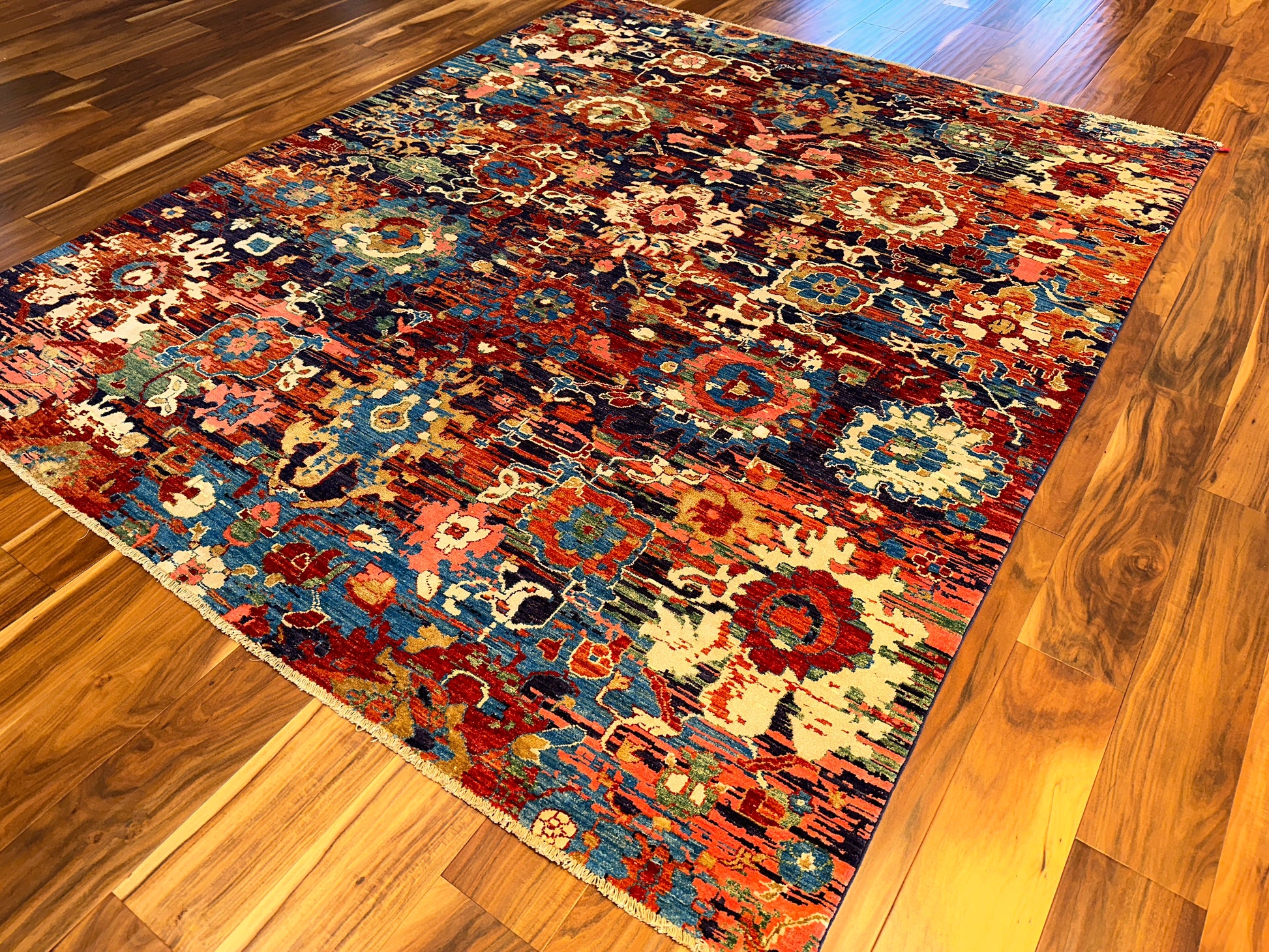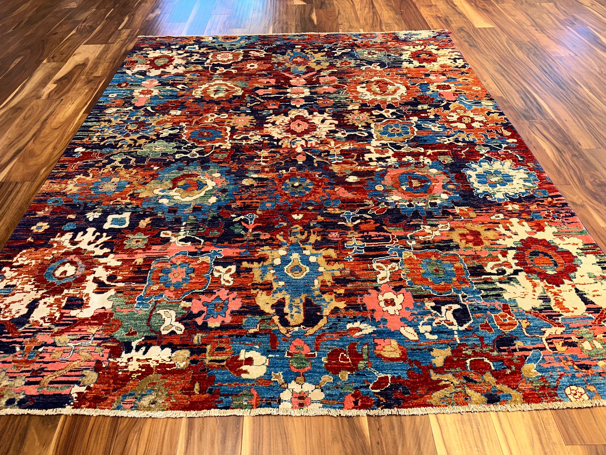 This striking rug is a vibrant interpretation of traditional motifs, reimagined through a richly layered palette of saturated tones. Abstracted florals and stylized medallions seem to emerge from a painterly wash of deep navy, ember red, and cerulean blue, creating a sense of movement and visual energy. A bold statement piece that bridges time-honored design with modern color sensibilities.