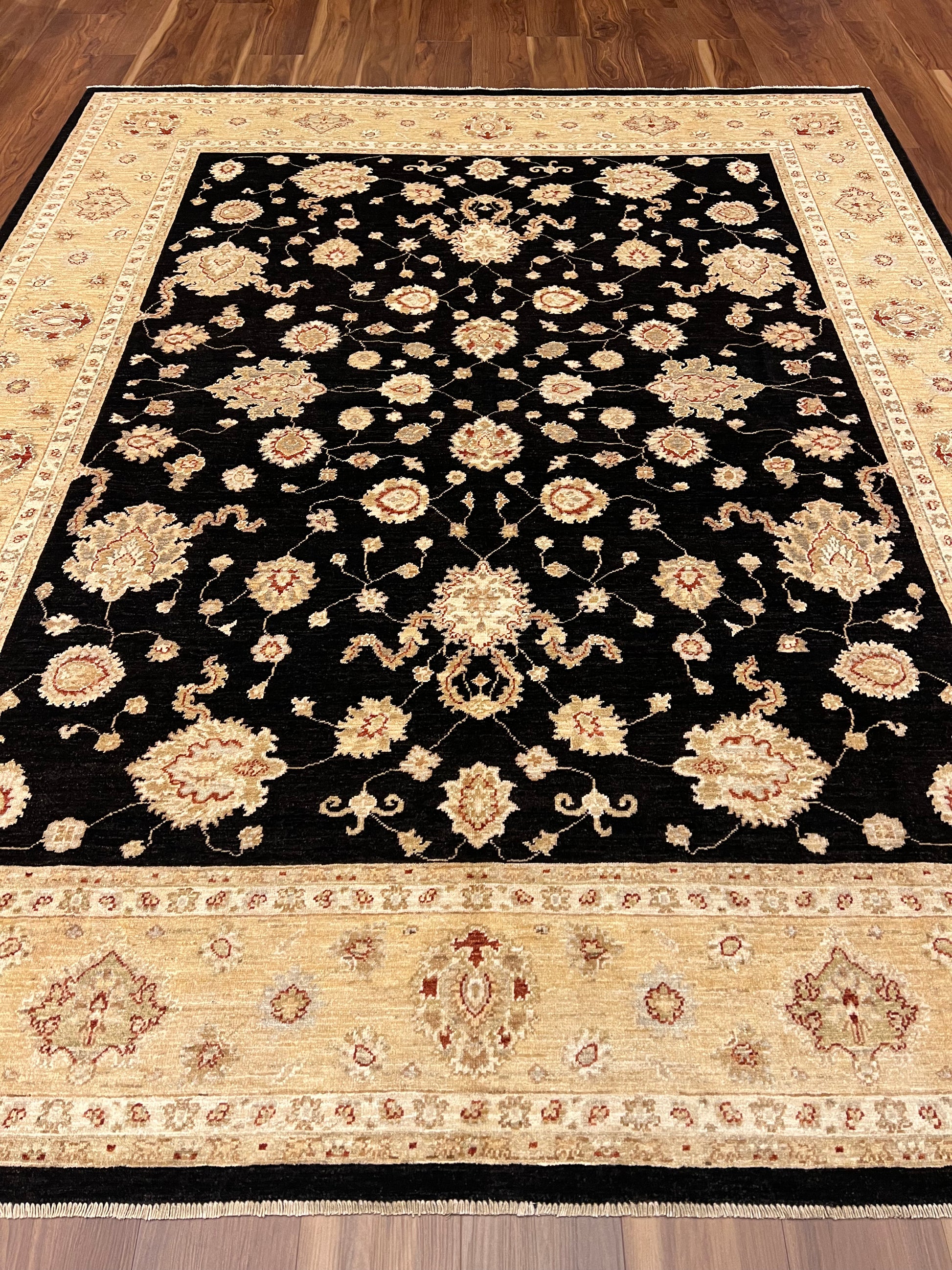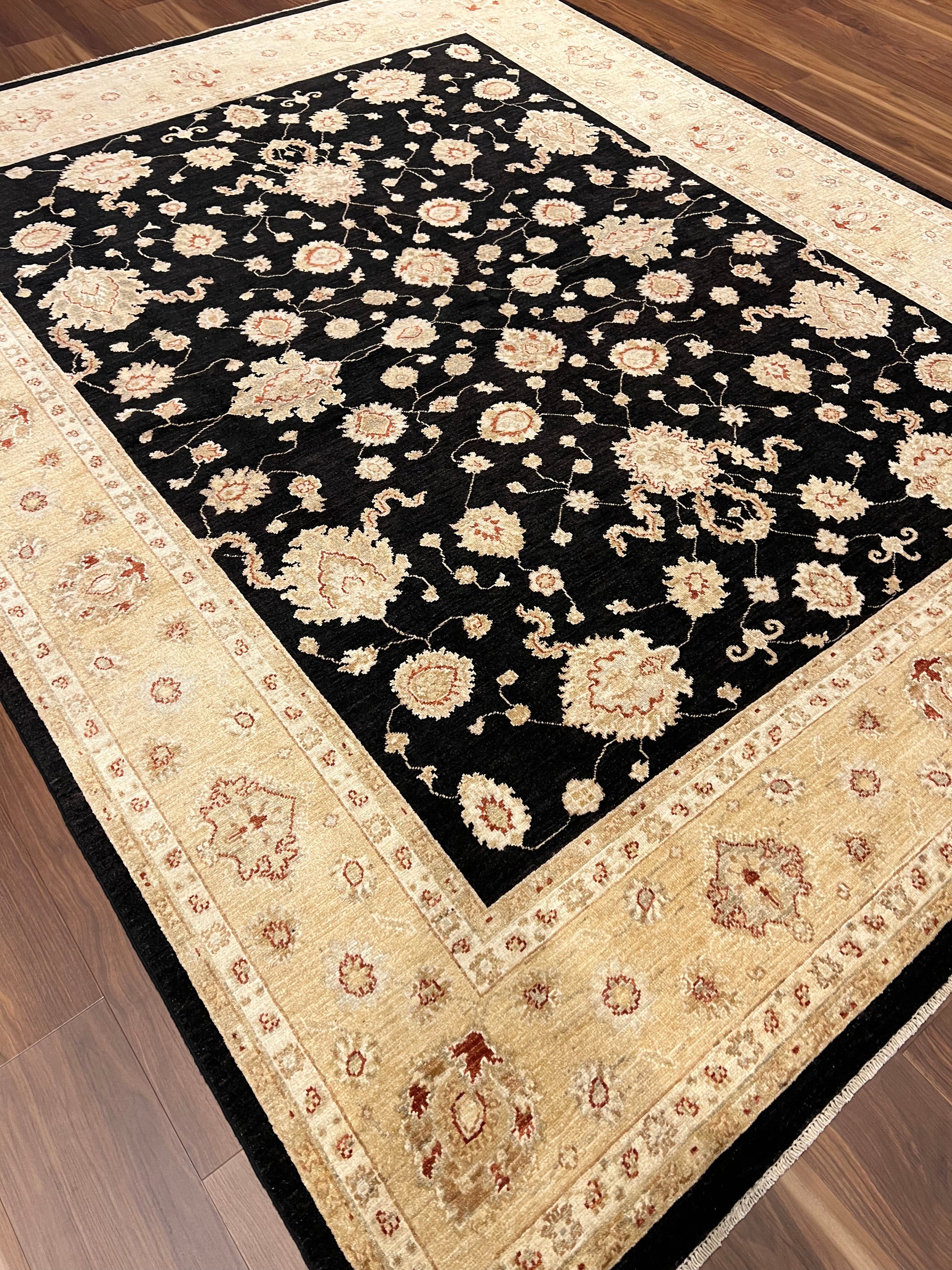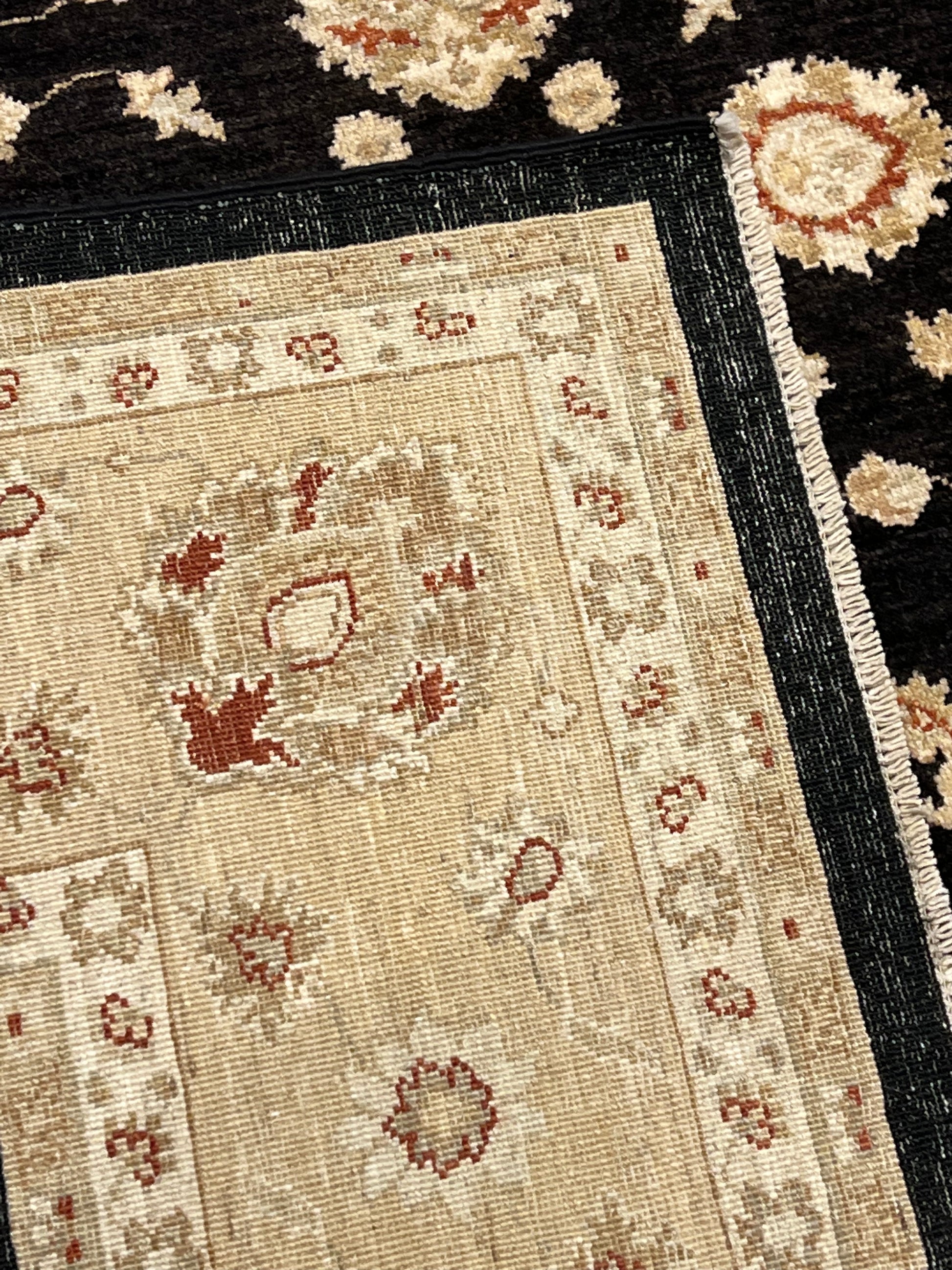 This exquisite Transitional Usak rug showcases an elegant floral motif spread across a deep black field, bordered by a delicate beige framework adorned with intricate designs. Made from high-quality wool, this rug exemplifies skilled craftsmanship, offering a soft yet durable texture. The harmonious blend of classic patterns with a modern color scheme adds a sophisticated yet contemporary touch to any space. Whether placed in a formal living room or a cozy bedroom, this rug will elevate the room's aesthetics while providing comfort underfoot.