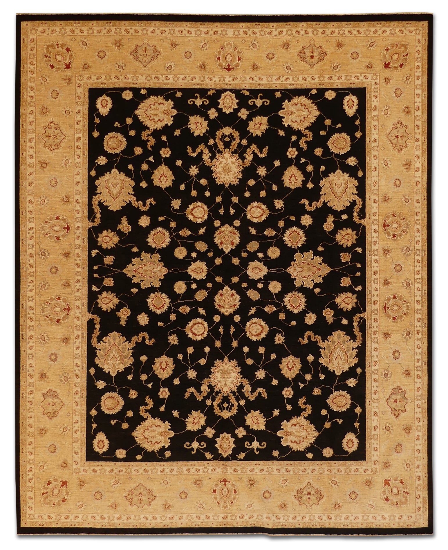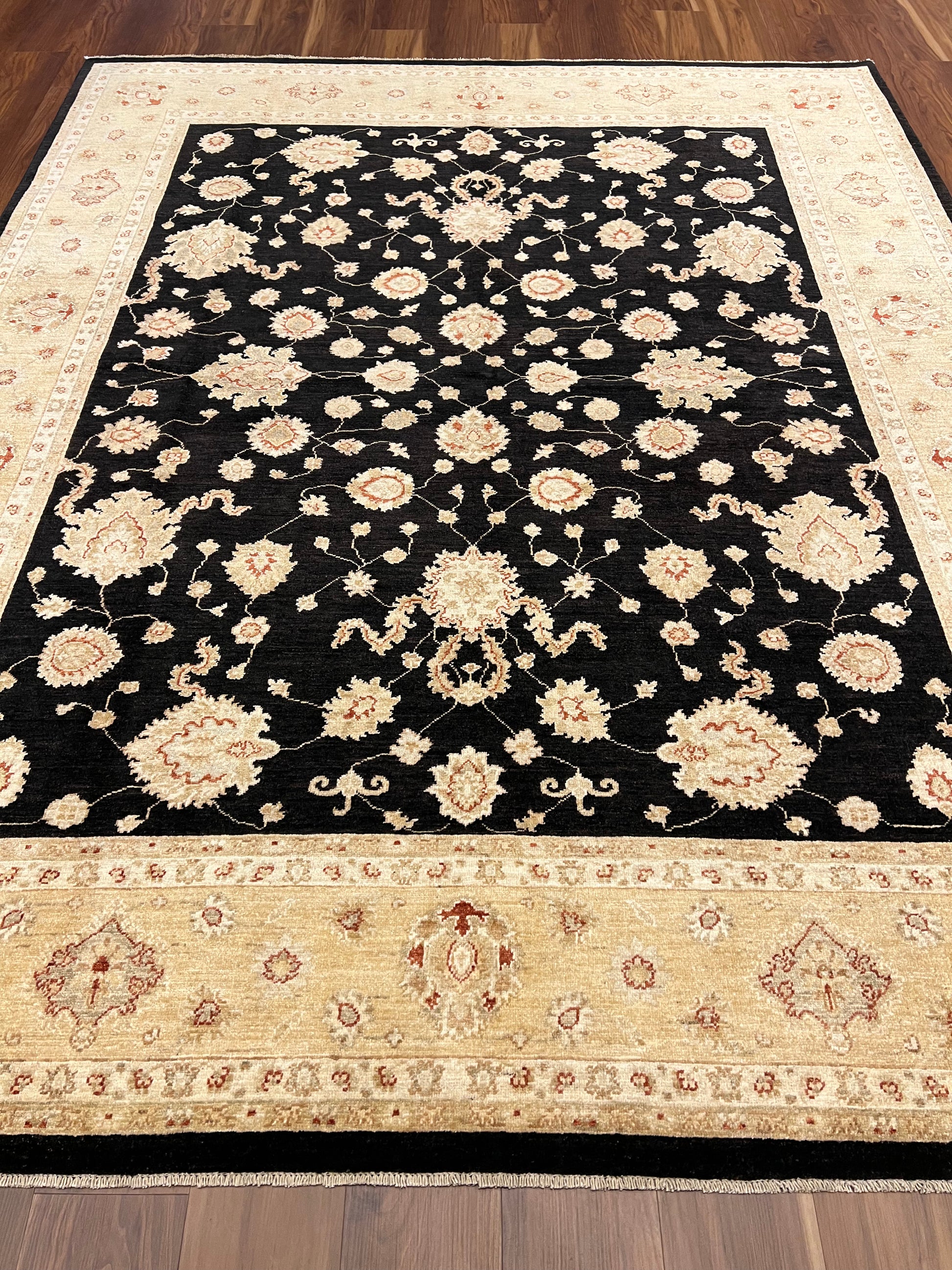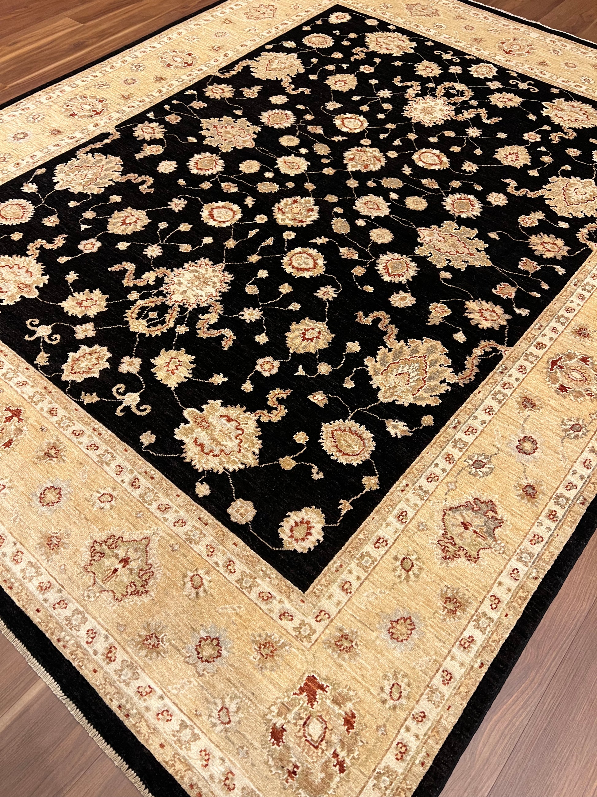 This exquisite Transitional Usak rug showcases an elegant floral motif spread across a deep black field, bordered by a delicate beige framework adorned with intricate designs. Made from high-quality wool, this rug exemplifies skilled craftsmanship, offering a soft yet durable texture. The harmonious blend of classic patterns with a modern color scheme adds a sophisticated yet contemporary touch to any space. Whether placed in a formal living room or a cozy bedroom, this rug will elevate the room's aesthetics while providing comfort underfoot.