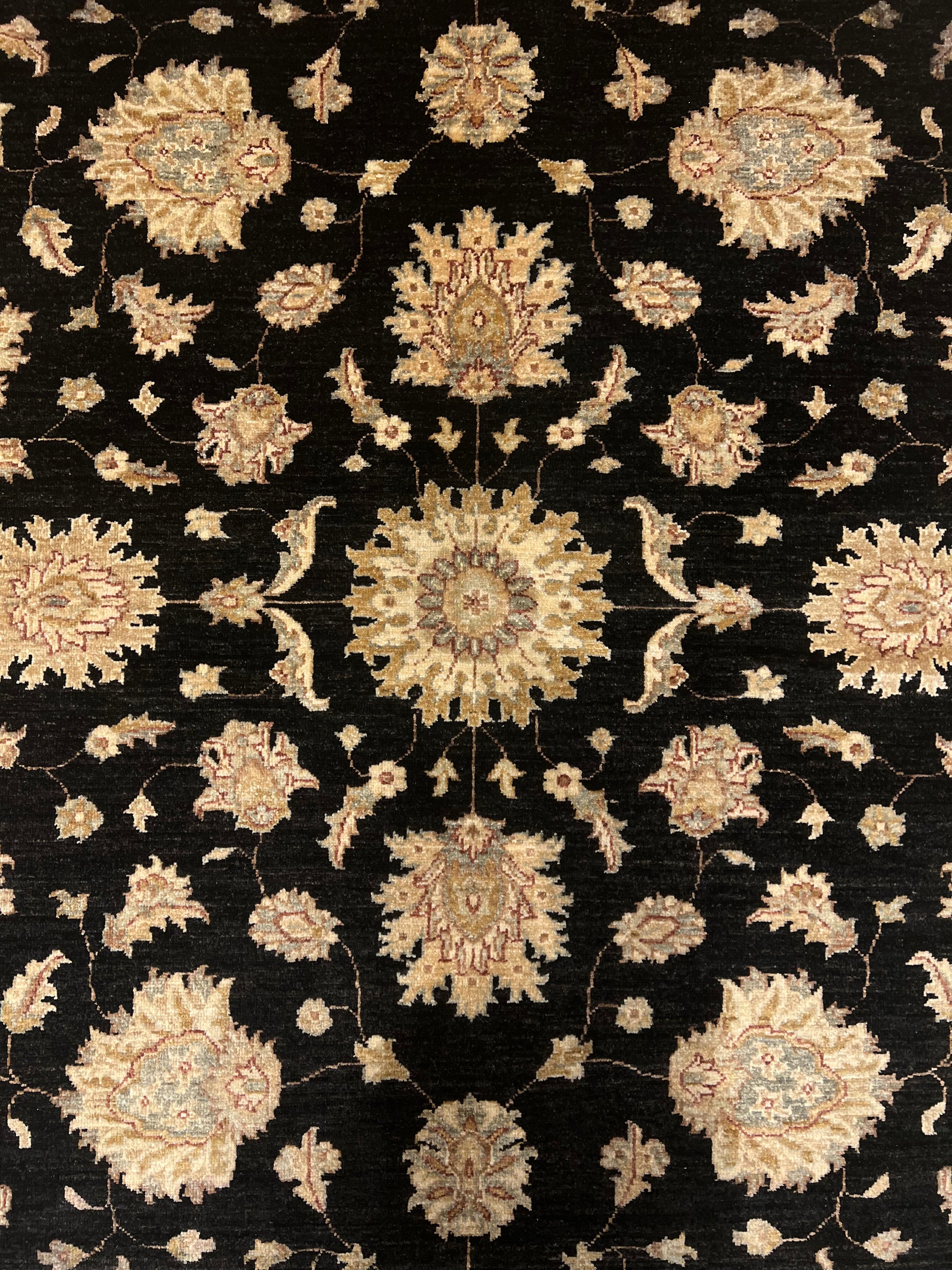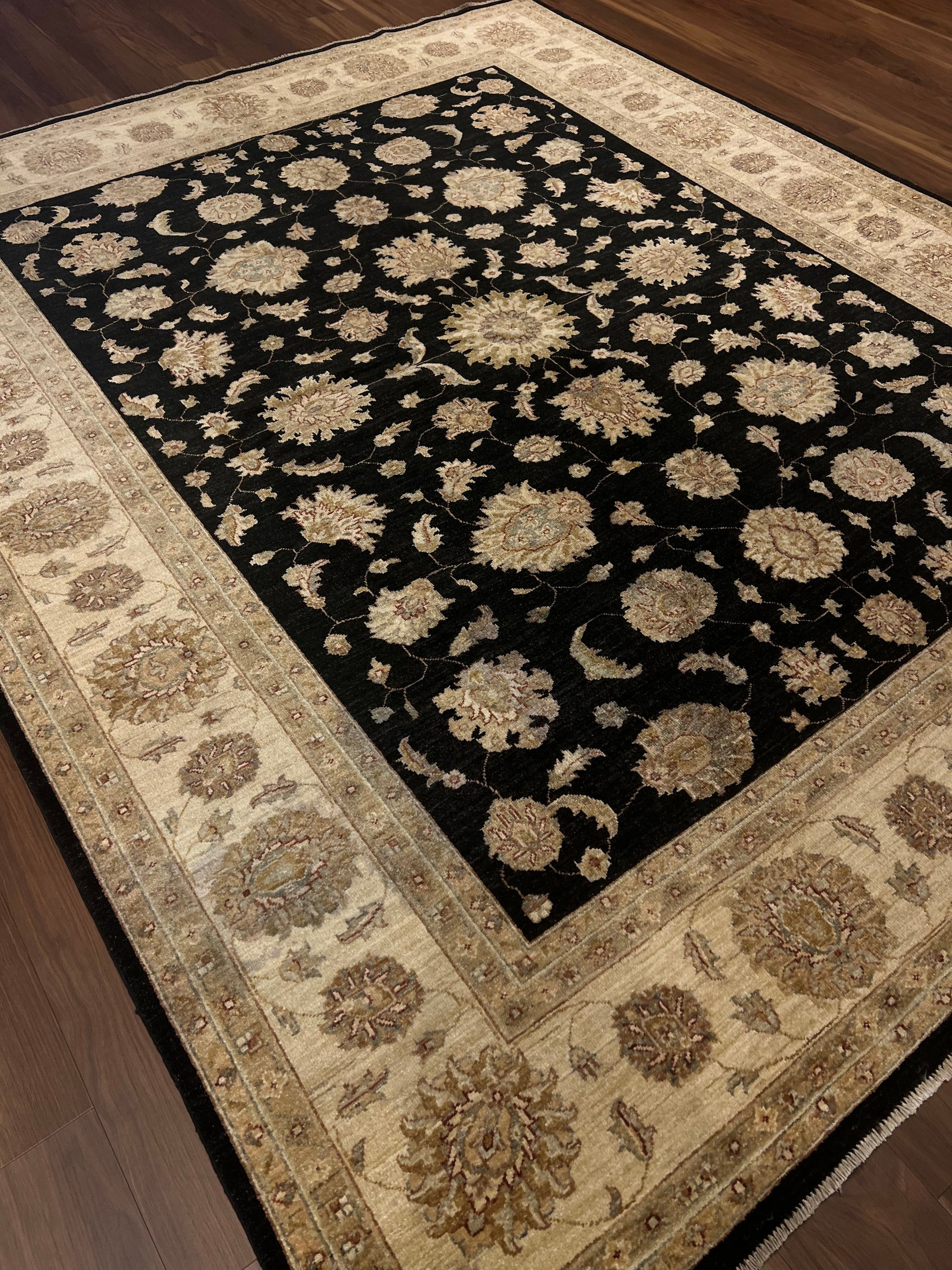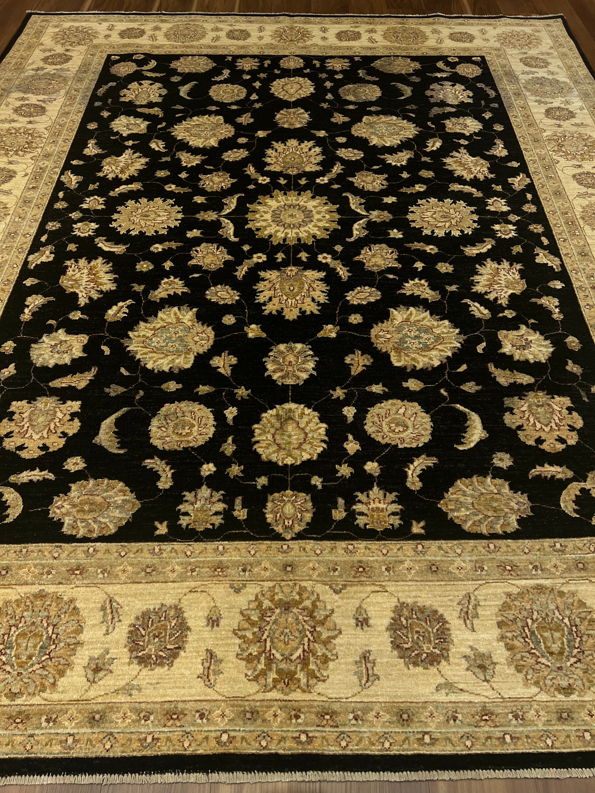 This exquisite Transitional Usak rug features a sophisticated combination of traditional Usak motifs with a modern design sensibility. Made from high-quality wool, the rug boasts a rich black field complemented by opulent beige and gold accents, creating a visually stunning contrast. The elaborate border frames the central pattern beautifully, making it a timeless piece for any interior. Durable and plush, it seamlessly merges classic elegance with contemporary appeal.