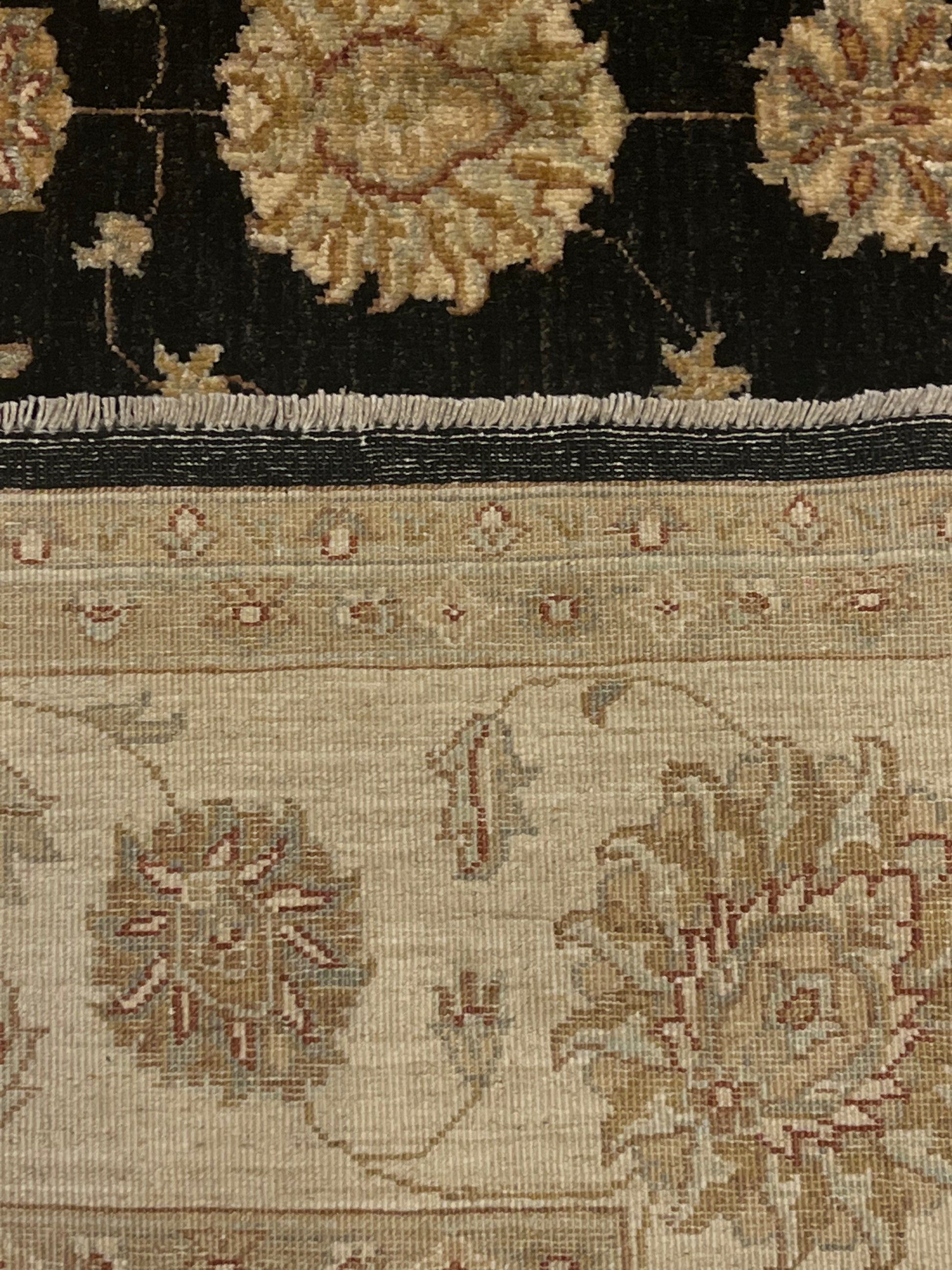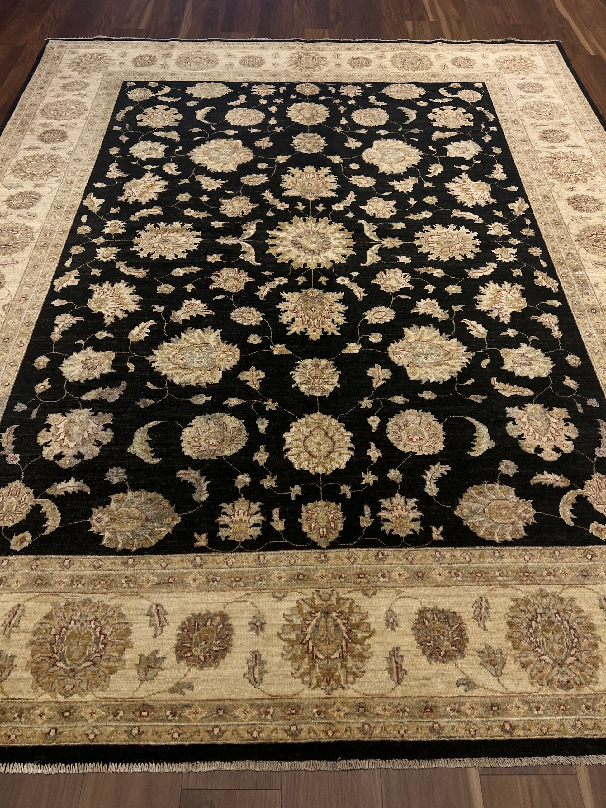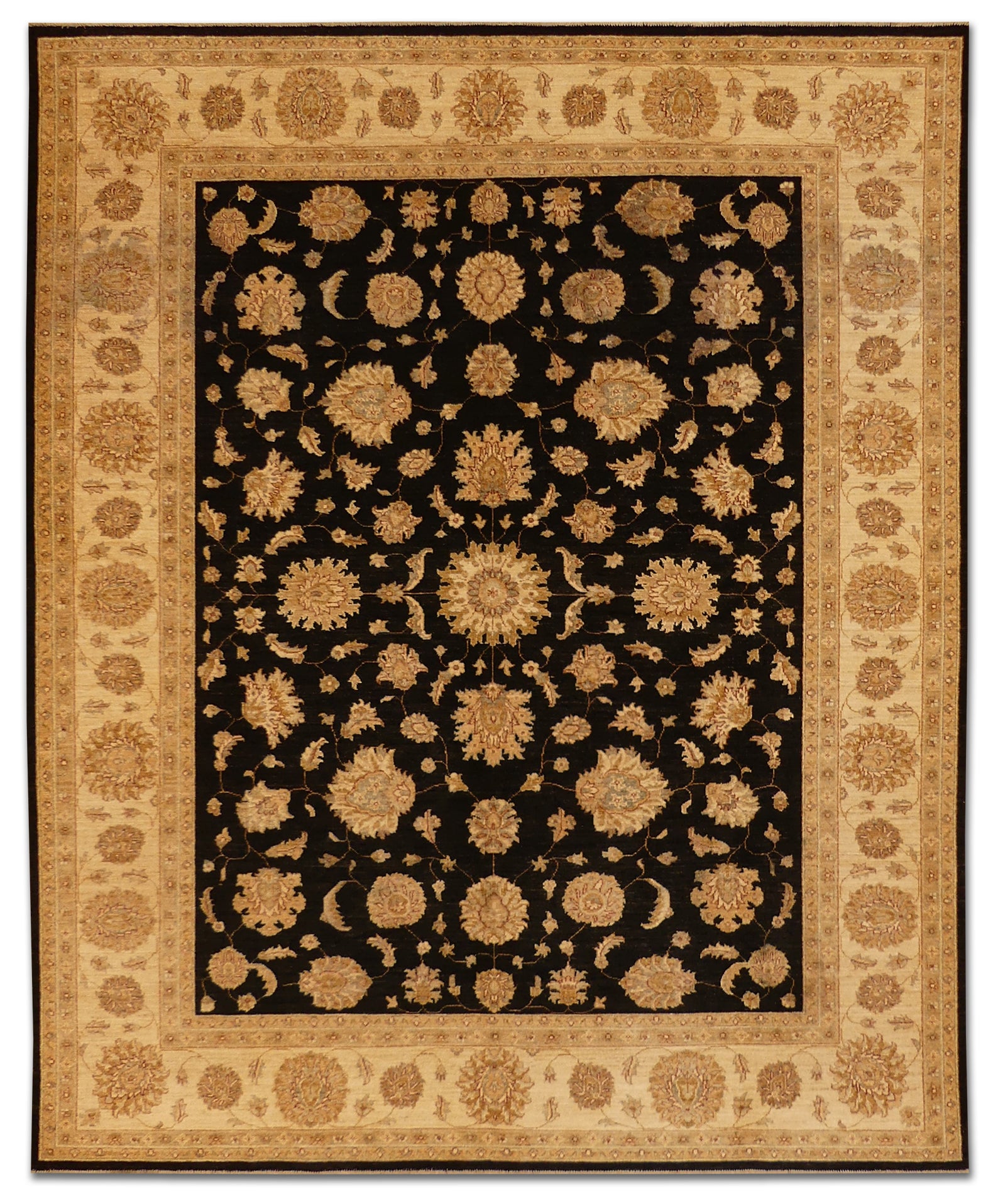 This exquisite Transitional Usak rug features a sophisticated combination of traditional Usak motifs with a modern design sensibility. Made from high-quality wool, the rug boasts a rich black field complemented by opulent beige and gold accents, creating a visually stunning contrast. The elaborate border frames the central pattern beautifully, making it a timeless piece for any interior. Durable and plush, it seamlessly merges classic elegance with contemporary appeal.