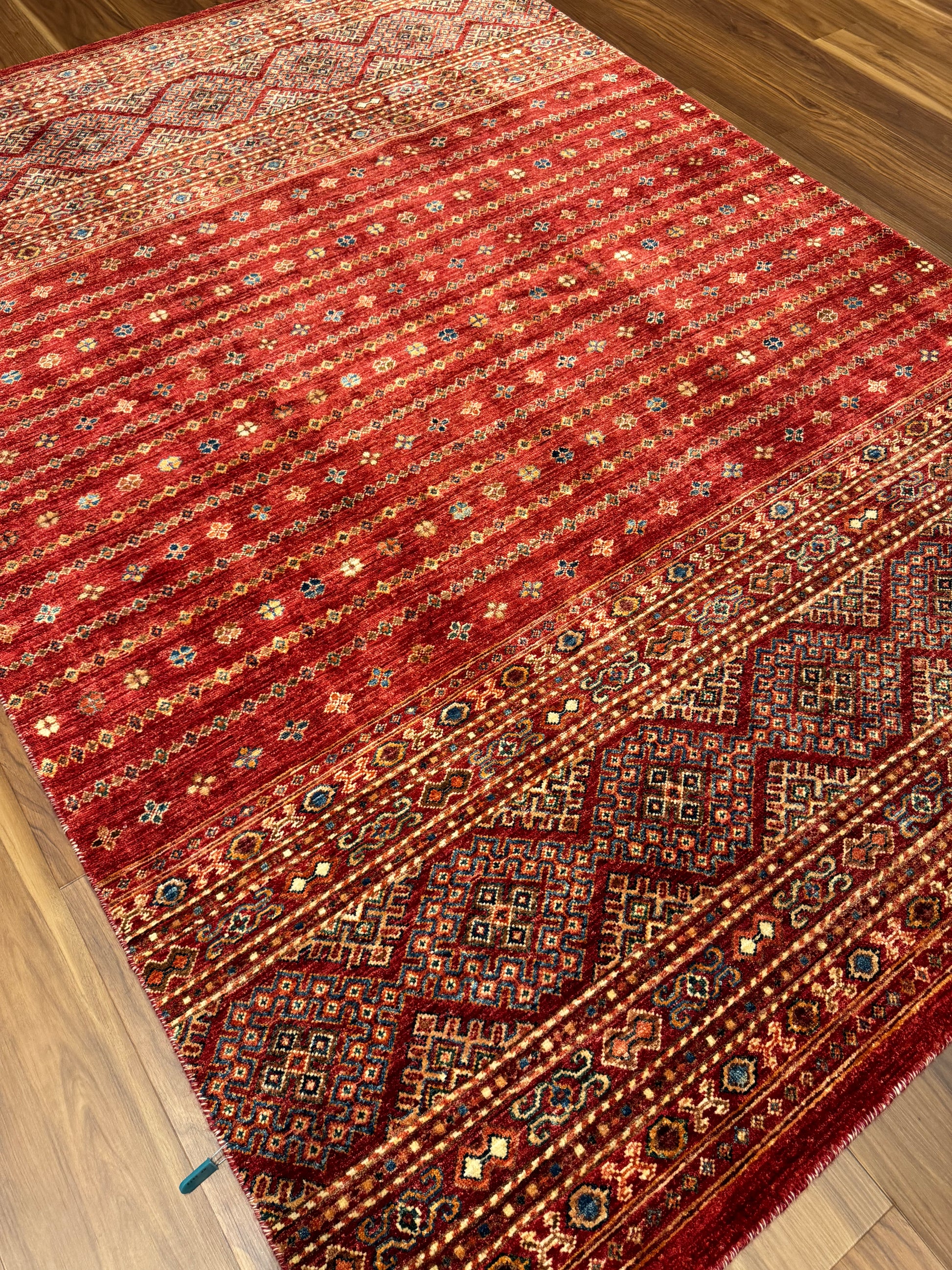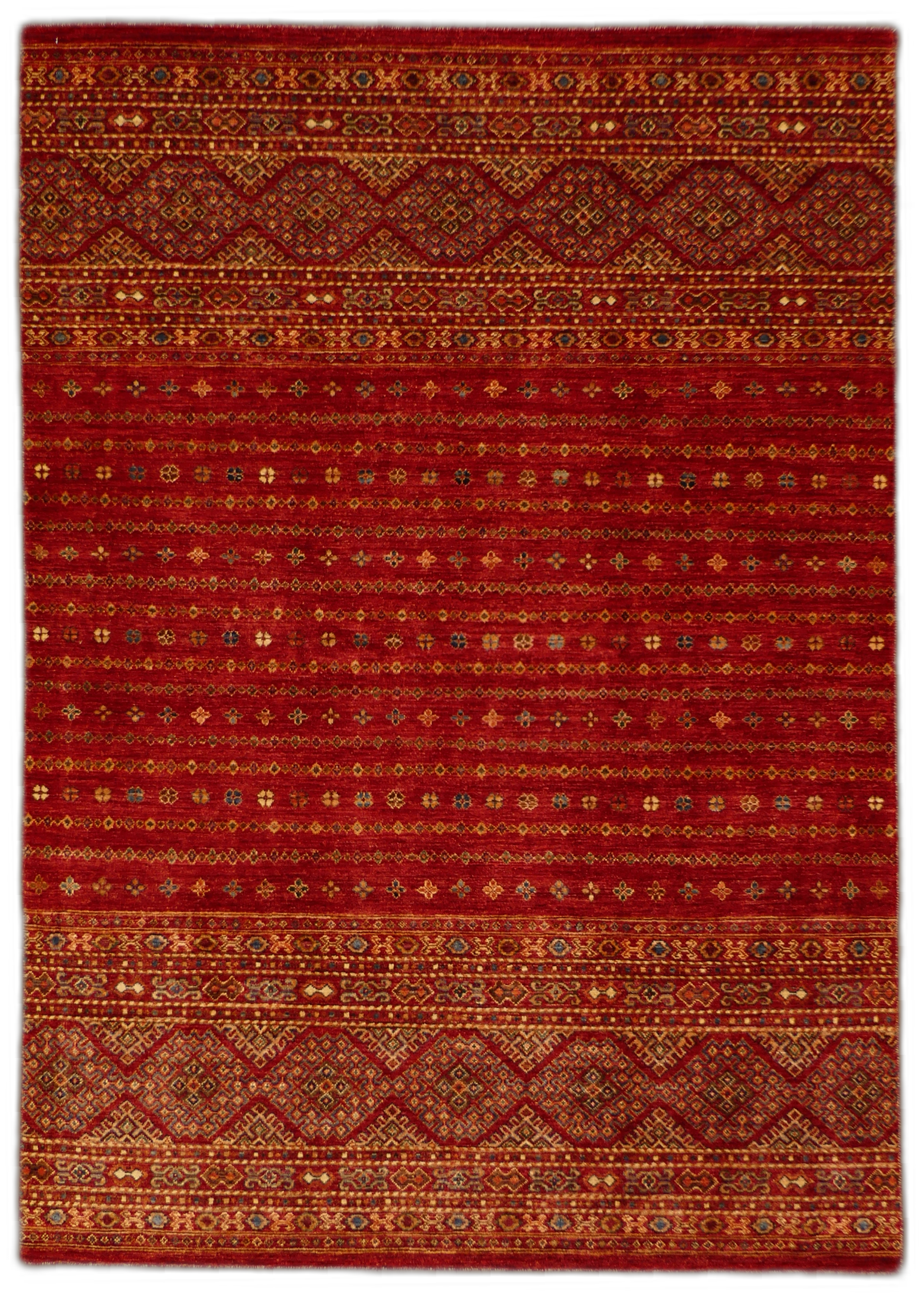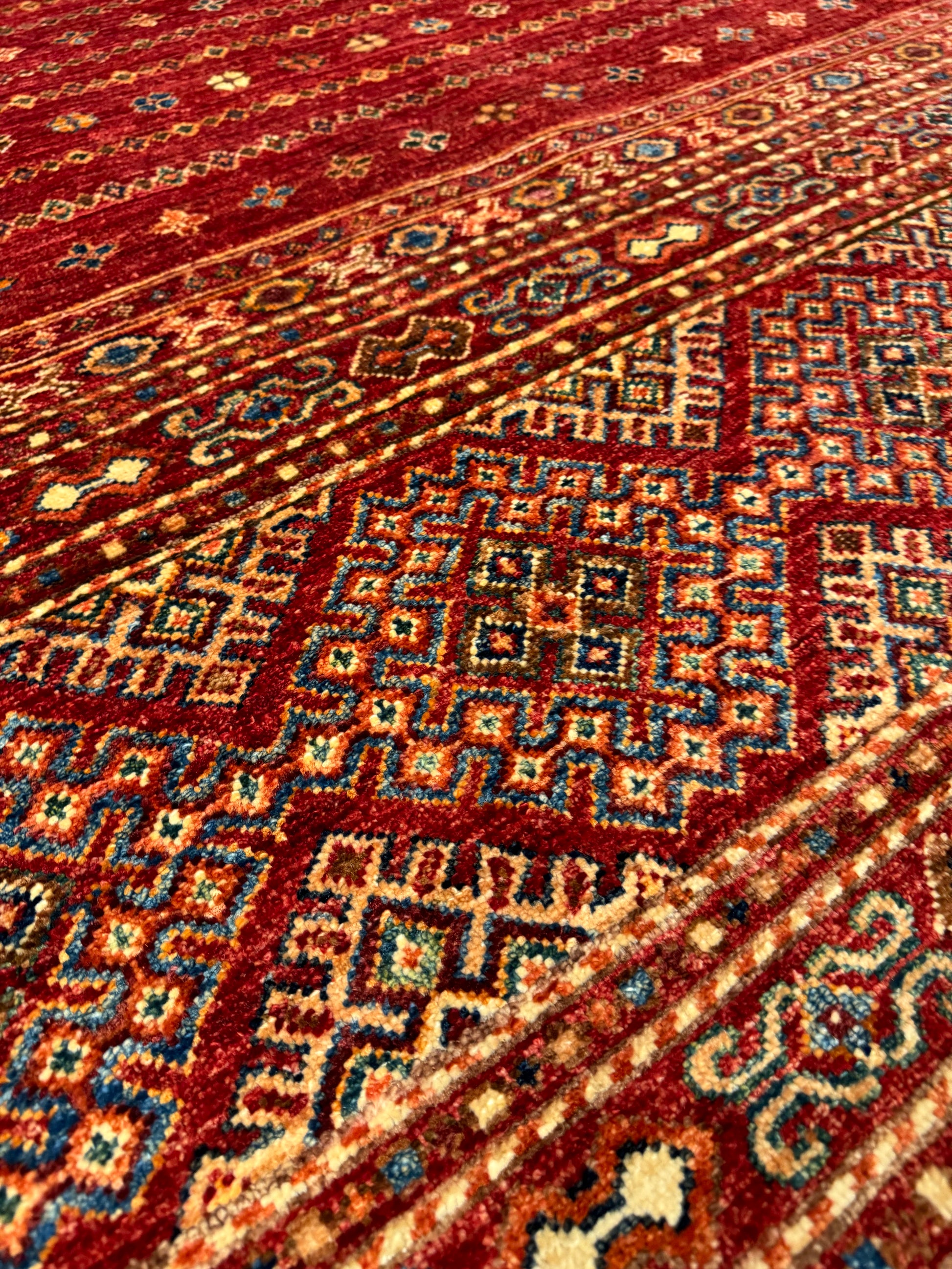 The Tribal Sal rug features a rich tapestry of vibrant red and deep indigo hues, adorned with intricate gold geometrical and diamond motifs. Expertly handwoven, this woolen piece embodies an essence of tribal artistry. It's a stunning representation of traditional craftsmanship, bringing warmth and cultural depth to any interior.