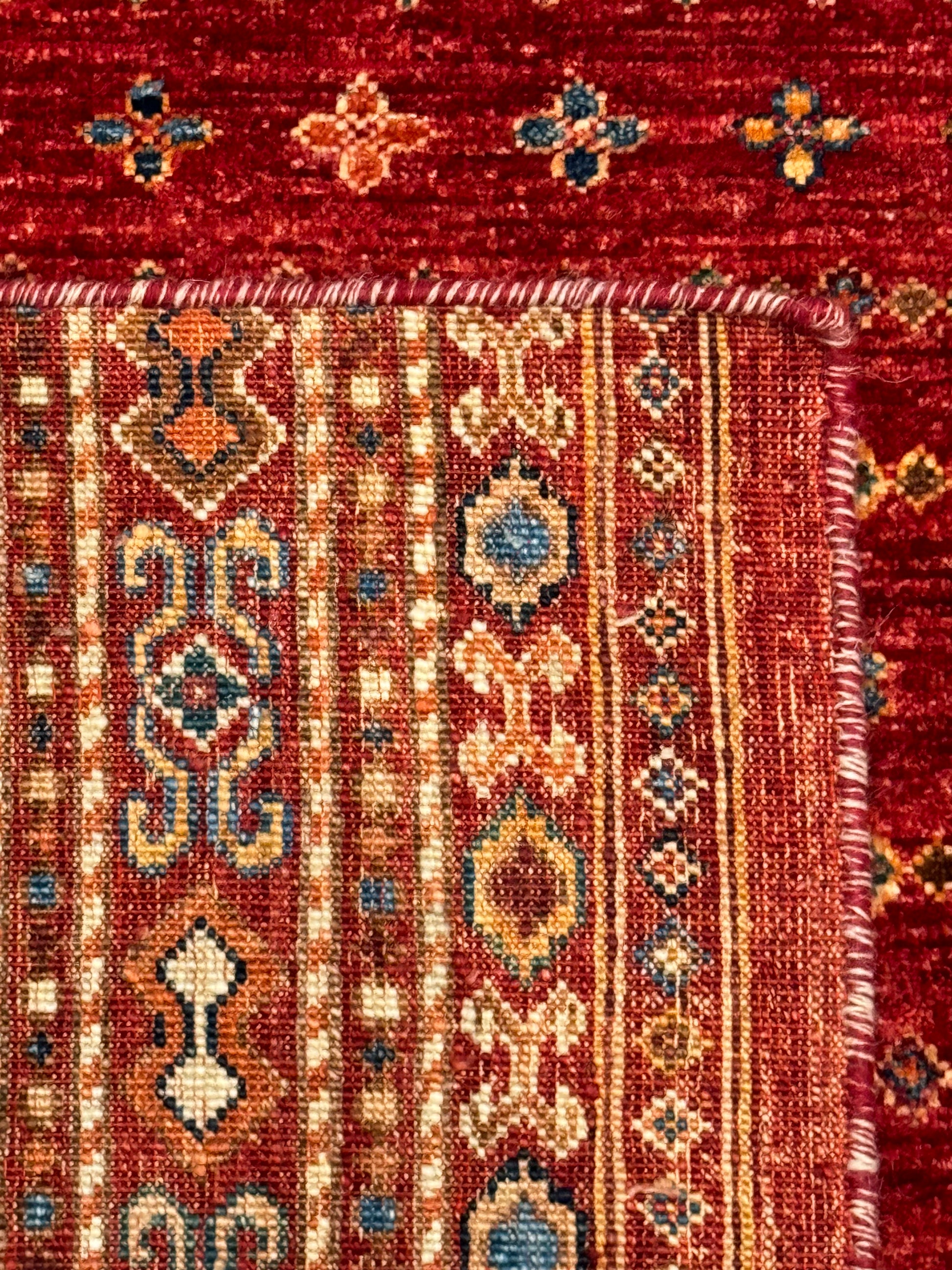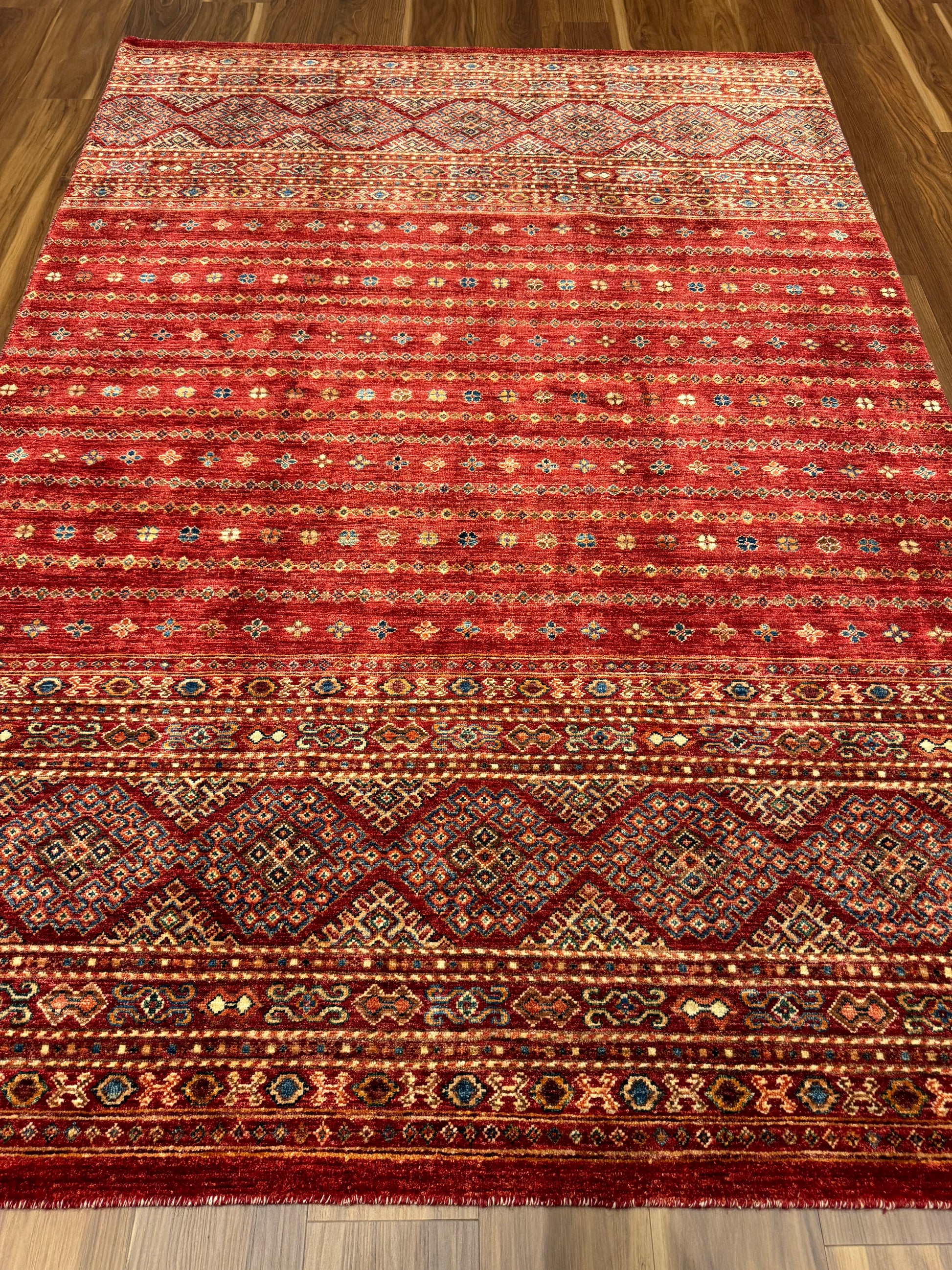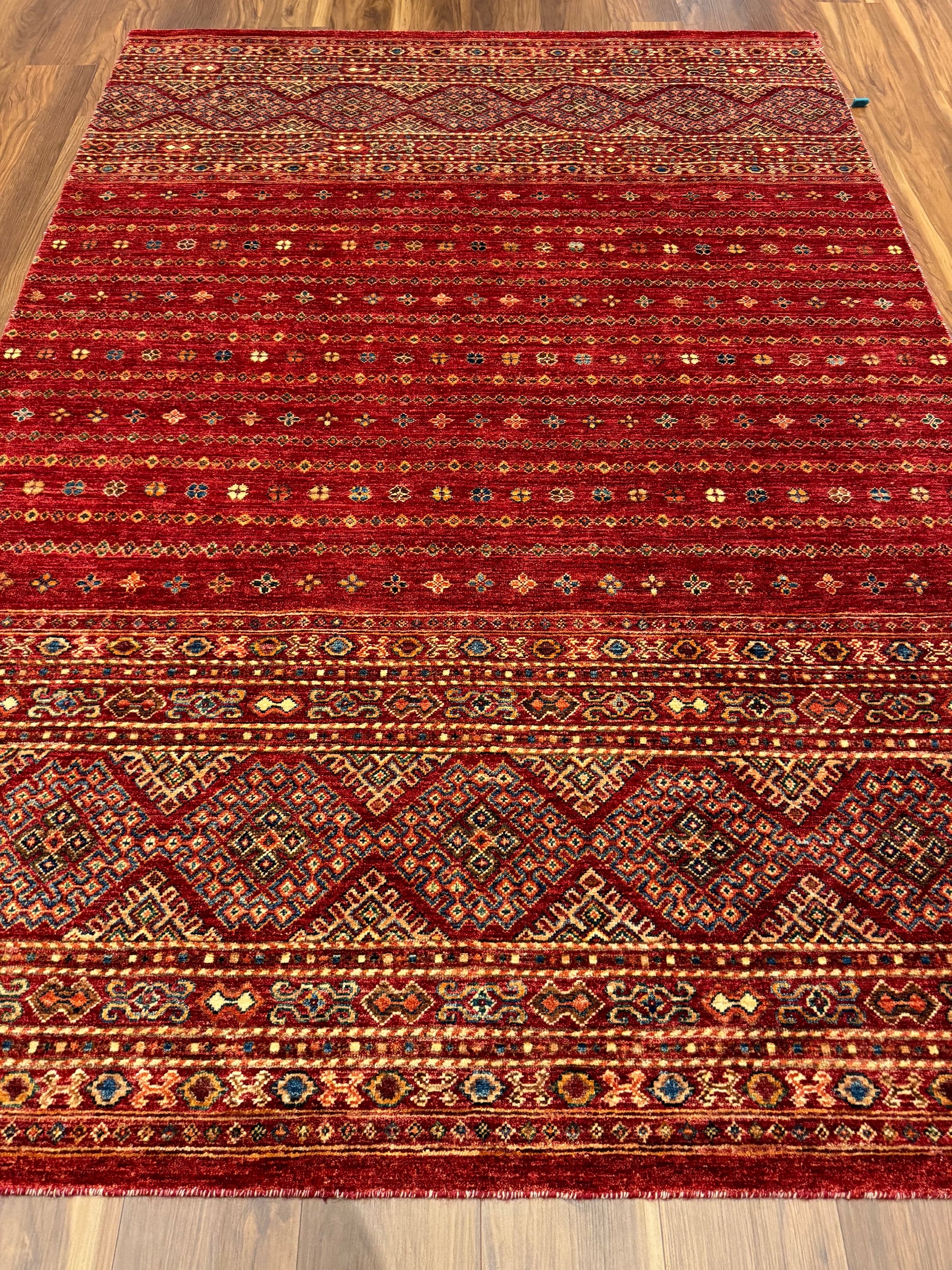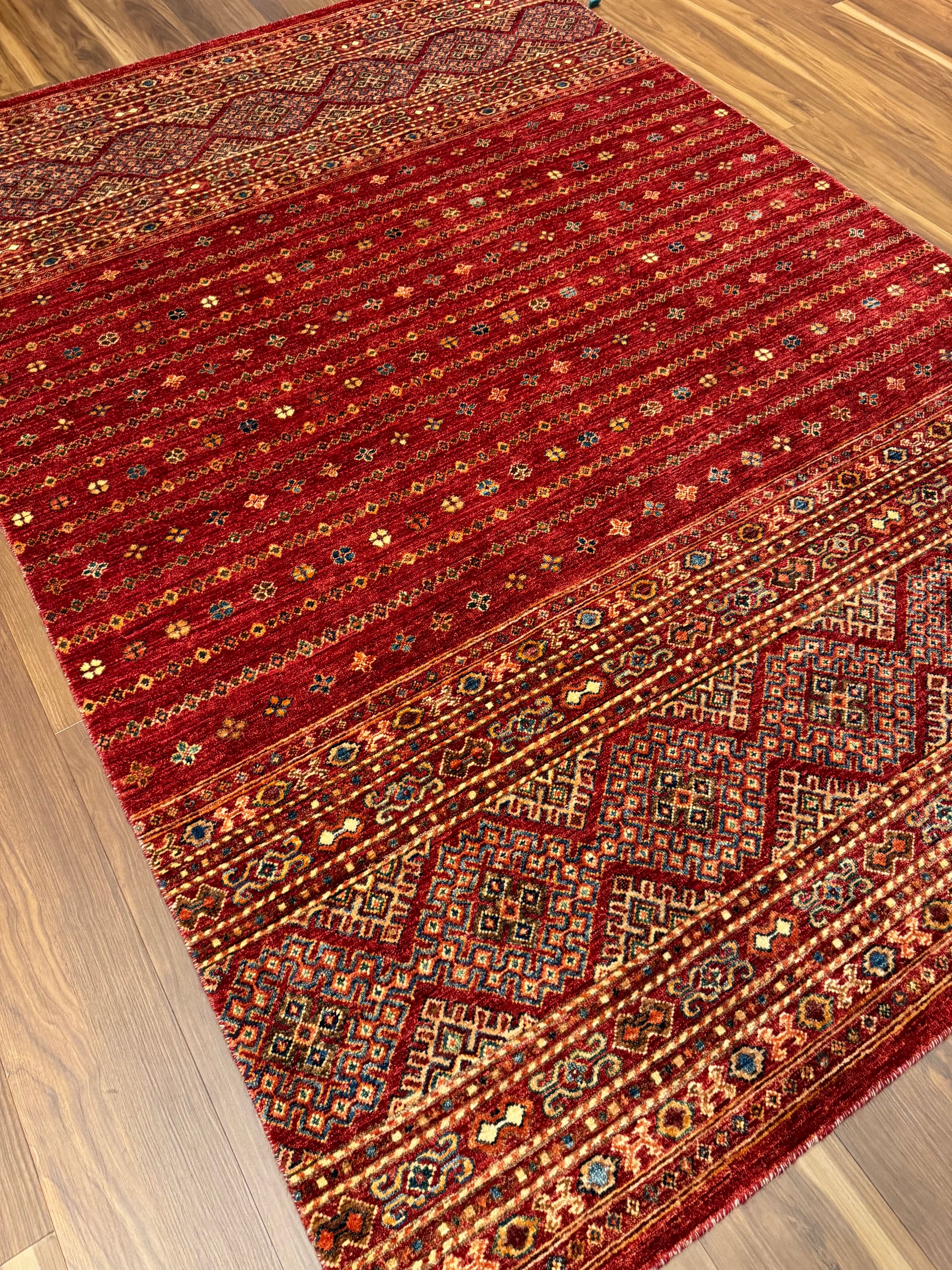 The Tribal Sal rug features a rich tapestry of vibrant red and deep indigo hues, adorned with intricate gold geometrical and diamond motifs. Expertly handwoven, this woolen piece embodies an essence of tribal artistry. It's a stunning representation of traditional craftsmanship, bringing warmth and cultural depth to any interior.