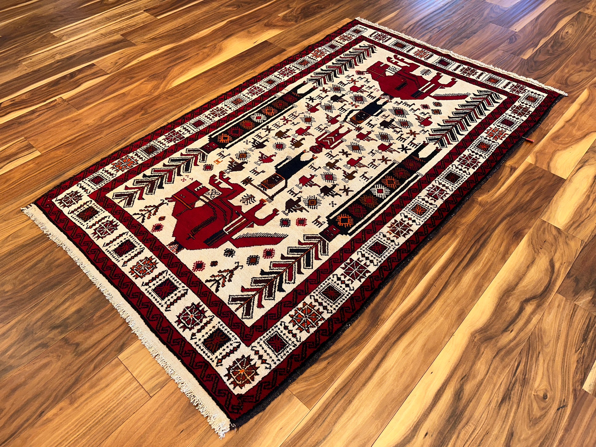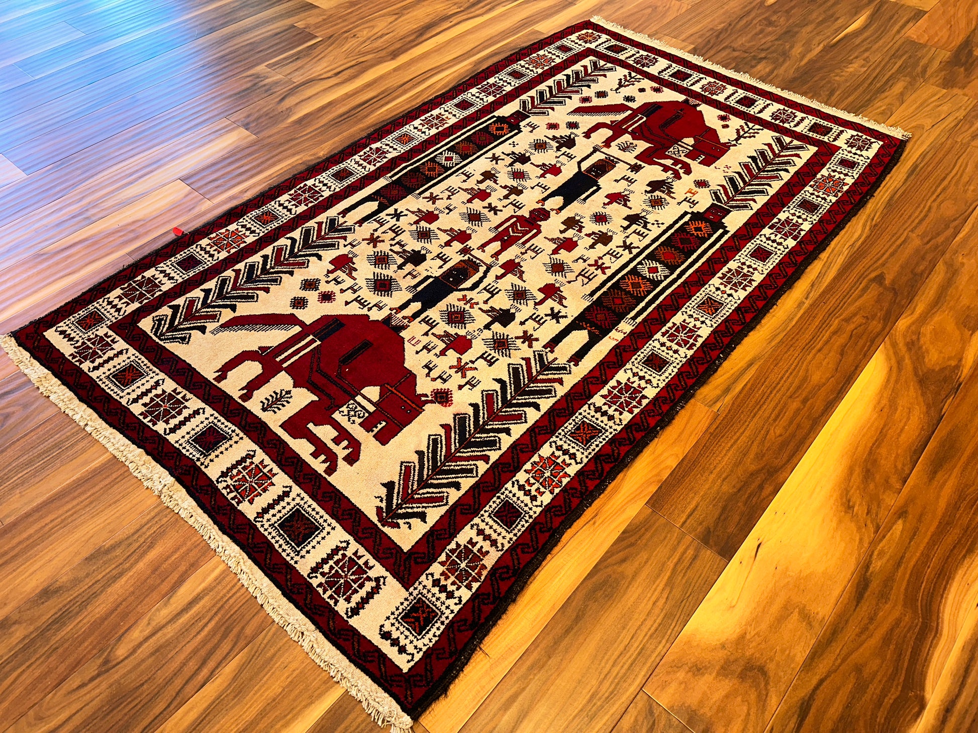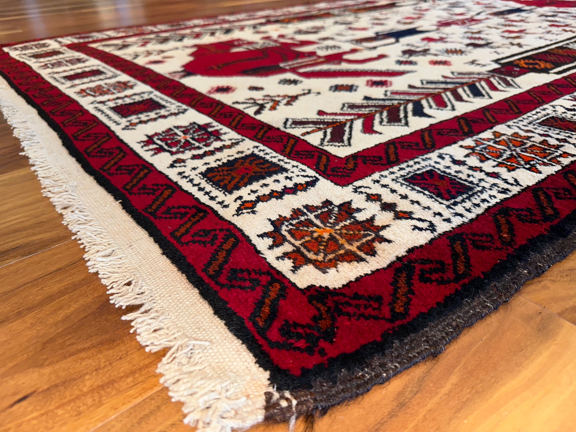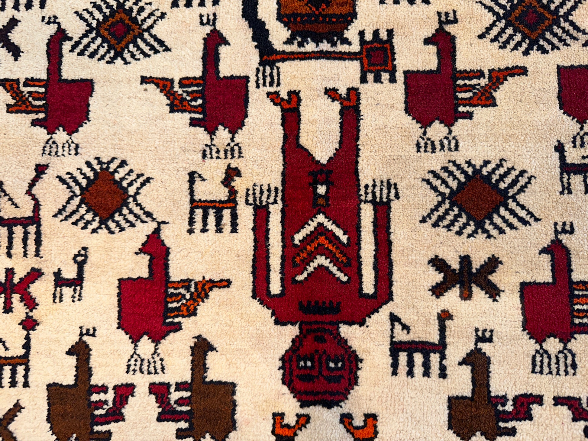 A striking example of narrative weaving, this handmade rug features bold pictorial motifs, including stylized animals, figures, and geometric patterns rendered in rich red, black, and earthy tones. Its expressive design evokes tribal storytelling traditions, making it both a functional textile and a visually engaging work of art.