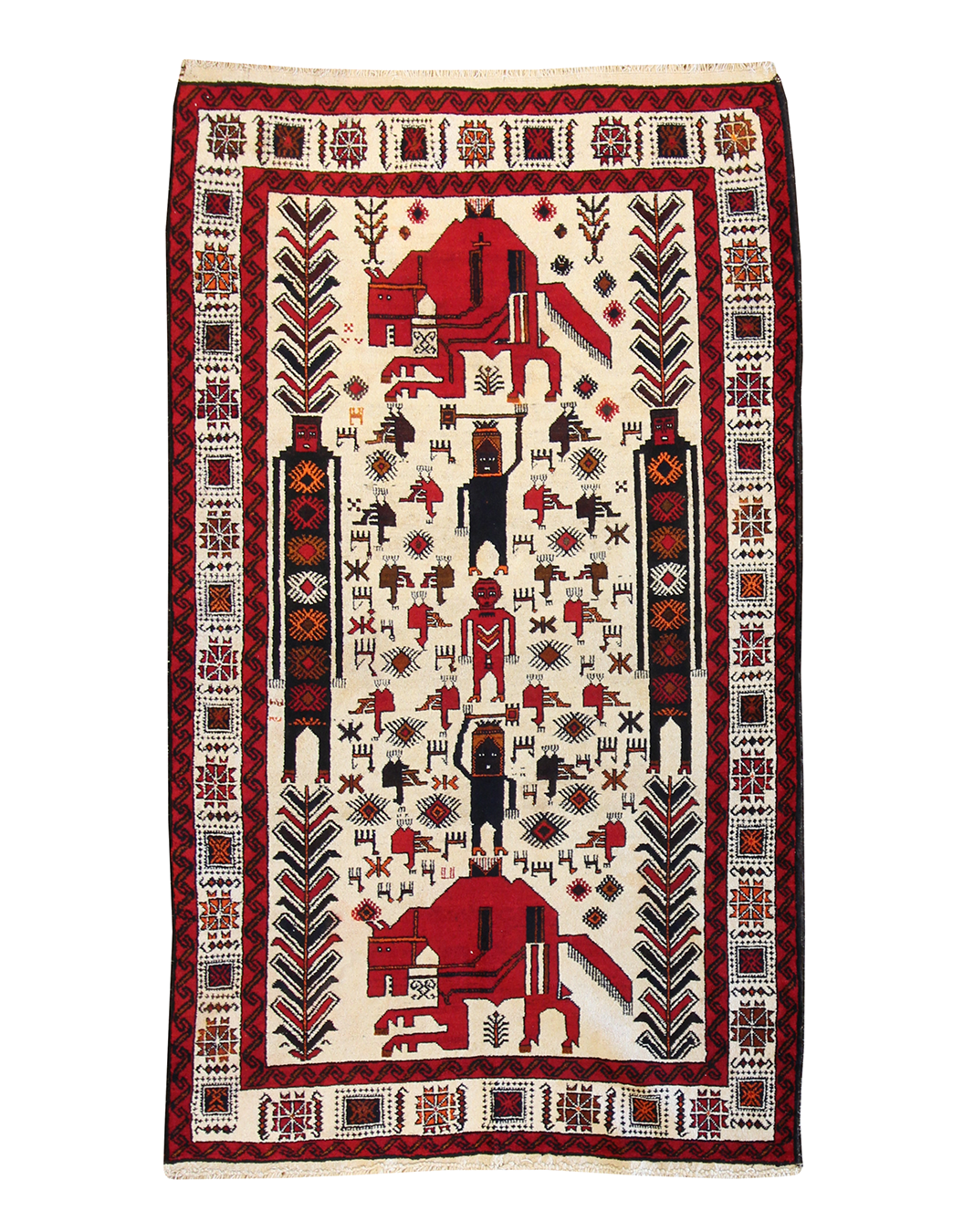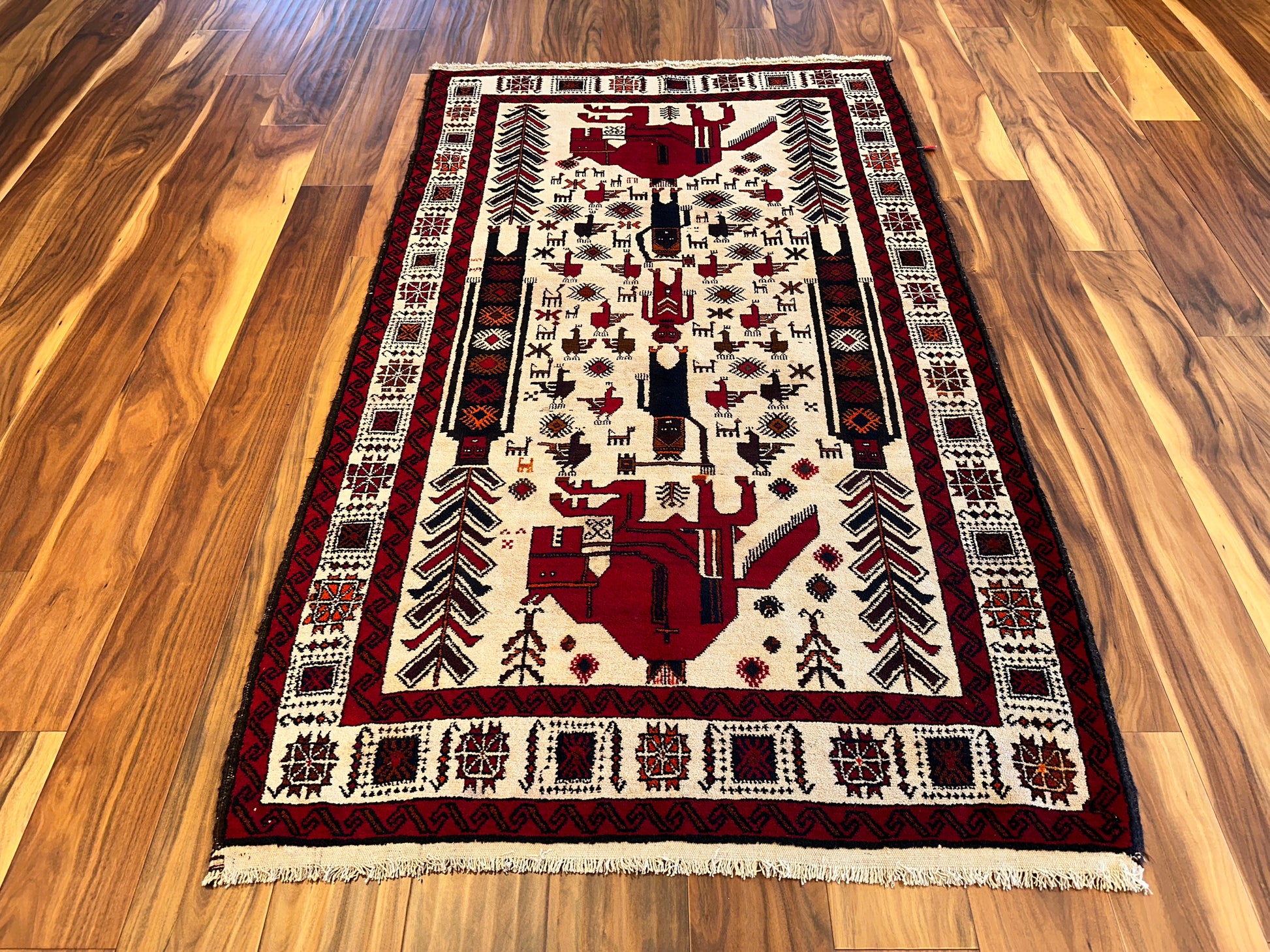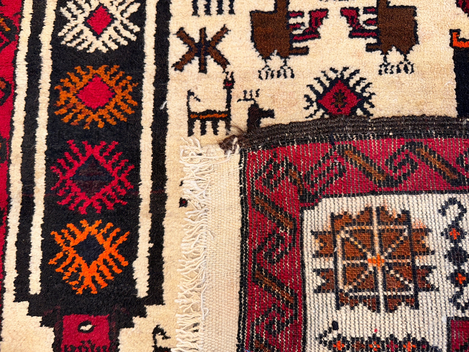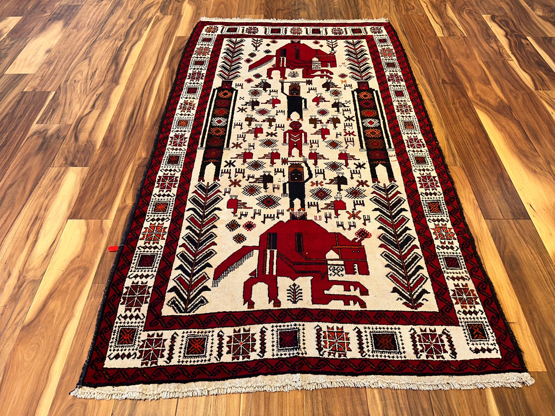 A striking example of narrative weaving, this handmade rug features bold pictorial motifs, including stylized animals, figures, and geometric patterns rendered in rich red, black, and earthy tones. Its expressive design evokes tribal storytelling traditions, making it both a functional textile and a visually engaging work of art.