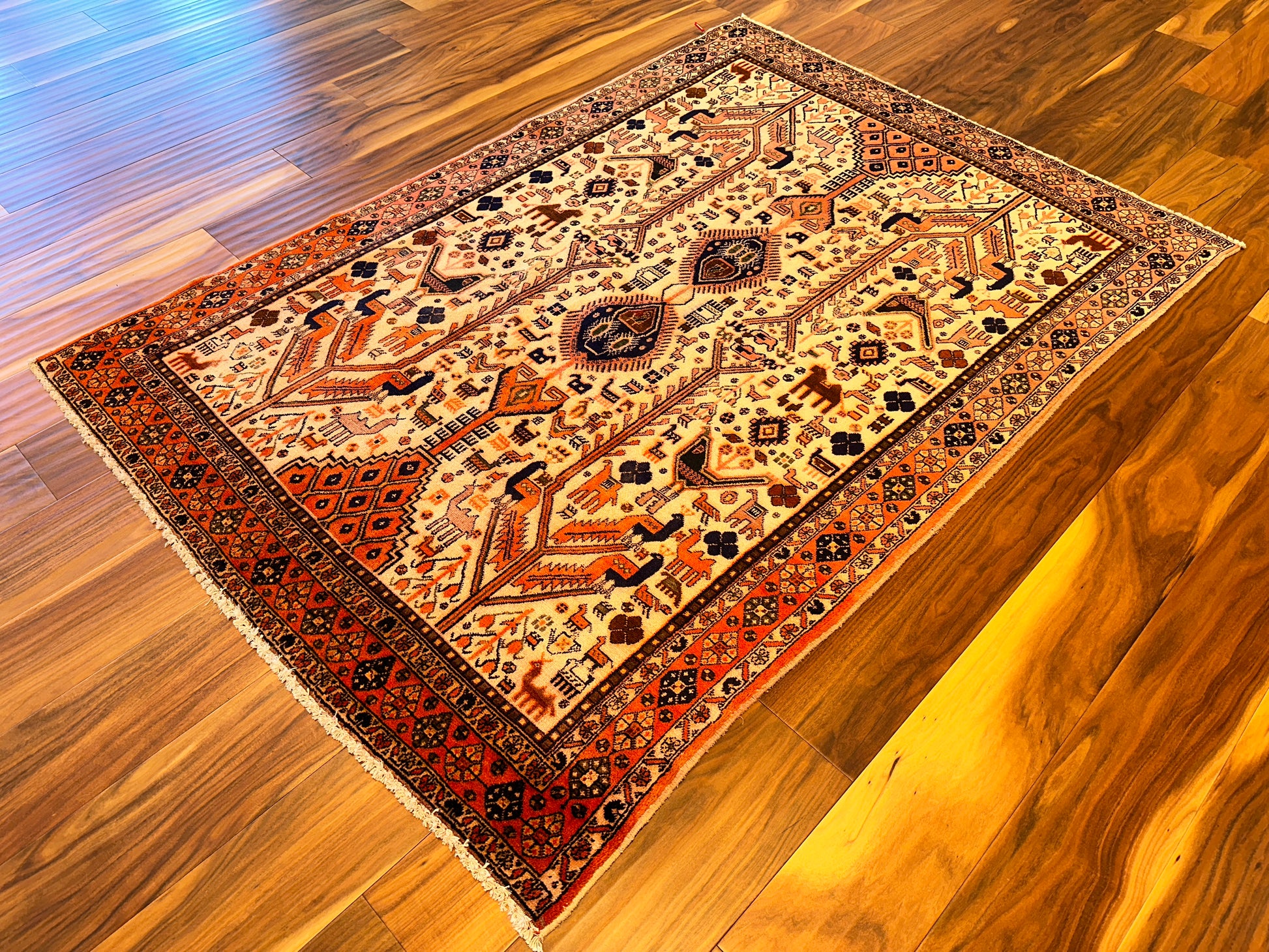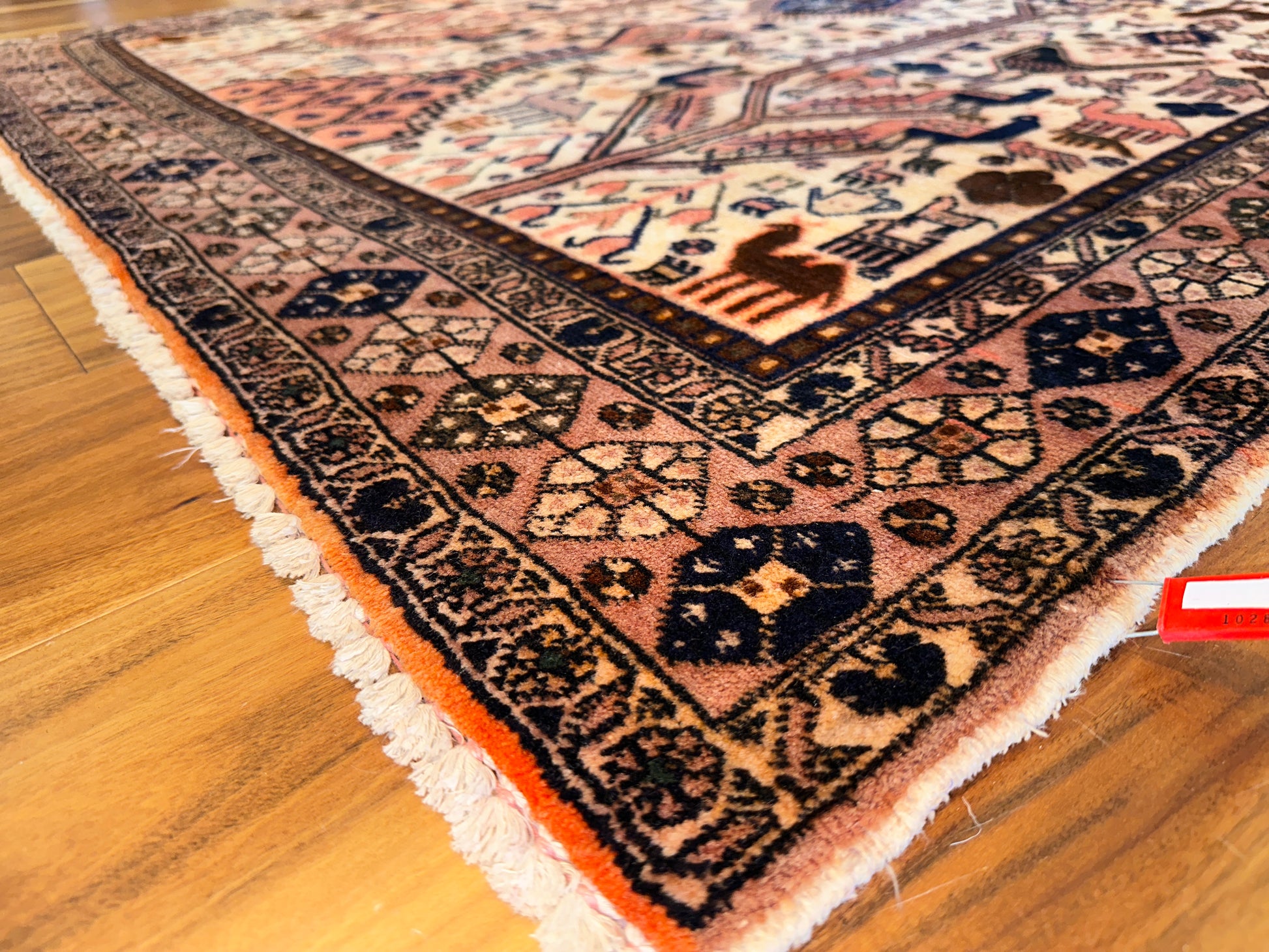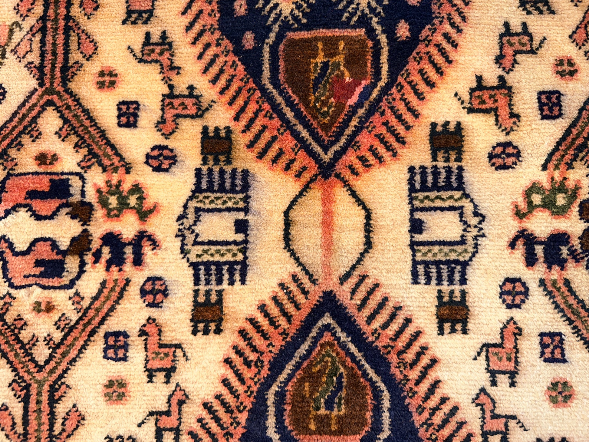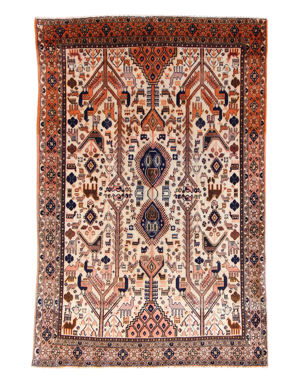 This striking handwoven rug displays a highly detailed tribal composition with stylized geometric medallions, tree-of-life motifs, and scattered animal figures throughout. Its rich palette of coral, navy, blush, and soft beige creates warmth and visual interest, while the symmetrical layout lends a grounded, harmonious feel. The intricate motifs and symbolic patterns echo Persian tribal artistry, making this a captivating focal point in any room.