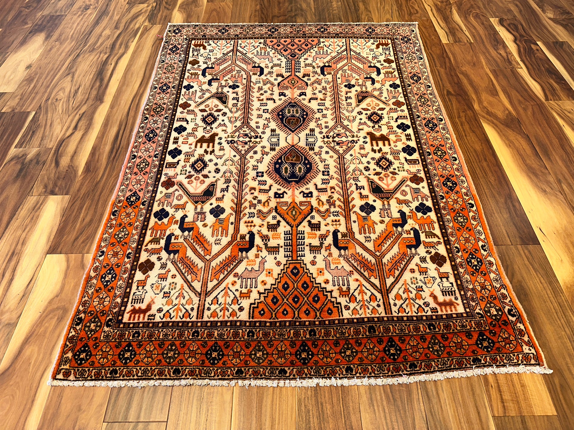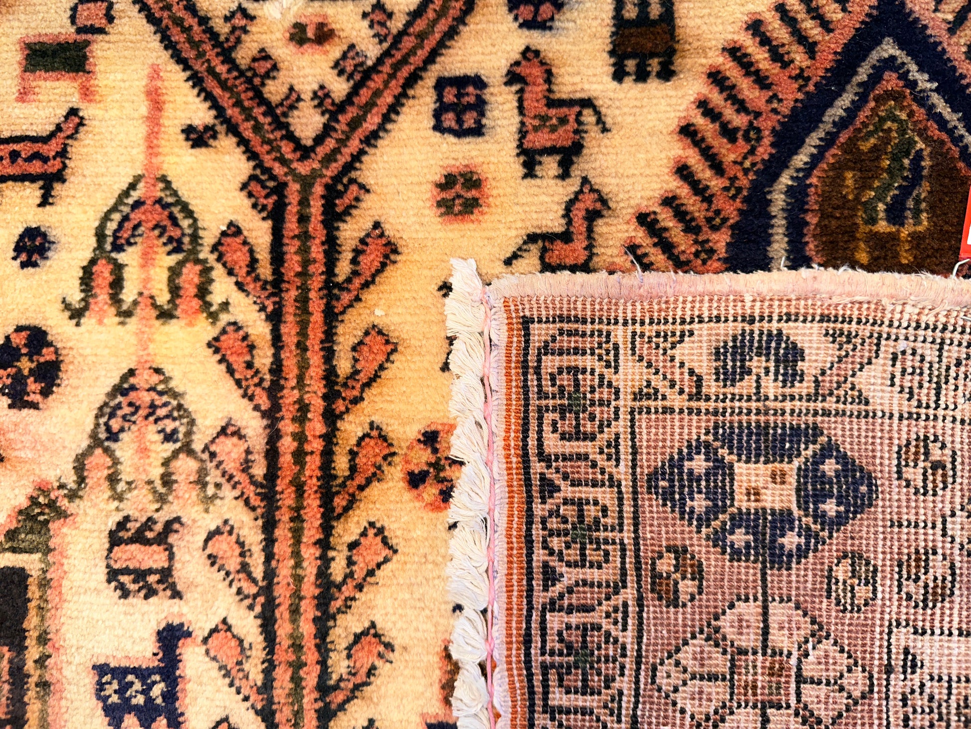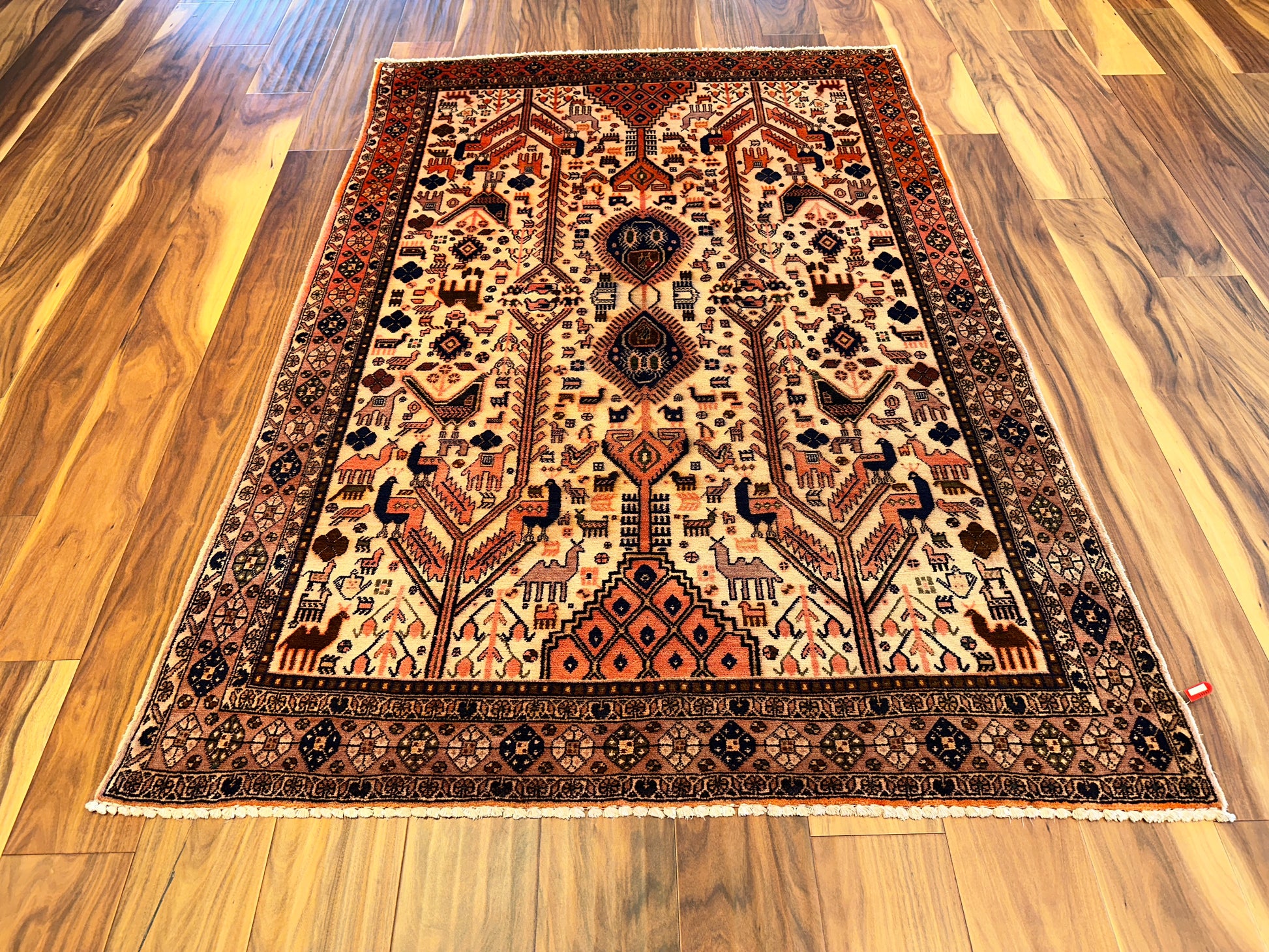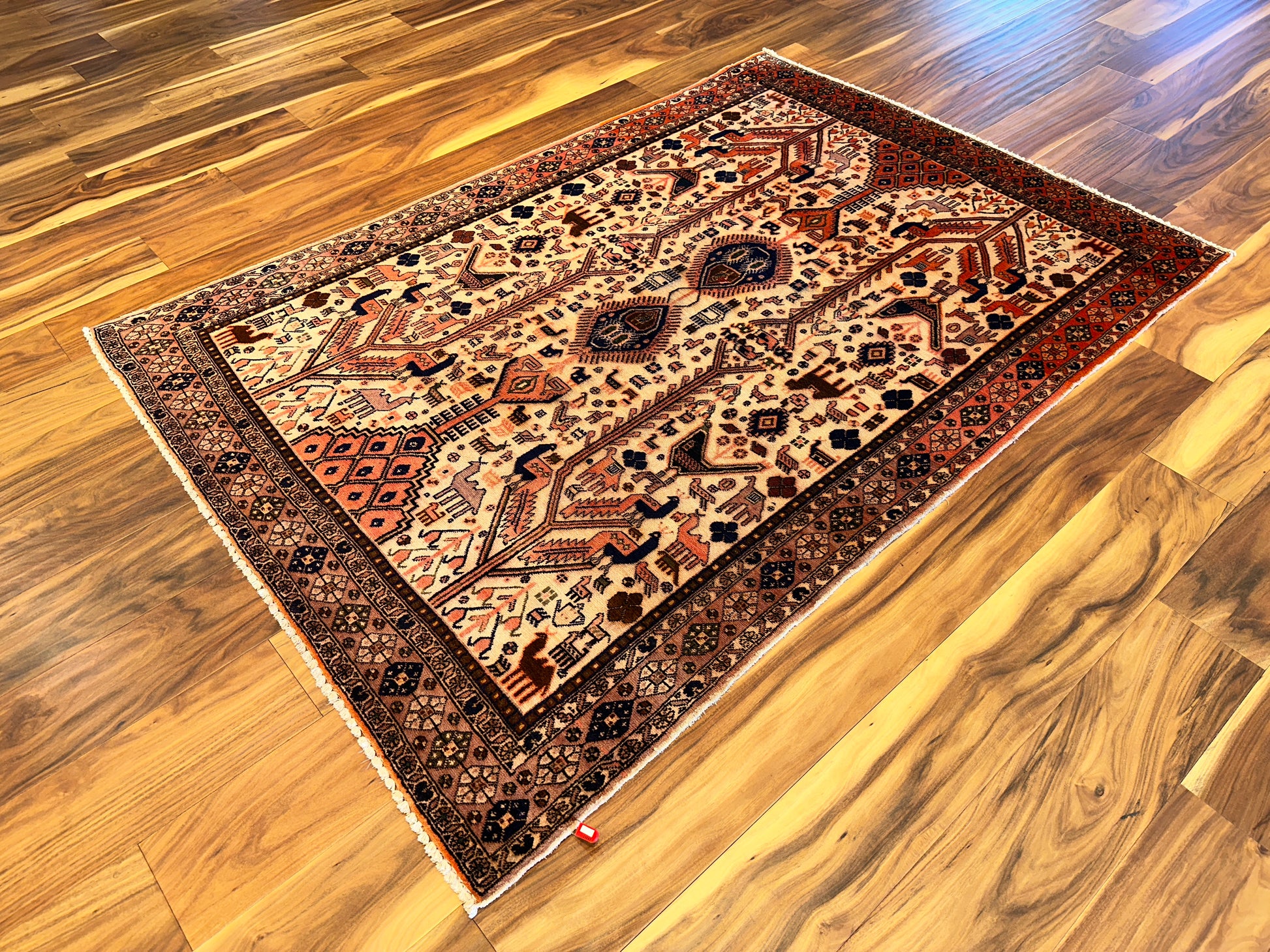 This striking handwoven rug displays a highly detailed tribal composition with stylized geometric medallions, tree-of-life motifs, and scattered animal figures throughout. Its rich palette of coral, navy, blush, and soft beige creates warmth and visual interest, while the symmetrical layout lends a grounded, harmonious feel. The intricate motifs and symbolic patterns echo Persian tribal artistry, making this a captivating focal point in any room.