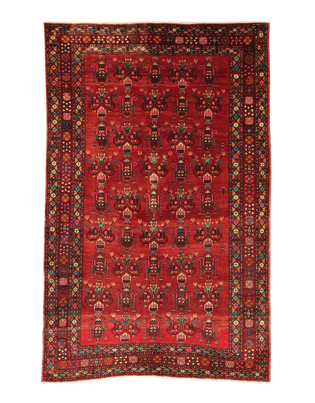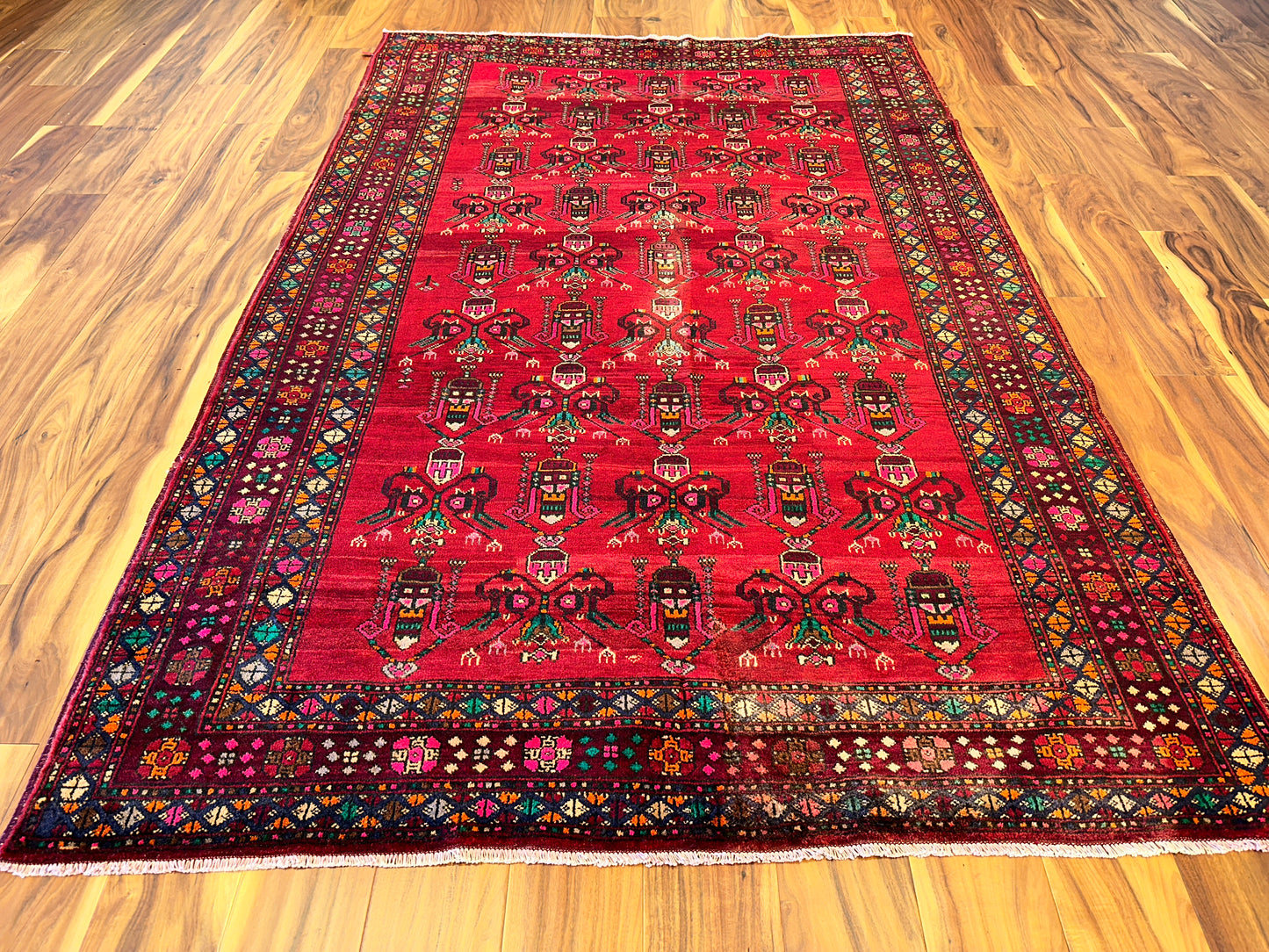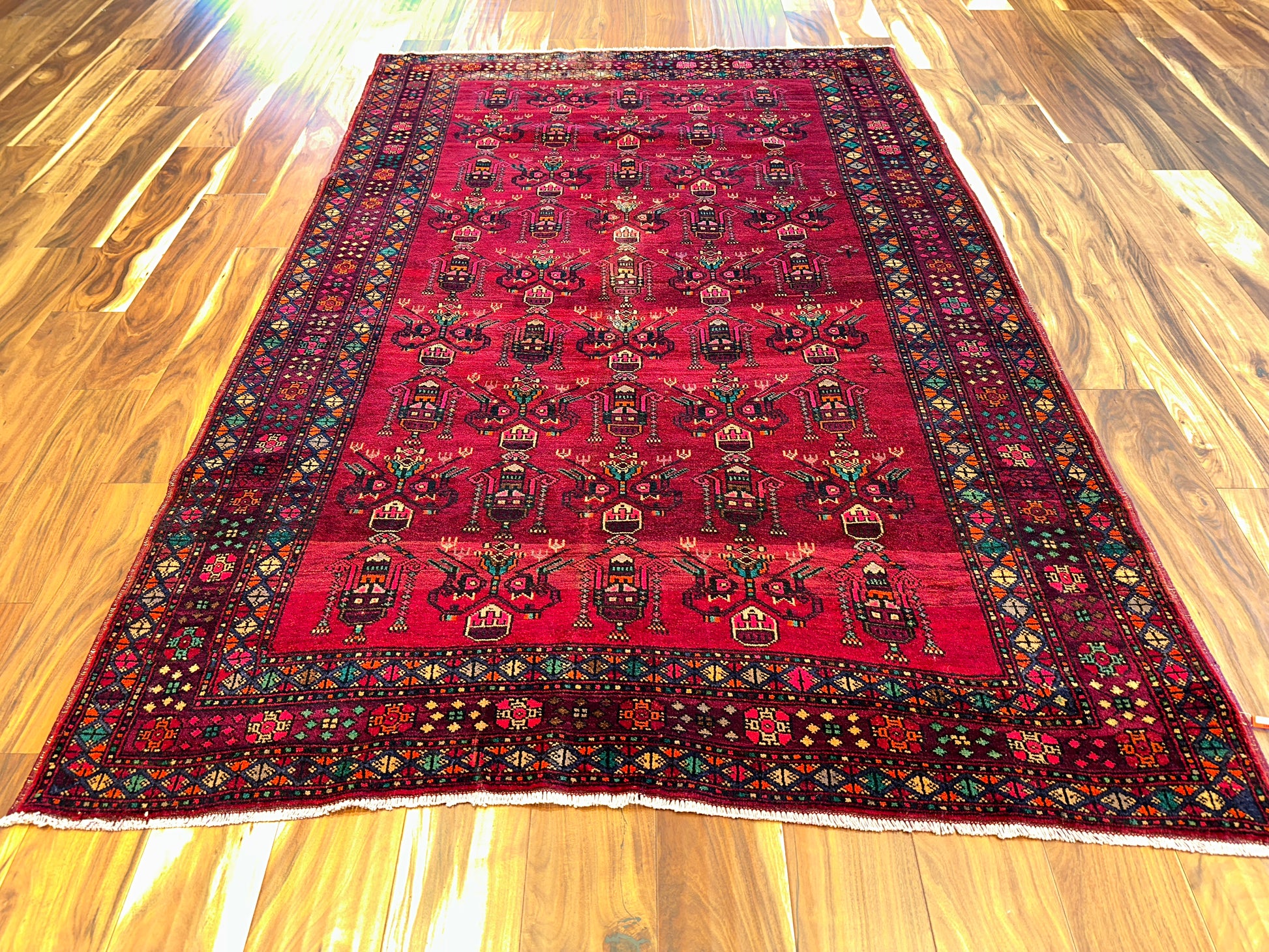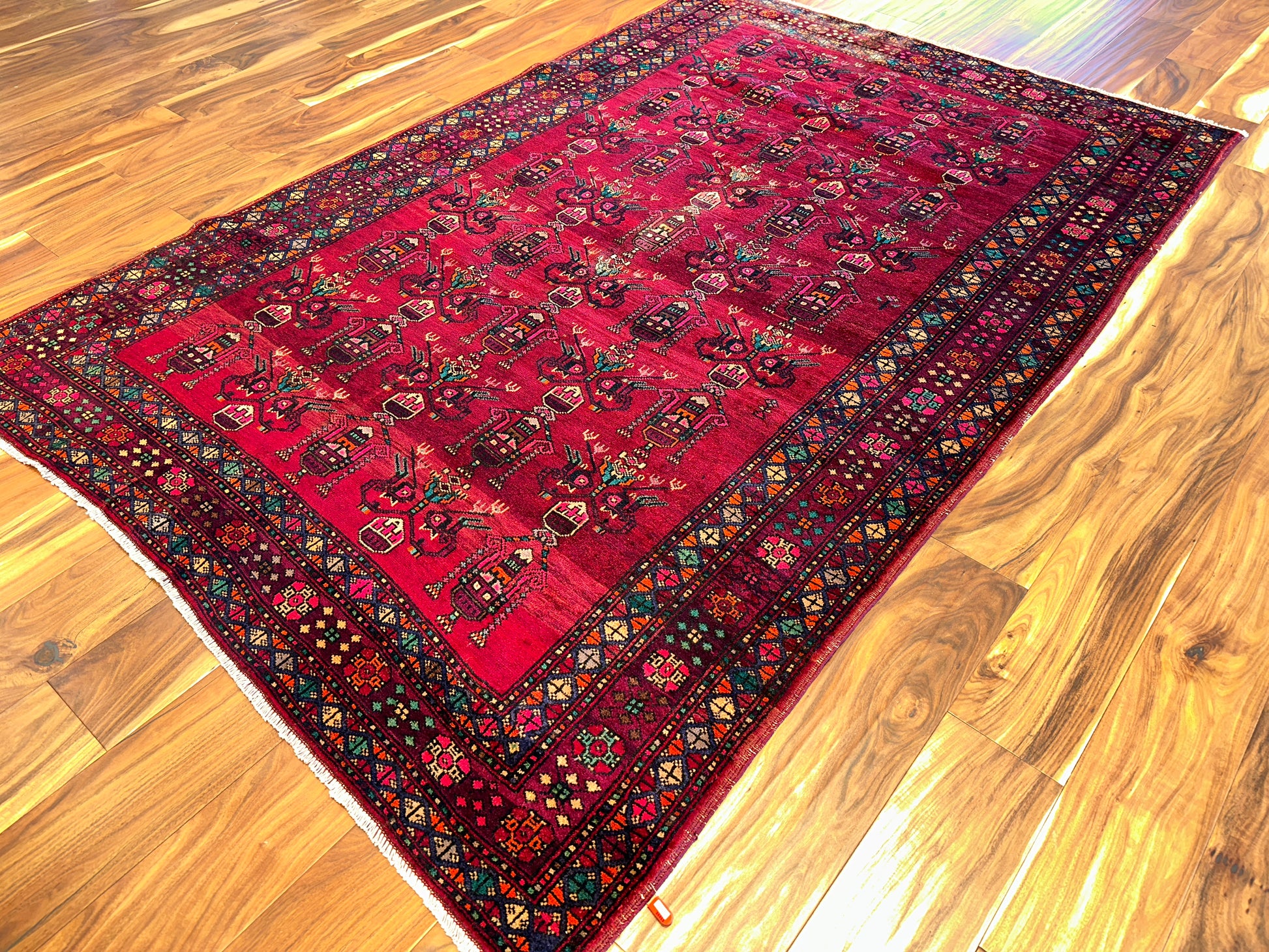 Vivid and full of character, this hand-knotted rug features a dynamic arrangement of tribal guls and totemic motifs across a deep red field. Rich tones of navy, beige, turquoise, and deep pink animate the pattern, while the layered geometric borders enhance its folkloric charm. A bold and expressive piece rooted in traditional craftsmanship.
