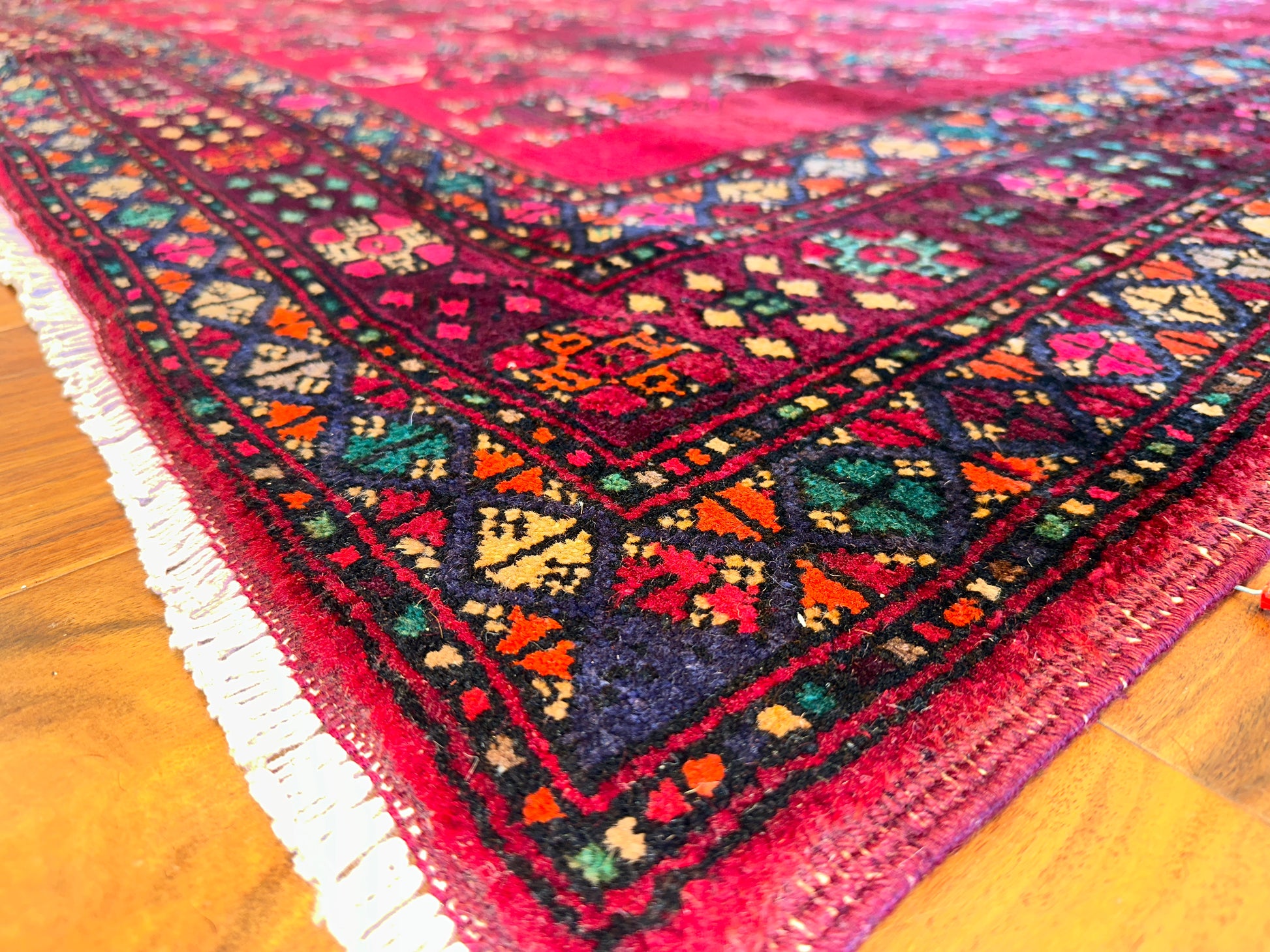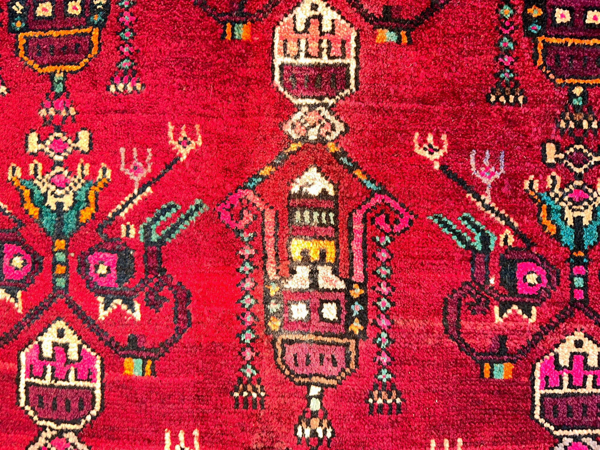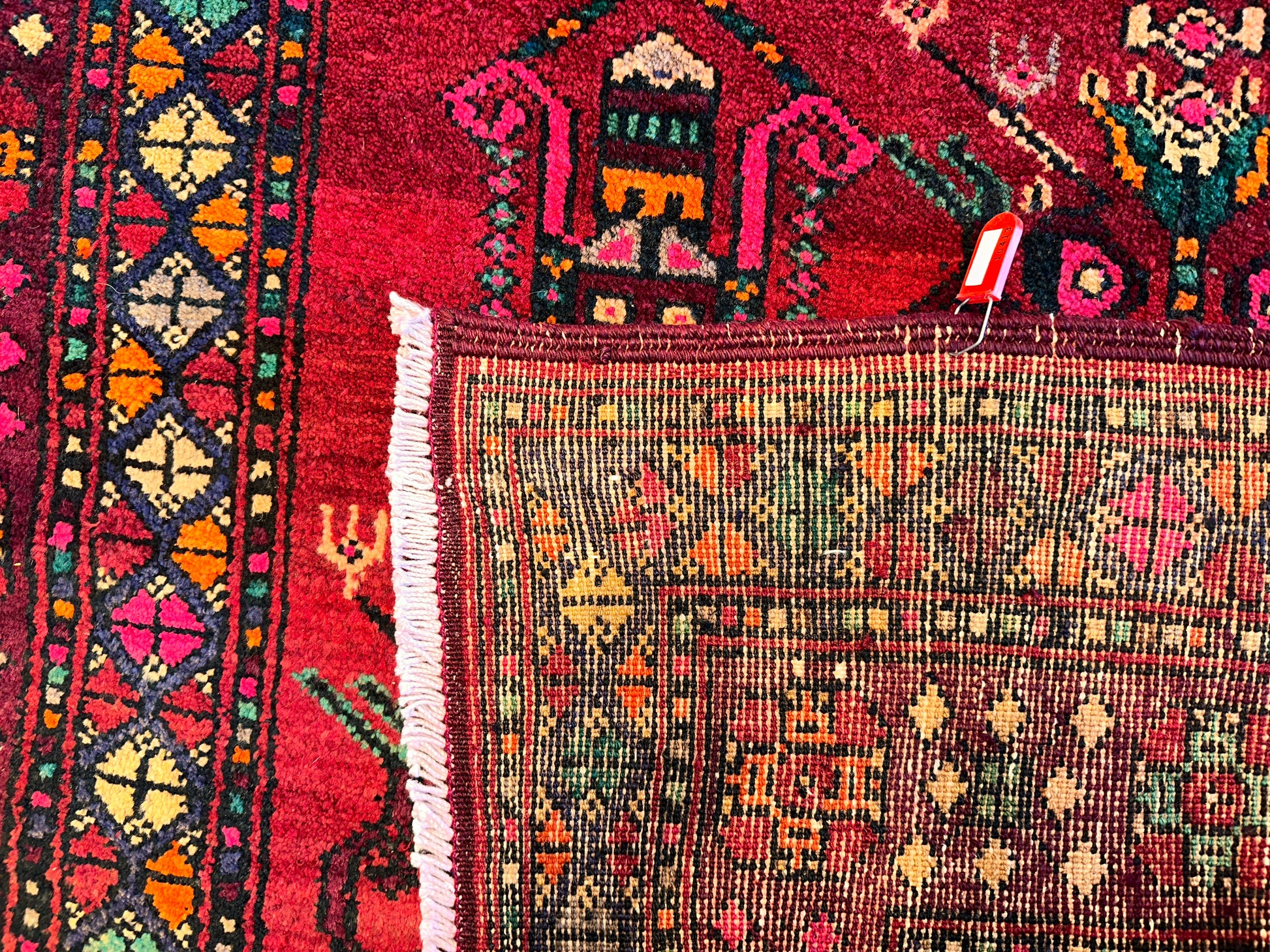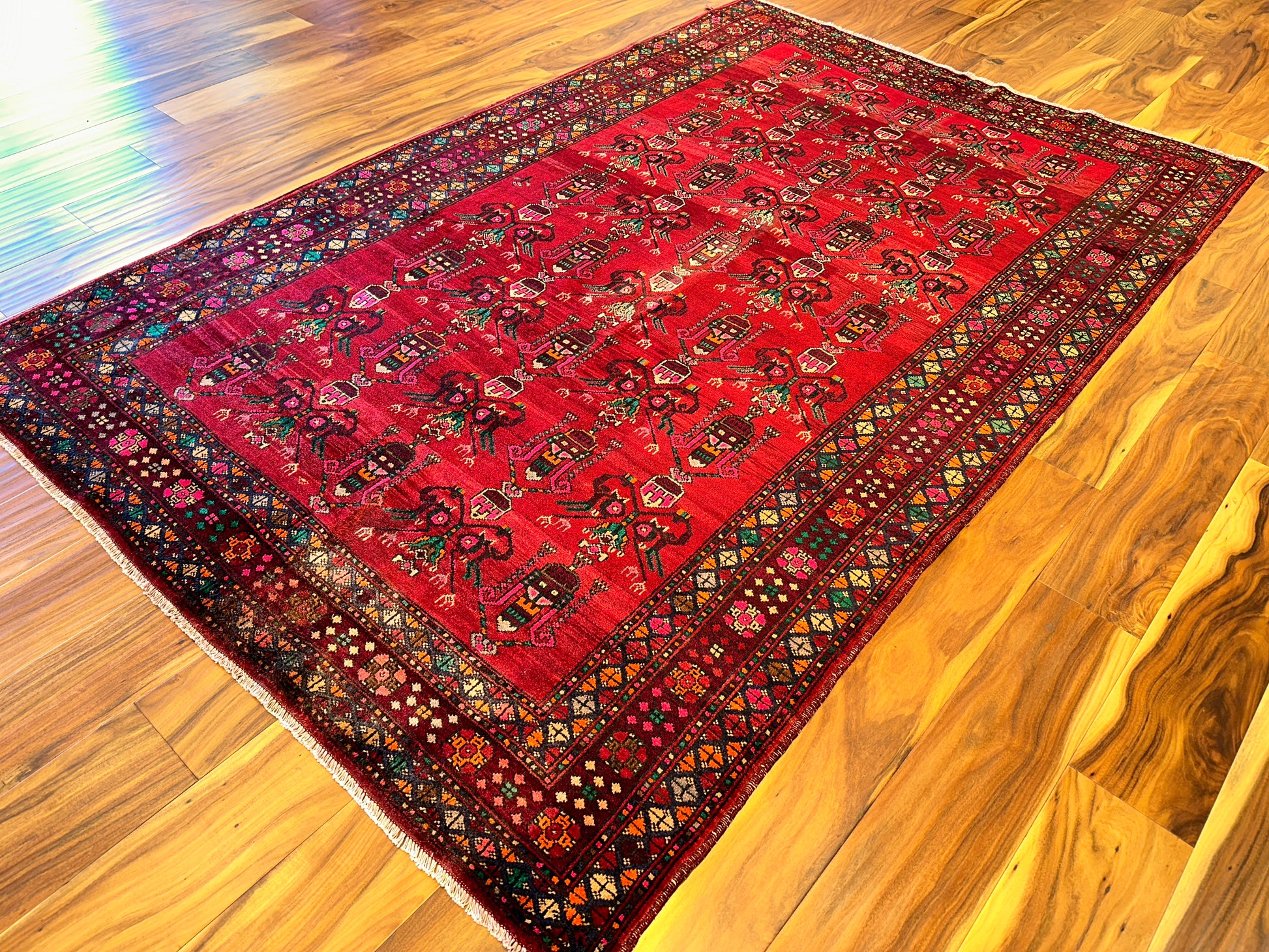 Vivid and full of character, this hand-knotted rug features a dynamic arrangement of tribal guls and totemic motifs across a deep red field. Rich tones of navy, beige, turquoise, and deep pink animate the pattern, while the layered geometric borders enhance its folkloric charm. A bold and expressive piece rooted in traditional craftsmanship.