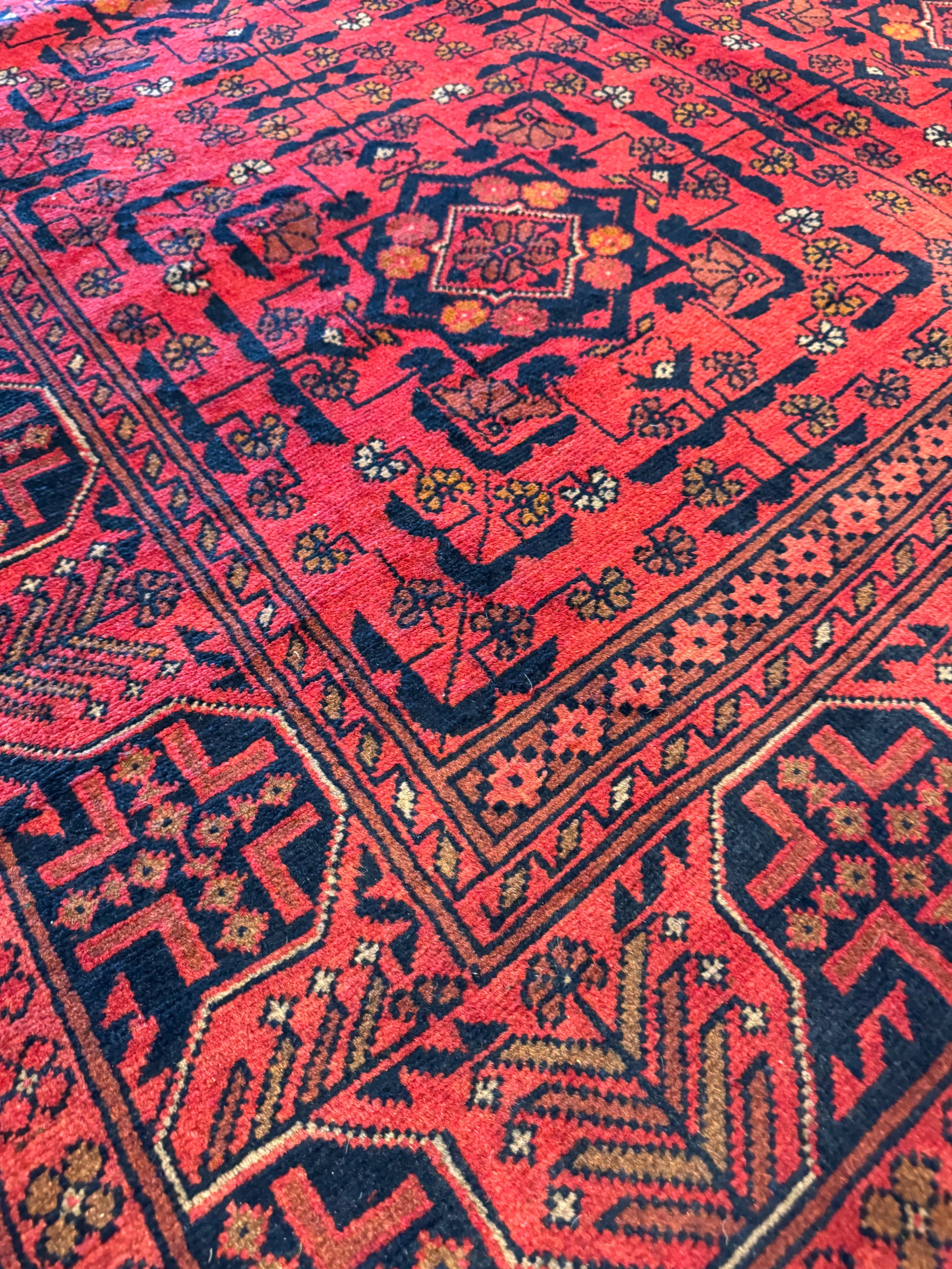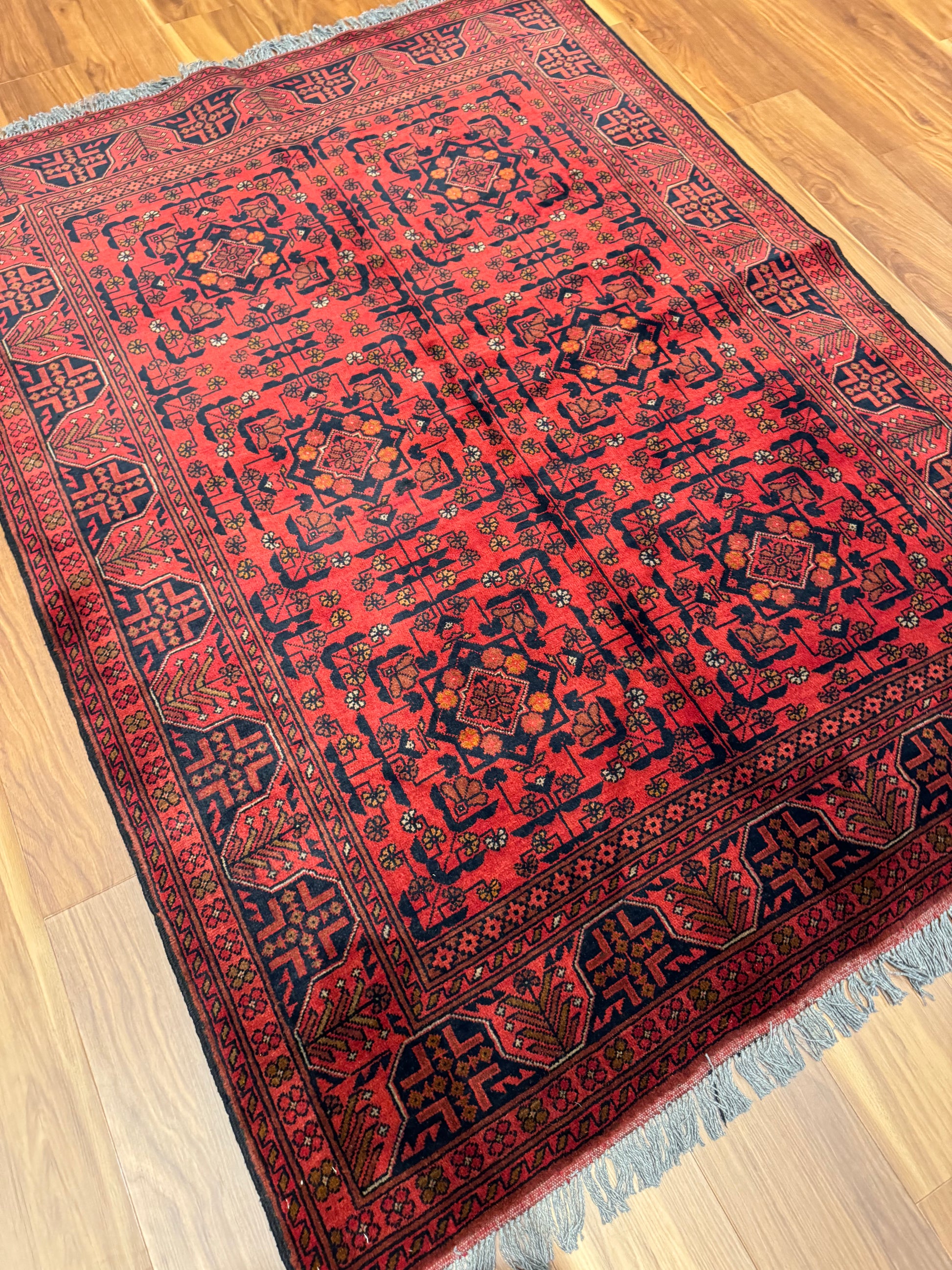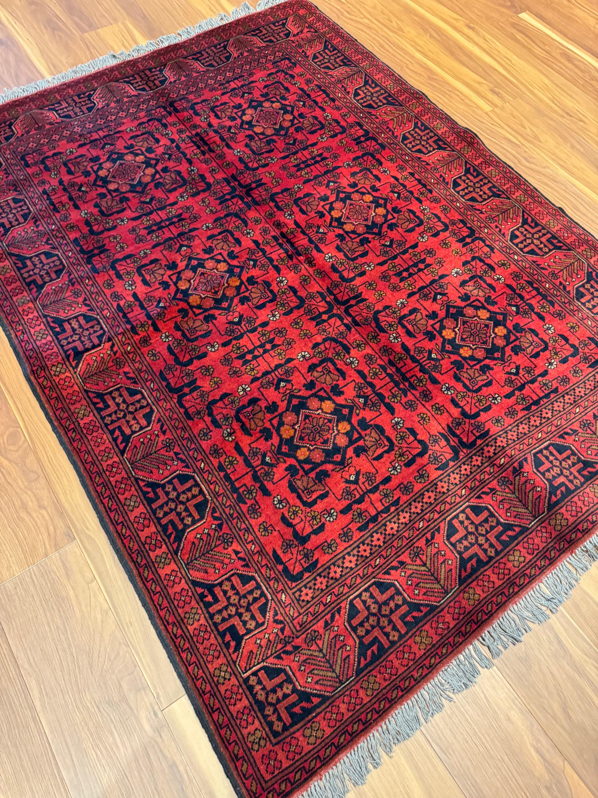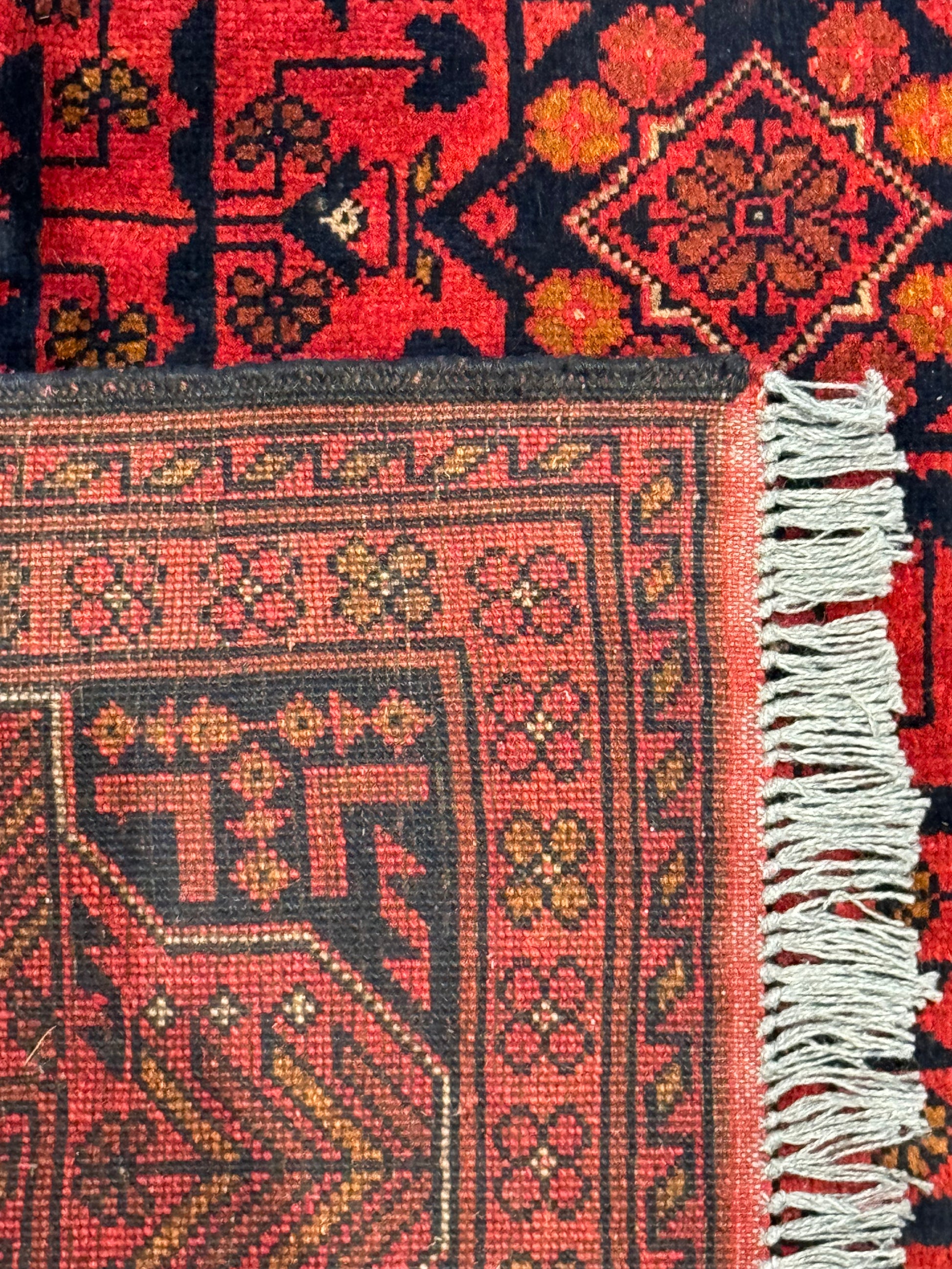 This exquisite Turkmen Bukhara rug is a testament to the masterful weaving traditions of Turkmen artisans. Made of the finest wool, it features a deep red field and borders with intricate repeating geometric patterns and motifs in shades of burgundy, black, and navy. Each individual element is precisely placed to create a harmonious design synonymous with Bukhara rugs. This piece not only adds warmth and texture to a room but also carries the rich heritage of Turkmen culture.