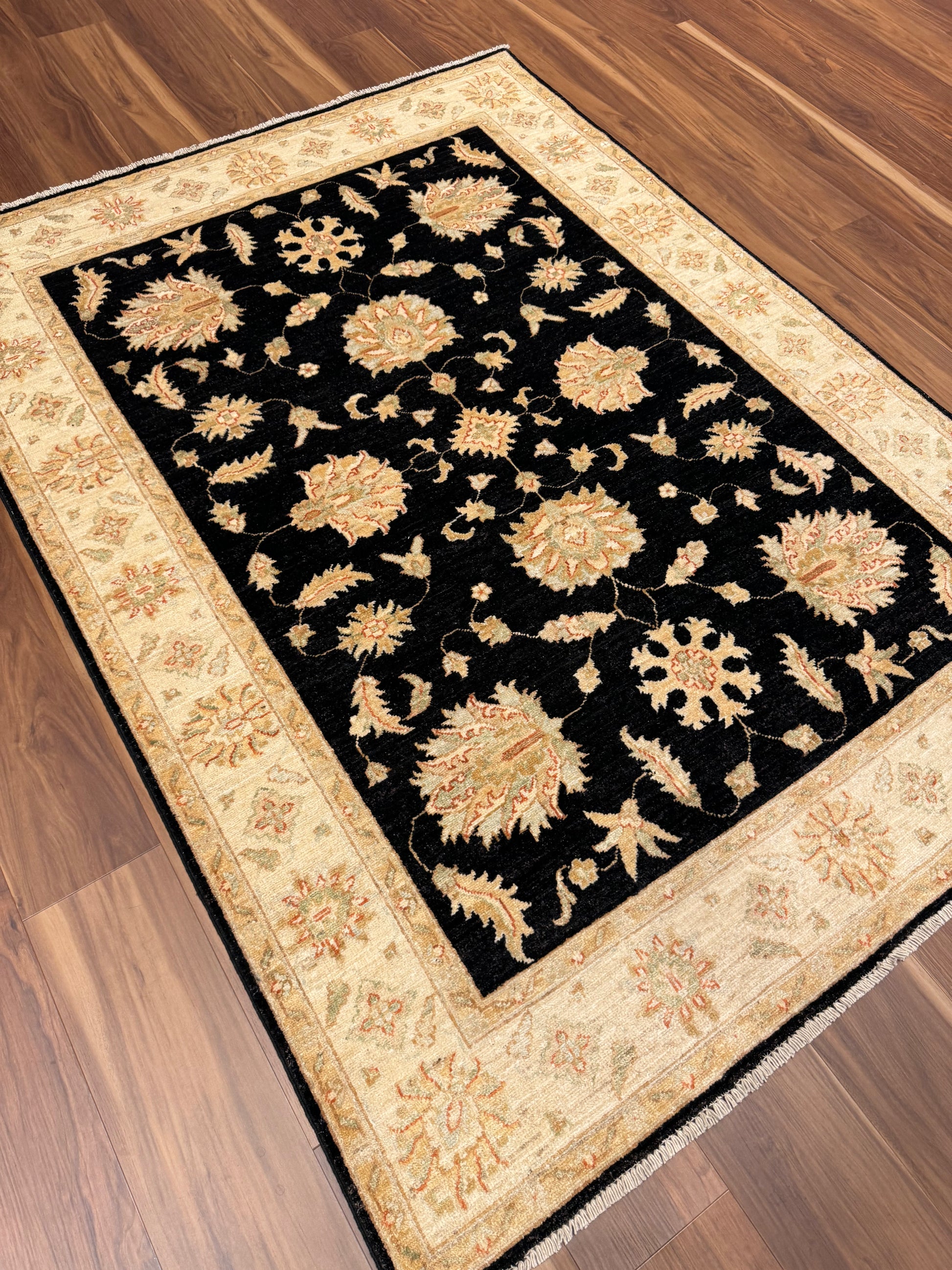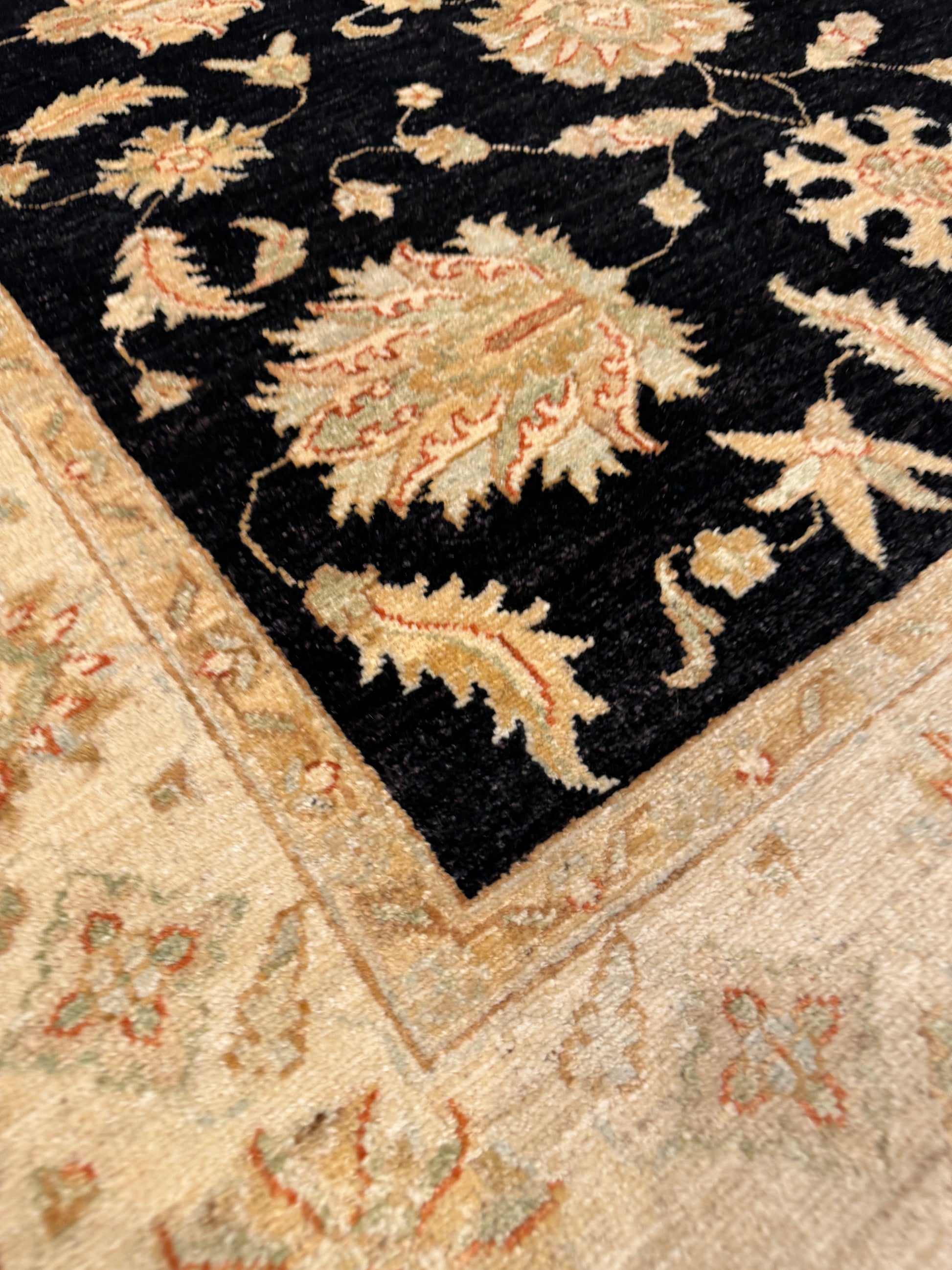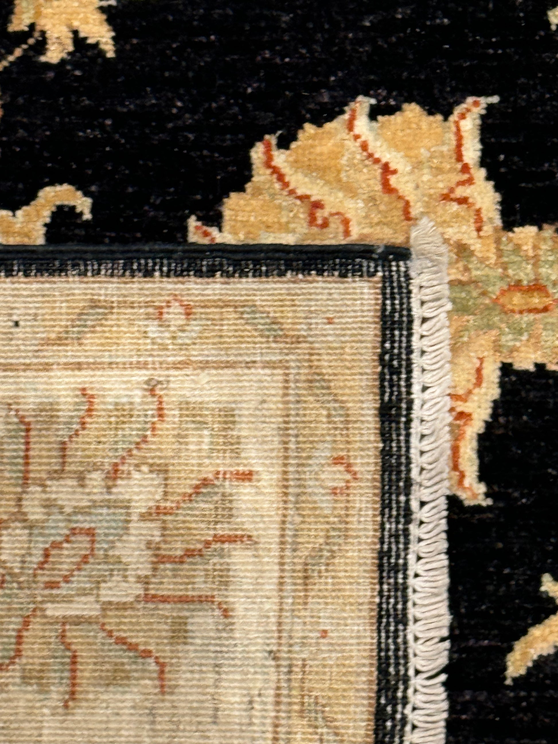 The Usak rug features a sophisticated design with rich black field and exquisite beige and gold palette that constitutes its intricate floral motifs. Woven from the finest wool, it presents a plush surface complemented by a harmonious border that echoes its central theme. This piece reflects the timeless elegance of the historic Usak rugs prized for their masterful craftsmanship and enduring appeal suitable for both contemporary and traditional interiors.