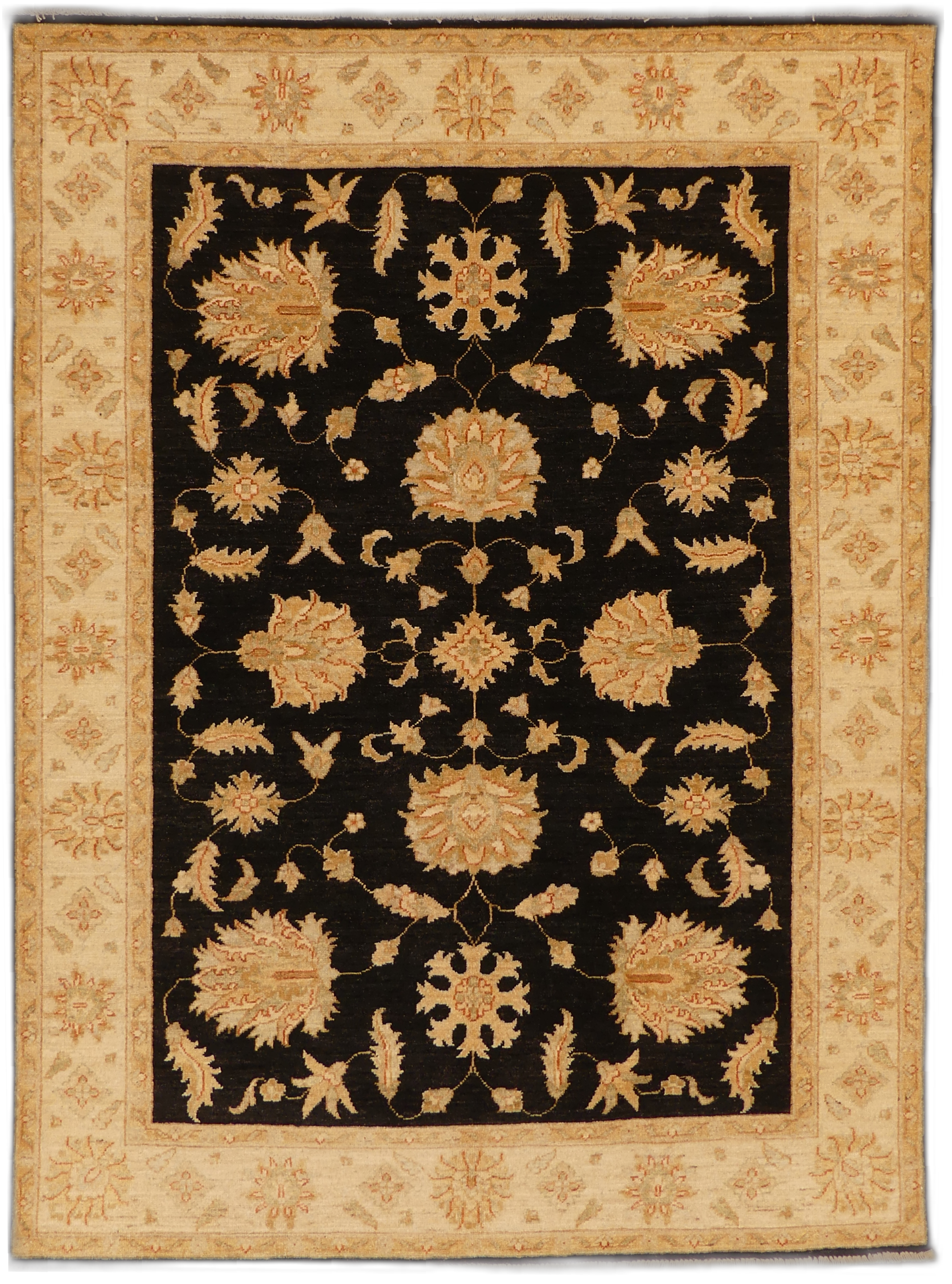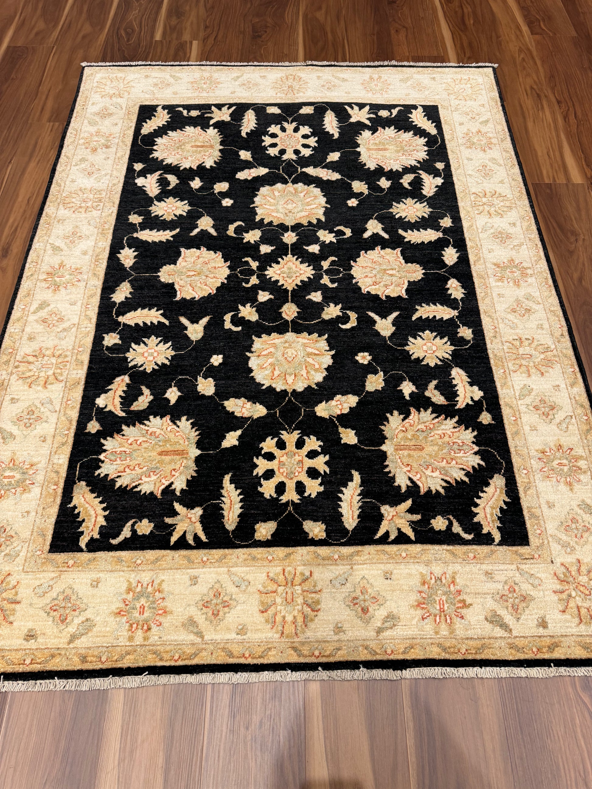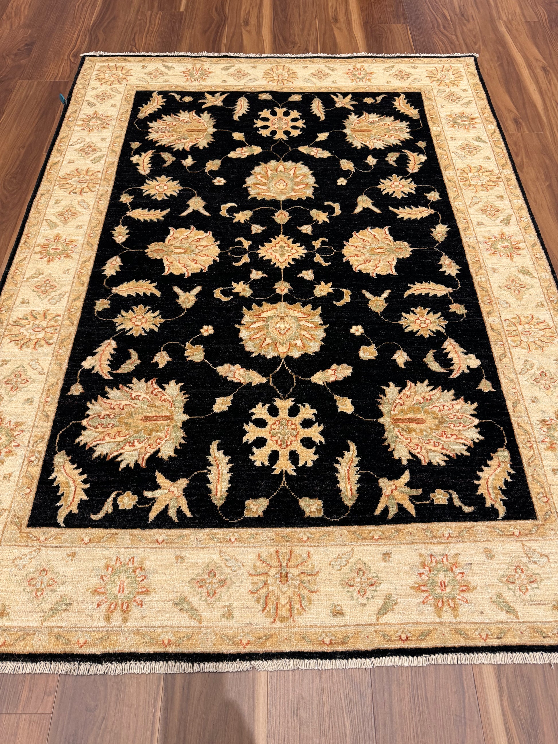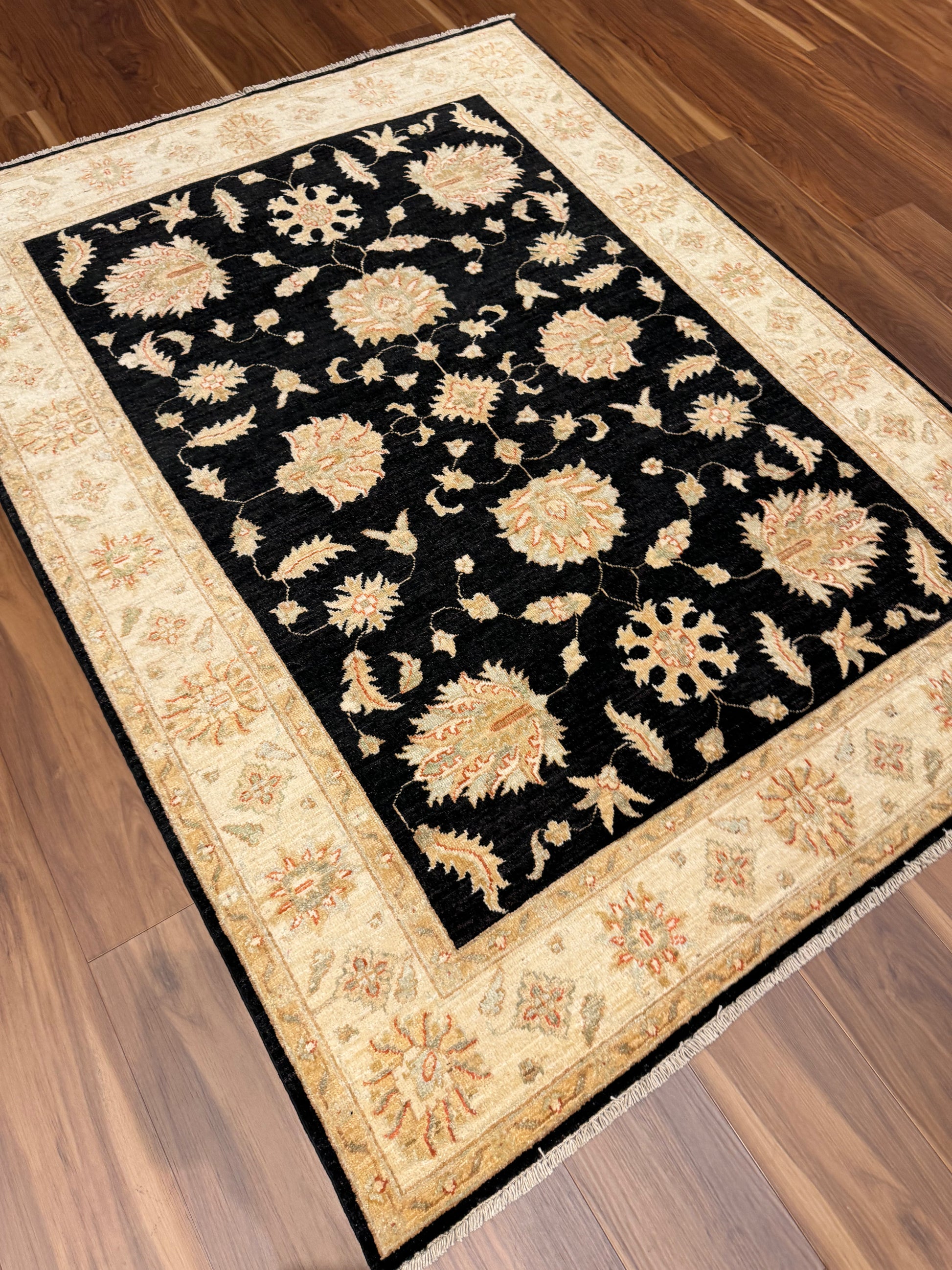 The Usak rug features a sophisticated design with rich black field and exquisite beige and gold palette that constitutes its intricate floral motifs. Woven from the finest wool, it presents a plush surface complemented by a harmonious border that echoes its central theme. This piece reflects the timeless elegance of the historic Usak rugs prized for their masterful craftsmanship and enduring appeal suitable for both contemporary and traditional interiors.
