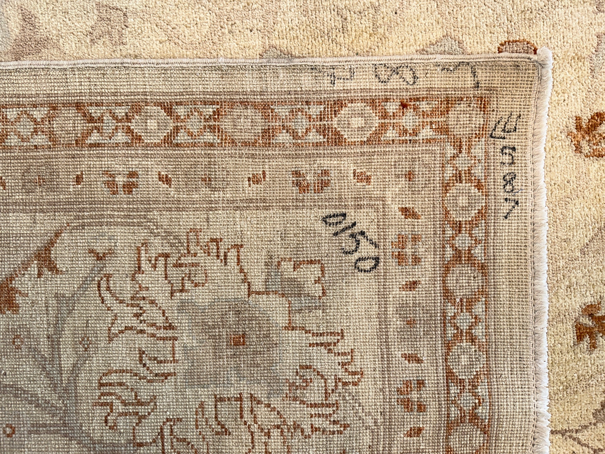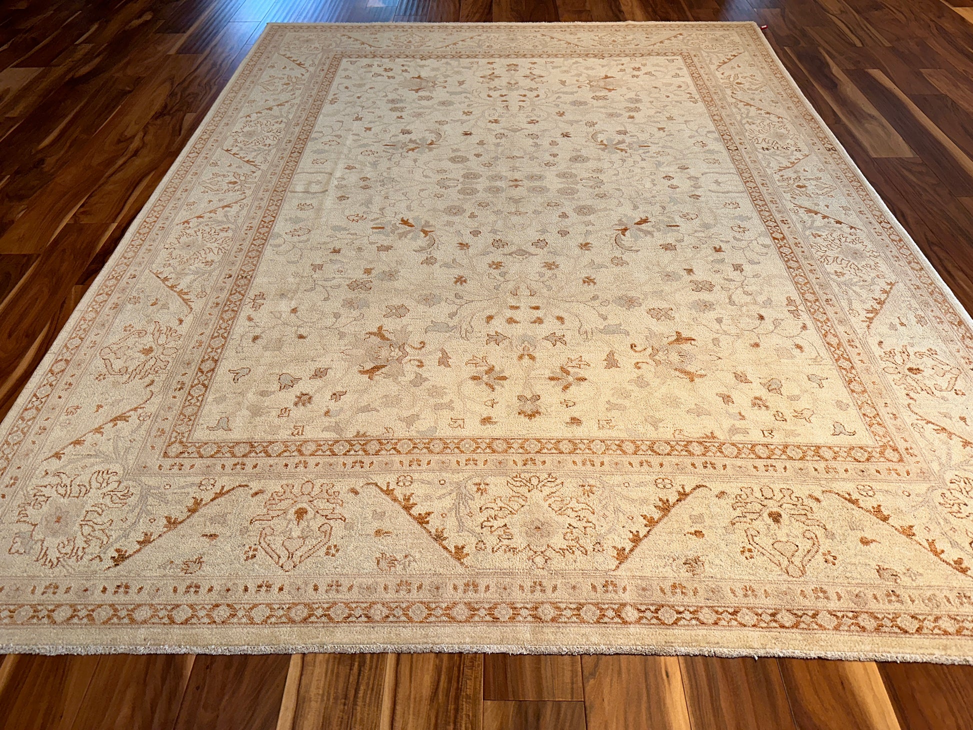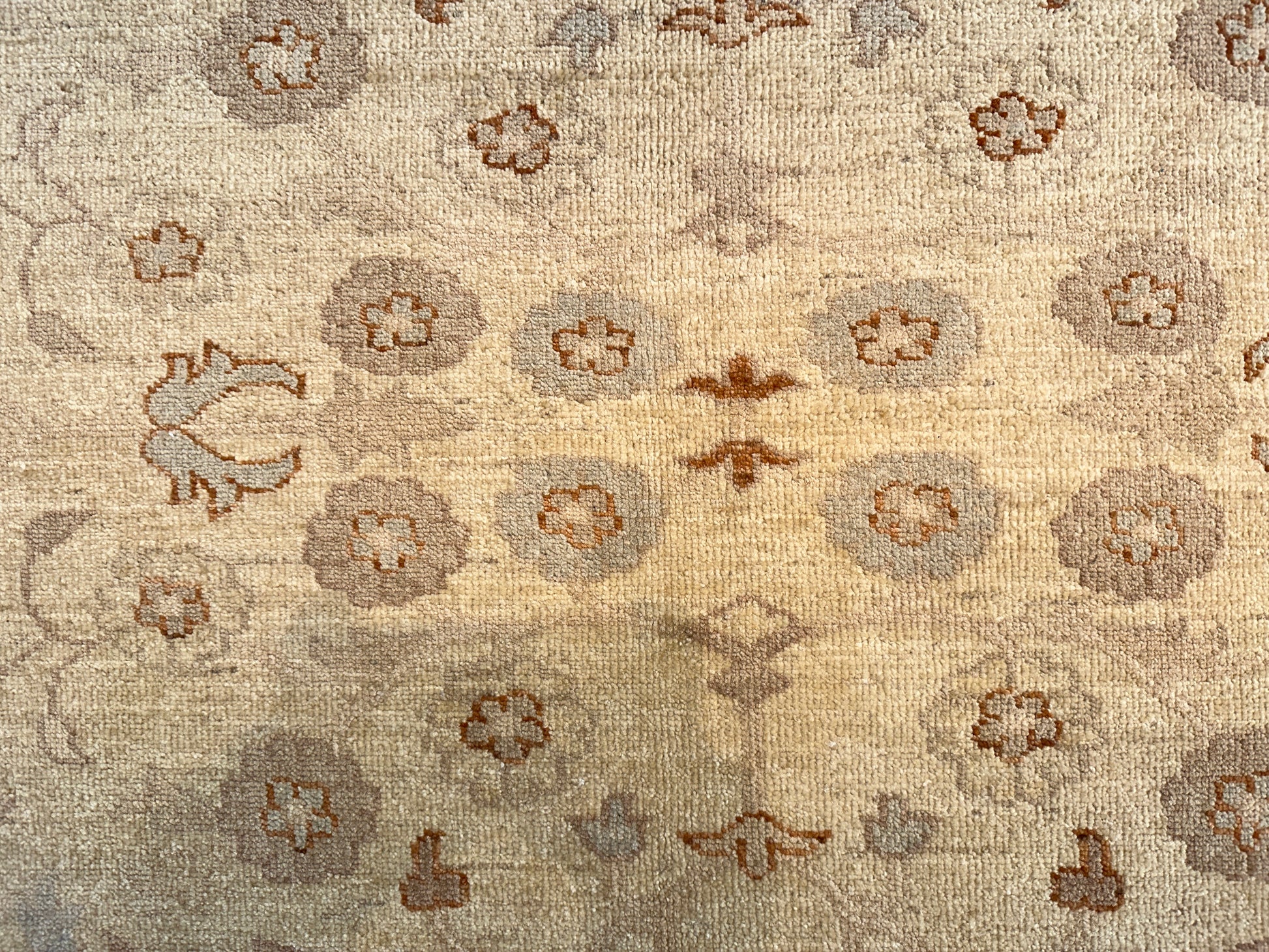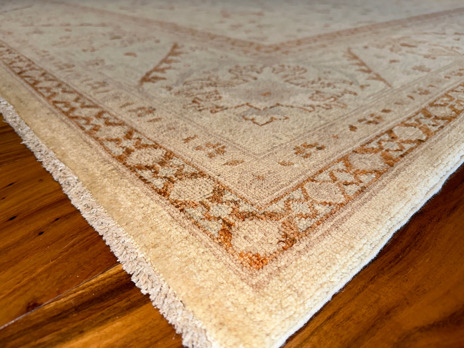A luminous, tone-on-tone piece with quiet elegance, this handwoven rug offers a soft take on classic Oushak motifs. Muted florals and stylized vines emerge subtly from a warm beige ground, outlined in light rust with fine abrash lending a sense of age and refinement. Its understated pattern and harmonious palette create an easy backdrop for layered interiors with neutral or natural finishes.