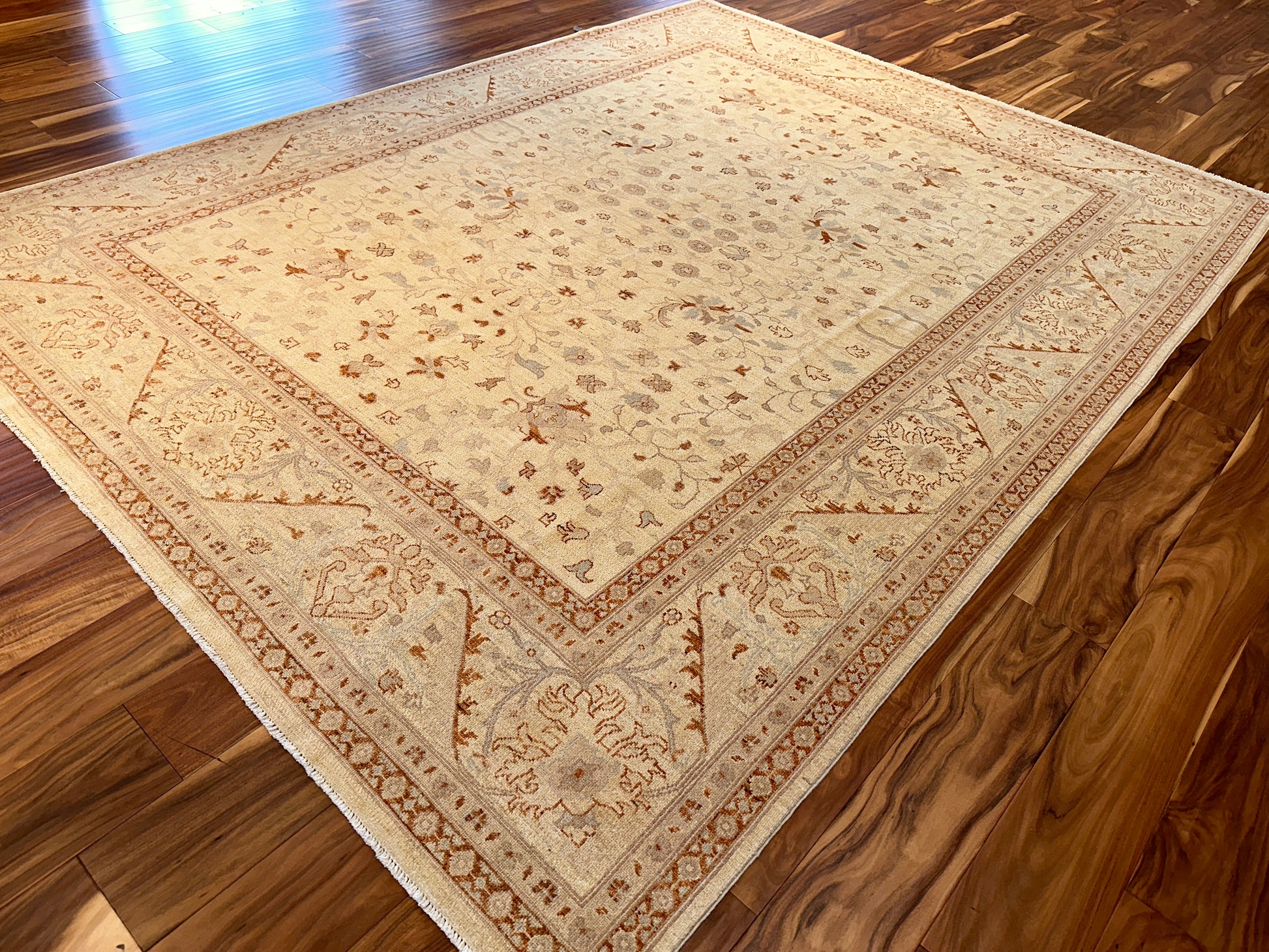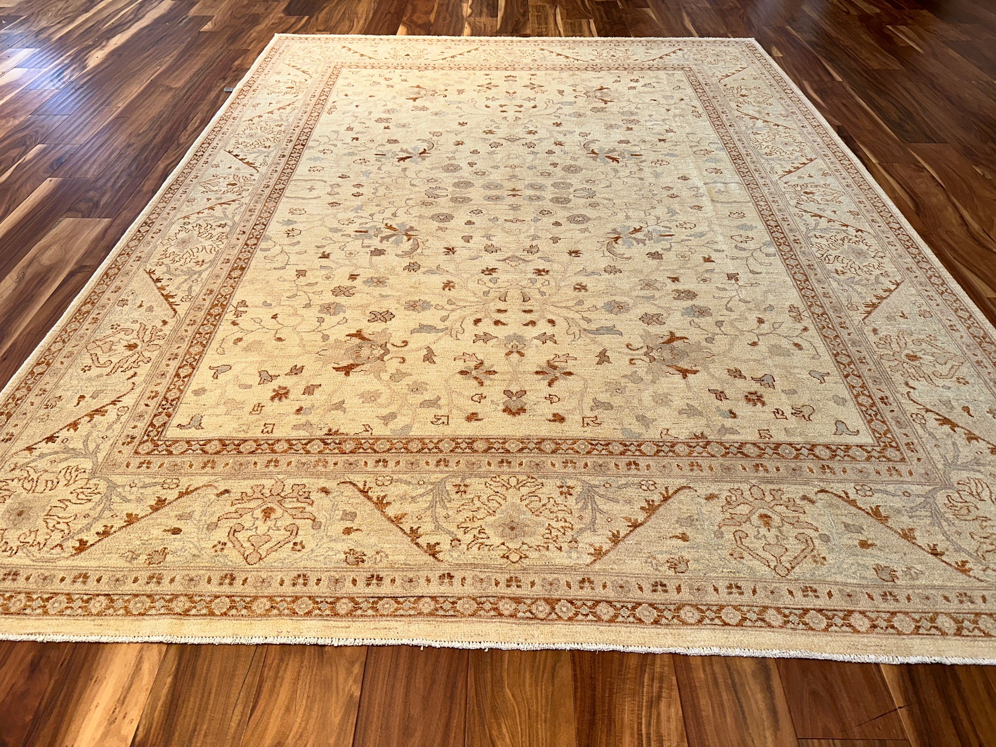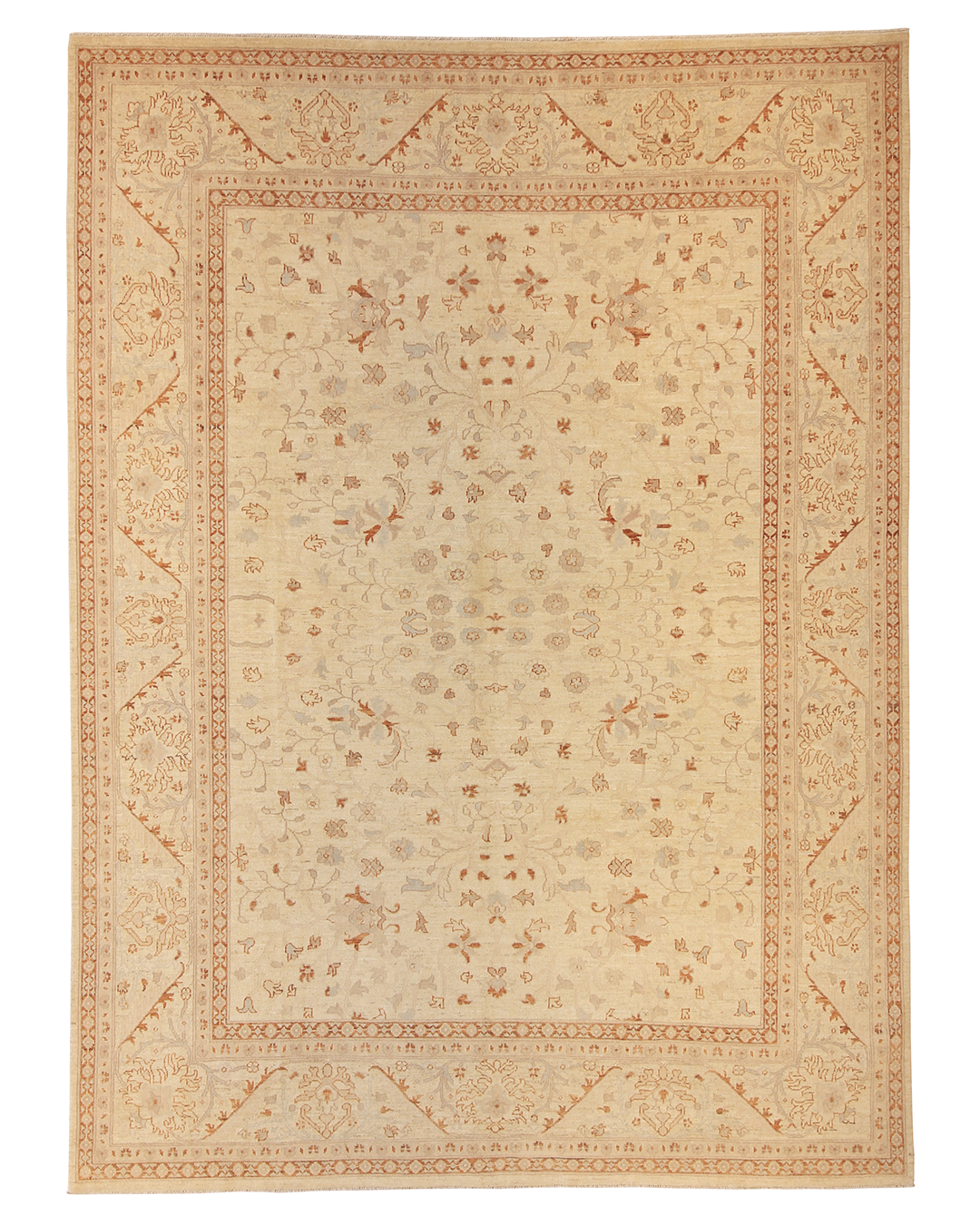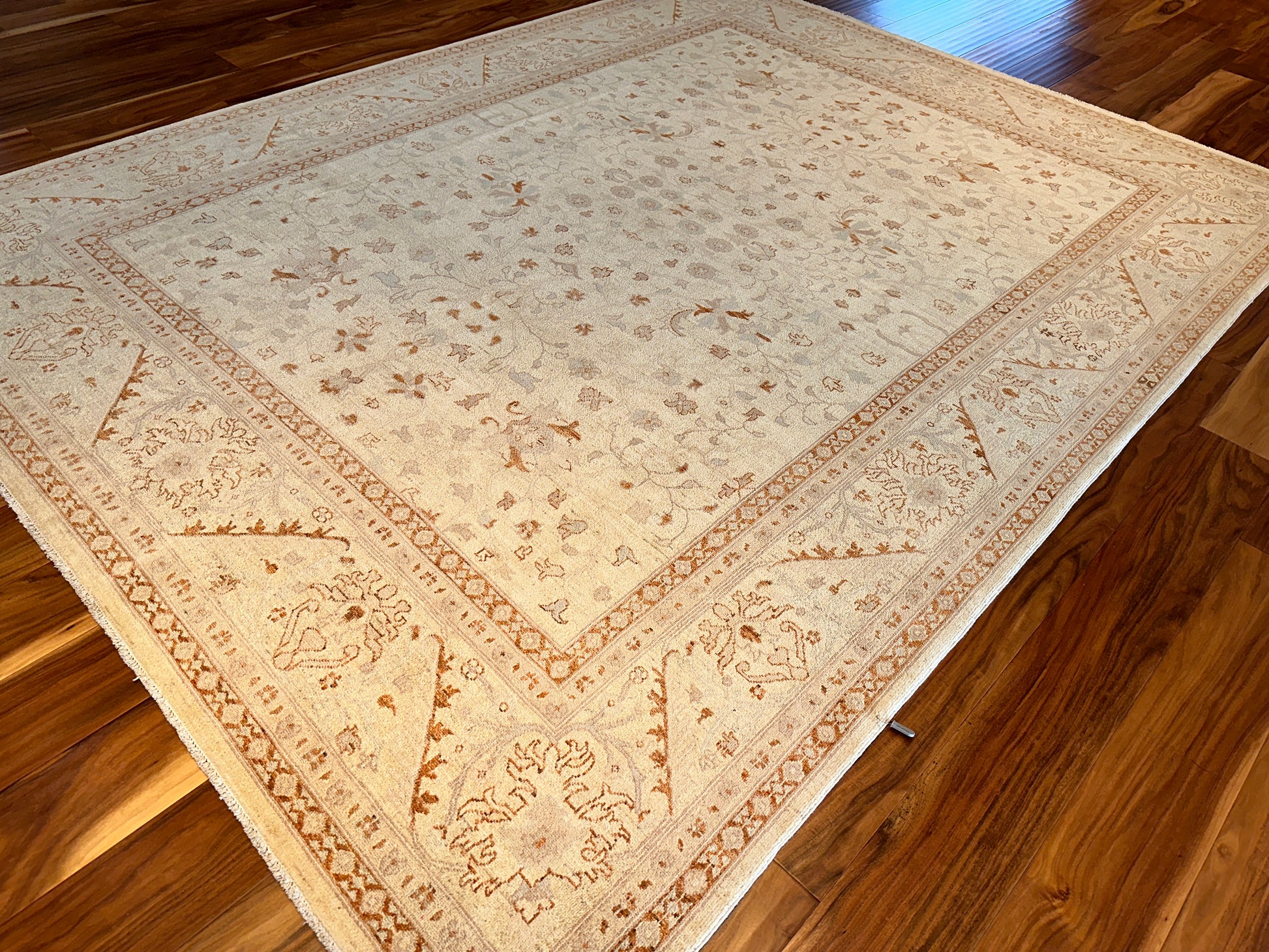 A luminous, tone-on-tone piece with quiet elegance, this handwoven rug offers a soft take on classic Oushak motifs. Muted florals and stylized vines emerge subtly from a warm beige ground, outlined in light rust with fine abrash lending a sense of age and refinement. Its understated pattern and harmonious palette create an easy backdrop for layered interiors with neutral or natural finishes.
