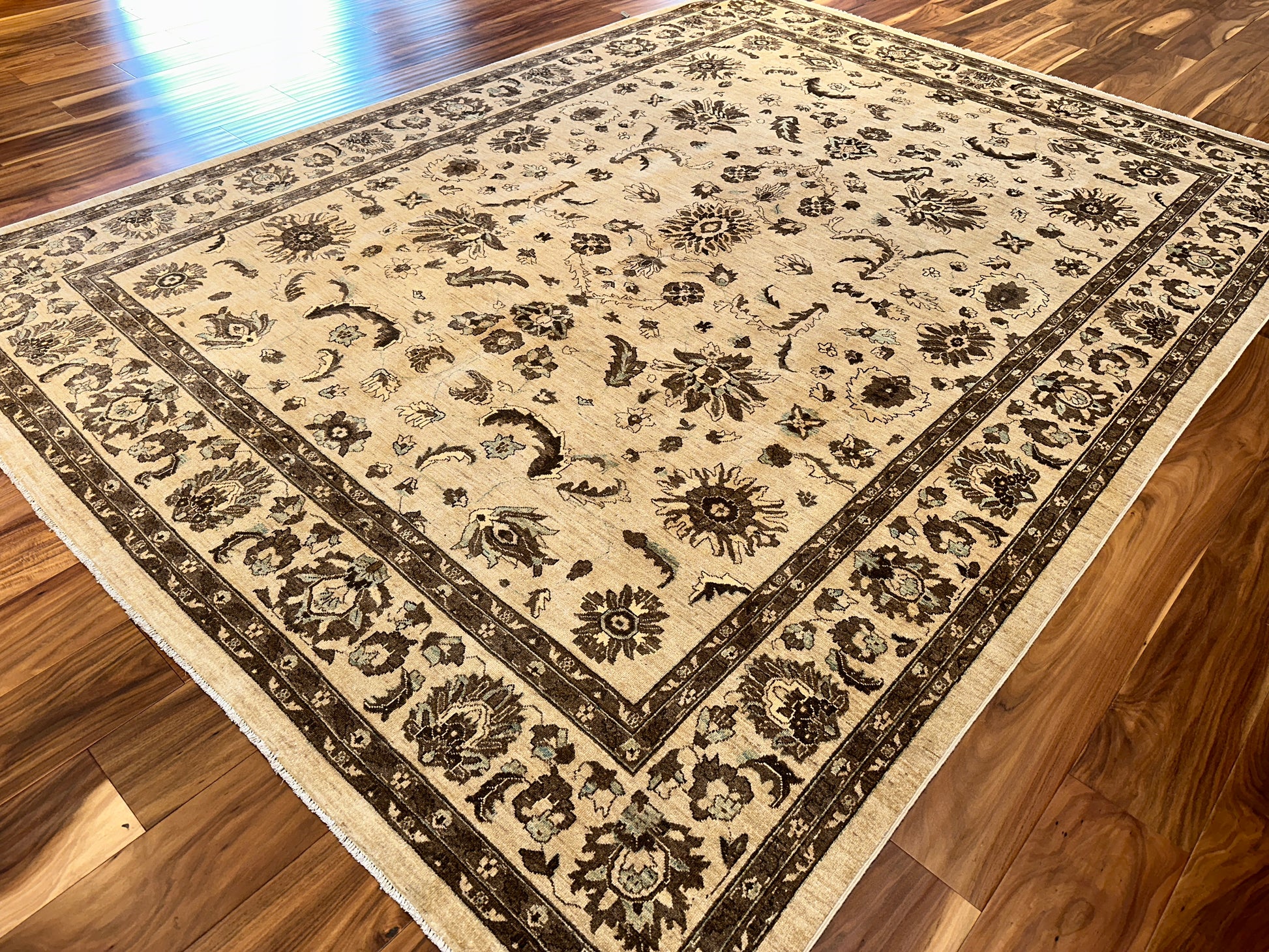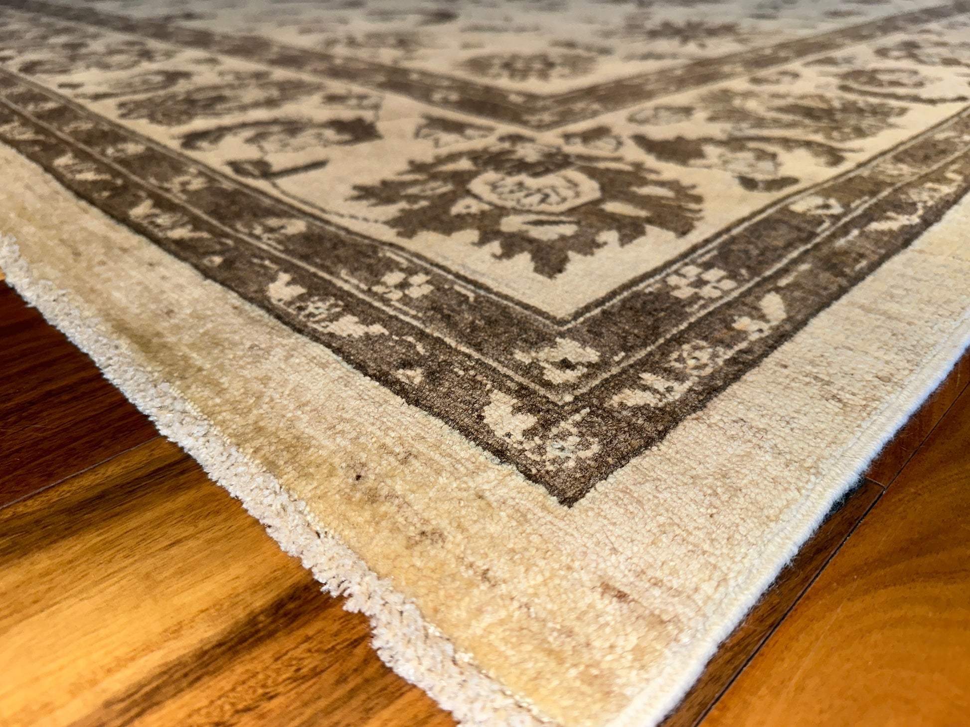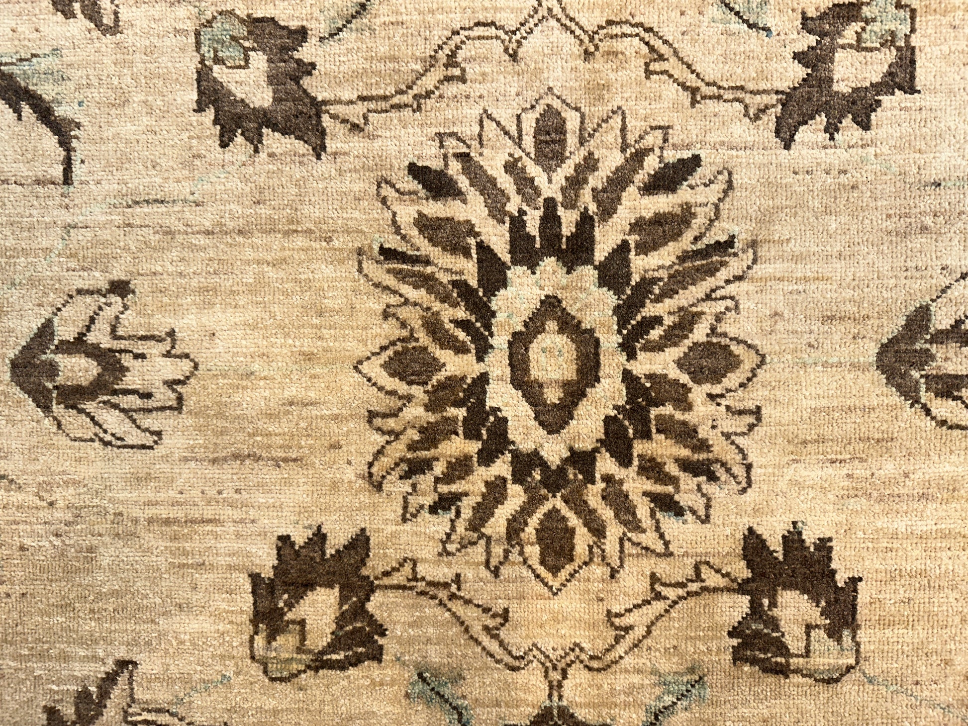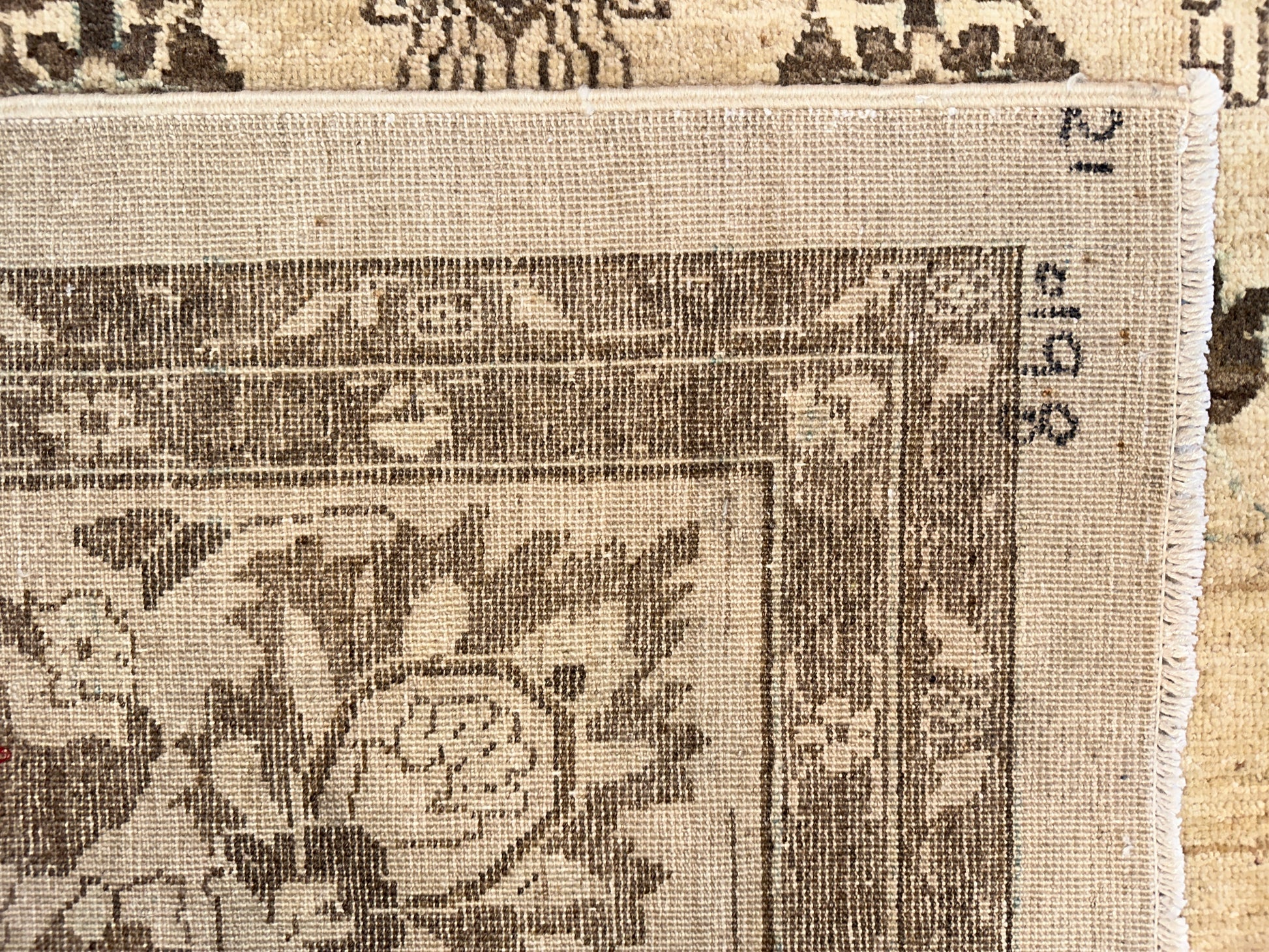 This muted, classic rug brings a sense of quiet richness to the room with its earthy palette and well-balanced floral field. A gently aged beige ground is covered with scrolling vines, stylized rosettes, and floret sprays in soft brown, creating a subtle contrast that keeps the pattern crisp yet understated. Its symmetrical layout and restrained tone make it a seamless complement to a refined, timeless interior.