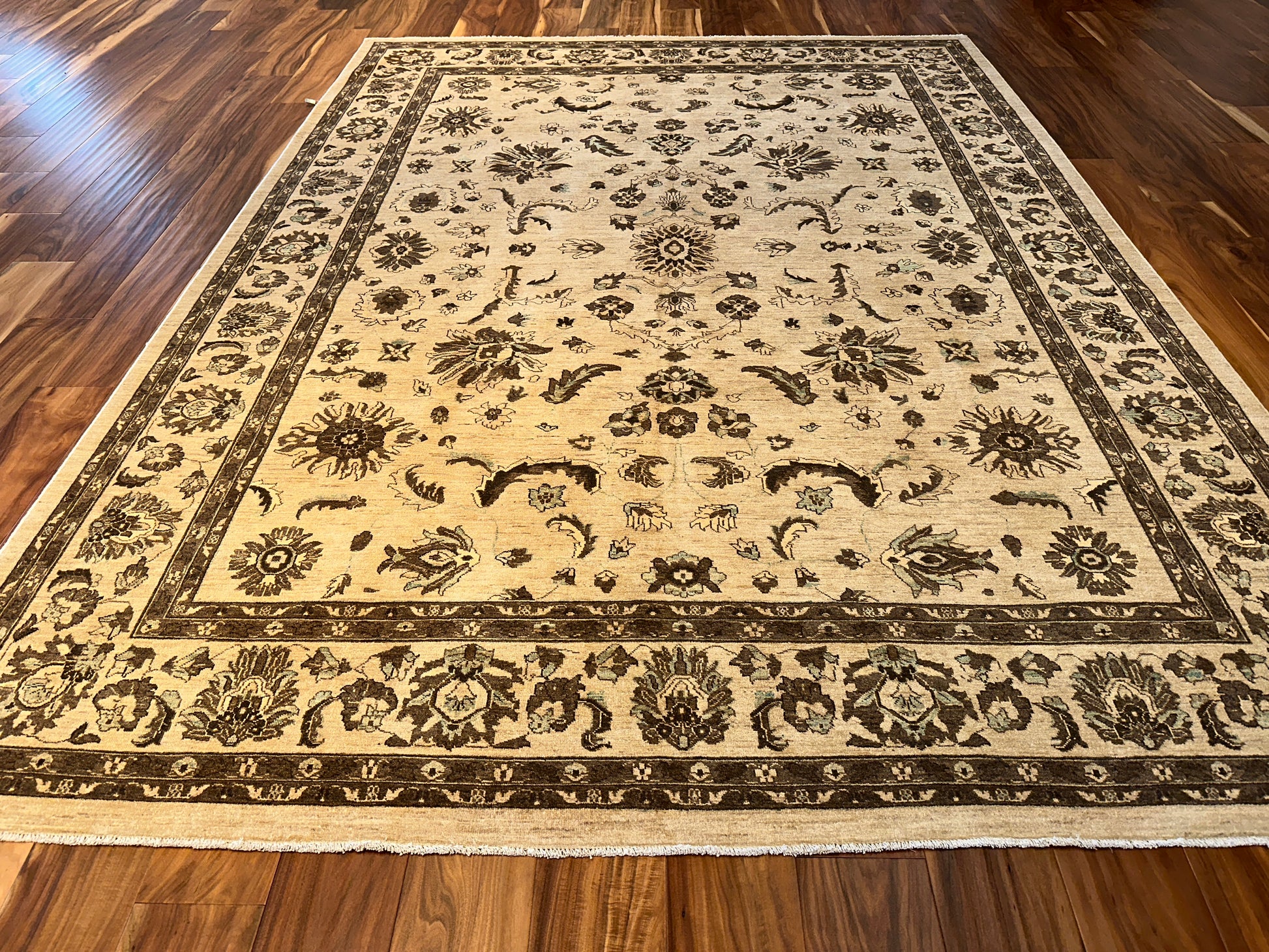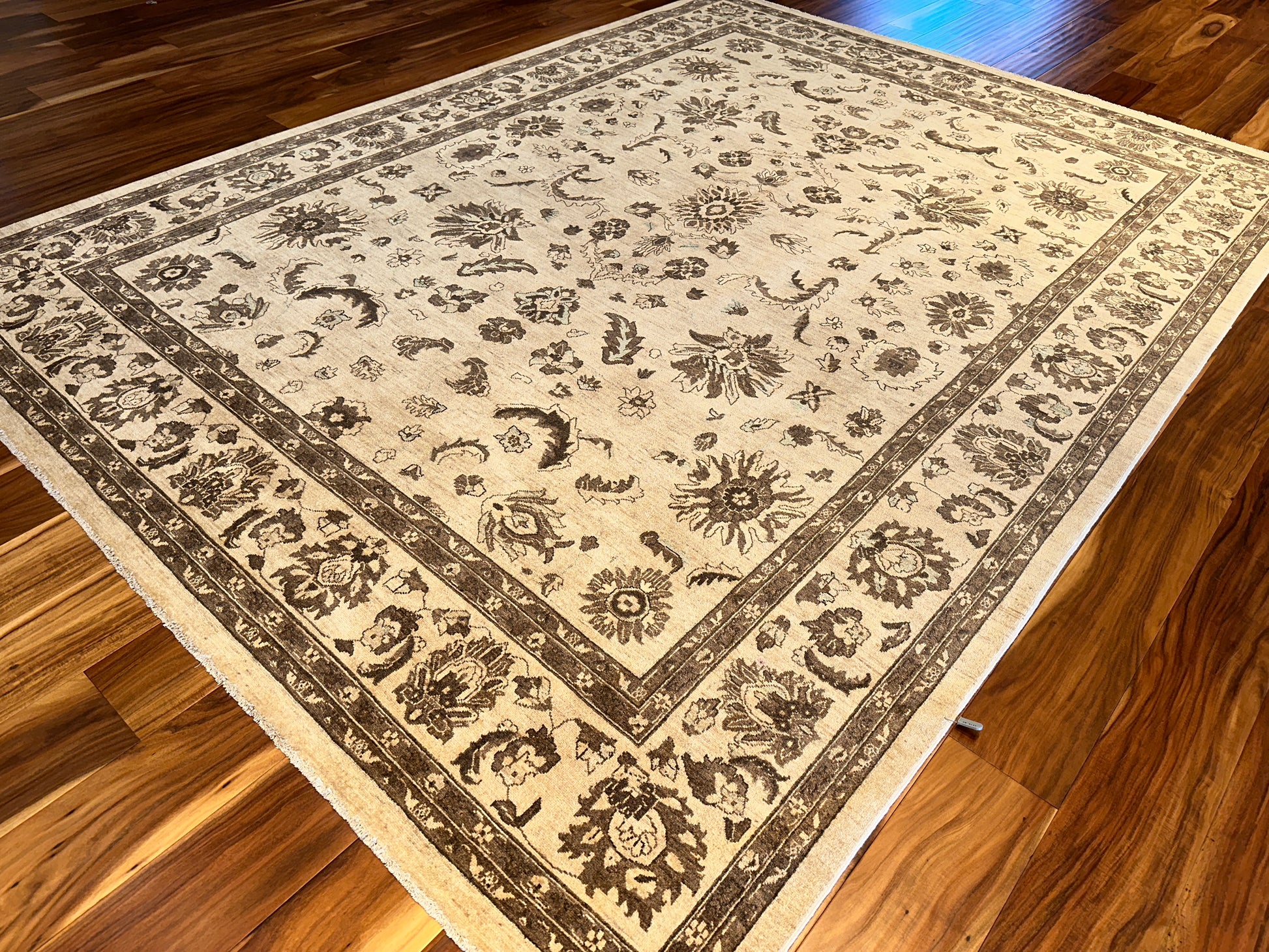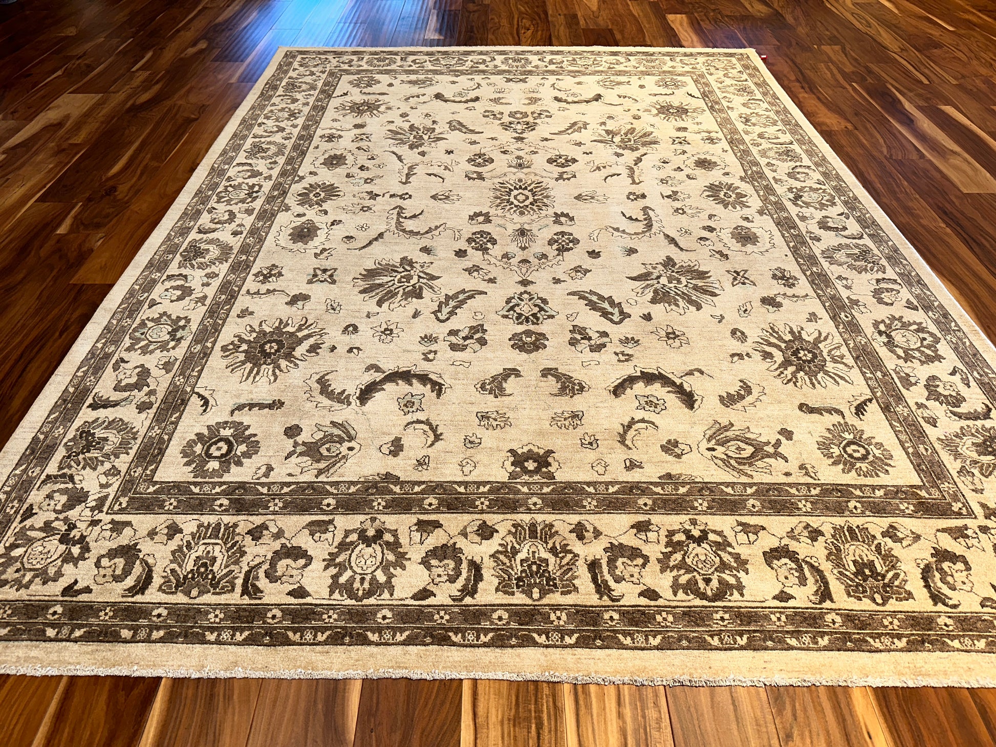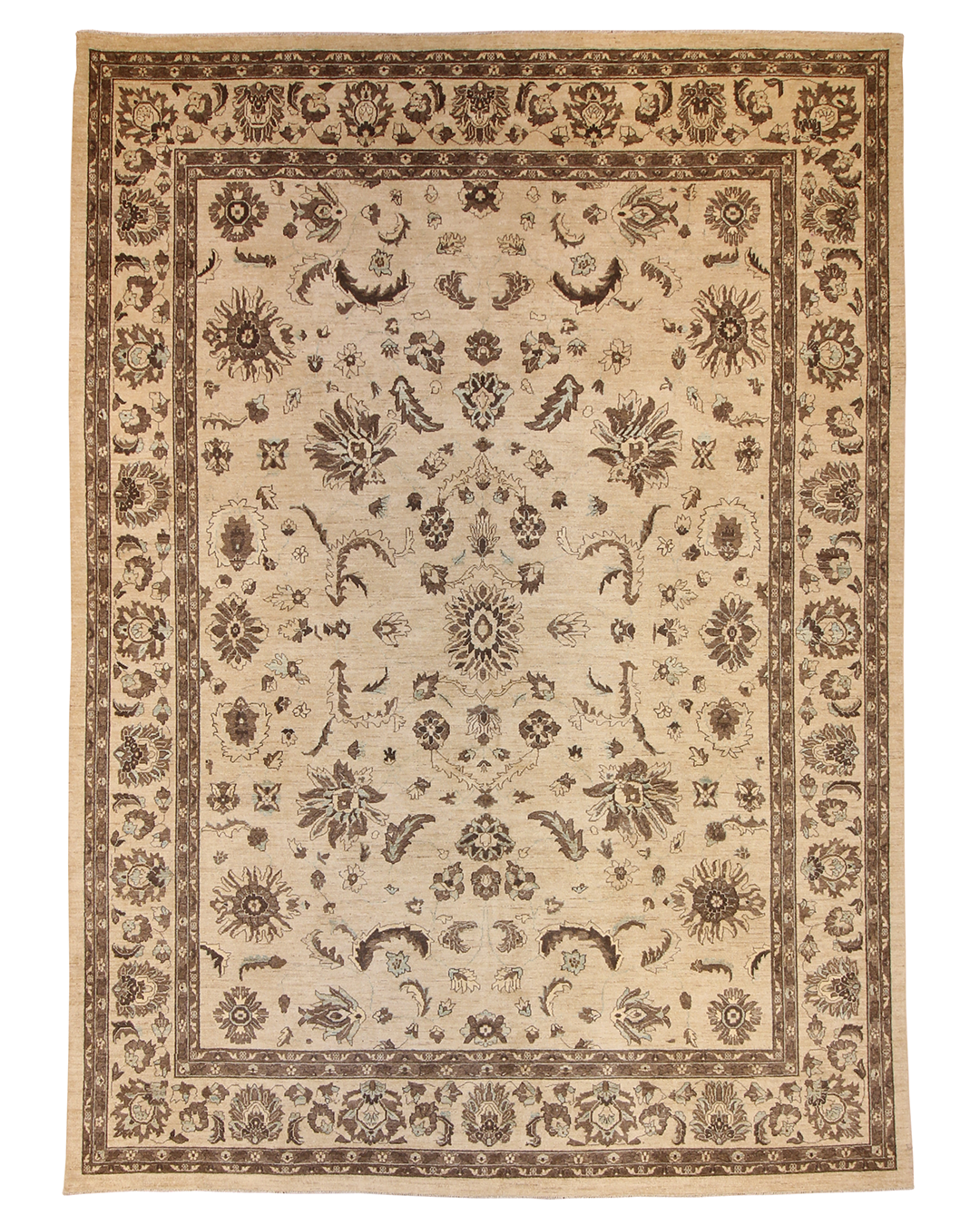 This muted, classic rug brings a sense of quiet richness to the room with its earthy palette and well-balanced floral field. A gently aged beige ground is covered with scrolling vines, stylized rosettes, and floret sprays in soft brown, creating a subtle contrast that keeps the pattern crisp yet understated. Its symmetrical layout and restrained tone make it a seamless complement to a refined, timeless interior.